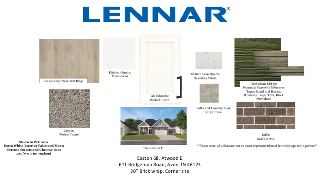 Welcome home to the premier lifestyle community in Avon, Easton by Lennar! The Atwood one story, perfect for relaxing and entertaining guests! Relax in the Primary bedroom with ensuite bathroom with spacious shower. Guests or crafts in the Extra bedroom/den. Plus another full bath. Open great room to dining and kitchen featuring Lennar’s Everything’s Included with Island seating 4, and all Stainless Steel appliances including gas stove and refrigerator. Easy care with Upgraded flooring and quartz countertops throughout. This Corner homesite is not more lawn work for you… have more free time with full lawn maintenance included in the monthly HOA, $298. Future Nottingham club house with workout facility, swimming pool, pickle ball courts and more. Purchase now, and move in this summer! *Photos/Tour of model may show features not selected in home.
