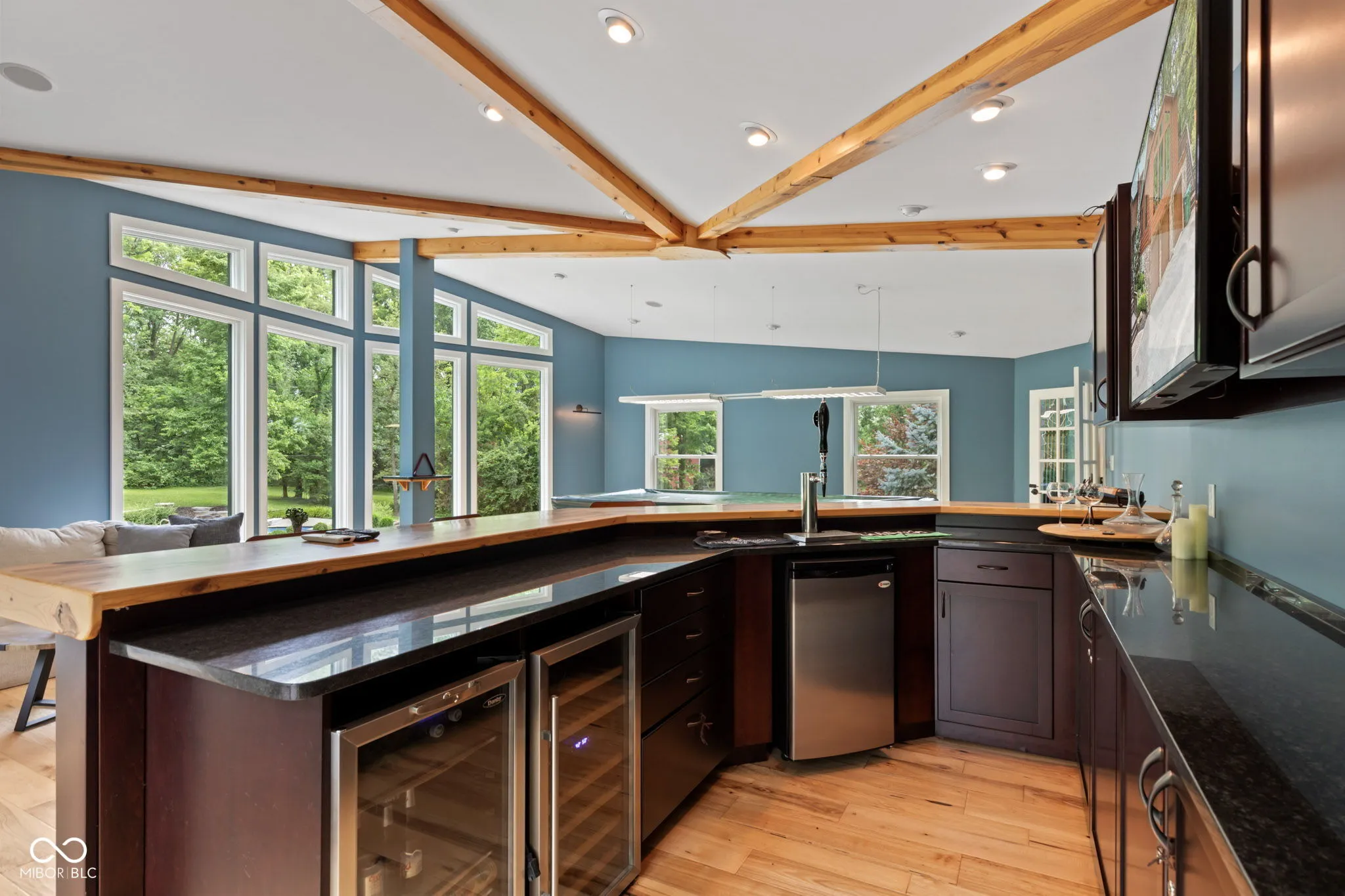 **We kindly ask that all visits be scheduled in advance to respect privacy and safety.** Welcome to your private retreat in the heart of Hamilton County! This one-of-a-kind 7,000 sq. ft. custom log cabin offers luxury living with the rustic charm of a true country estate. Situated on over 9 breathtaking acres, this property is the perfect blend of tranquility, upscale amenities, and outdoor adventure. Step inside to find an updated, high-end kitchen designed for both everyday living and entertaining, featuring premium appliances, custom cabinetry, and stone countertops. The spacious living areas boast soaring ceilings, exposed wood beams, and floor-to-ceiling windows that bring the beauty of the outdoors in. With 5 generously sized bedrooms and multiple living spaces, there’s room for everyone. The home also includes a entertainment room with a fully custom bar – ideal for hosting game nights, gatherings, or just relaxing in style. Step outside and enjoy the ultimate outdoor lifestyle with a sparkling inground pool, a pole barn with horse stalls, and wooded trails perfect for horseback riding, hiking, or ATV adventures. Whether you’re an equestrian enthusiast, a nature lover, or simply seeking peace and privacy, this property has it all.