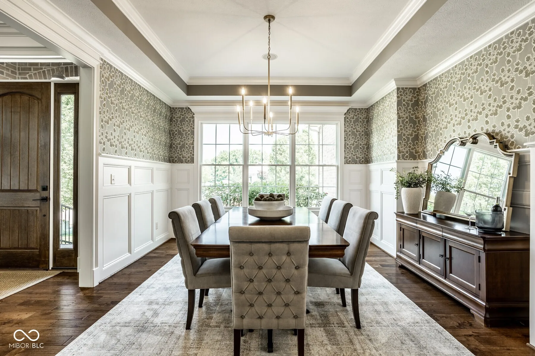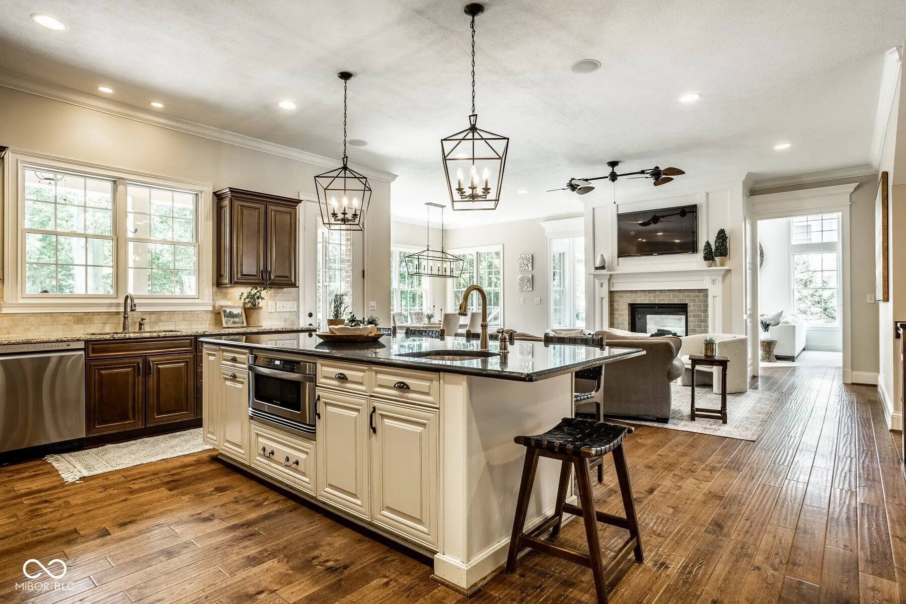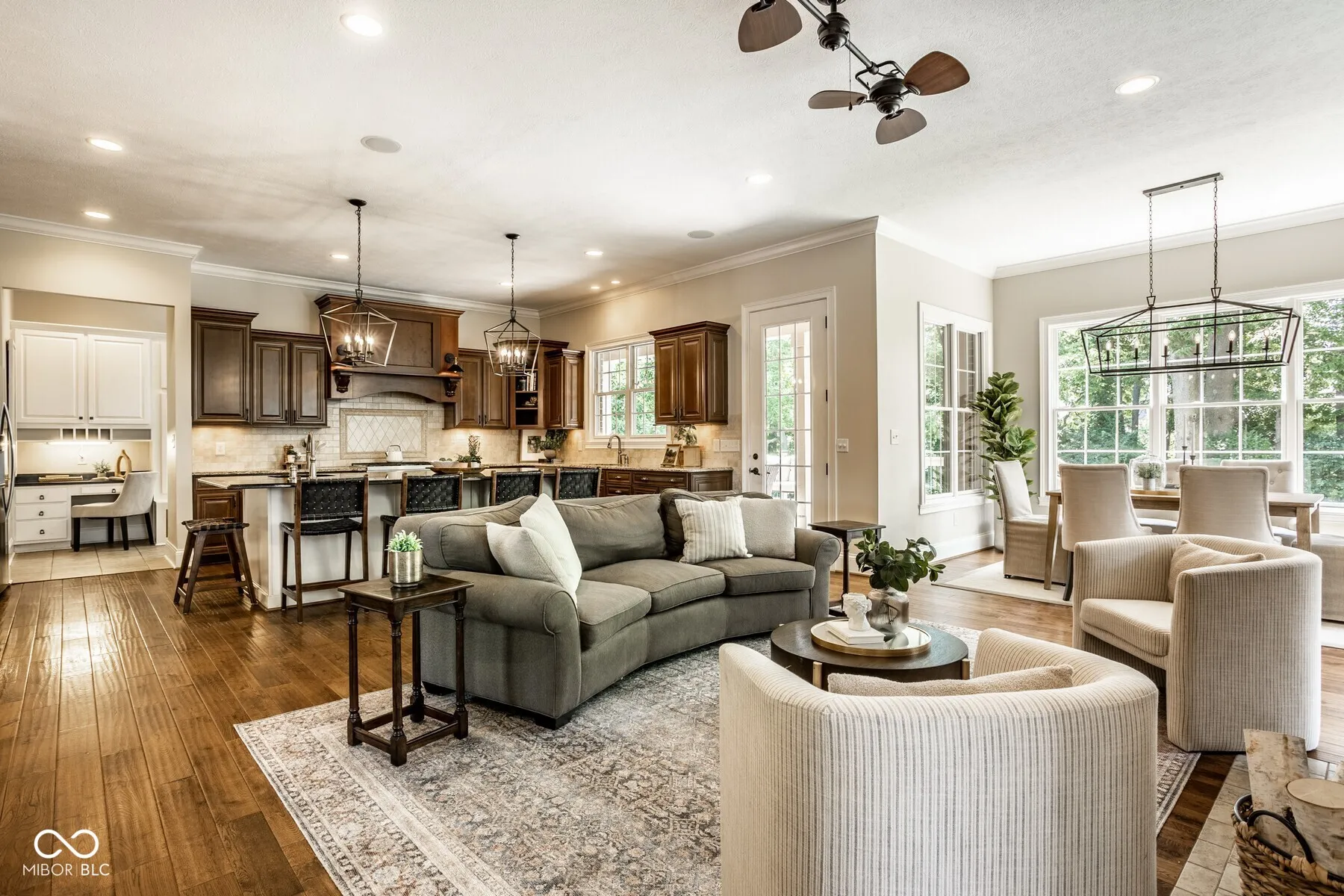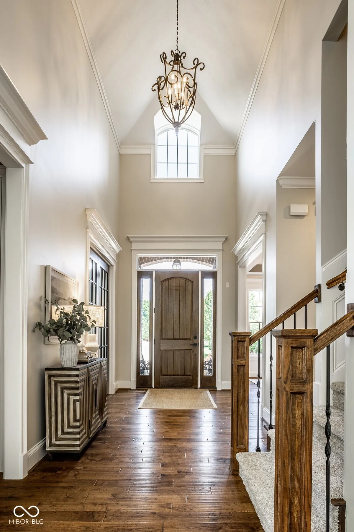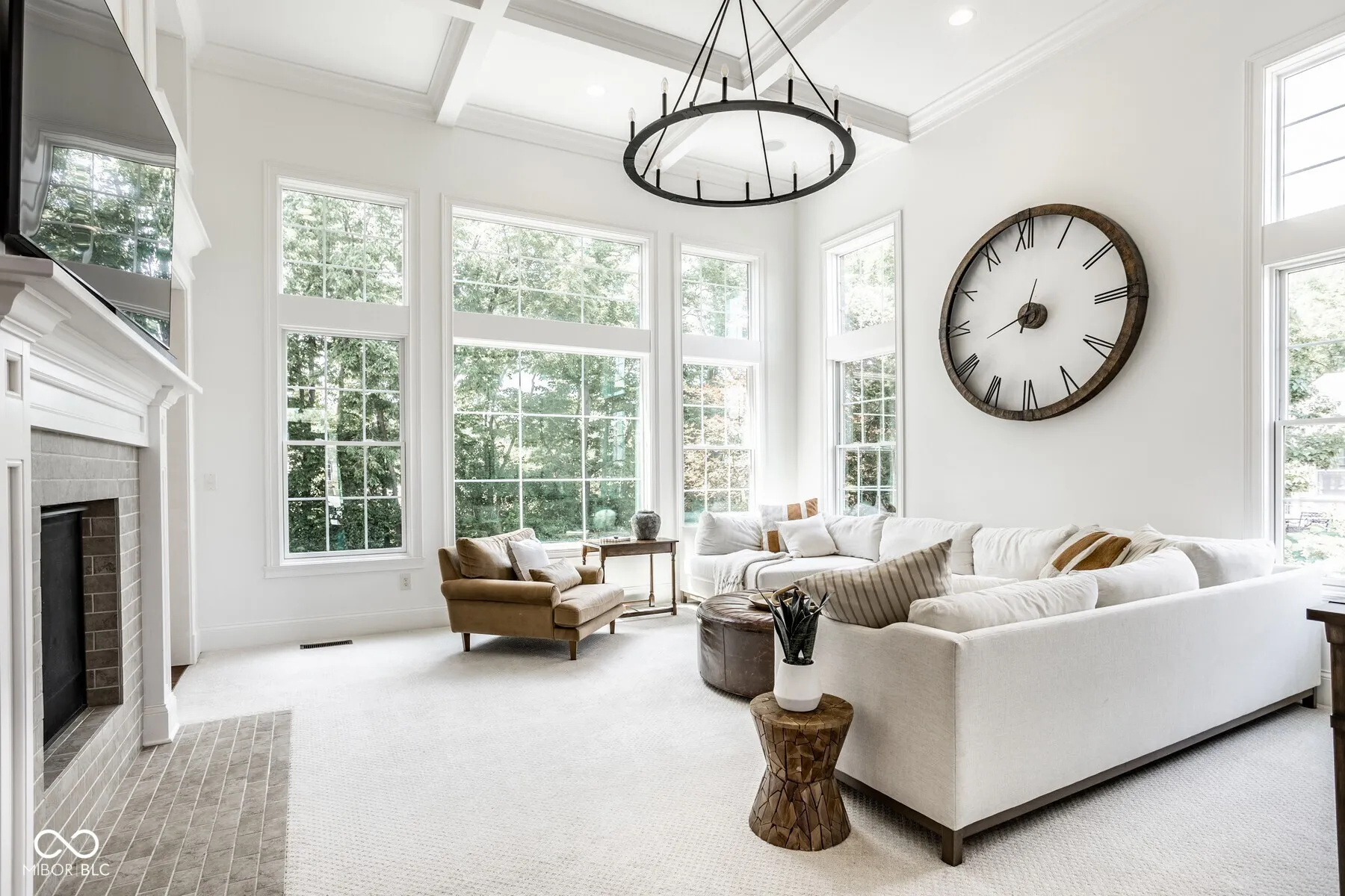 Nestled in the heart of West Carmel’s High Grove neighborhood, this exceptional 6,000 sq ft custom home by Shamrock Builders offers the perfect blend of craftsmanship, functionality, & timeless design. Built in 2010 & situated on a private, tree-lined lot, this 5-bedroom, 4.5-bath residence is thoughtfully finished with luxury details throughout. The main level features solid 3/4″ oak hardwood floors, solid wood interior doors, & extensive custom millwork. The dramatic great room showcases a cathedral coffered ceiling, floor-to-ceiling windows, & a dual-sided fireplace that connects seamlessly to the hearth room & spacious eat-in kitchen. Designed for serious cooking & entertaining, the chef’s kitchen includes a large center island, 6-burner gas Dacor cooktop, double Thermador ovens, a walk-in pantry, & walks out to a covered Trex deck-ideal for enjoying serene views of the private, tree-lined backyard. Additional main level highlights include a formal dining room with custom trim, a stylish home office, & a well-appointed mudroom with built-in lockers & storage. Upstairs, you’ll find four generously sized bedrooms, 3 baths, including a spacious primary suite with an adjoining sitting area, offering ample space, & abundant natural light. Also on the second floor is a large laundry room & semi-finished attic space. The finished daylight basement features exposed brick accents, a full bar with dishwasher, generous rec space, a guest bedroom with full bath, & abundant storage. The oversized 3.5+ car garage includes three doors with 9-foot openings & space to accommodate four vehicles or additional storage. This home is a rare opportunity-blending enduring quality & custom detail in Carmel Clay schools. Every inch of this home was designed & finished to stand the test of time.