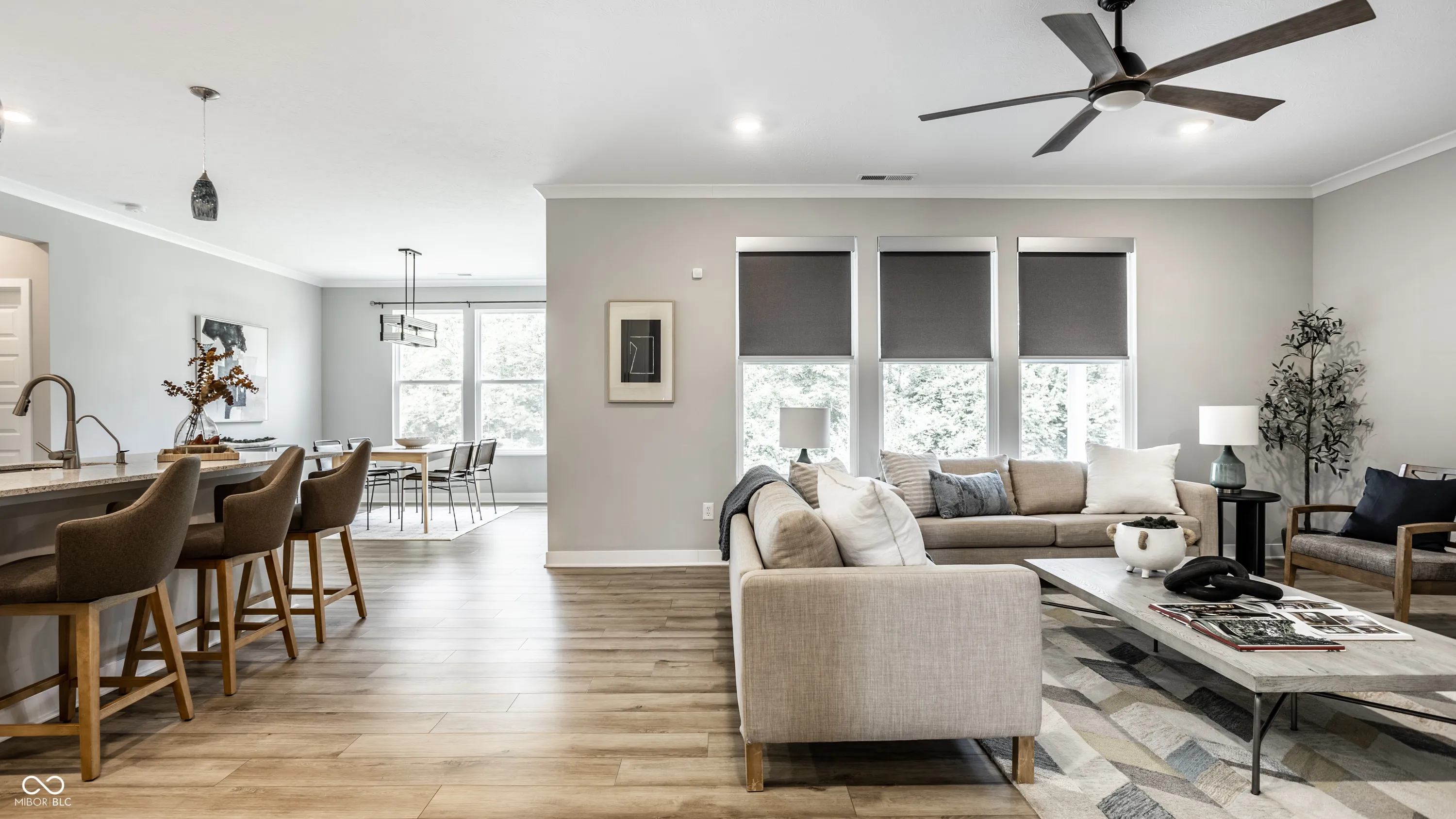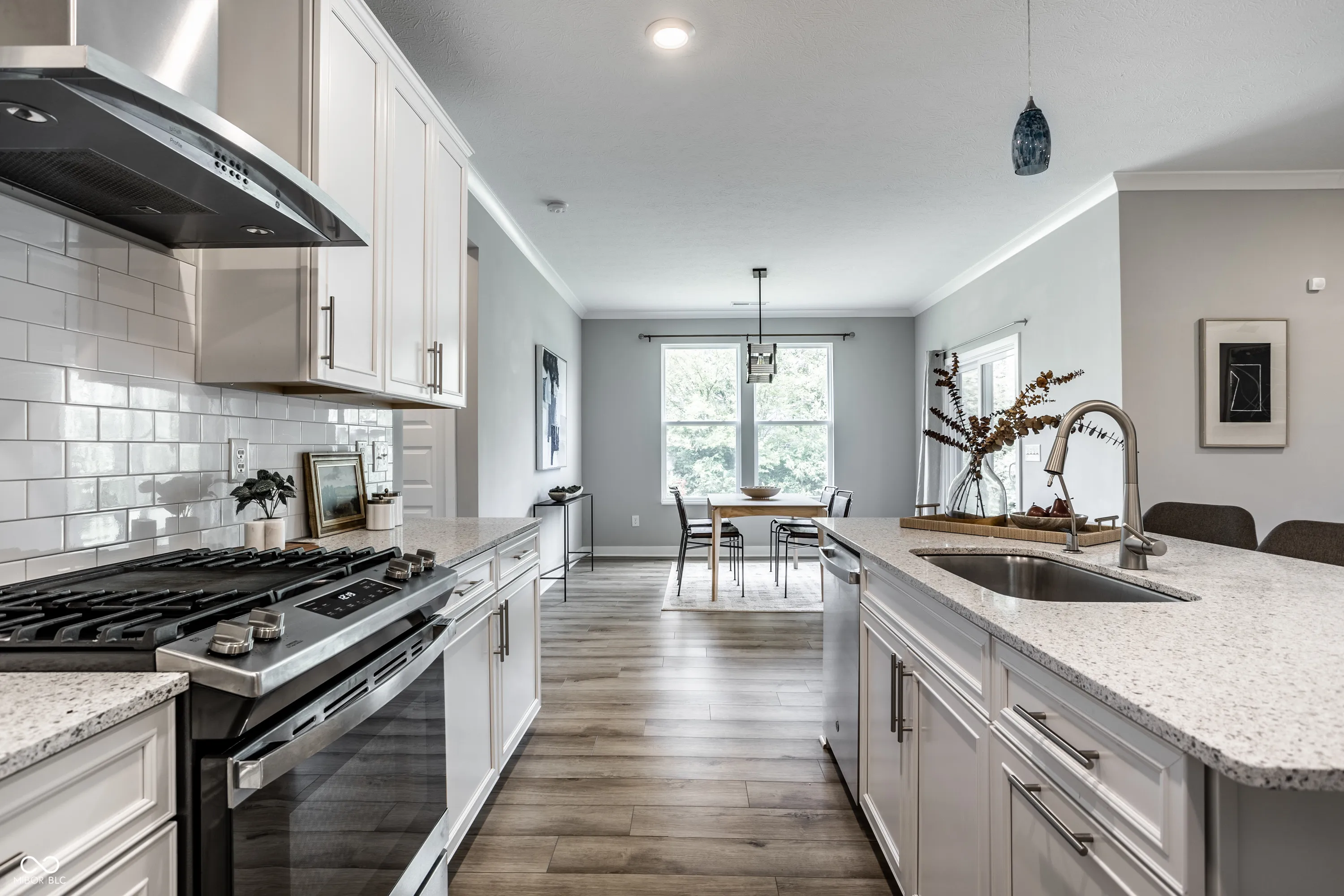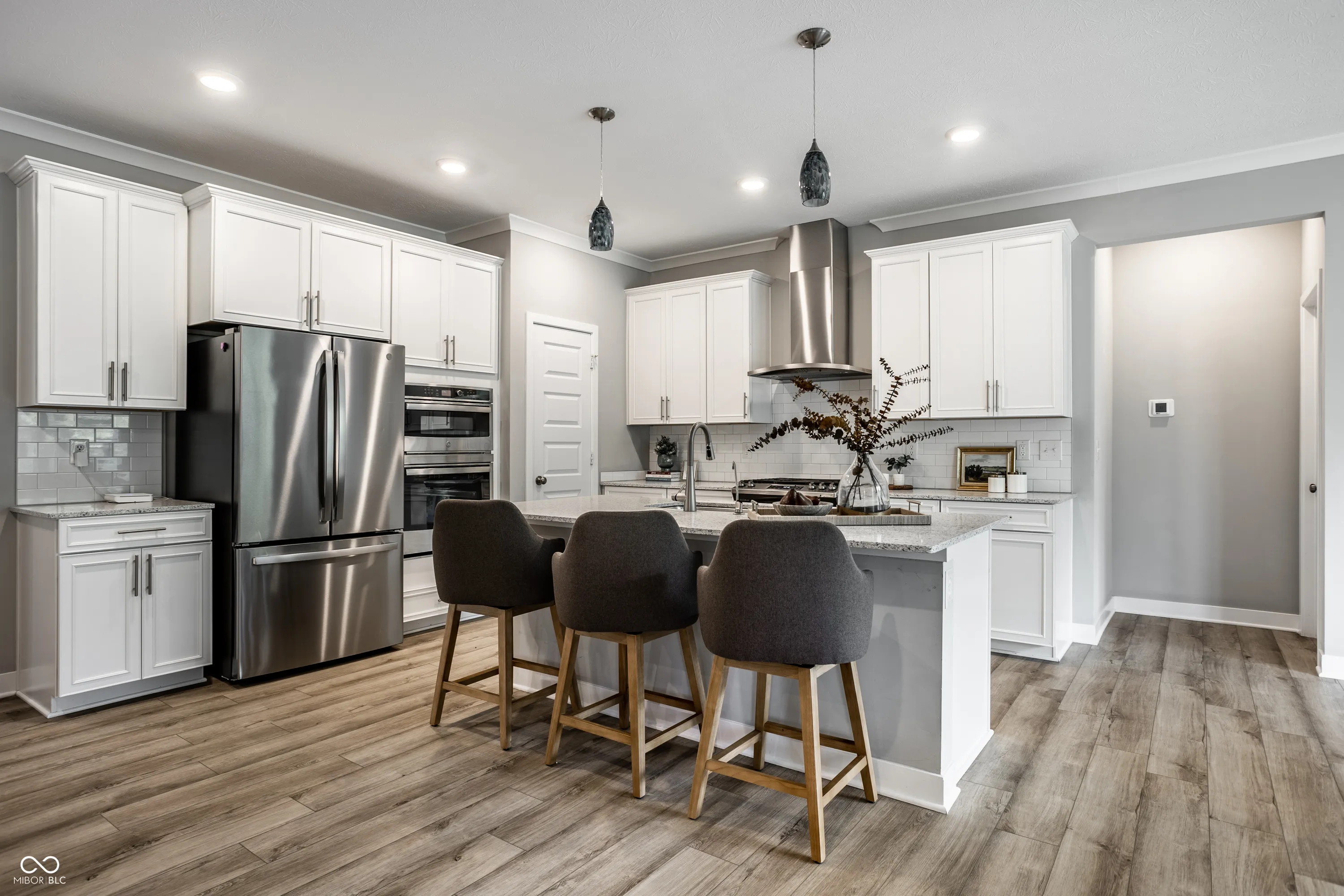 Welcome to zero-maintenance living in this beautifully upgraded 2021 built 3 bed, 3 full bath ranch in sought-after McCord Pointe in McCordsville! Enjoy peace of mind with irrigation, lawn care, mulched beds, snow removal, community pool, and walking paths all covered by the HOA. Primary suite and guest suite feature ensuite baths & walk in closets. The guest ensuite bathroom offers an ADA-compliant shower. Relax on the large covered patio overlooking a serene tree-lined backyard – a front seat row for bird and nature lovers! Upgraded kitchen includes quartz counters, soft close cabinetry with roll out pot racks, pendant lighting & tile backsplash. Even more upgrades: vinyl flooring, crown molding, whole-home RO system, smart home features, and more. The garage is drywalled, has epoxy floors, added lighting, storage, and a workshop-sized 3rd bay-perfect for hobbies or extra storage.