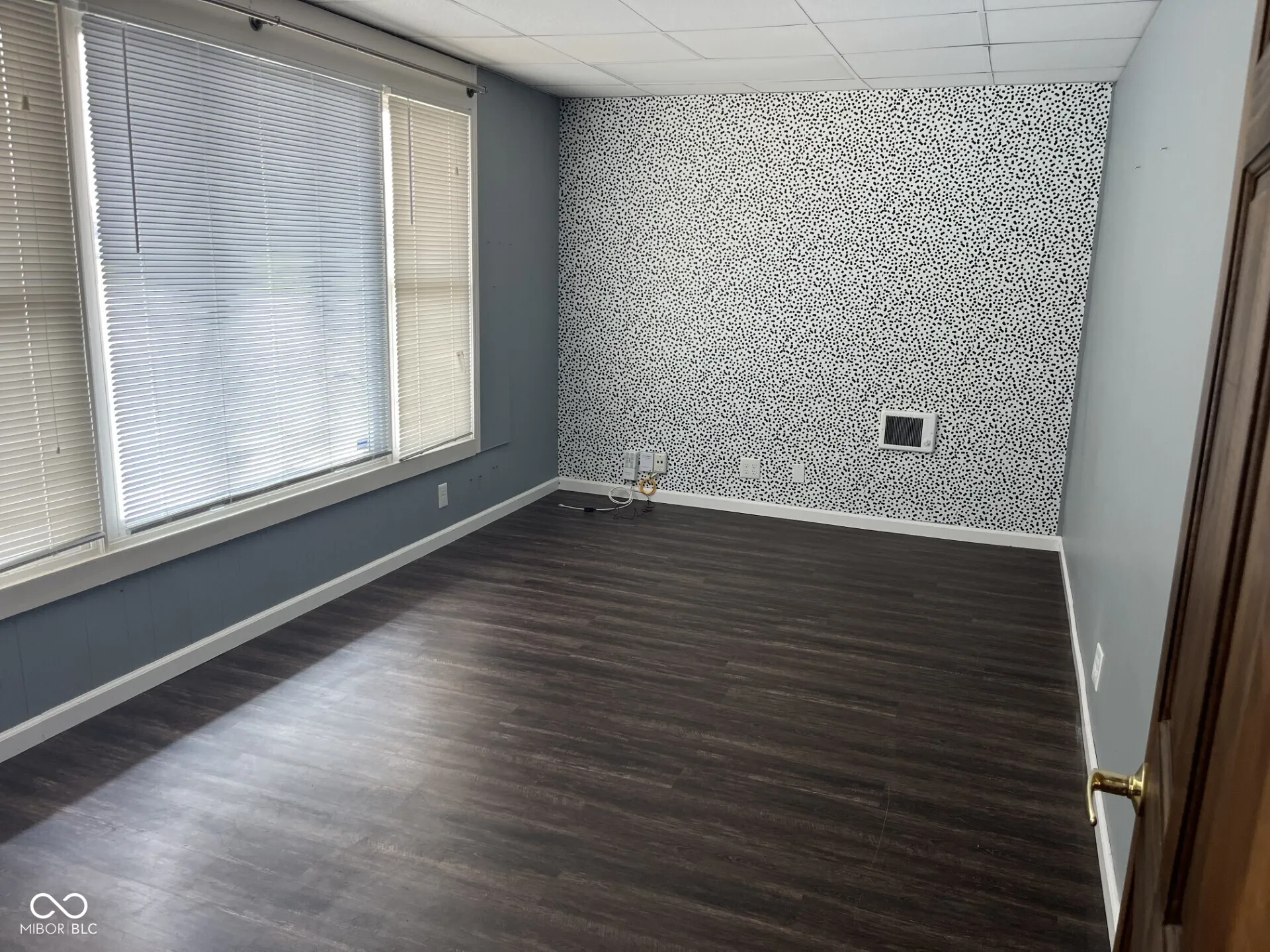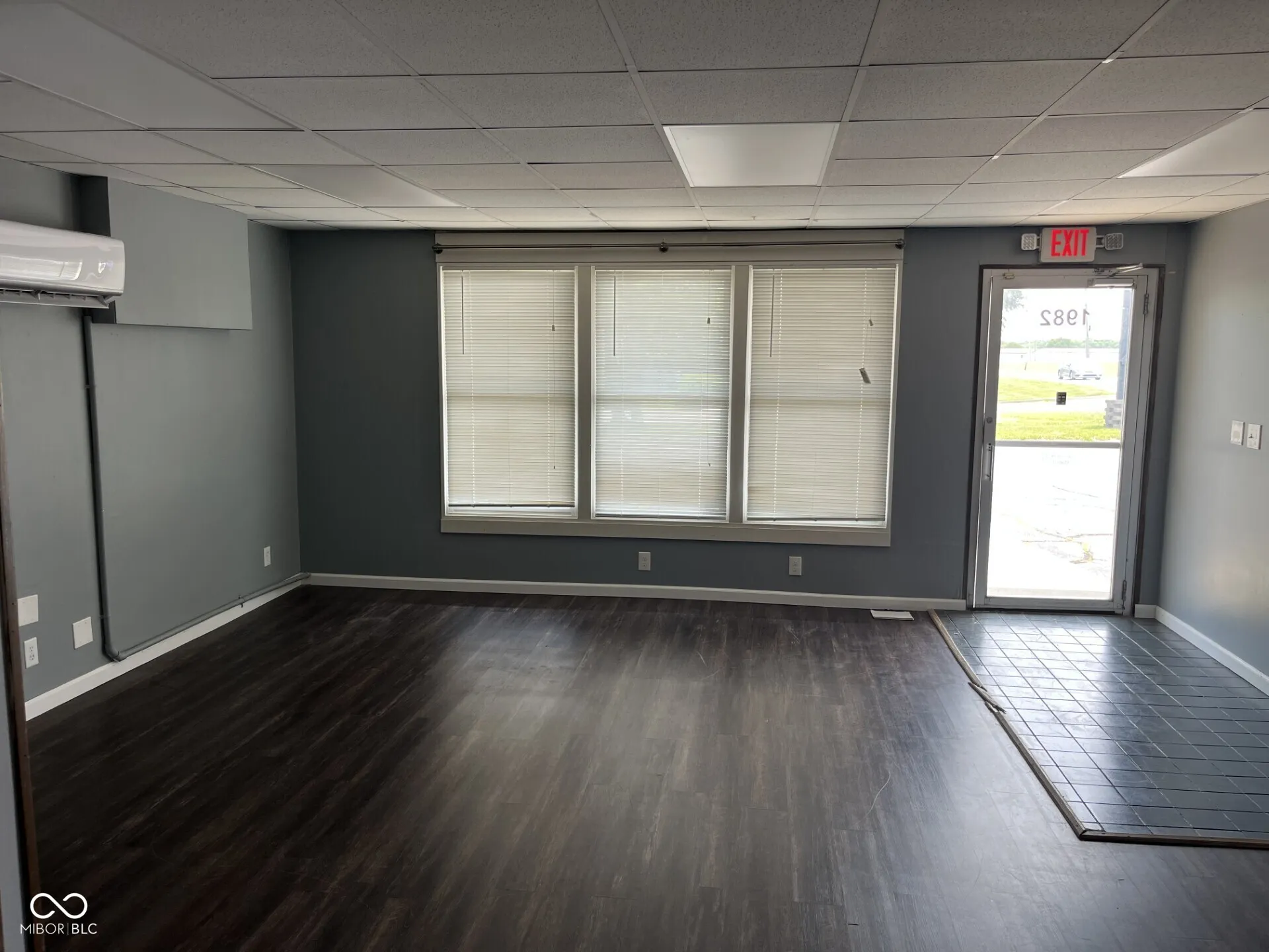 cozy office space consisting of one private office and one open entry room with fireplace. one bathroom.