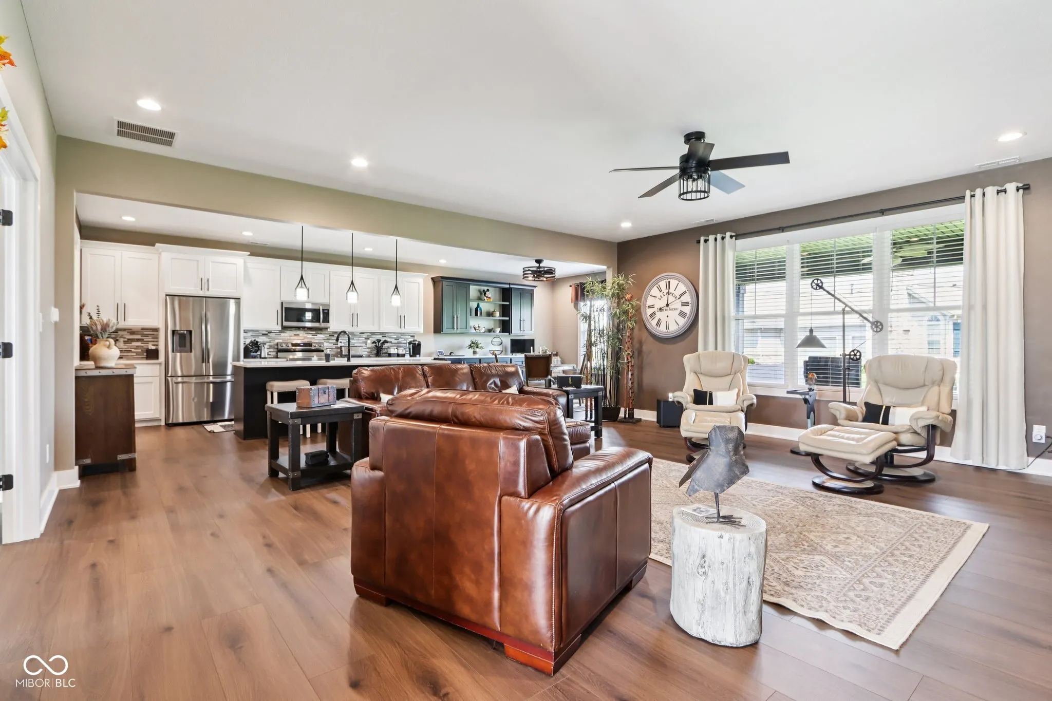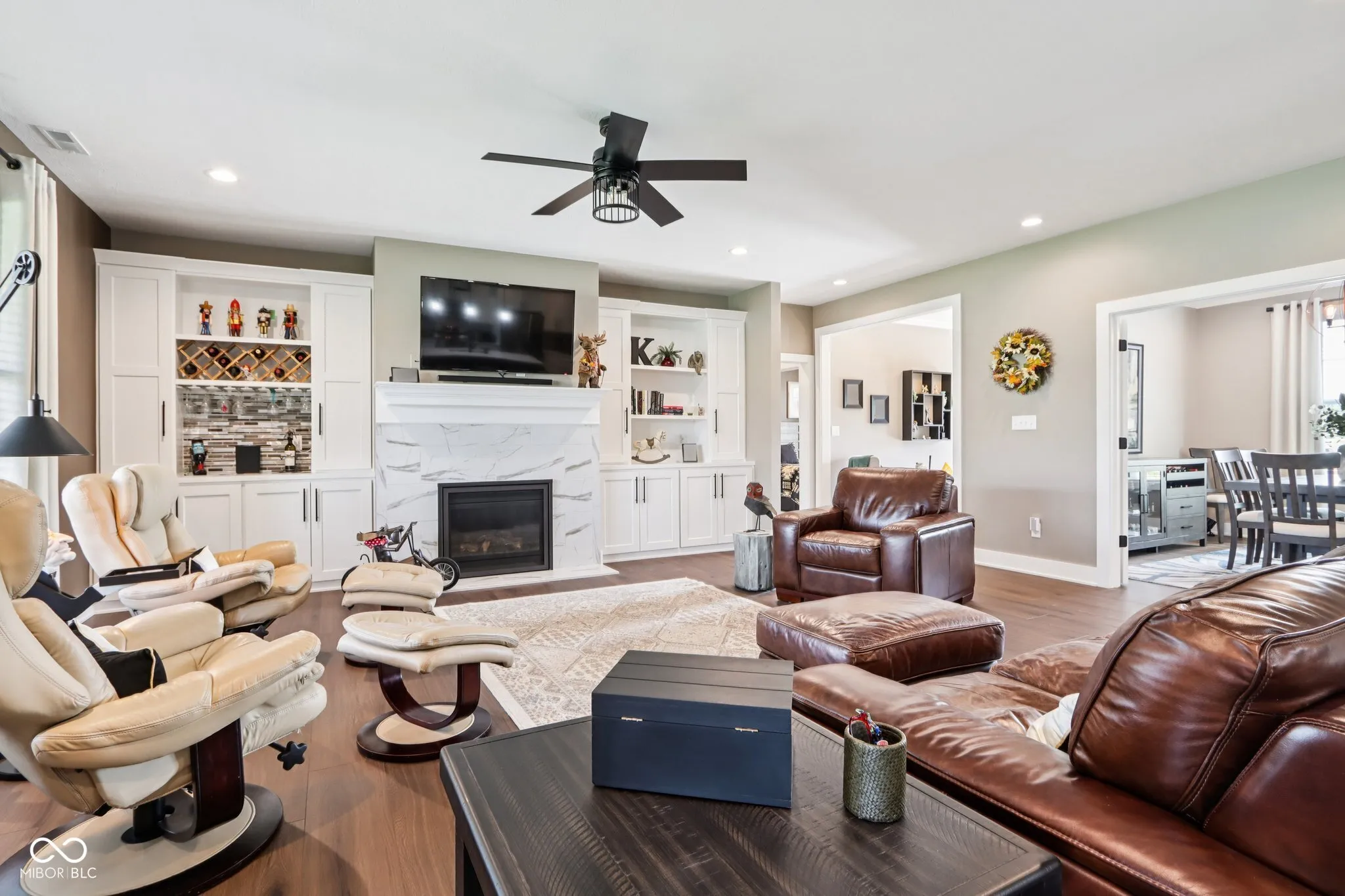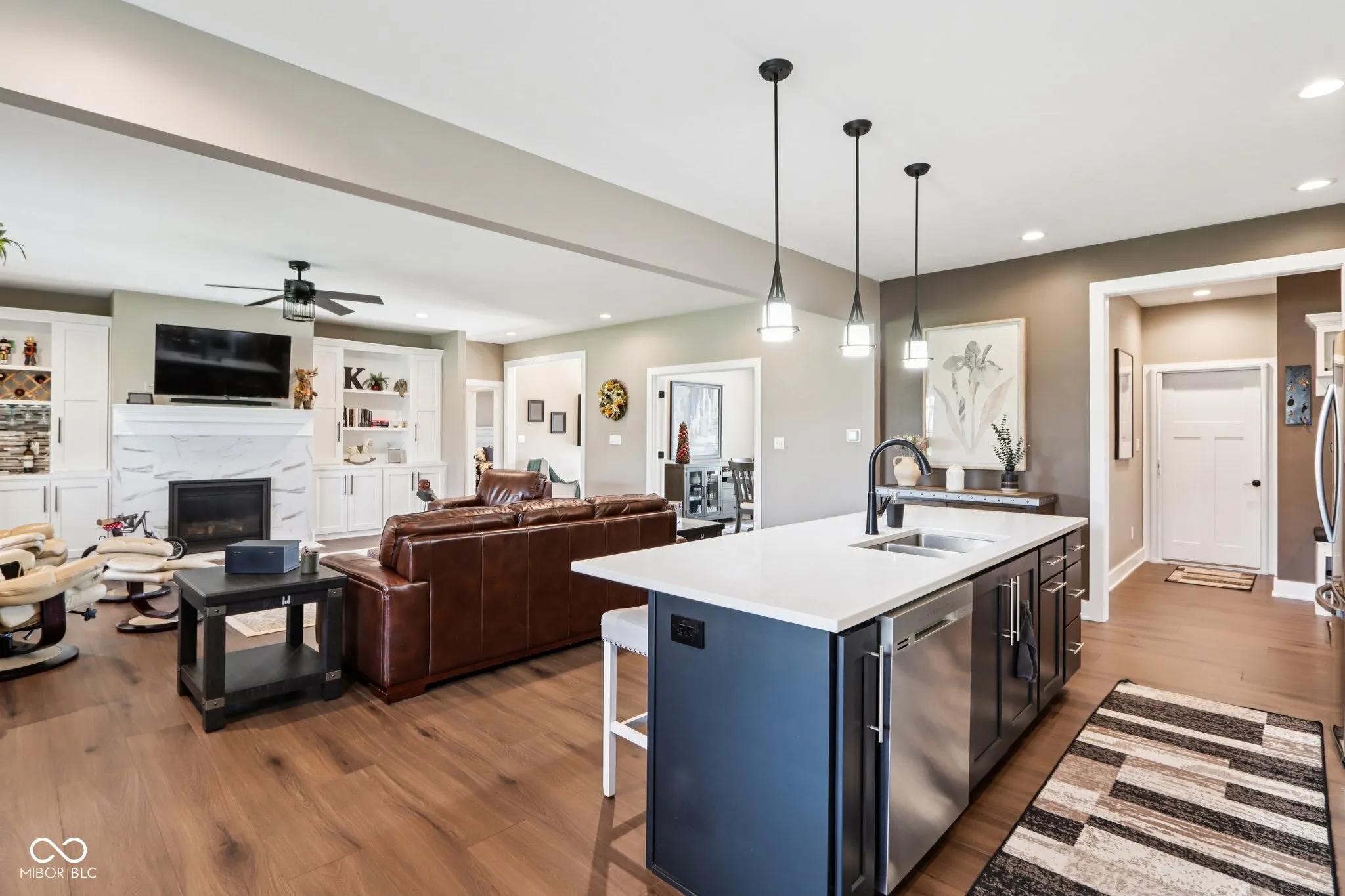 Come see this stunning all-brick home in the desirable Maclaren Manor, w/ beautiful views of the Legends of Indiana Golf Course. Built w/ quality & detail in 2023, this impressive custom home feat. 4 bedrooms, 3 full baths, almost 3,000 sq ft & a spacious 3 car garage, & is situated on a spacious 0.32 acre quiet cul-de-sac lot. Enter through the foyer to take in the open floor plan & great views of the golf course. Tons of abundant natural light throughout. Living room feat. stately gas fireplace w/ beautiful built-in bookshelves. Formal dining room off the living room- perfect for hosting! Continue on into the kitchen & breakfast room where you’ll find gorgeous quartz countertops, an island with bar stools, stainless steel appliances, custom cabinetry, tasteful backsplash, & another built-in area w/ more storage space- a perfect place for a coffee bar! Enjoy easy upkeep w/ the luxury vinyl plank flooring throughout the majority of the home. 3 bedrooms located on the main level including the primary suite, with 1 bedroom + full bathroom upstairs. Spacious primary w/ a stunning en suite bathroom complete w/ separate sinks & plenty of cabinet storage space, huge walk-in spa-like tiled shower & walk-in closet as well. Other 2 spacious bedrooms on main level share another large bathroom. Upstairs bedroom + bath great for older children, visiting guests, play/office space, etc! All bathrooms have quartz countertops. Huge laundry room conveniently on the main level w/ tons of cabinets, countertop space & a built-in sink. Enjoy warm summer nights outside under your large covered patio- a great spot to entertain guests! Lawn + landscape care is low-maintenance w/ the built-in irrigation system. Located close to I-65 for easy access to downtown Indy or Columbus. Truly a one of a kind community & home- not many opportunities like this to experience luxury living in a premier golf community! You don’t want to miss this one!!
