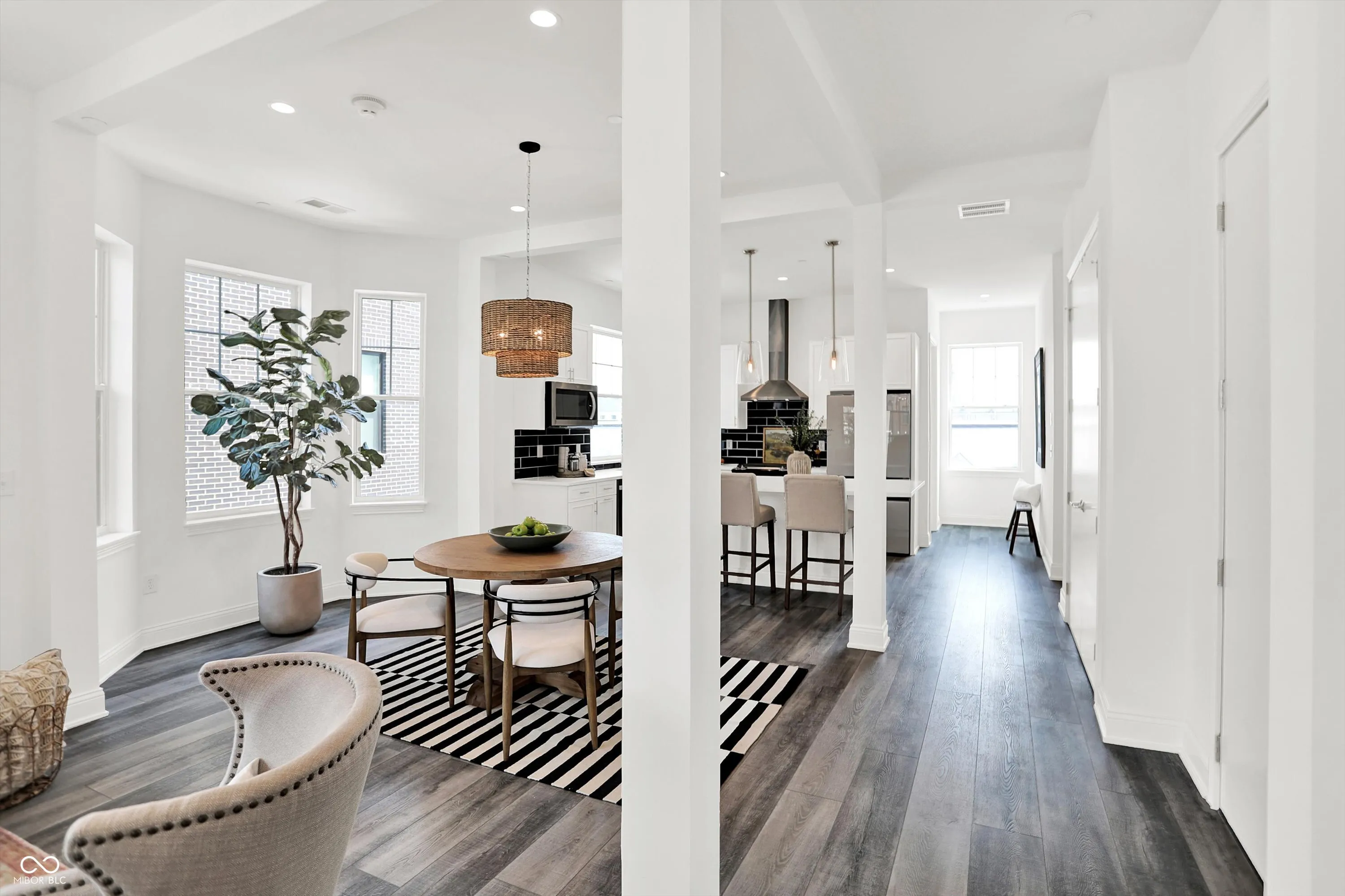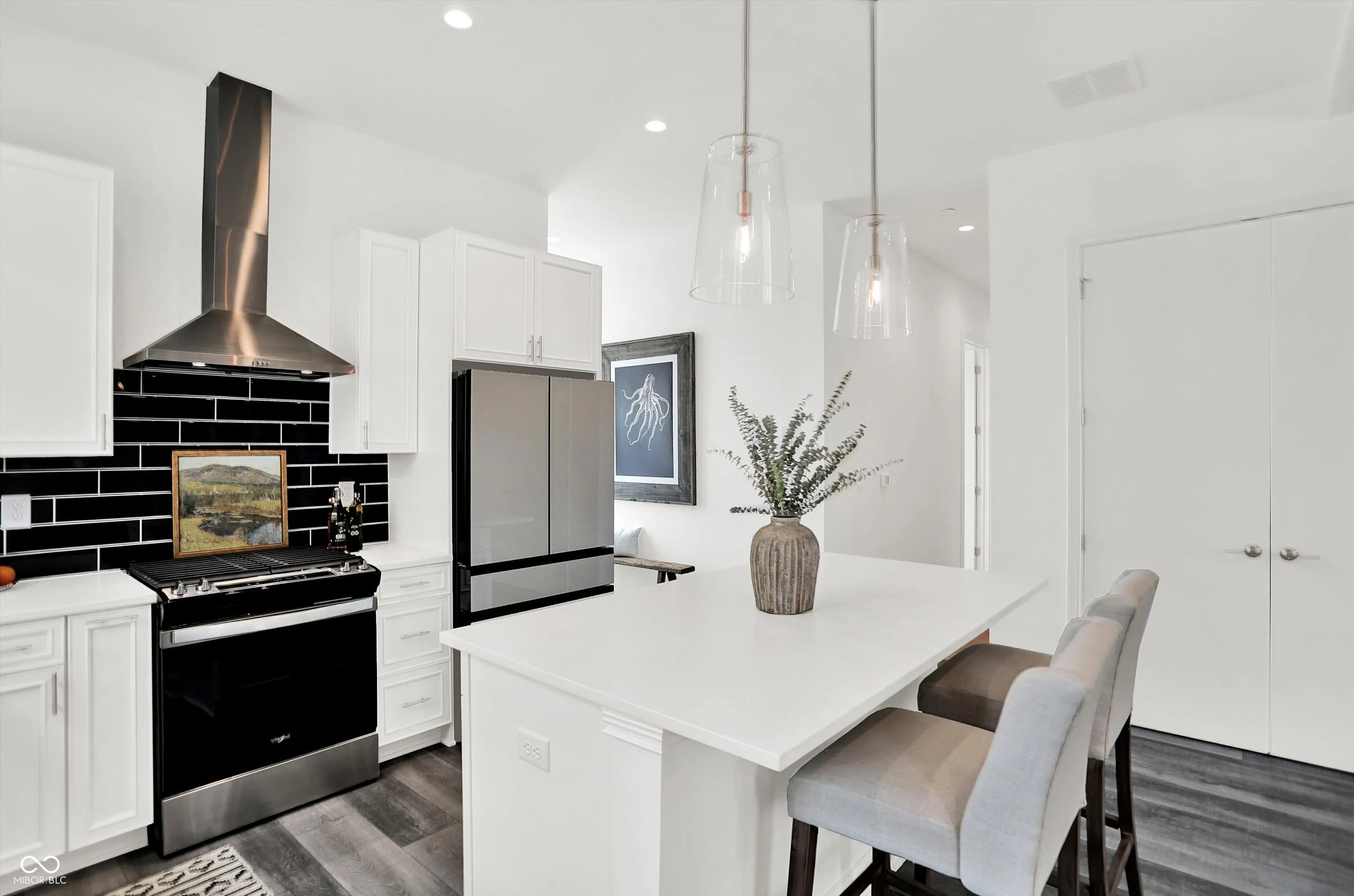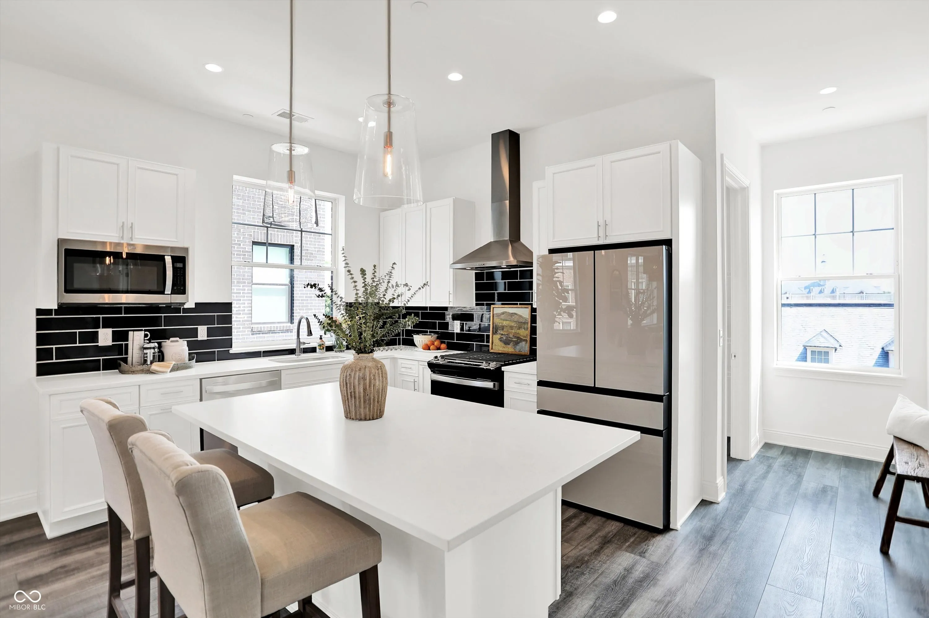 Welcome to 920 Veterans Way, a never-lived-in luxury end unit offering superior privacy, designer finishes, and a rare attached 2-car garage with direct interior access-no elevators or parking garages required. This spacious 1,515 sq ft, 2-bedroom, 2-bath home showcases 10′ ceilings, abundant natural light from multiple exposures, and a private covered balcony facing the courtyard, perfect for relaxing outdoors. Inside, the open-concept design features luxury vinyl plank flooring, designer lighting, Smart Home technology, and an elevated finish package. The kitchen impresses with quartz countertops, soft-close cabinetry, subway-tile backsplash, upgraded hardware, a walk-in pantry, and a large island ideal for entertaining. The living and dining spaces offer seamless flow and expansive windows, creating a bright, modern aesthetic. Both bedrooms include generous closets and abundant storage, while the baths feature quartz vanities, premium tilework, and stylish fixtures. Additional highlights include a whole-building water softener, secure private entry, a dog wash station, and a tranquil courtyard with fountain views. The building’s attractive brick and masonry exterior complements its urban-loft character and prime setting in the sought-after Melange community. Perfectly positioned just steps from the Monon Trail and Carmel’s vibrant Arts & Design District, residents enjoy unmatched walkability to Midtown Plaza, the Palladium, Christkindlmarkt, the Farmers Market, restaurants, coffee shops, and boutiques. This maintenance-free residence blends upscale design, private amenities, and a premier location-delivering the best of Carmel living in one elegant package.