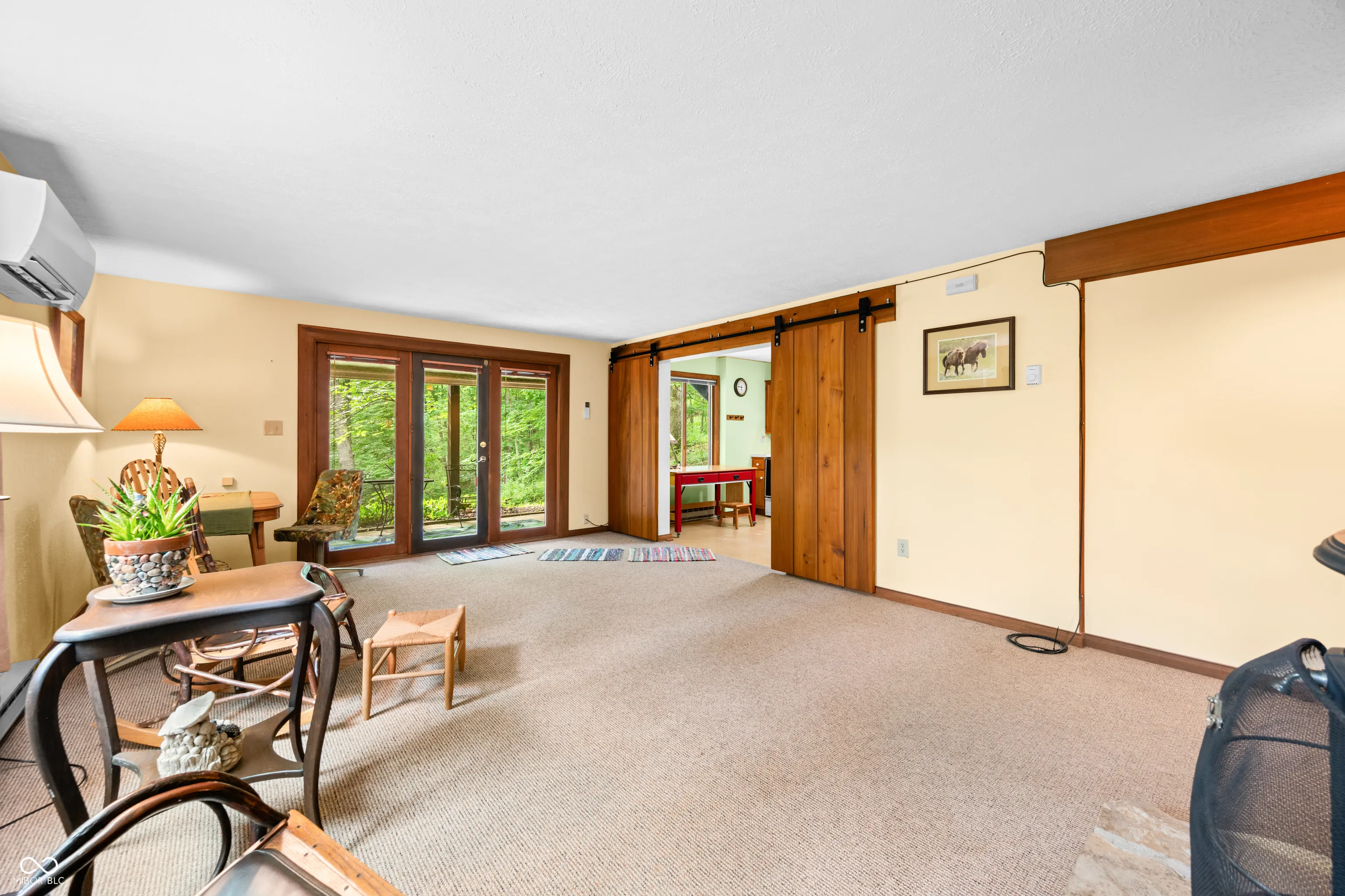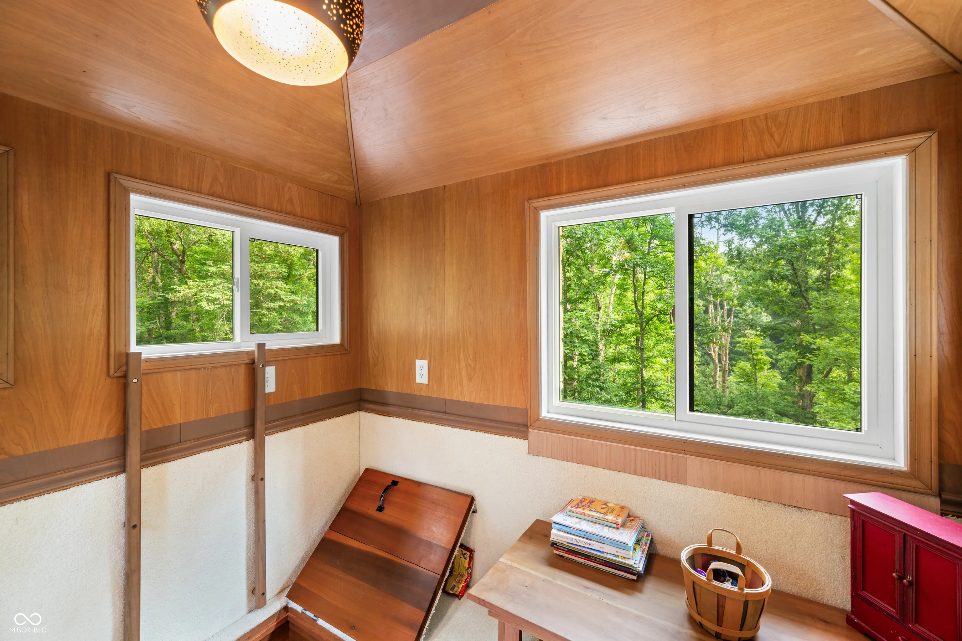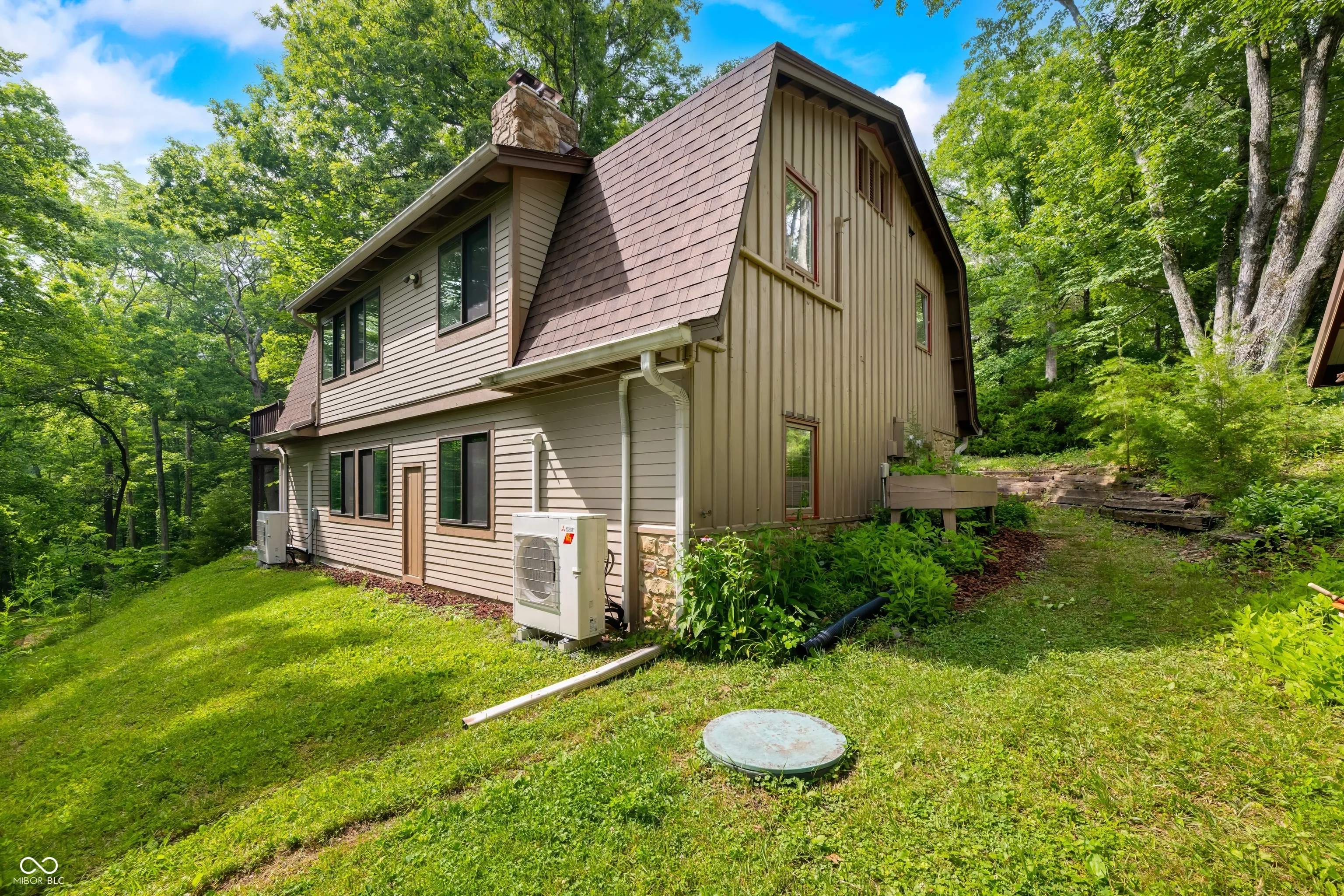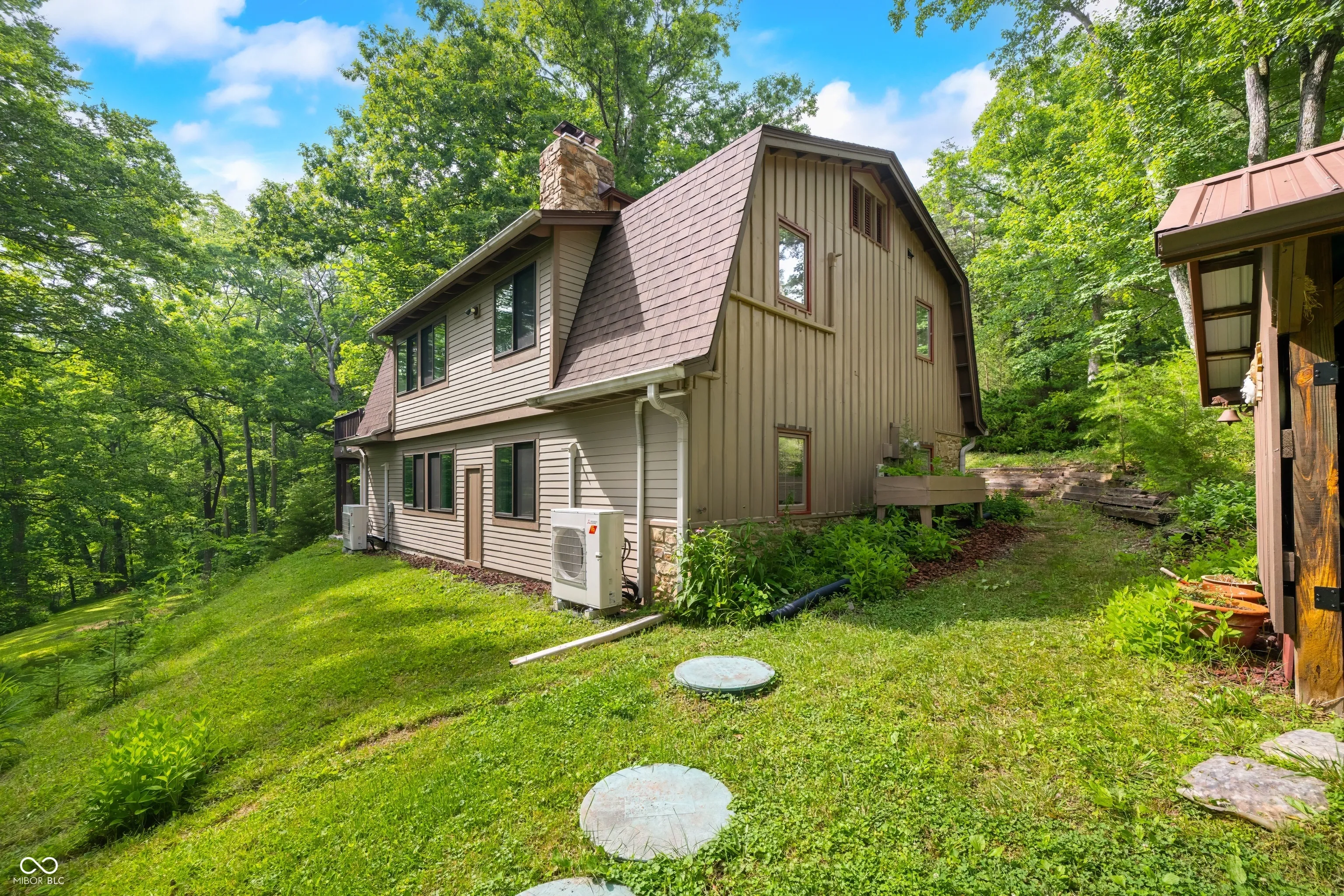 This might just be the most unique home in all of Brown County! The exterior of this home has a barn shape roof with a cupola for getting up close views of the birds and possible eagles soaring by! The cupola has a custom made ladder access resembling that of a library ladder and would be the perfect spot to read, meditate, or just enjoy the sights all around! The home sits on just over 2 acres and has access and view of the shared pond. Enjoy the outdoors from the covered patio on the lower level or the covered deck on the main level, both have a relaxing view of the pond and garden area. There is a detached two car garage with a 17’x13′ workshop and 8’x13′ office area not to mention an abundance of storage, speaking of storage there is also a 23’x35′ barn with double sliding doors and inside you will find a 10’x15′ craft room! Inside the split level home you are greeted with brick flooring the main level features an abundance of windows, double Brown County stone fireplace, open concept great room and poplar kitchen cabinets, walk-in closet and his and her bathrooms. The lower level has two woodburning stoves with Brown County stone backdrops, hardwood kitchen cabinets, large great room, bedroom, bathroom/laundry room and utility room. This home does NOT qualify for a short term rental, but is the perfect set up for a “Homestay” or bed and breakfast.