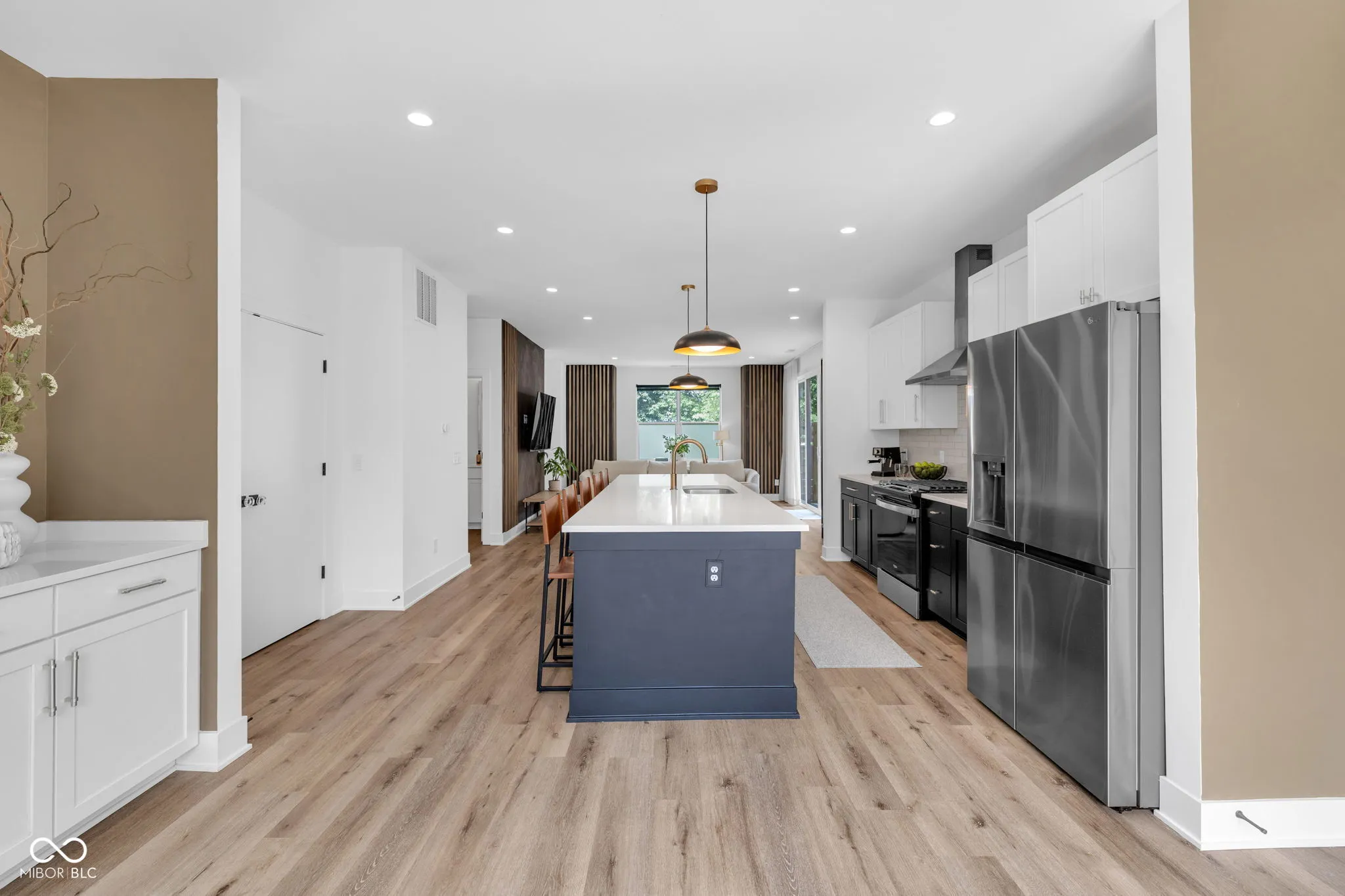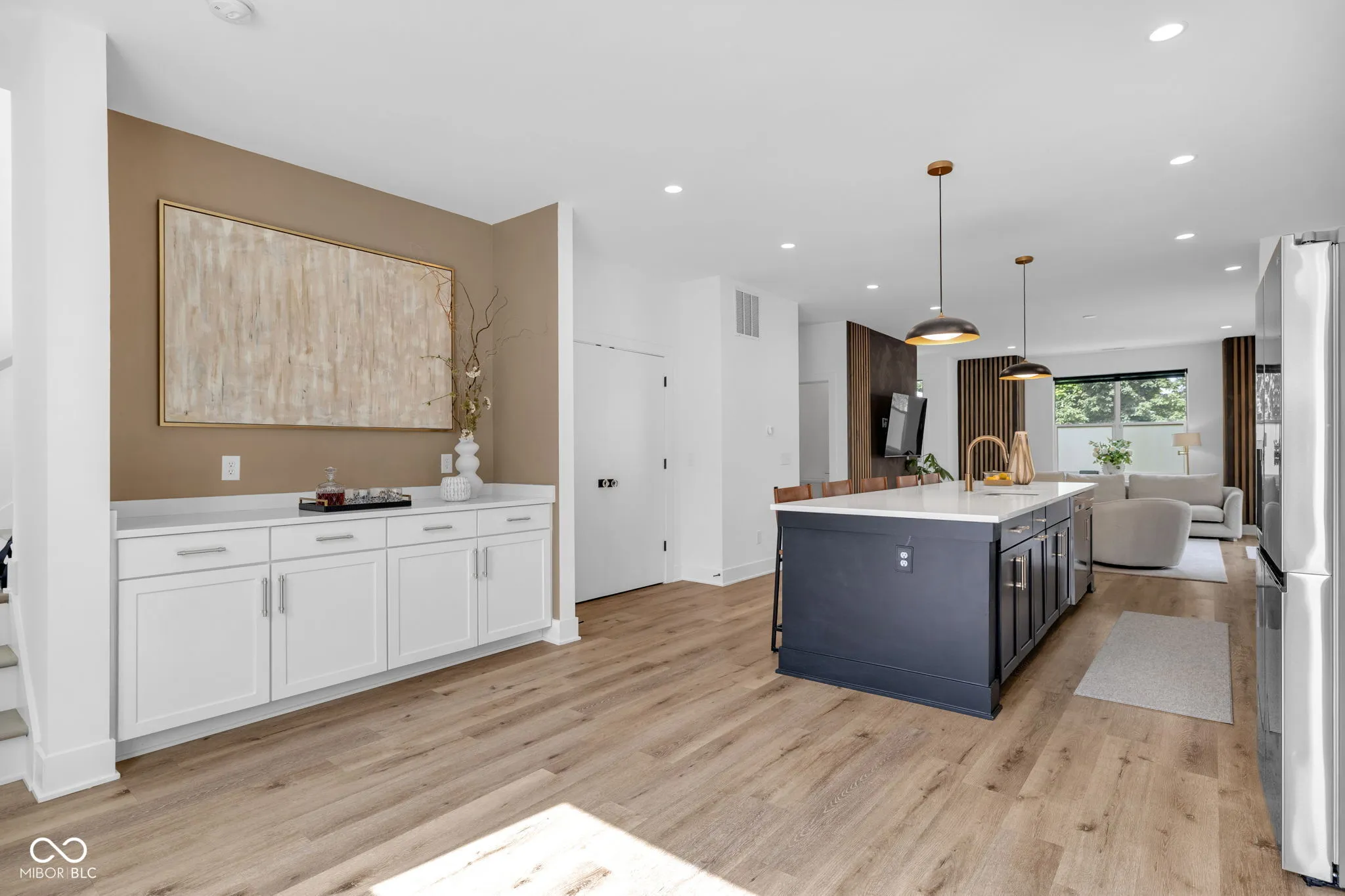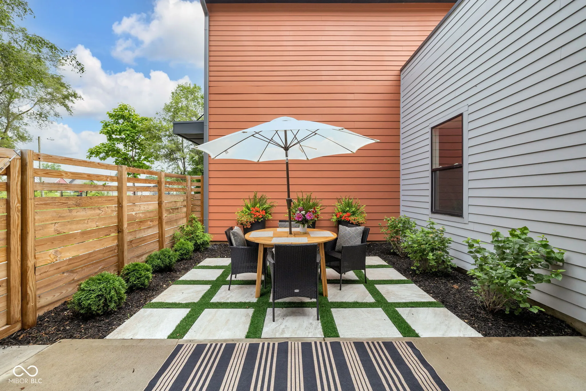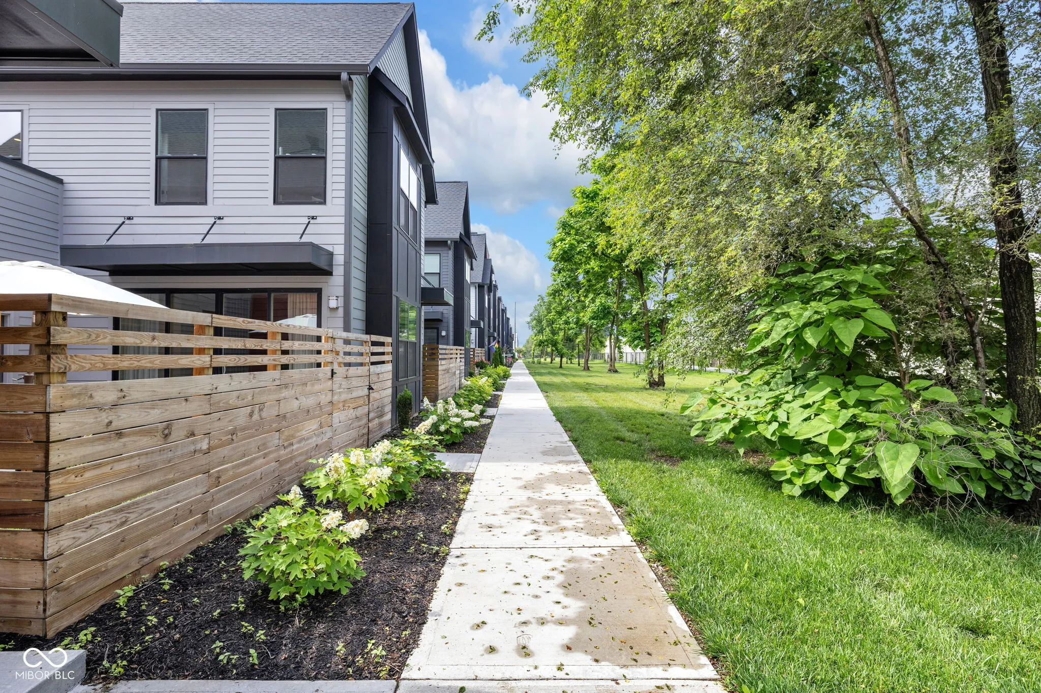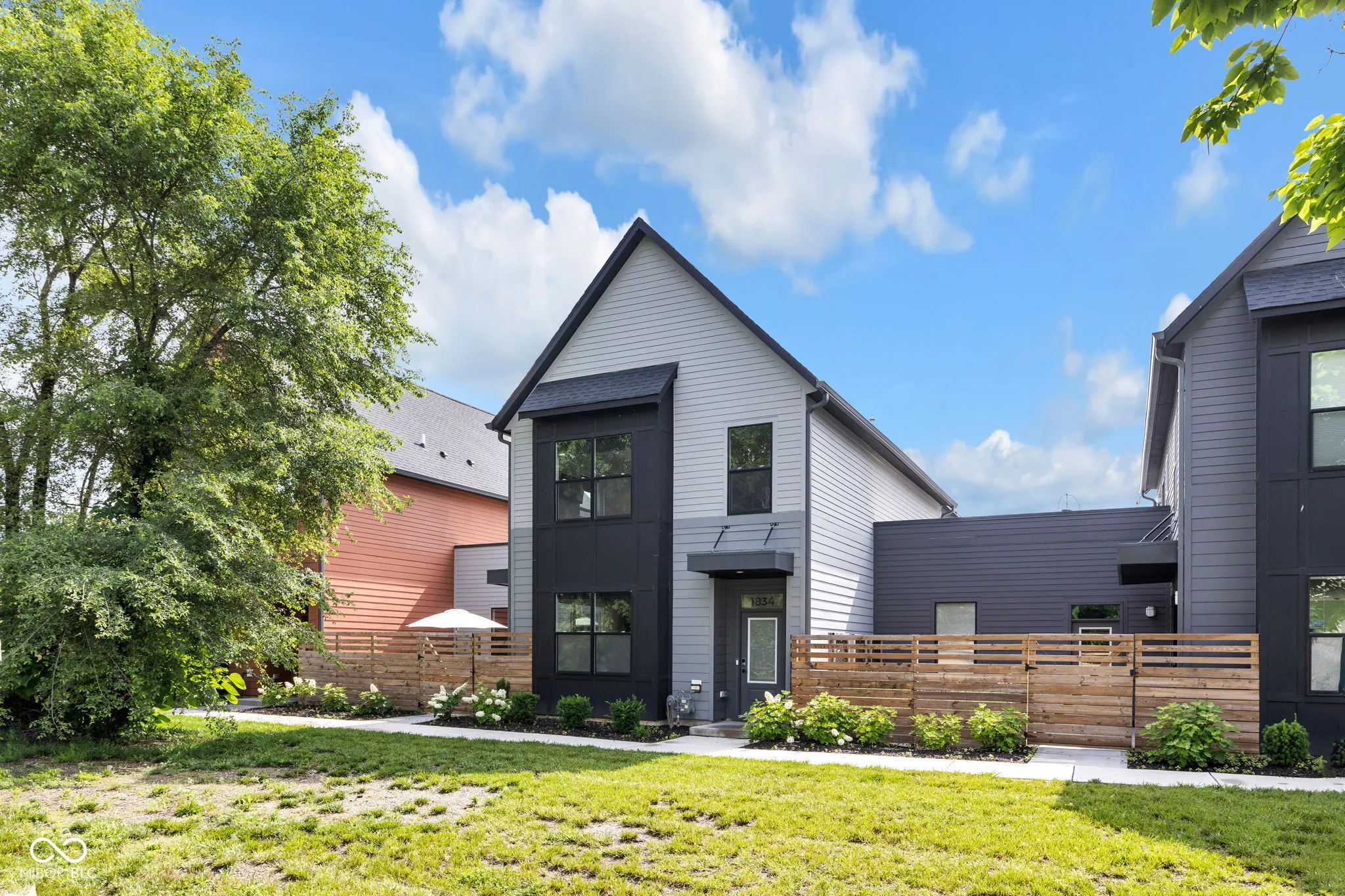 Welcome to Monon Roots, a thoughtfully upgraded 2 bedroom, 2.5 bathroom Courtyard Home in the heart of downtown Indianapolis. This property offers rare outdoor living with a private fenced-in courtyard, a rooftop deck, and direct access to the Monon Trail-just steps from Provider, Solely Wine Shop, and The Alchemist. The main level features an open floor plan with durable LVP flooring, custom Hunter Douglas window treatments, and great natural light throughout. The kitchen is equipped with quartz countertops, stainless steel appliances, a large center island, walk-in pantry, and a built-in buffet ideal for a coffee bar or serving station. An attached two-car garage connects directly to the kitchen for added convenience. Upstairs, both bedrooms are generously sized. The primary suite includes a comfort-height dual vanity and a large walk-in shower. Significant updates include Cali Pro Aged Hickory hardwood flooring throughout the upper level, a custom wet bar, designer-grade cabinet pulls, a new kitchen faucet, white oak stained stair treads installed, and upgraded tile in the upstairs bathroom. Additional enhancements continue outside with turf installation, stamped concrete, and refreshed landscaping in the courtyard. A custom pergola with drop-down shades was added in 2025 to extend outdoor living. Inside, a bold wallpapered half bath and a custom accent wall in the living room. Low-maintenance living, quality finishes, and one of Indy’s most walkable locations make this home a standout!