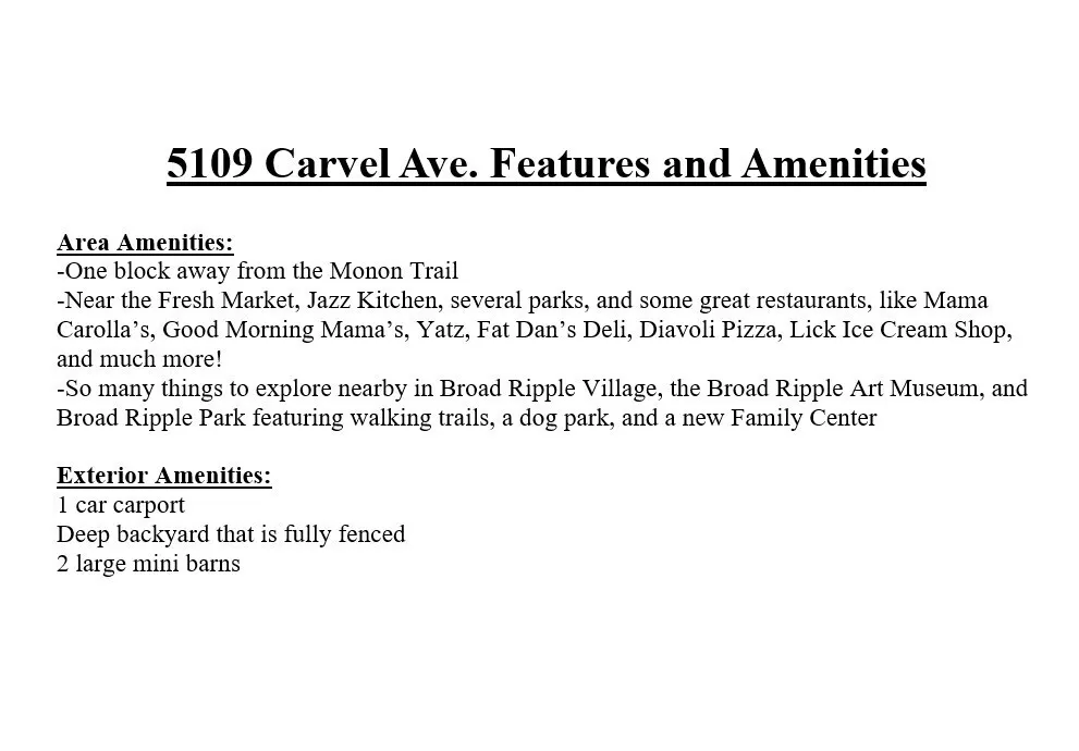 Just a block from the Monon Trail and close to the Fresh Market, Jazz Kitchen, parks, and Broad Ripple Village, this inviting home offers the perfect blend of charm and location. Enjoy a deep, fully fenced backyard, 1-car carport, and two large mini barns. Inside, the spacious 3-bed, 2-bath layout features hardwoods, a living room, formal dining, stainless steel appliances, and a new kitchen with soft-close cabinetry, tile, and granite. Both bathrooms are beautifully updated. The finished basement boasts a large Rec Room, storage room, new windows, and waterproof vinyl plank flooring. New ductless mini-split in the upstairs owner’s suite for optimal comfort. Come and join this great neighborhood in Broad Ripple.
