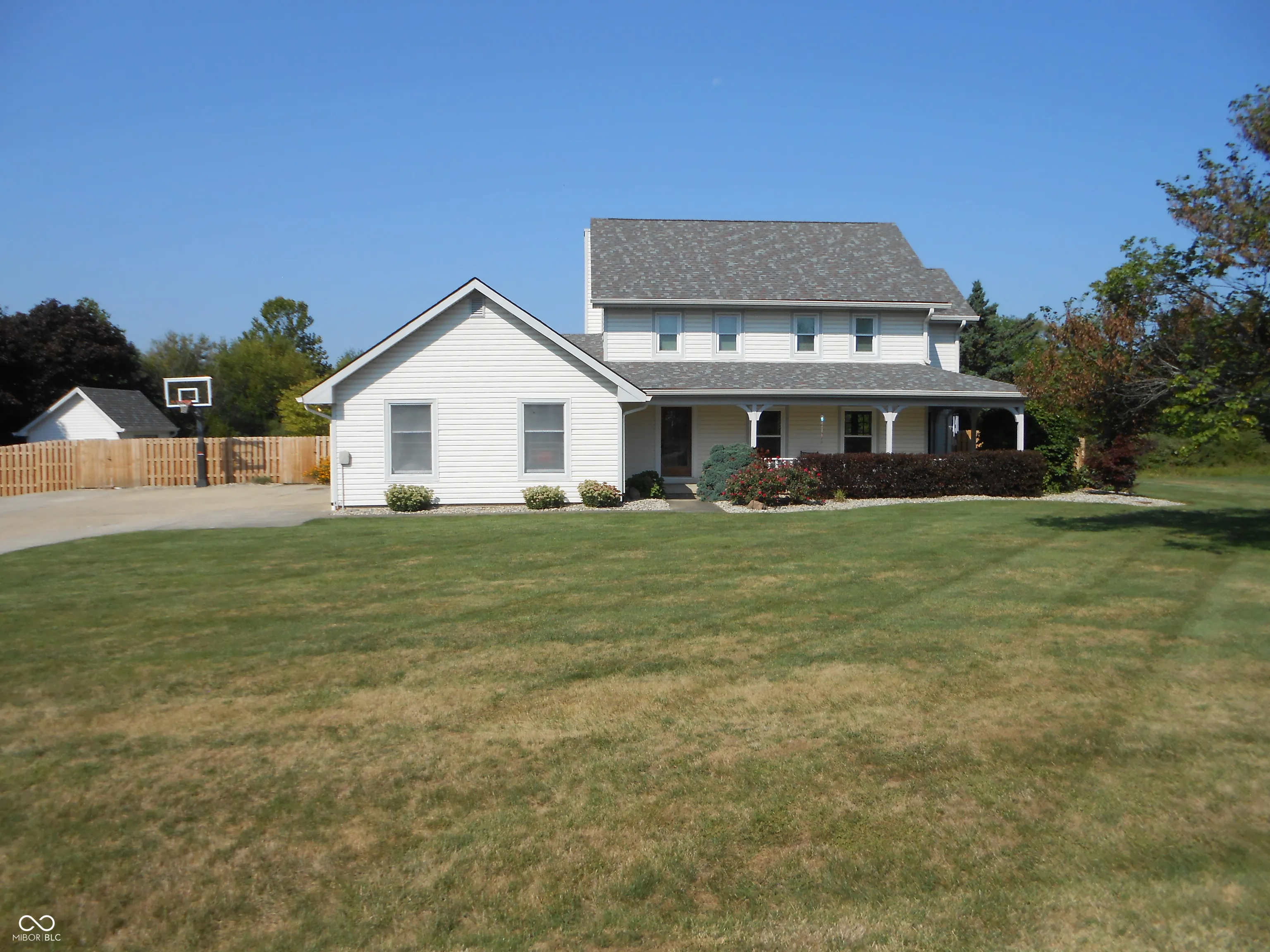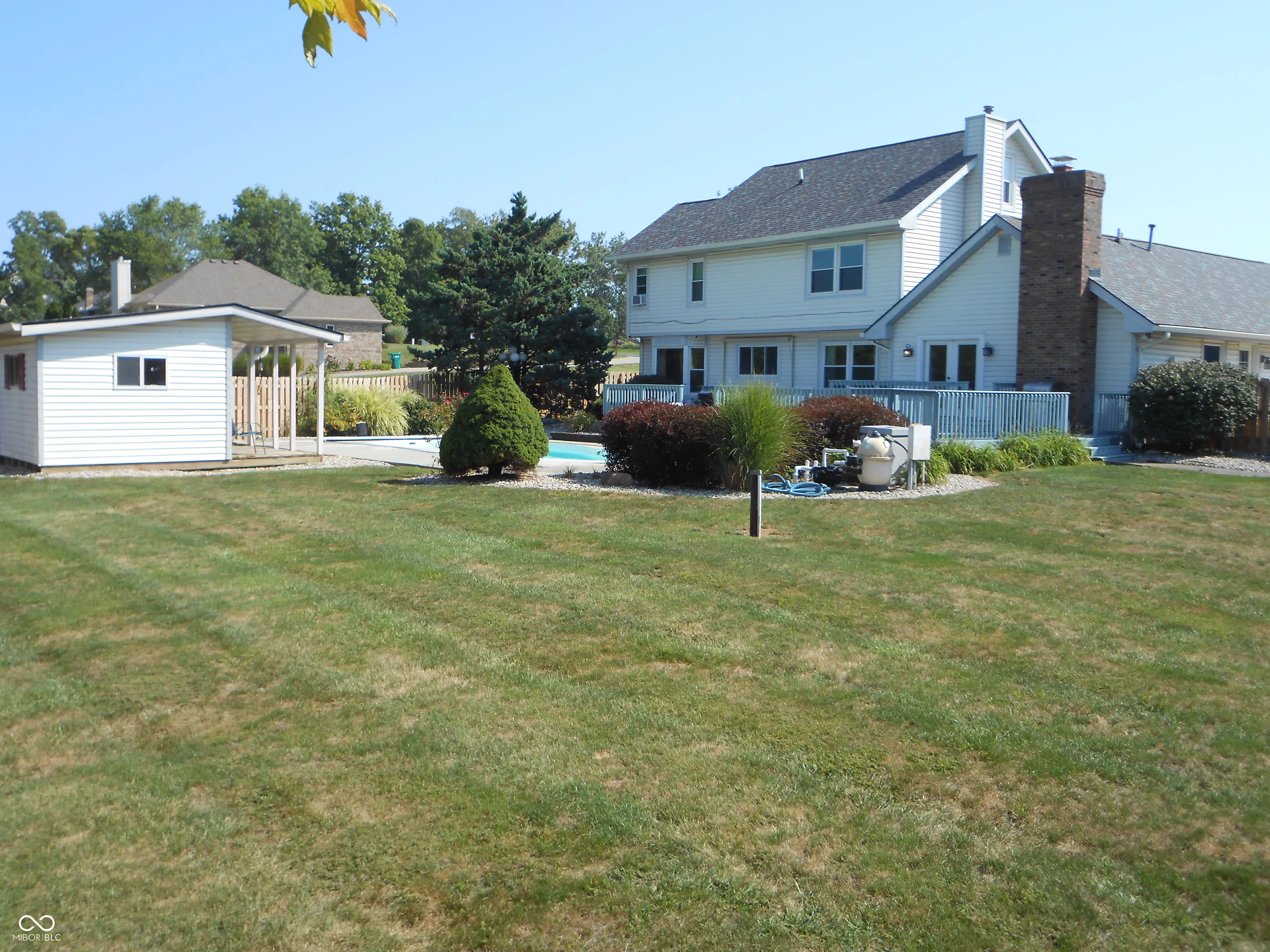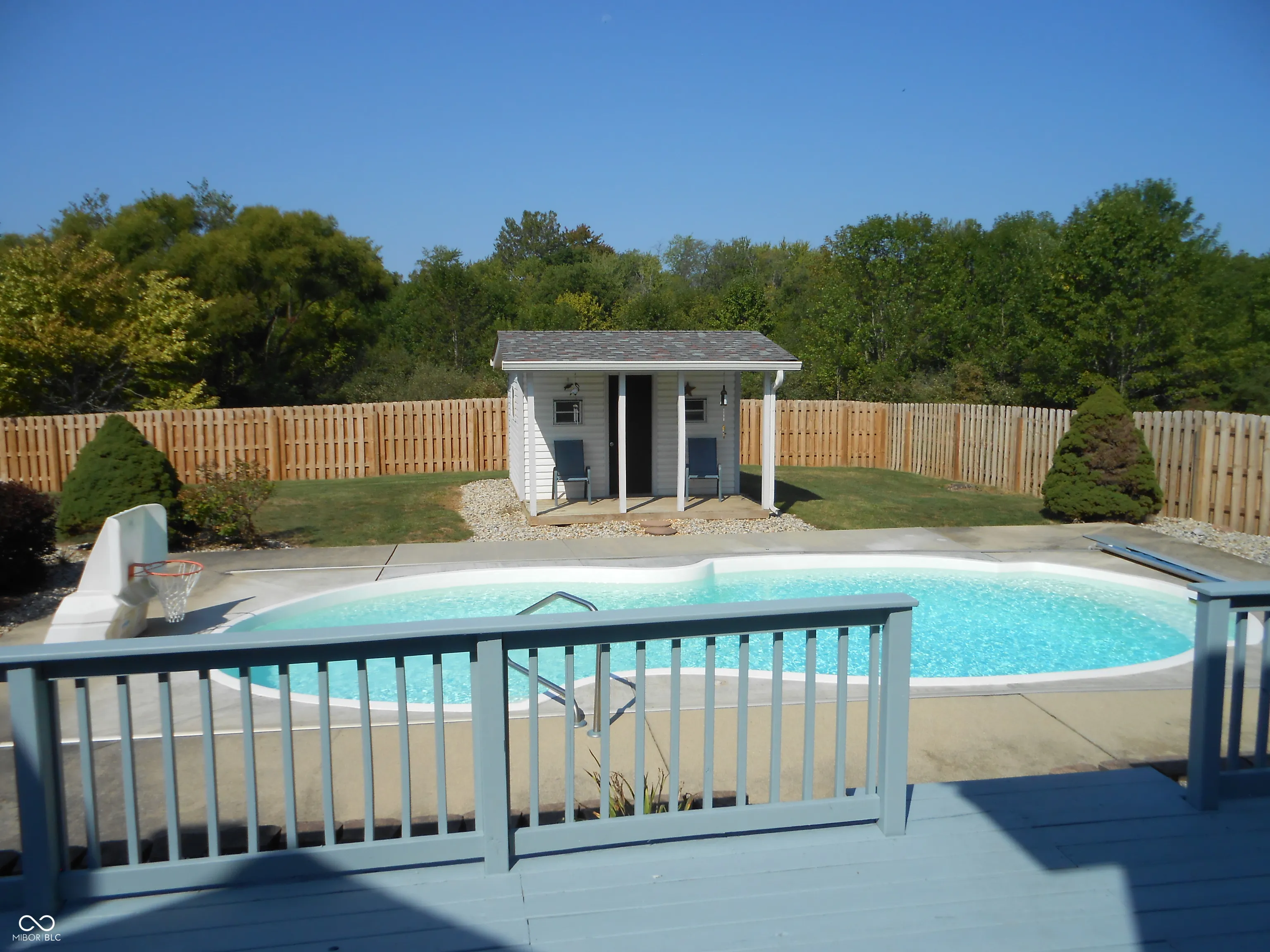 Pride of ownership with this home. Walk up to your covered wrap around front porch to sit and watch the Bold Eagles fly above. Living room with hardwood floors and tons of windows with a set of glass doors that open to your private den that has a large picture window that overlooks the private oasis in the backyard. Kitchen is wide open to the great room which adds ease to all your gatherings. Tons of cabinet space with granite countertops. Walk out of the great room to your oversized deck to watch the family enjoy the fiberglass inground pool that has a new pump and electric cover that was installed in 2022. Privacy fence fully encloses the large backyard which includes a pool house and a large shed for more storage space. Tons of parking space in the large concrete driveway that includes a basketball goal. New roof installed 4 years ago. Crawl space has a new sump pump and has been fully encapsulated professionally bye Indiana Foundation. Comes with a transferrable warranty. Owners have access to the pond at the end of the road.