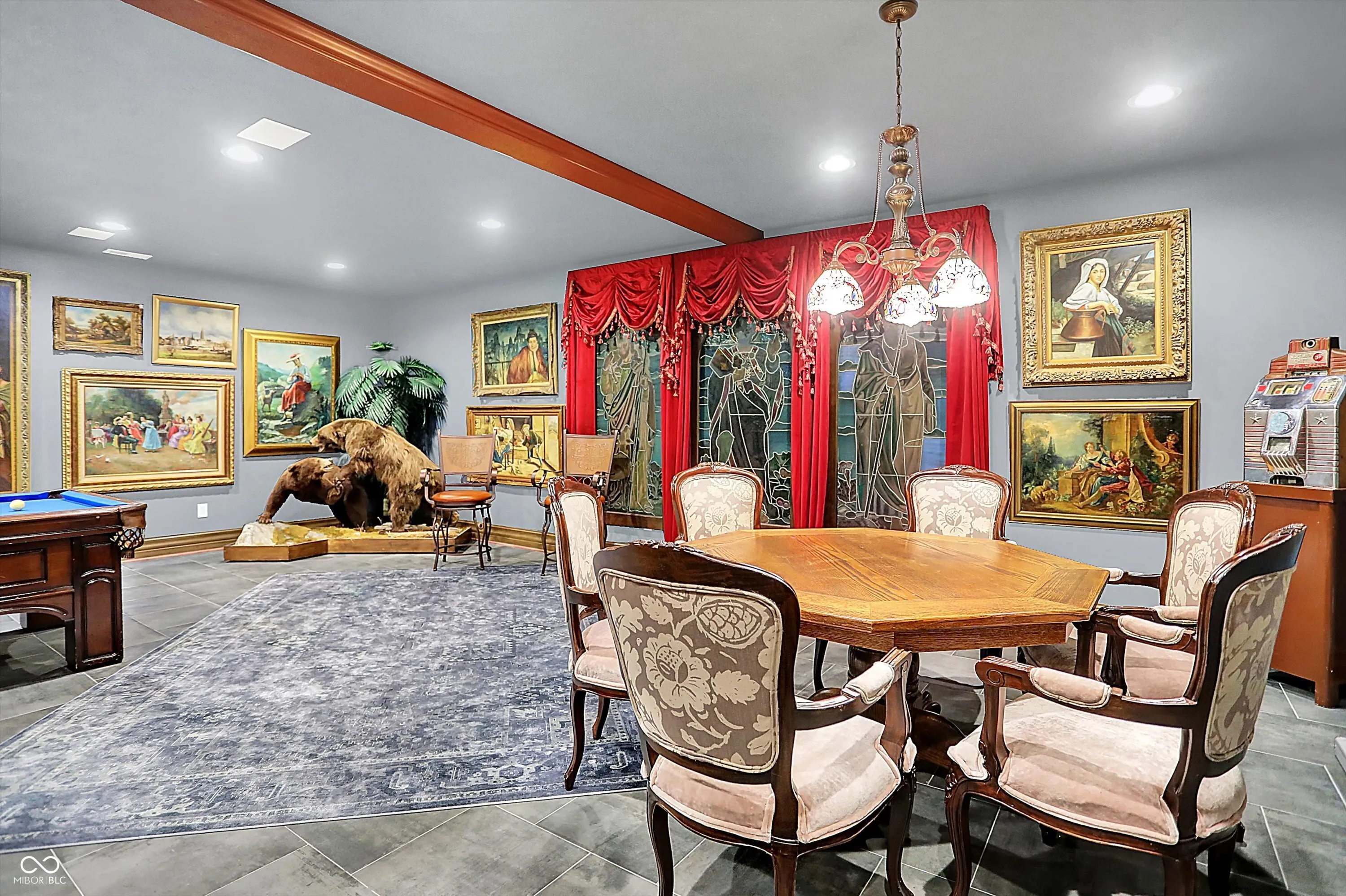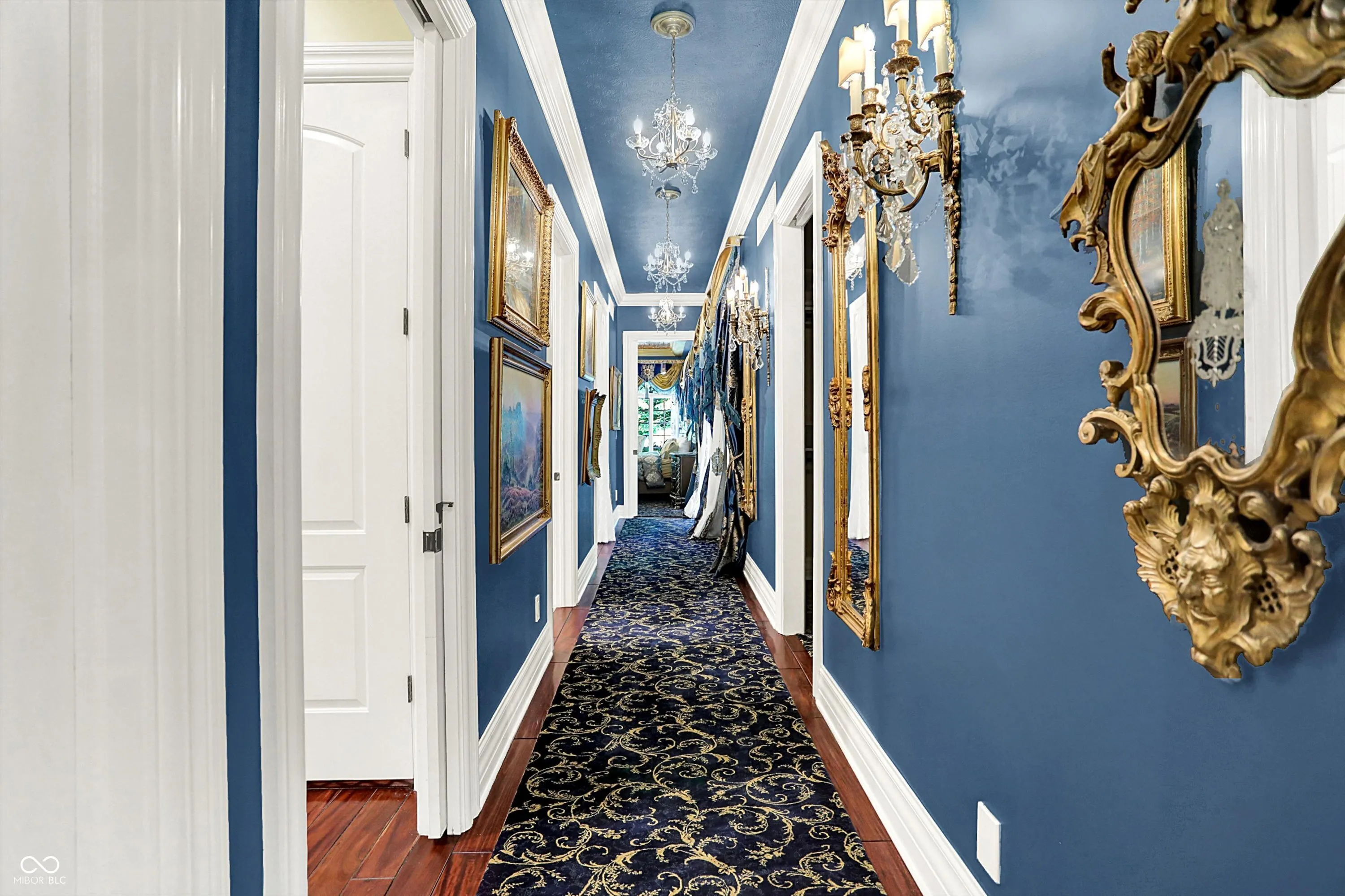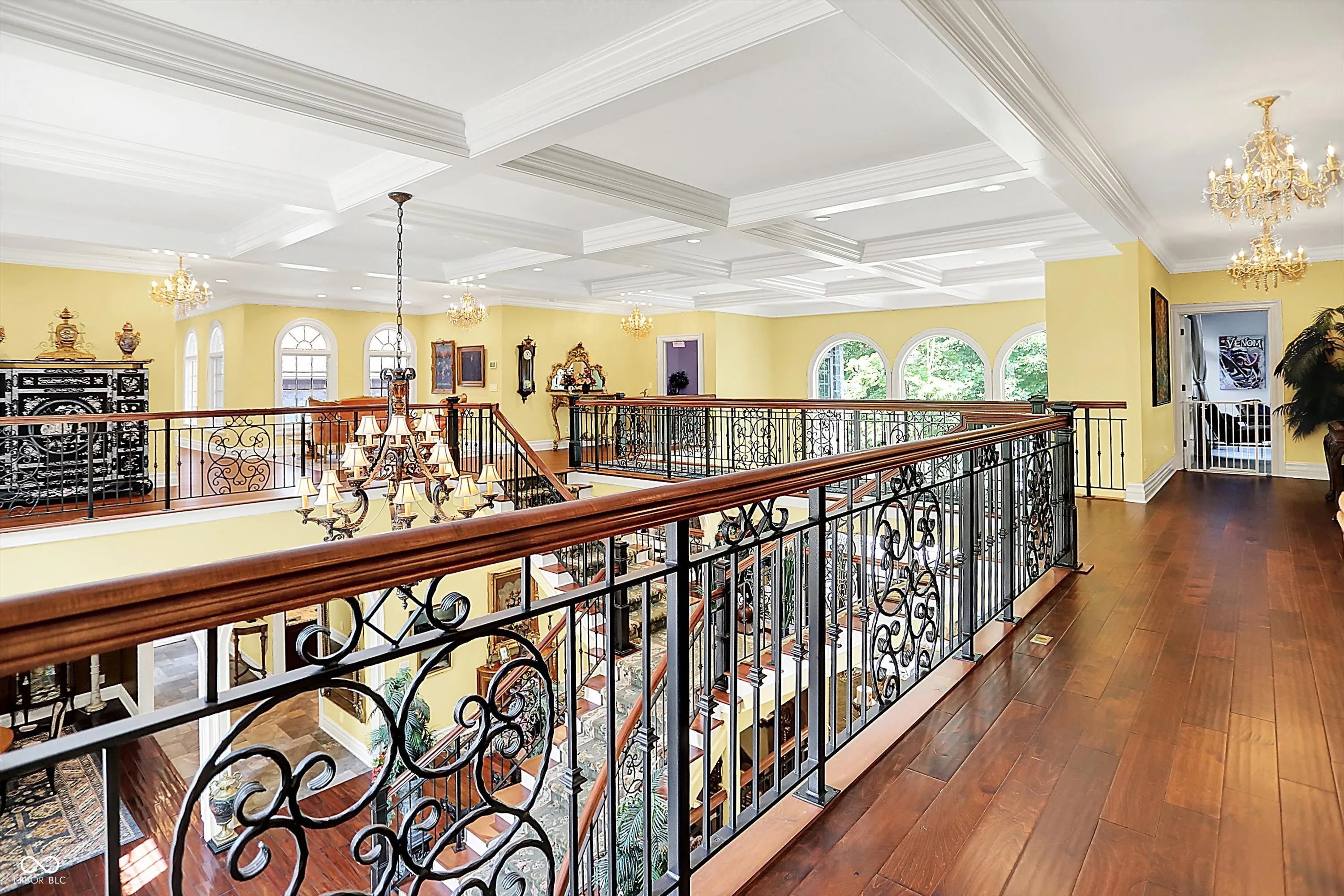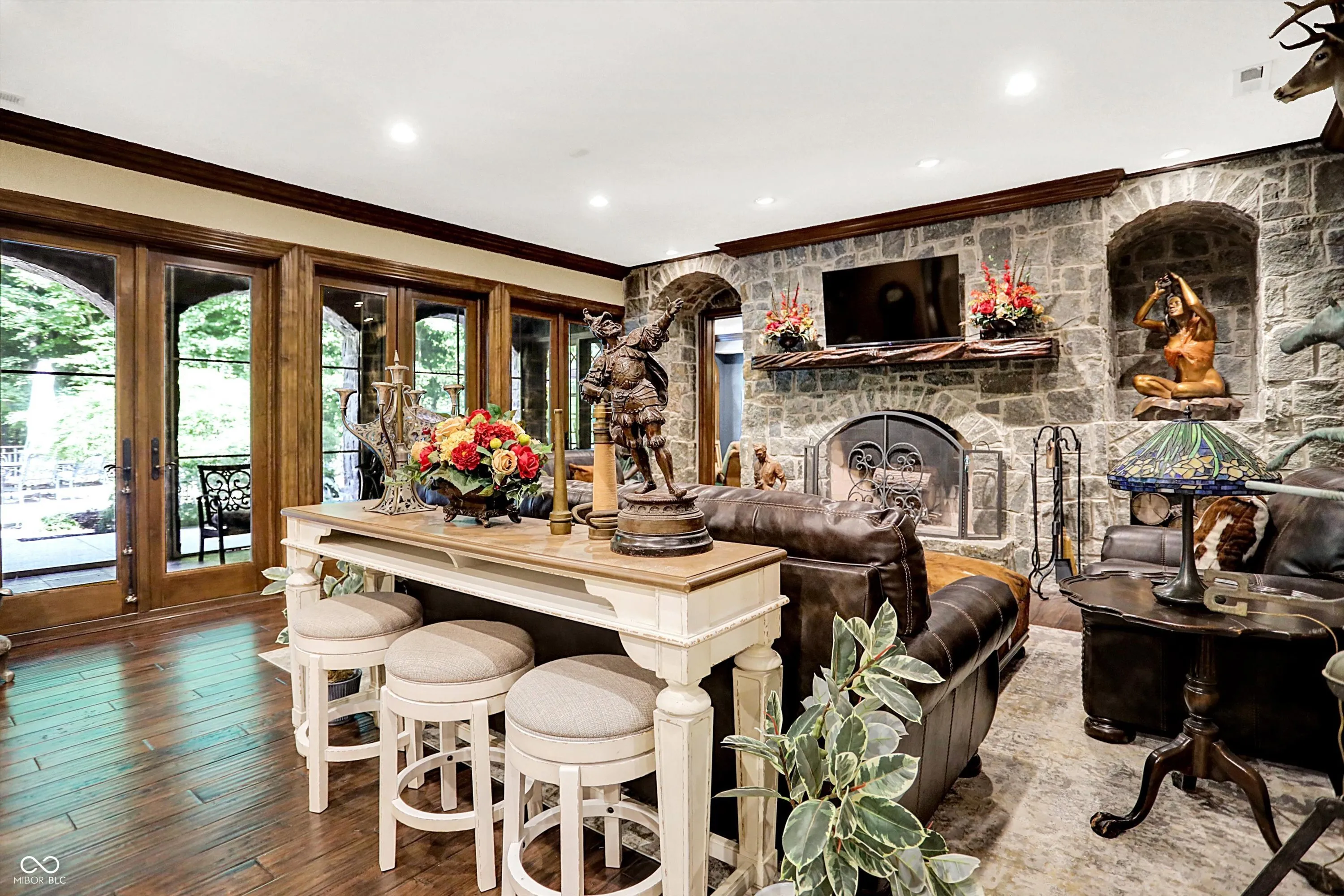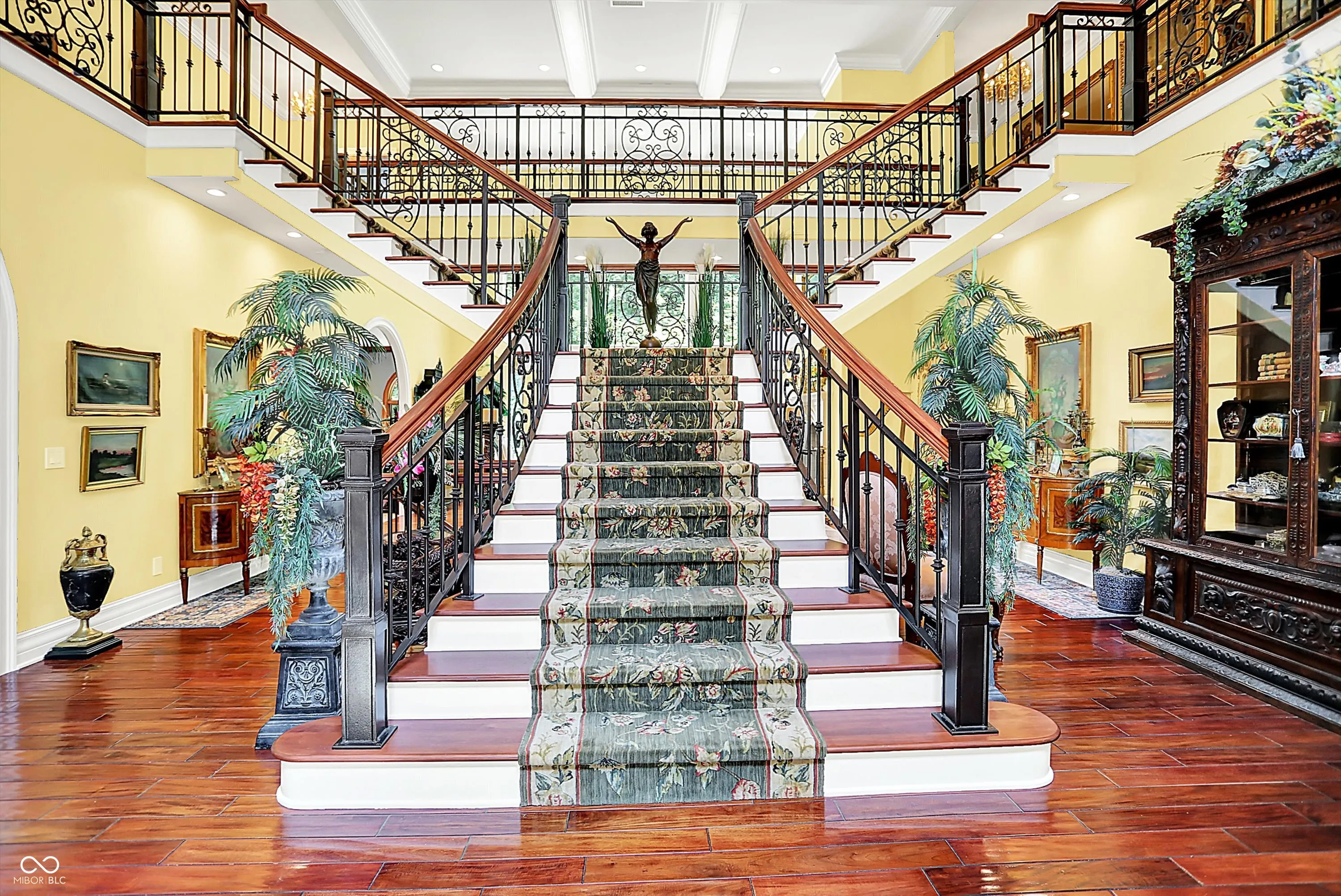 Step into timeless elegance with this extraordinary 13,000+ sq ft French Chateau-inspired estate, nestled on 3.81 secluded, wooded acres. Designed with luxury & comfort in mind, this masterfully crafted home offers an exceptional blend of refined architecture, thoughtful amenities, & serene outdoor living. Enter through grand double doors into a stunning interior where old-world charm meets modern sophistication. The main floor features a luxurious primary suite boasting dual walk-in closets, private laundry, heated floors, dual vanities, a whirlpool soaking tub, & a spacious walk-in glass shower. Enjoy morning coffee from your private balcony or descend a discreet staircase to a private home office tucked away in the finished lower level. The main level continues with formal & casual living spaces, convenient elevator, including a stately dining room and two of the home’s three wood-burning fireplaces-perfect for intimate evenings or grand entertaining. Upstairs, a secondary master suite provides a private retreat for guests or extended family. Two additional bedrooms, each with ensuite baths & walk-in closets, share the upper level along with a spacious bonus room, loft, additional den area with half bath, & second laundry room for convenience. The fully finished walk-out lower level is an entertainer’s paradise, featuring a kitchenette & dining area, expansive family room, game room, private theater room, exercise room, & a fifth bedroom with a private full bath and walk-in closet. Outside, stone patios invite al fresco dining and lounging with an outdoor kitchen & hot tub, all surrounded by lush landscaping & peaceful wooded views. The finished garage takes versatility to the next level, doubling as an indoor basketball half court perfect for year-round recreation or fitness. This Zionsville estate offers every imaginable amenity & the timeless allure of European design, behind a gated entry. Discover unparalleled luxury, privacy, and sophistication.