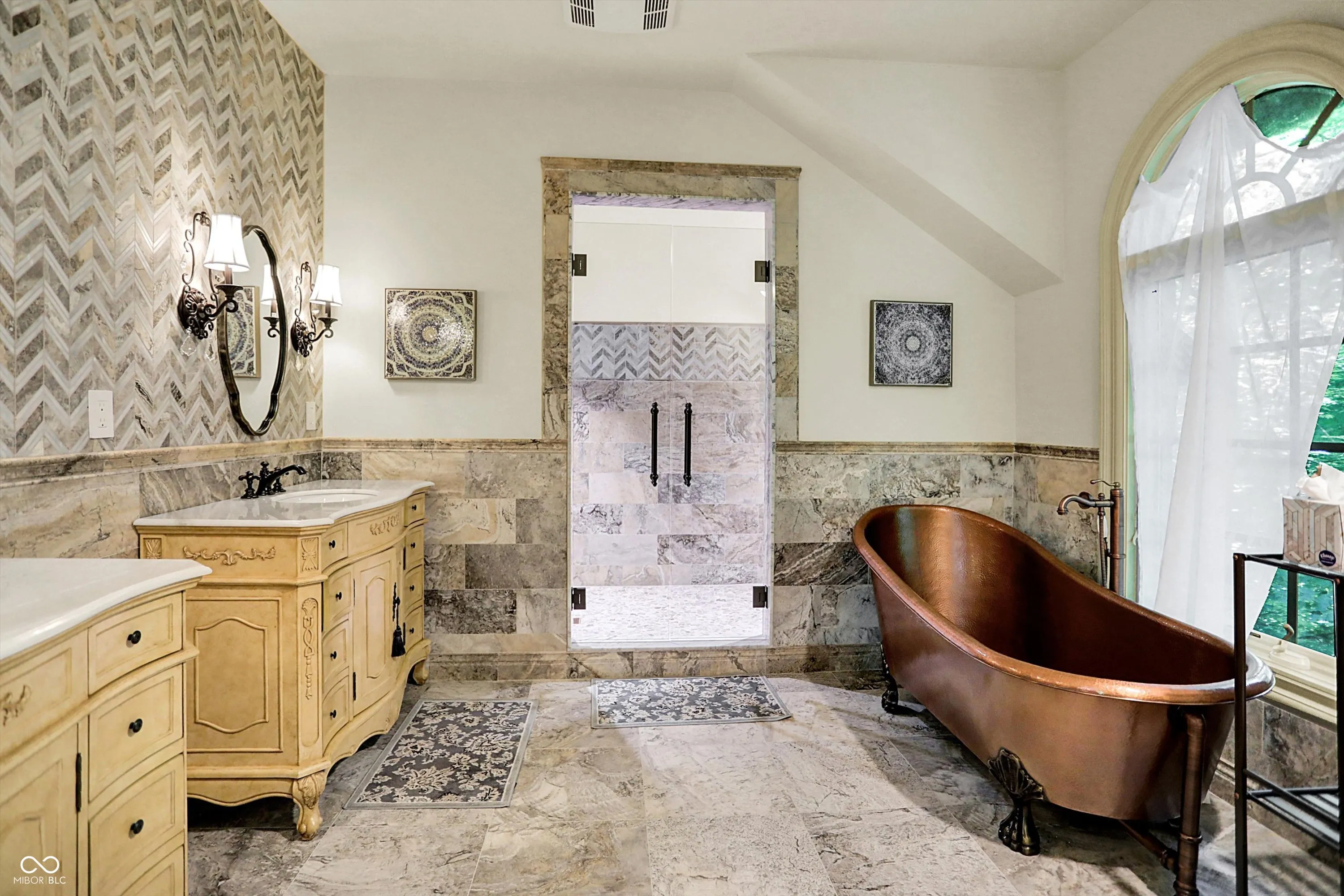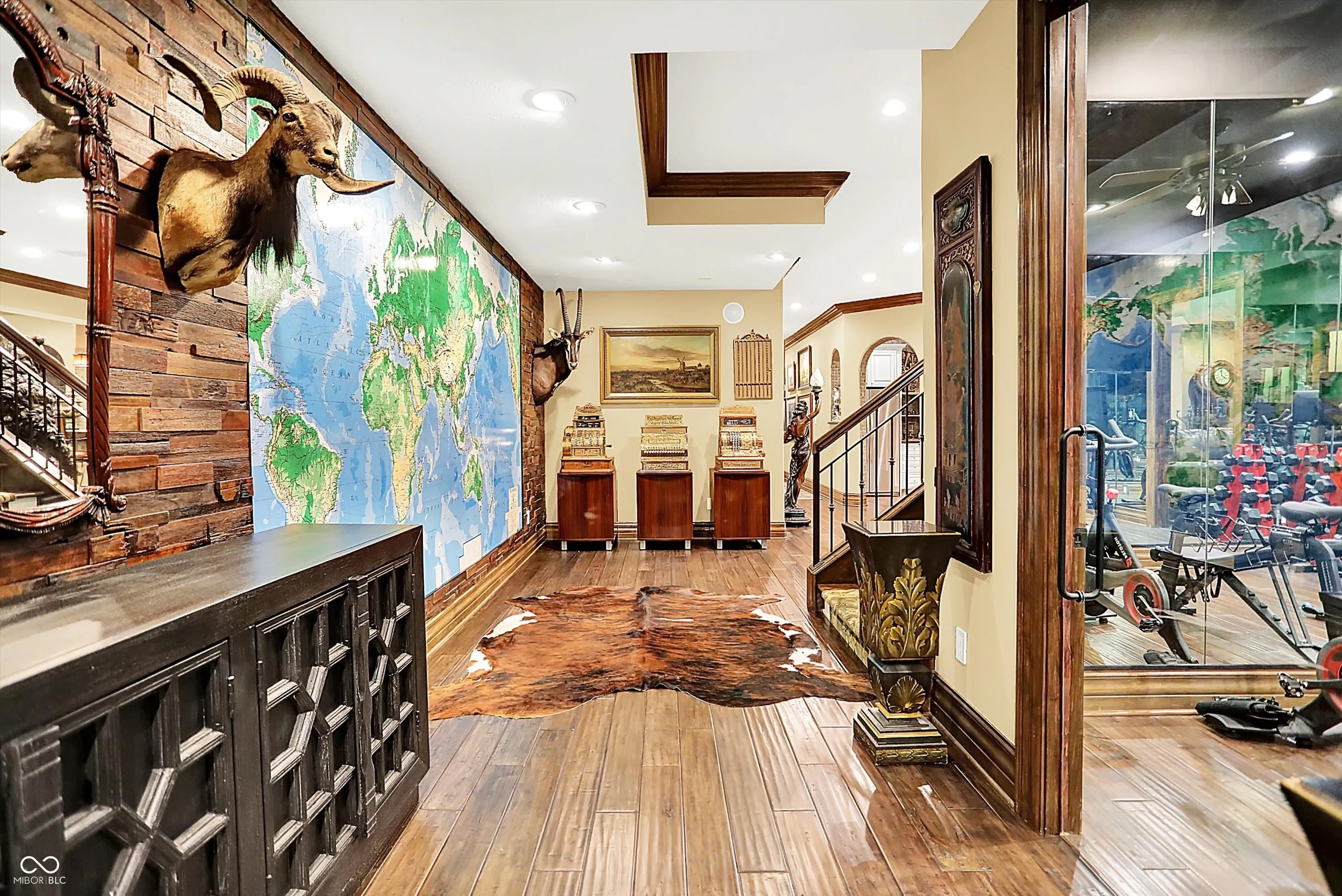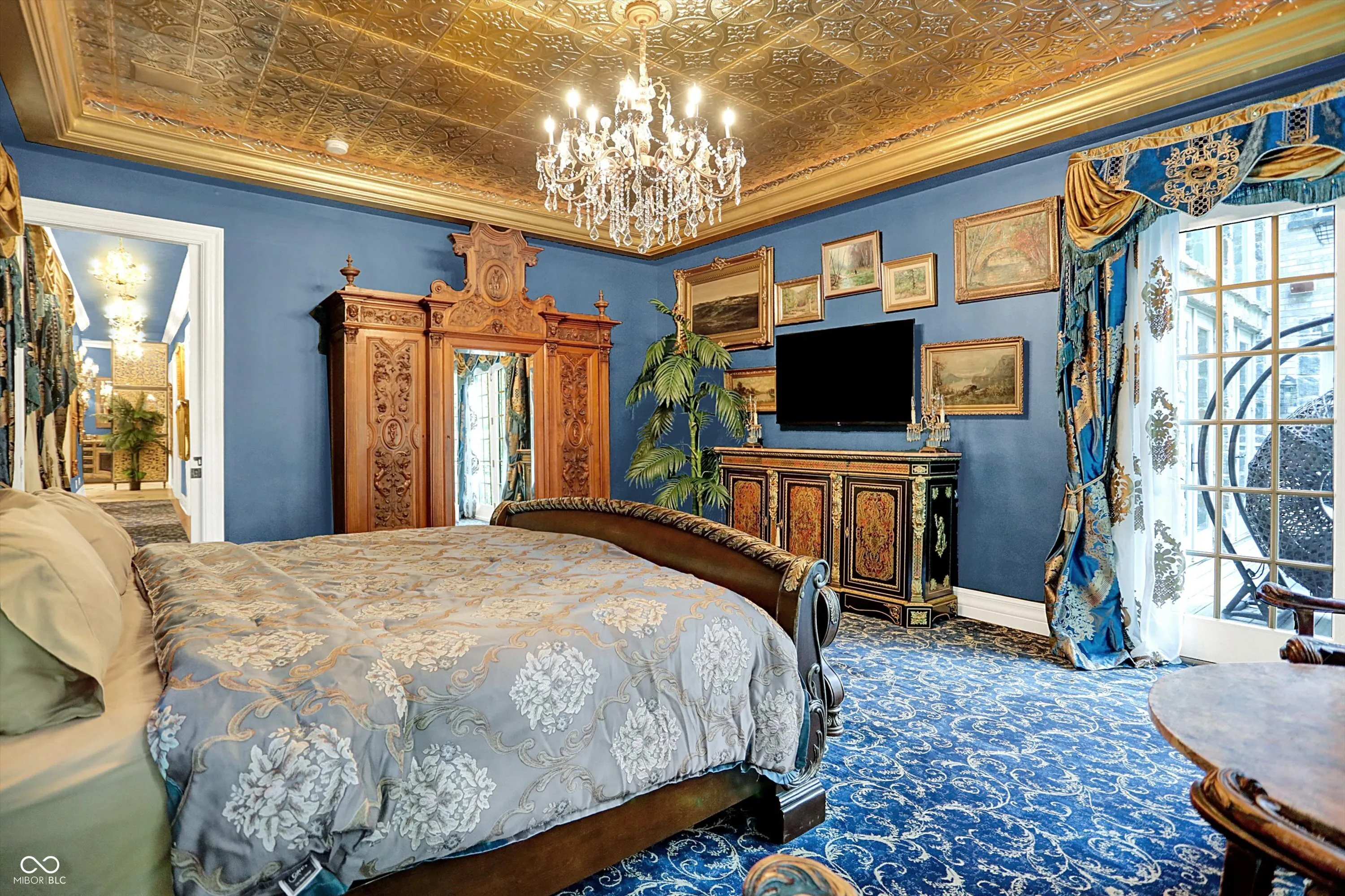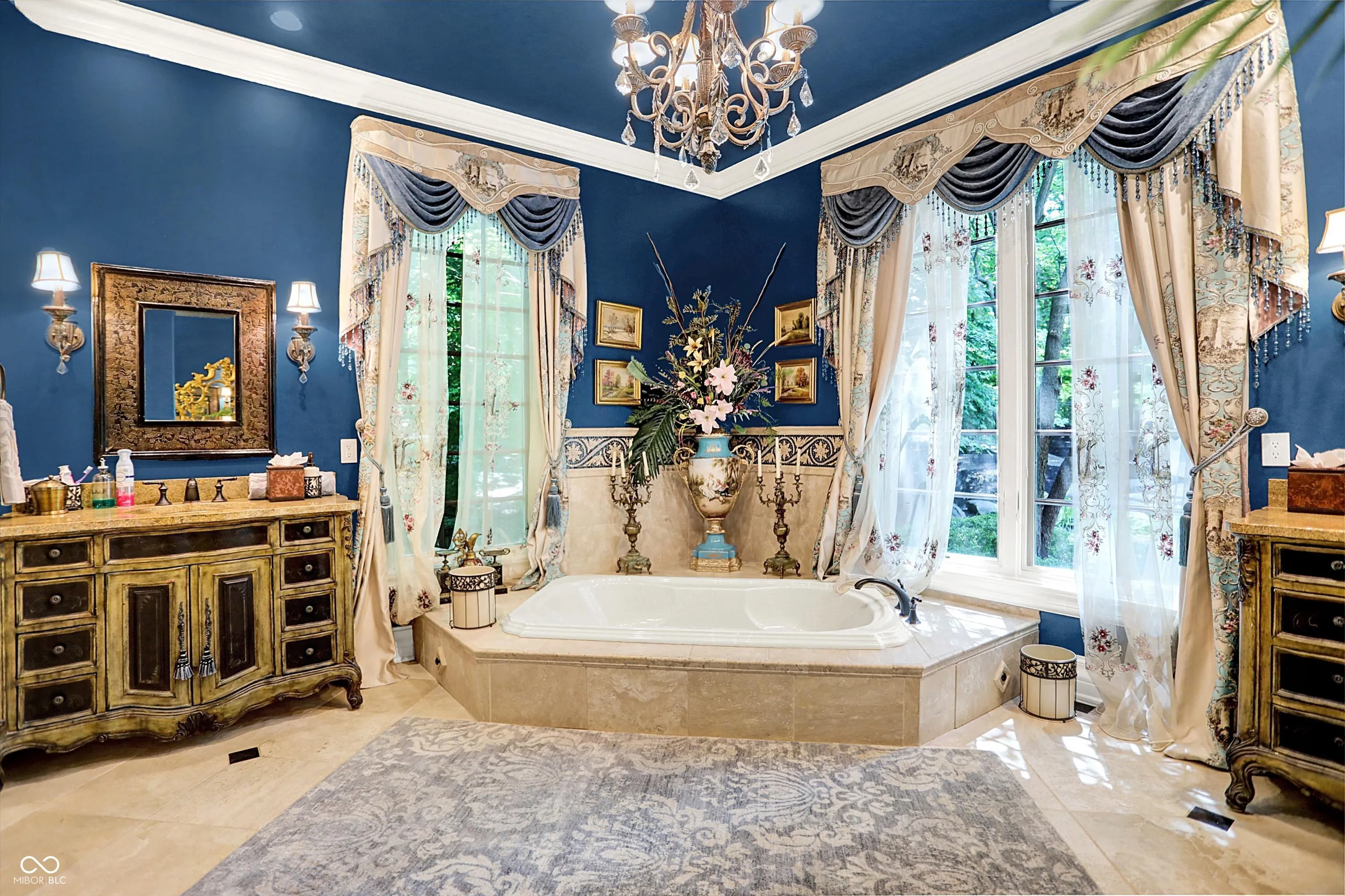 Step into timeless elegance with this extraordinary 13,000+ sq ft French Chateau-inspired estate, nestled on 3.81 secluded, wooded acres. Designed with luxury & comfort in mind, this masterfully crafted home offers an exceptional blend of refined architecture, thoughtful amenities, & serene outdoor living. Enter through grand double doors into a stunning interior where old-world charm meets modern sophistication. The main floor features a luxurious primary suite boasting dual walk-in closets, private laundry, heated floors, dual vanities, a whirlpool soaking tub, & a spacious walk-in glass shower. Enjoy morning coffee from your private balcony or descend a discreet staircase to a private home office tucked away in the finished lower level. The main level continues with formal & casual living spaces, convenient elevator, including a stately dining room and two of the home’s three wood-burning fireplaces-perfect for intimate evenings or grand entertaining. Upstairs, a secondary master suite provides a private retreat for guests or extended family. Two additional bedrooms, each with ensuite baths & walk-in closets, share the upper level along with a spacious bonus room, loft, additional den area with half bath, & second laundry room for convenience. The fully finished walk-out lower level is an entertainer’s paradise, featuring a kitchenette & dining area, expansive family room, game room, private theater room, exercise room, & a fifth bedroom with a private full bath and walk-in closet. Outside, stone patios invite al fresco dining and lounging with an outdoor kitchen & hot tub, all surrounded by lush landscaping & peaceful wooded views. The finished garage takes versatility to the next level, doubling as an indoor basketball half court perfect for year-round recreation or fitness. This Zionsville estate offers every imaginable amenity & the timeless allure of European design, behind a gated entry. Discover unparalleled luxury, privacy, and sophistication.