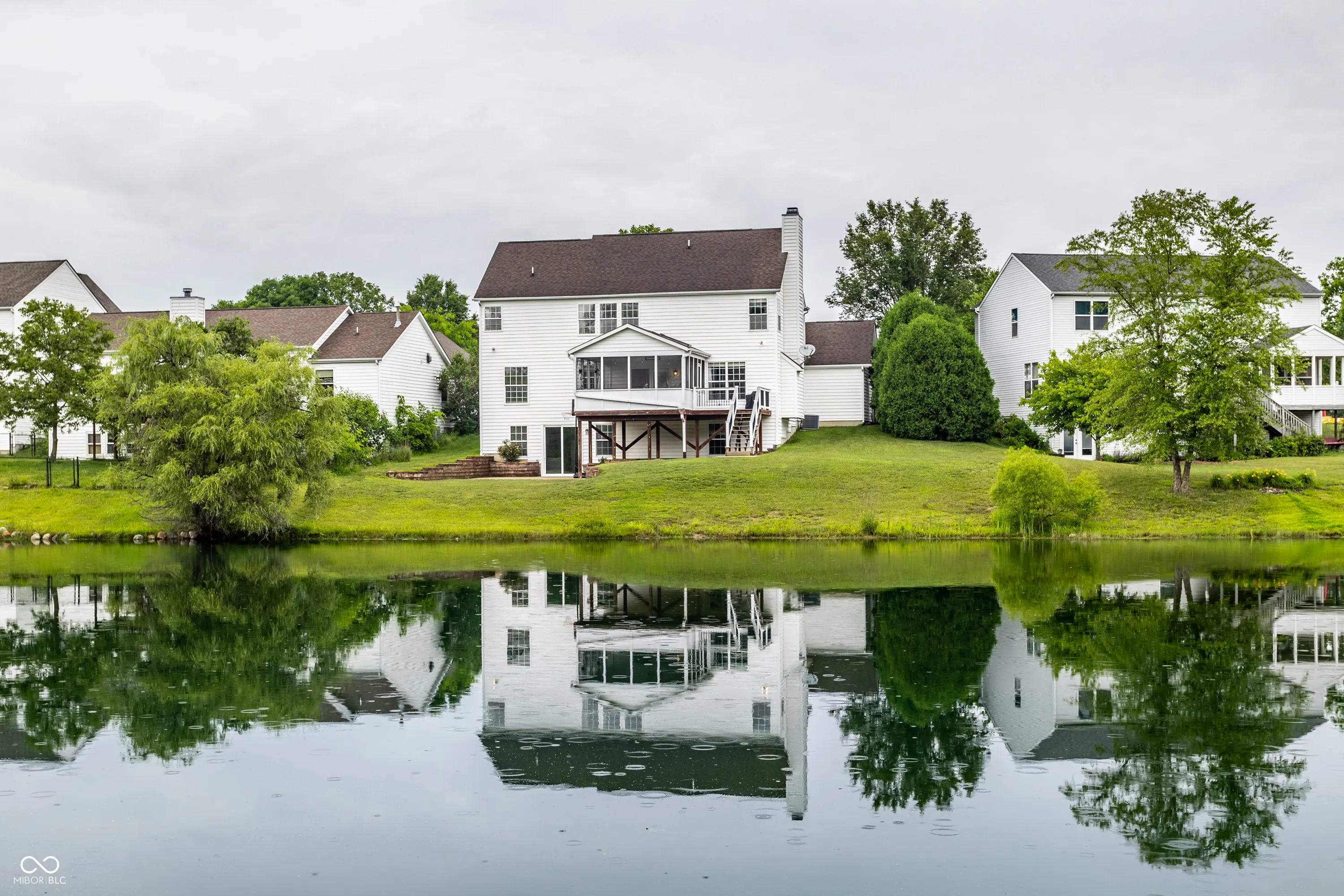 Rare Waterfront Gem! This eye catching home sits on a private, tree-lined pond lot and offers incredible living space inside and out. Enjoy peaceful views from the deck, screened-in porch, or the finished walk-out basement-perfect for entertaining or relaxing. Step inside to the impressive two-story foyer and you’ll find elegant details throughout: crown molding, chair rail, and an updated masonry fireplace in the cozy family room. The large eat-in kitchen features white 42″ cabinetry, an island, pantry and planning center. You’ll also enjoy a formal living room, dining room, and a private den/office with glass french doors. Upstairs boasts spacious bedrooms, a huge bonus room/4th bedroom with added closet, a gorgeous primary bedroom with a vaulted ceiling, views of the pond and an oversized closet. Enjoy the convenience of an upstairs laundry room with a utility sink and folding counter too. The walkout basement offers even more living space with a rec room, theater area, bathroom and loads of storage space. Top it all off with a 3-car garage, this home truly has room for everyone and everything! Top Zionsville Schools and neighborhood amenities.