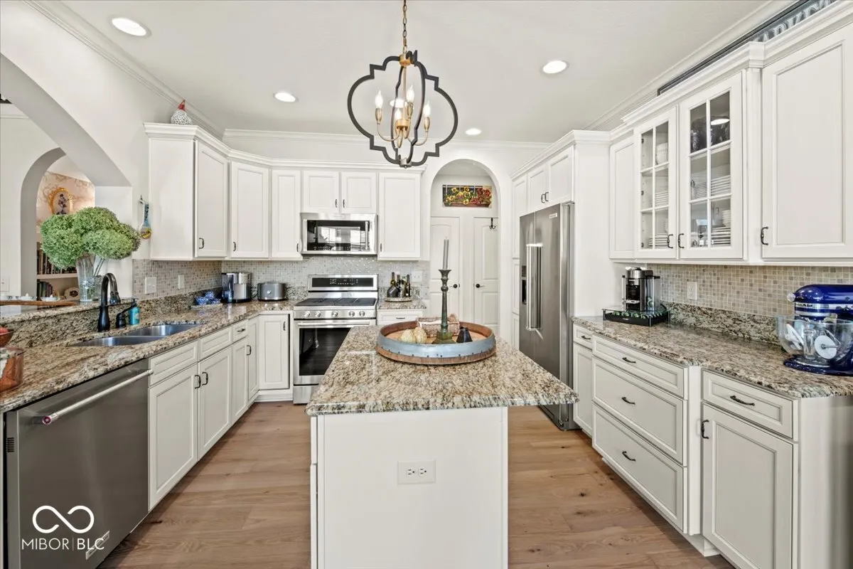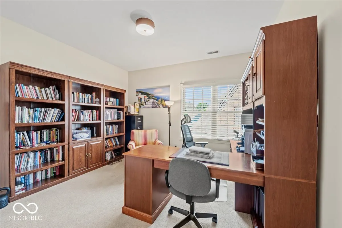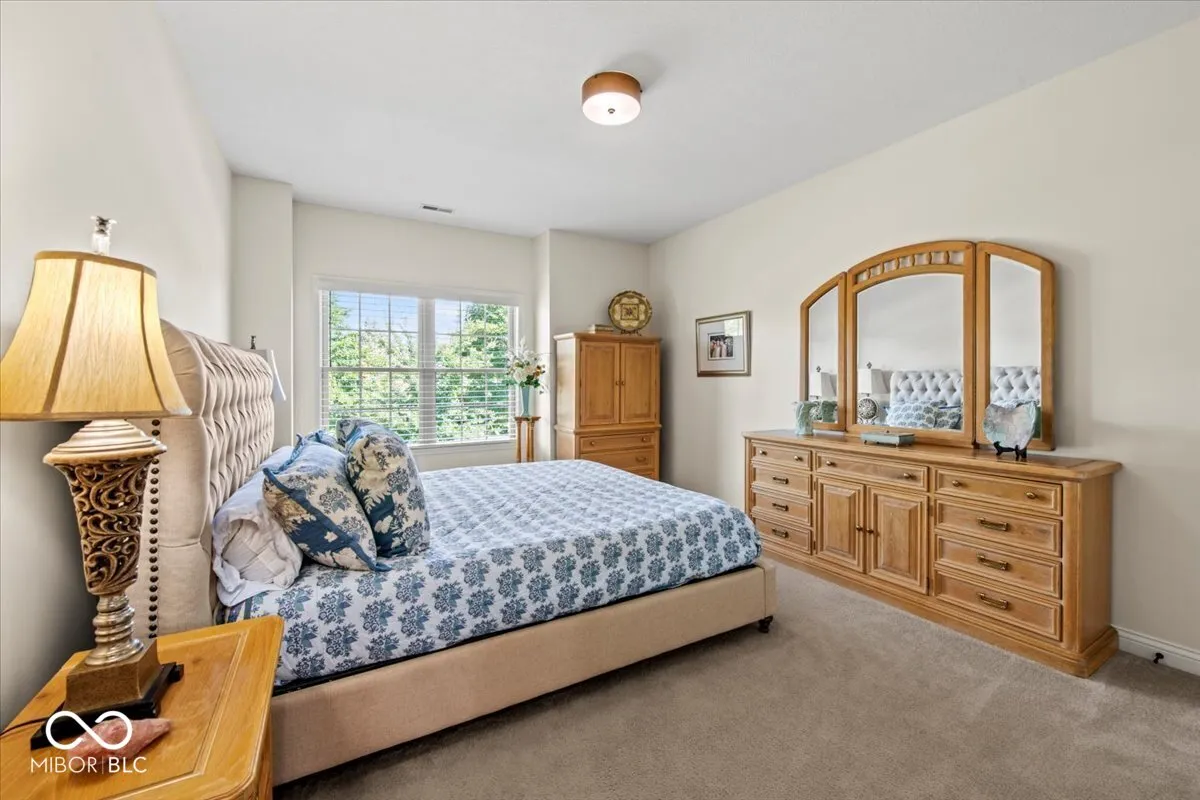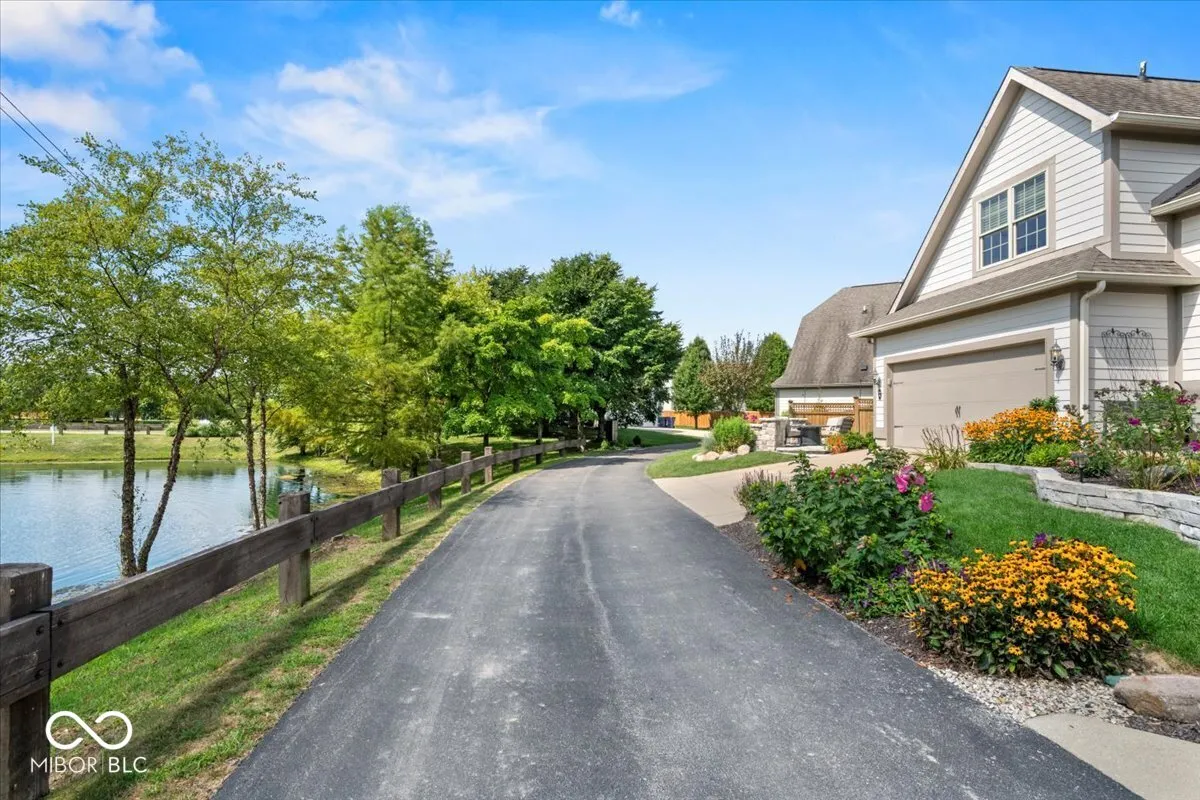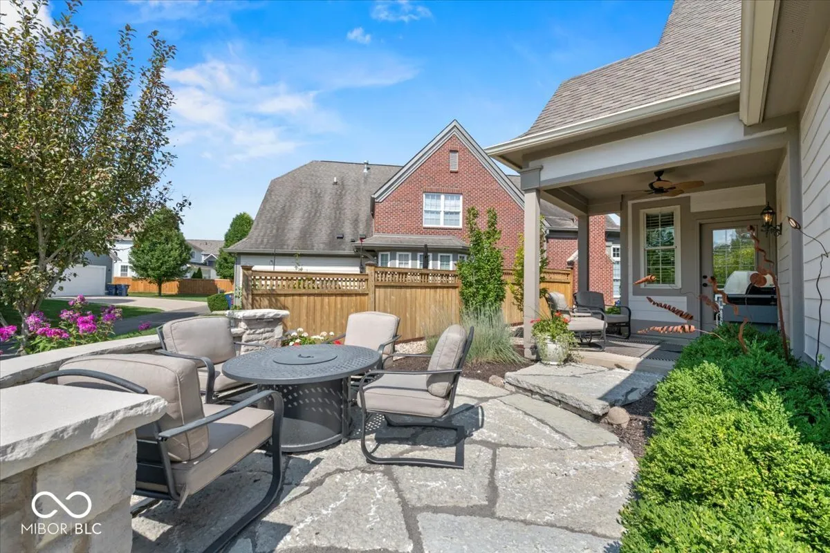 Highly sought-after waterview Stonegate townhome now available! It is a perfect place to retire near family and friends. This beautifully updated 3-bedroom, 2.5-bath home with a bonus room and loft offers stylish, low-maintenance living in one of Zionsville’s most desirable communities. Architecturally designed interior with arched doorways throughout. Interior walls and trim were painted within the last 12 months. All of the updates set the tone that this townhome has been maintained and updated. The main level showcases DuChateau engineered European oak 6.5″ plank hardwoods (installed 2024), soaring 14-foot ceilings in the great room, and an open-concept layout perfect for entertaining. The kitchen features KitchenAid stainless steel appliances (2019), granite countertops, a center island, and flows seamlessly to a dining area and great room. The main-level primary suite includes a walk-in closet with built-in chests of drawers, cabinets, concealed clothes hampers, and ample hanging areas. Large tiled shower and double vanity. Upper level offers two additional bedrooms (one being used as an office), a full bath, a versatile bonus room, and a loft with cherry engineered hardwoods (2019)-ideal for a second living area, game room, or office. The main-level laundry room includes LG washer and dryer (2019) and a custom-built open pantry offering extra storage. Outdoor living includes a new paver open front porch. Off the kitchen find a covered porch that is utilized daily along with the custom field stone patio with sitting wall overlooking the peaceful pond and lite water fountain. Additional updates: HVAC and water heater (2022), all new 2″ blinds (2019), All Main level decorative lighting 2023, Custom made decortive panel drapes added, Commercial garage disposal, custom closet organizer installed.