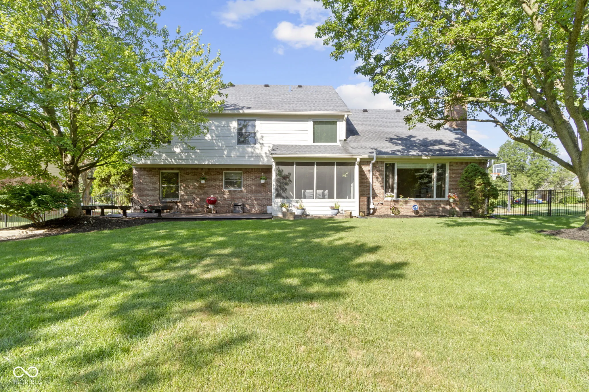 Timeless brick 4 bedroom 2.1 bathroom home in ideal Carmel location! Two story entry with loads of windows and natural light welcomes you into this smart and functional layout. Center island kitchen with granite counters, hardwood floors, ss appliances included, extra deep sinks, walk in pantry, and ample cabinet and counter space is perfect for cooking and entertaining. Eat in kitchen opens to spacious family room with cathedral ceilings, built-in-book cases and gas fireplace. First floor also boasts den/office with built-ins, formal dining room with crown molding and flexible family room. Upstairs includes spacious primary suite with vaulted ceilings, hardwood floors and walk in closet. En suite has tiled flooring, separate shower, and jetted tub. Three additional generous sized bedrooms and closets and a full bath round out second level. Partial basement offers additional living space and storage. Enjoy relaxing on screened porch overlooking fenced backyard (with irrigation system), large freshly restained deck and nice mature trees. Newer hardie board siding, gutters and guards, 22 water heater. Convenient to shopping, Clay Terrace, schools, and interstate.