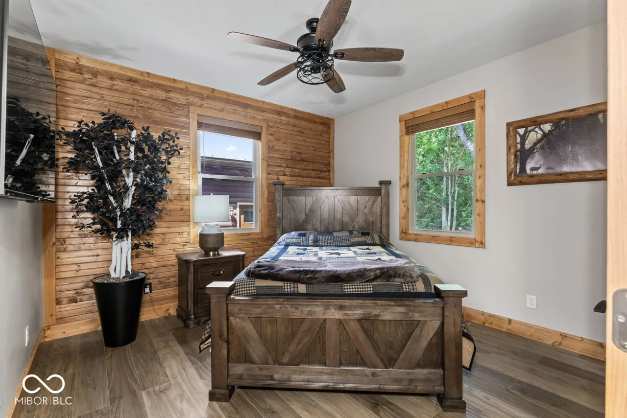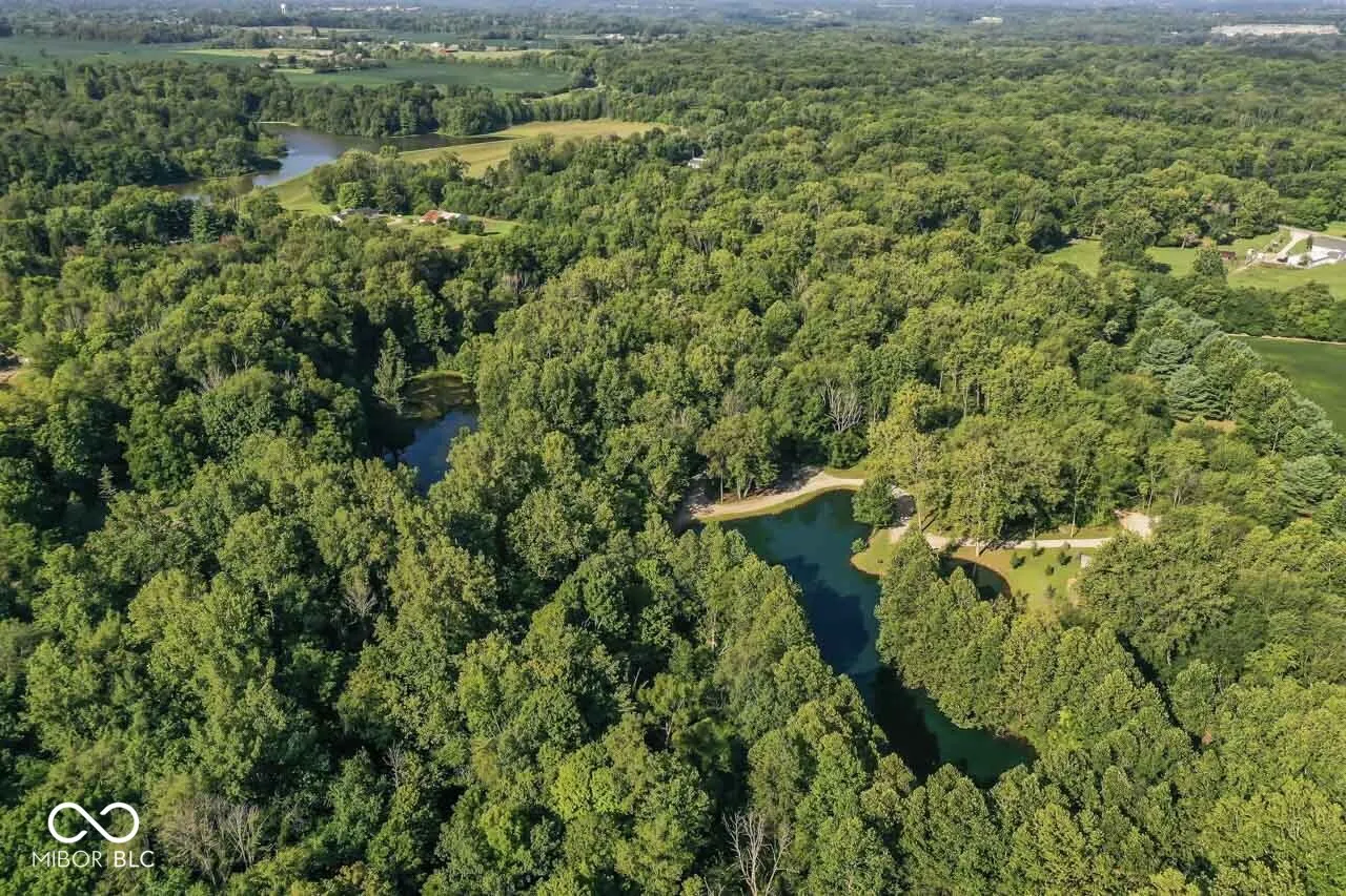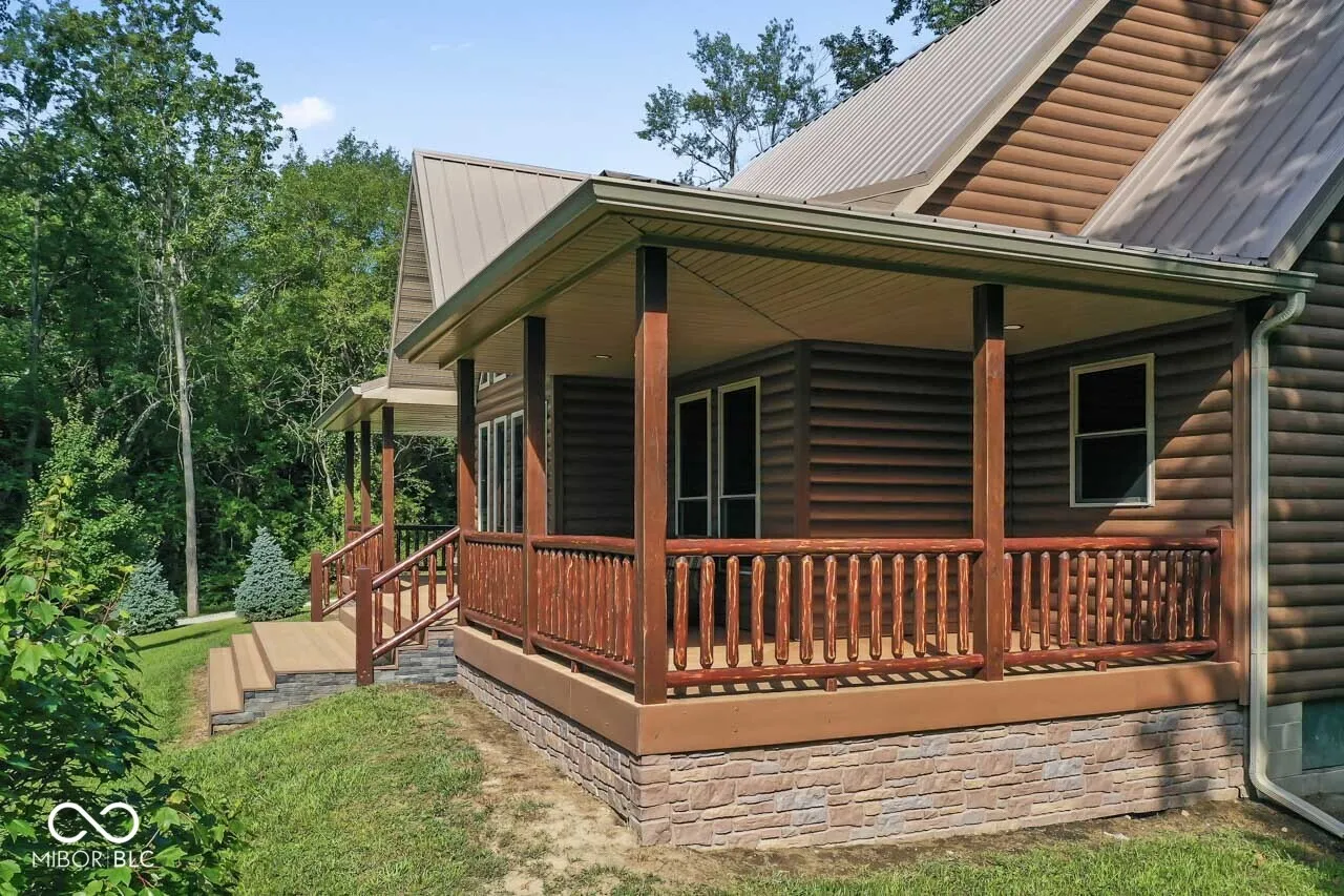 A very long winding driveway that takes you over the Little Blue River to your new cabin home on just under 30 beautiful, wooded acres with 2 ponds is no longer a wish. This could be your dream home and setting. Tucked away in Henry County, you will find this unique parcel, that is heavily wooded, has 2 stocked ponds, an artesian well, several well-defined trails, abundant wildlife and vegetation. A new cabin home has been constructed, 3 or 4 bedrooms, 2 full baths, large open living space on the main level with vaulted ceilings, ample windows, and a floor to ceiling wood burning fireplace. This home has a rustic cabin feel, but it is new and designed to be maintenance free. You can enjoy the home and the property, but not the typical repair and upkeep of a cabin home. The main floor has 2 bedrooms, living space and dining space, open kitchen with all new stainless steel appliances. There is a bonus room (could be 4th bedroom), open loft space, walk out deck, bedroom and bath on second level. The wrap around porch overlooks the ponds and the woods providing endless enjoyment. New construction just completed in 2024. Home has never been lived in. The owner has added many upgrades and unique features. The Little Blue River runs through this property, a small waterfall added by bridge. You must view the drone videos of the property. High speed internet is available. Just over an hour to Indianapolis airport, downtown Indianapolis, Dayton airport. Location provides easy access to I-70, SR 3, SR 38, SR36, SR 1, US HWY 40