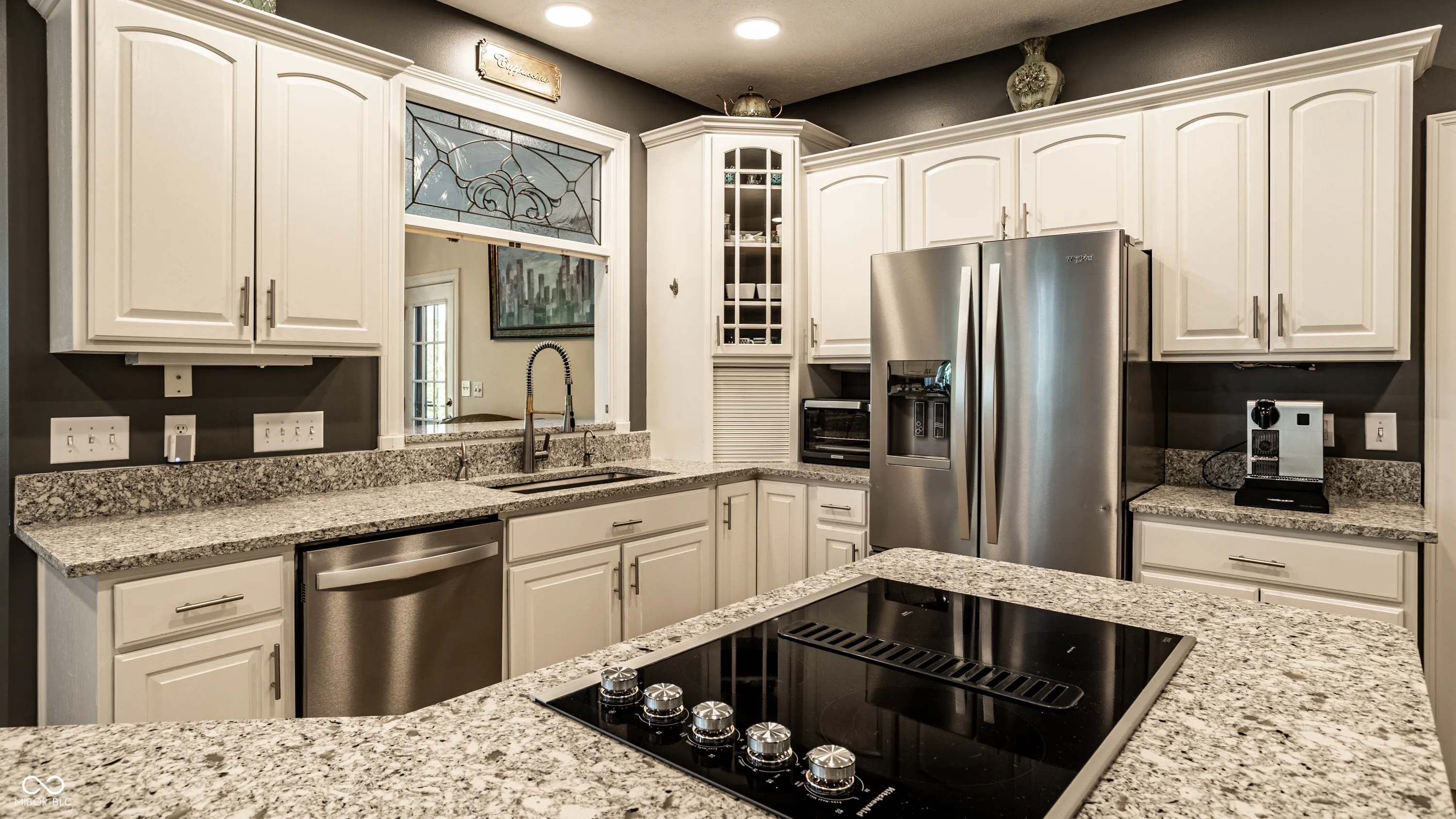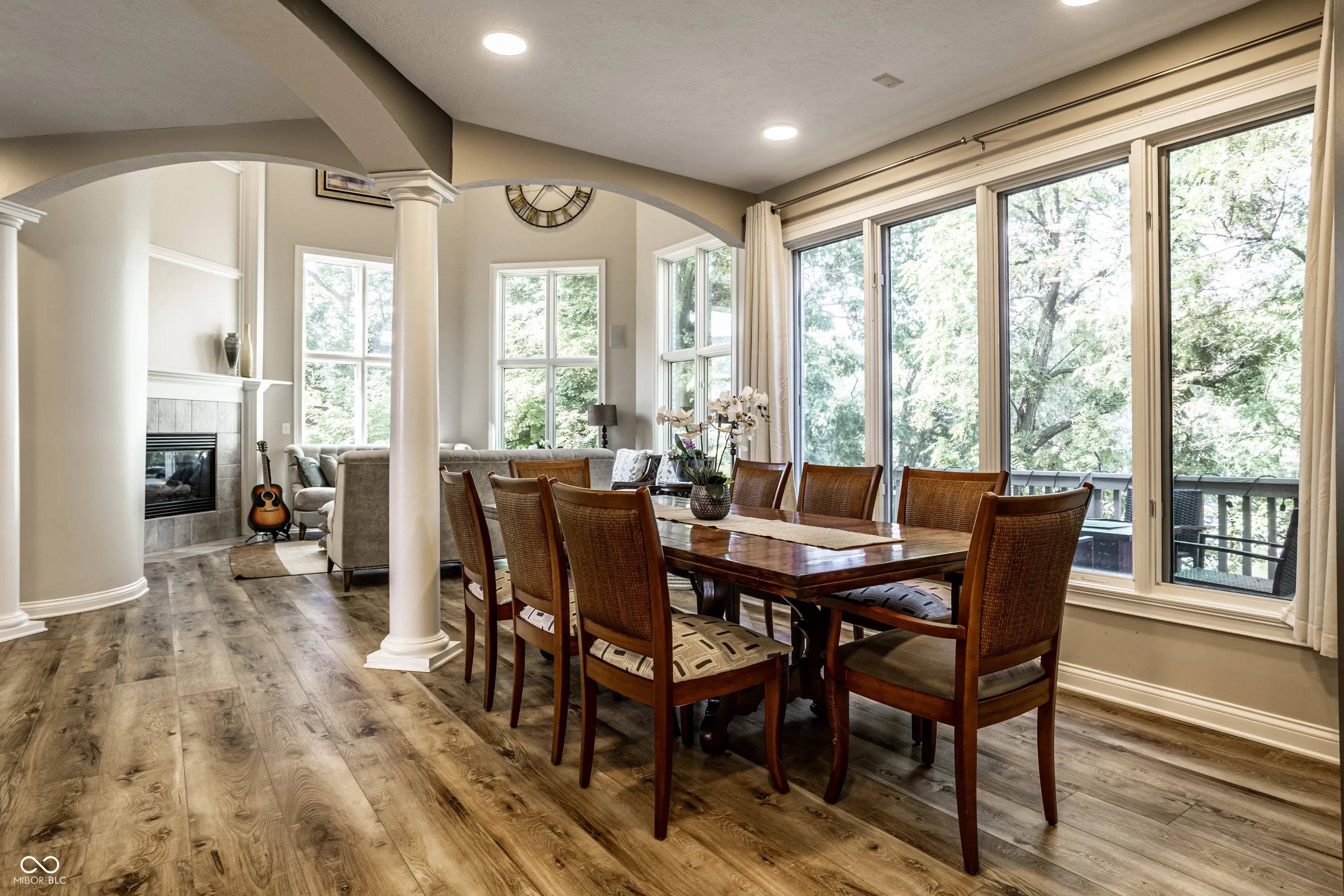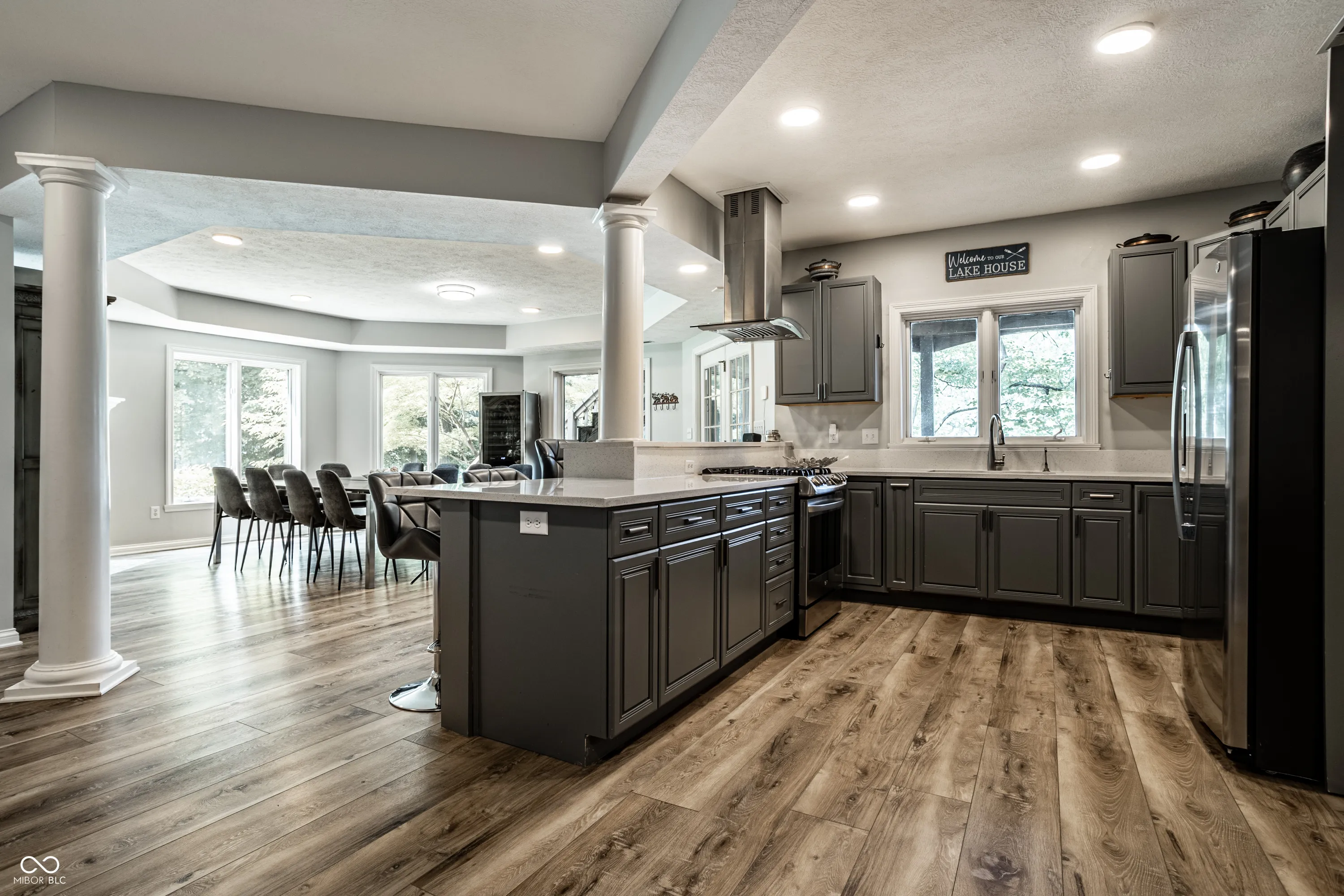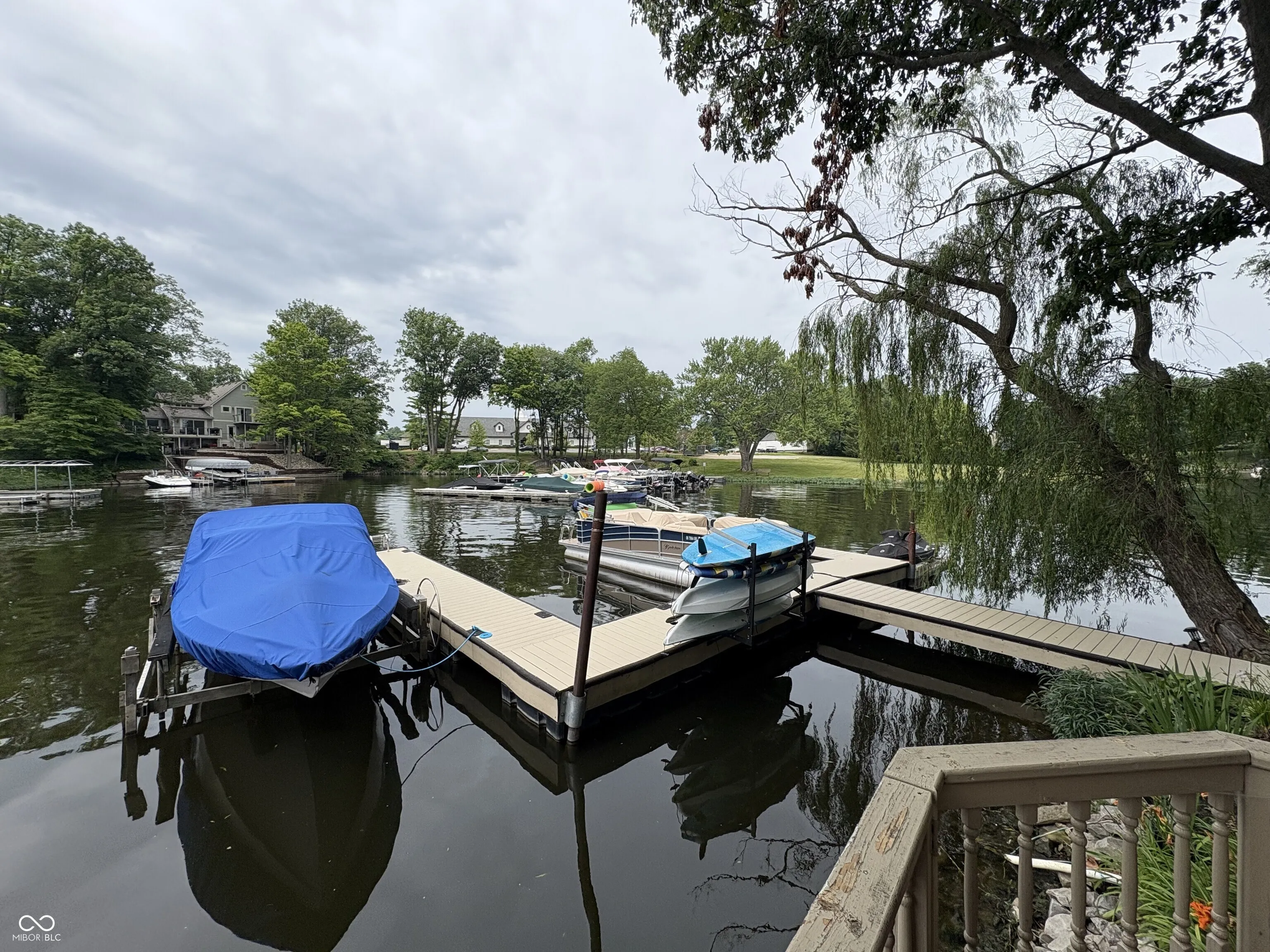 This gorgeous 4-bedroom, 3.5-bath custom home offers the ultimate lakeside living. Perfectly positioned in a quiet idle zone, the property boasts breathtaking views of Morse Reservoir from multiple decks, a charming gazebo, and a private dock, all just minutes from Harbour Trees Golf & Beach Club. Inside, the main level welcomes you with soaring ceilings and walls of windows that flood the home with natural light and frame panoramic water views. Luxury vinyl plank flooring runs throughout, blending style and functionality for everyday lake life. The spacious great room features a cozy fireplace and provides a walk out to one of the main-level decks, perfect for relaxing or entertaining. Just off the kitchen, a beautiful sunroom offers another peaceful retreat with direct access to one of the main-level decks. The main-level primary suite is a true sanctuary, complete with deck access, a spa-like bathroom featuring a tile walk-in shower, Jacuzzi tub, and a walk-in closet with custom built-ins for organized storage. Upstairs, two additional bedrooms and a full bath offer comfort and privacy for family or guests. The walk-out lower level is designed for effortless lake living and entertaining. It includes a full kitchen and full bathroom with exterior access, ideal for guests coming in from the water. This basement also features a bedroom, a rec room, a theater room, and a large storage room. Outside, a spacious lower deck and an outdoor firepit create the perfect setting for lakeside evenings. With custom craftsmanship, multiple outdoor living spaces, and unbeatable lake access, this home is a rare opportunity to enjoy luxury and tranquility on Morse Reservoir.