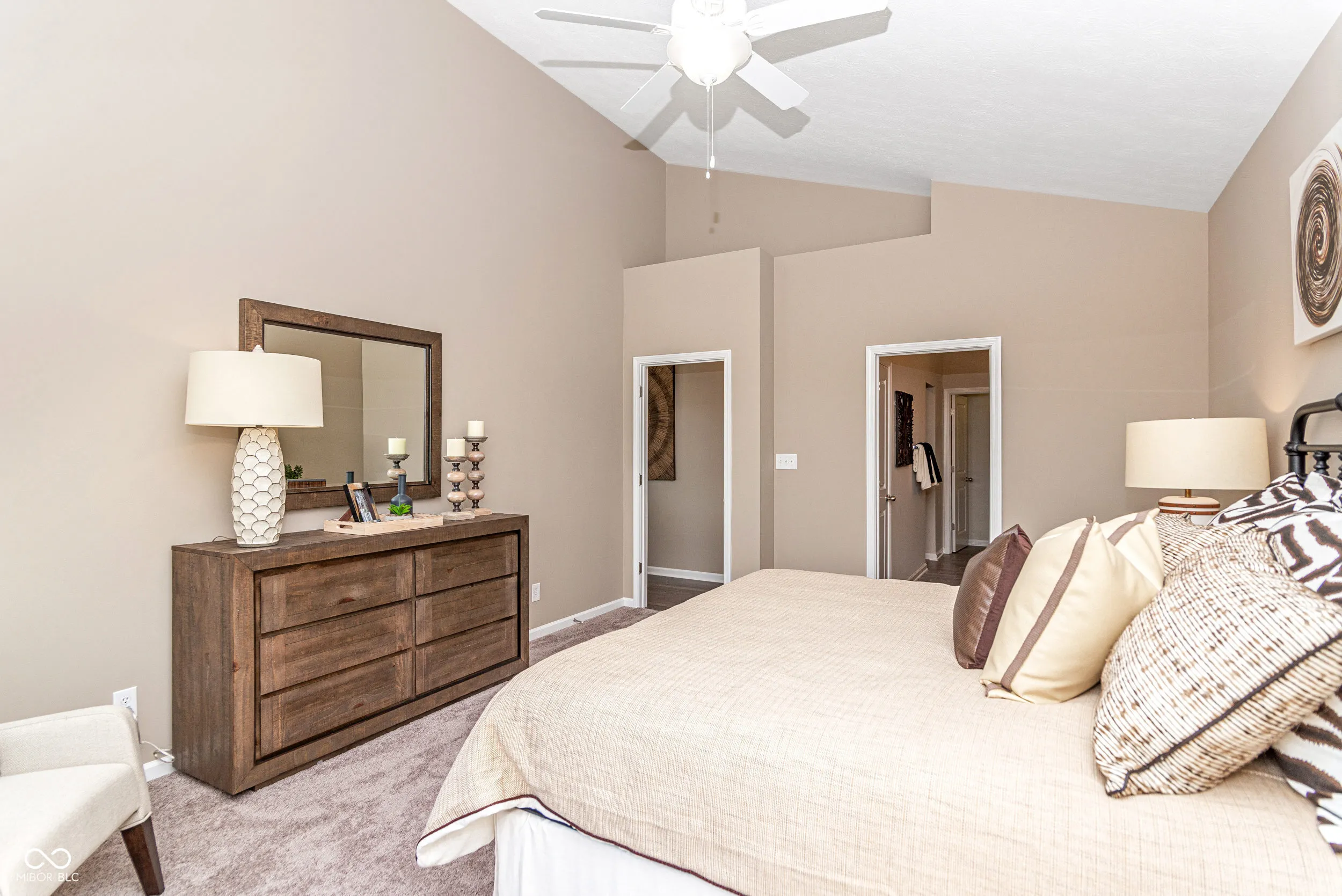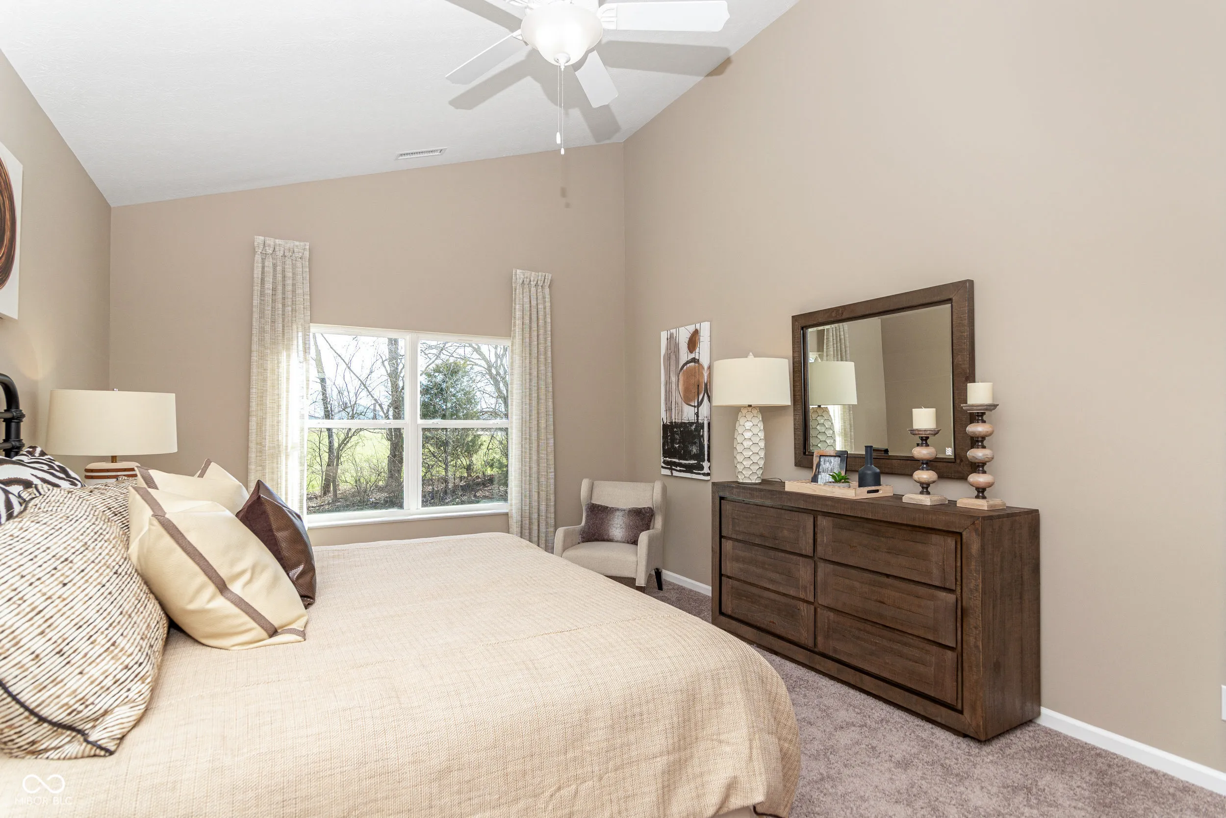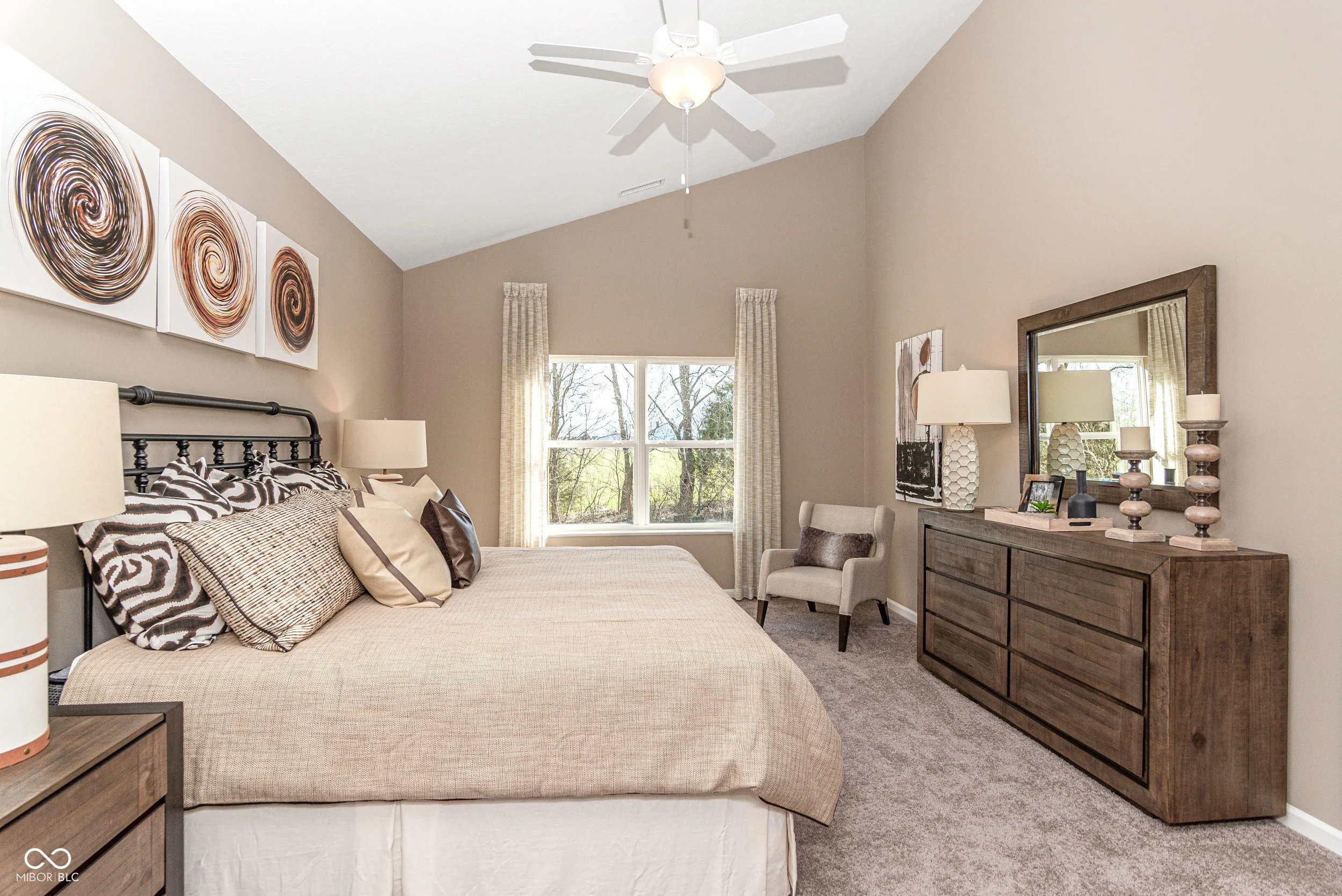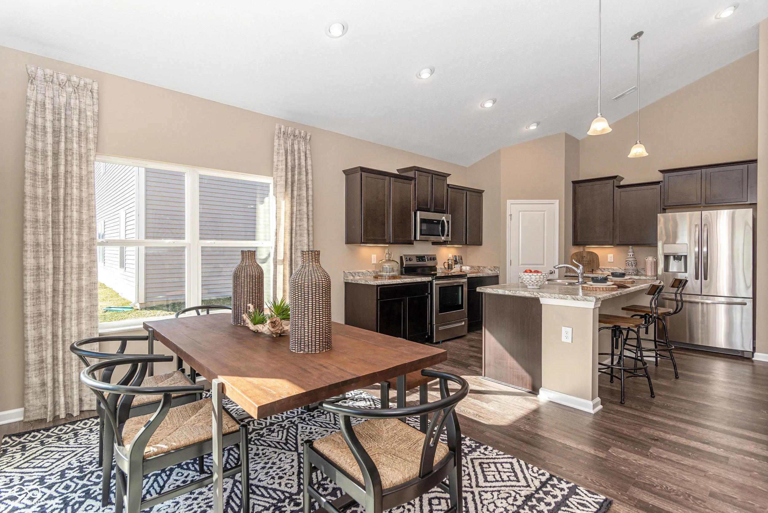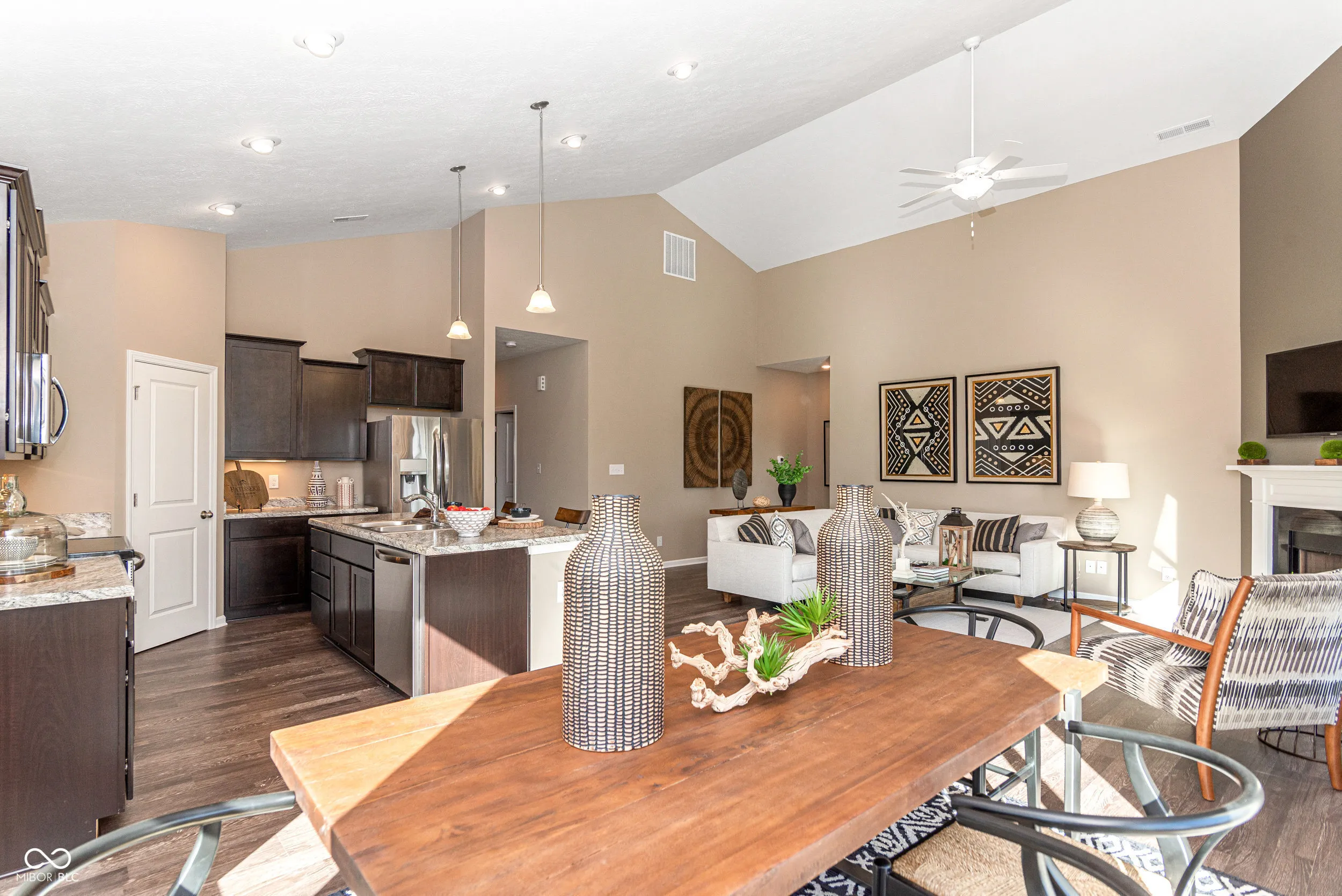 Welcome to your future home in beautiful Columbus, Indiana! This thoughtfully designed model home offers a perfect blend of style, comfort, and upgrades that make everyday living feel a little more special. With 3 bedrooms, 2 bathrooms, and a spacious open-concept layout, it’s ideal for first-time buyers, growing families, or anyone looking to enjoy modern living in a charming community. Step inside and you’ll find vaulted ceilings in both the great room and the primary bedroom, adding height and character to your main living spaces. The kitchen is upgraded with sleek stainless steel appliances, staggered cabinetry with crown molding, and high-definition laminate countertops-making it both functional and stylish. The cozy corner fireplace adds a warm touch for Indiana winters, and the upgraded lighting package, including led lighting and pendant fixtures, keeps every space feeling bright and welcoming. Enjoy extra comfort with 9-foot ceilings, luxury vinyl plank flooring in high-traffic areas, and ceramic tile in the primary bathroom. The exterior features a Tudor-style elevation with premium vinyl siding in a beautiful Gunmetal Gray, and a limestone address block adds a classic finishing touch. Build community in this established neighborhood and create your memories in Abbey Place!