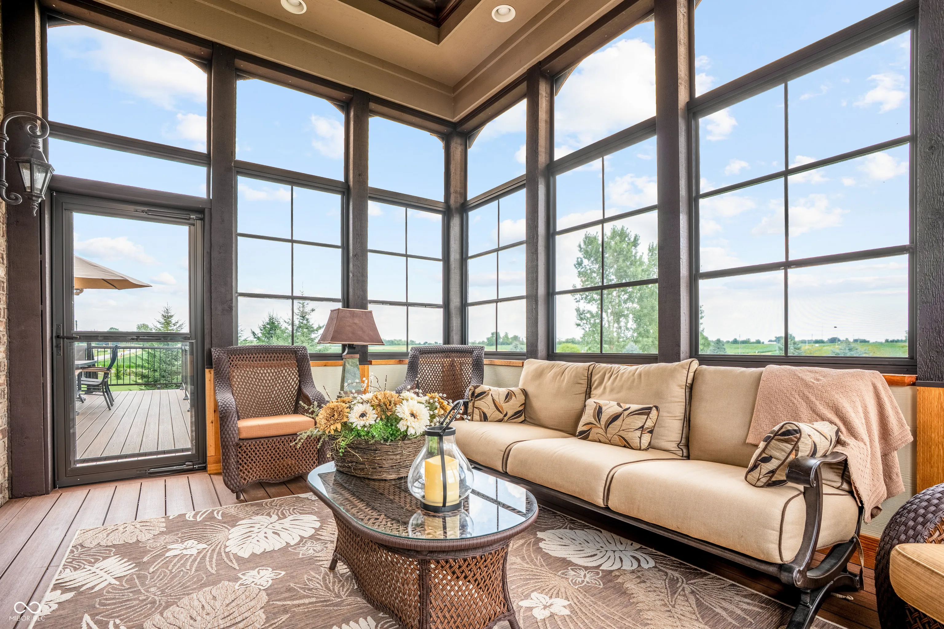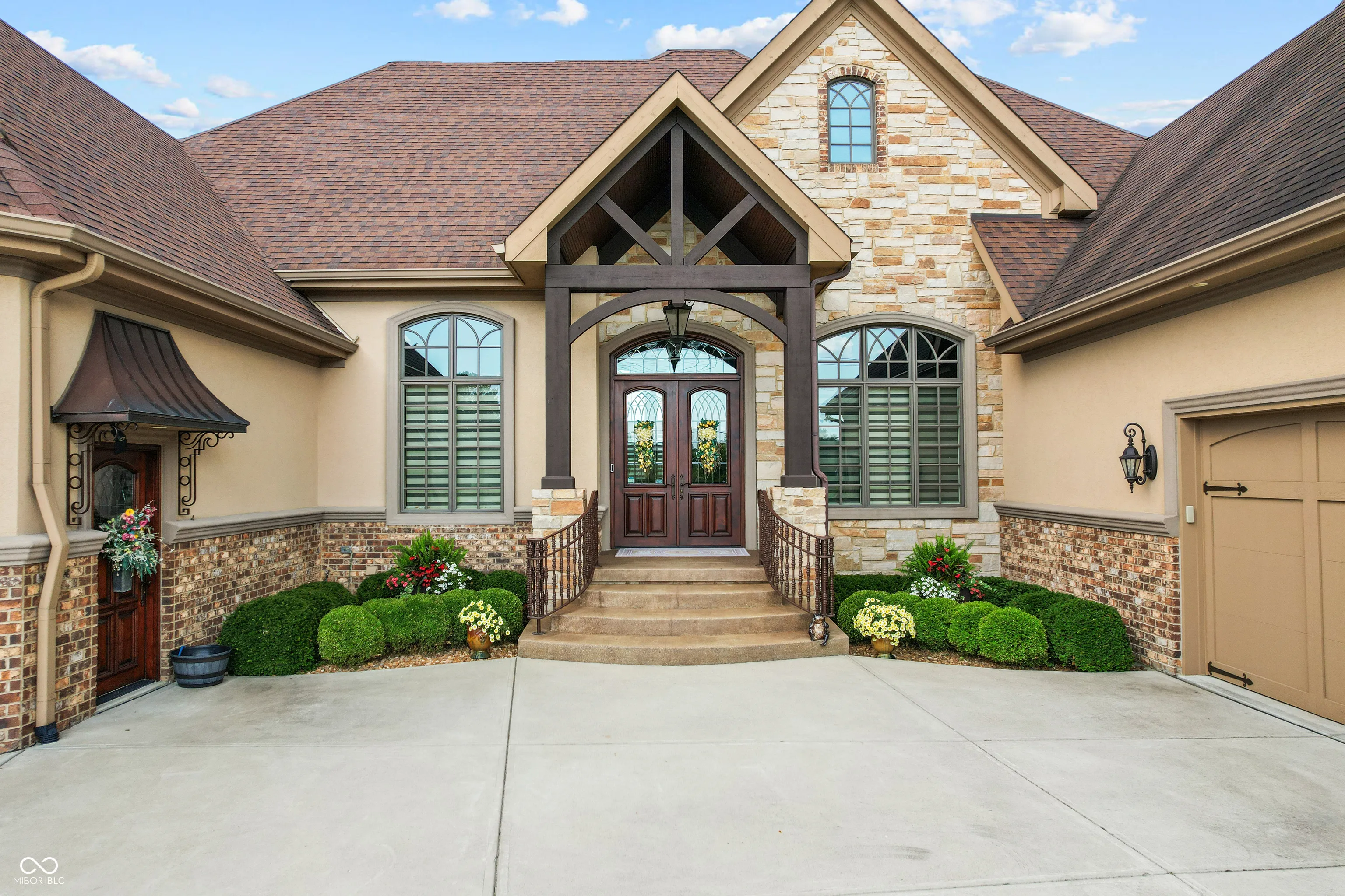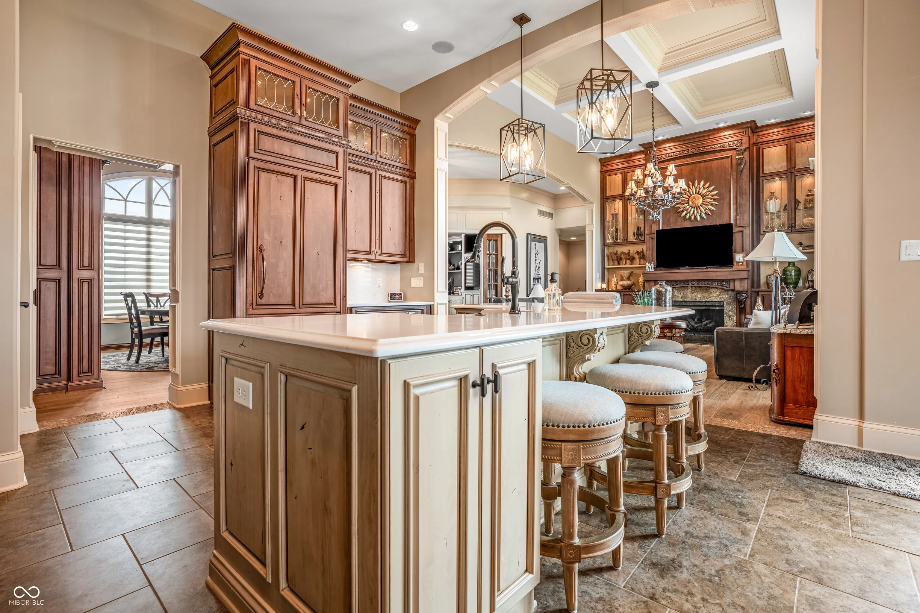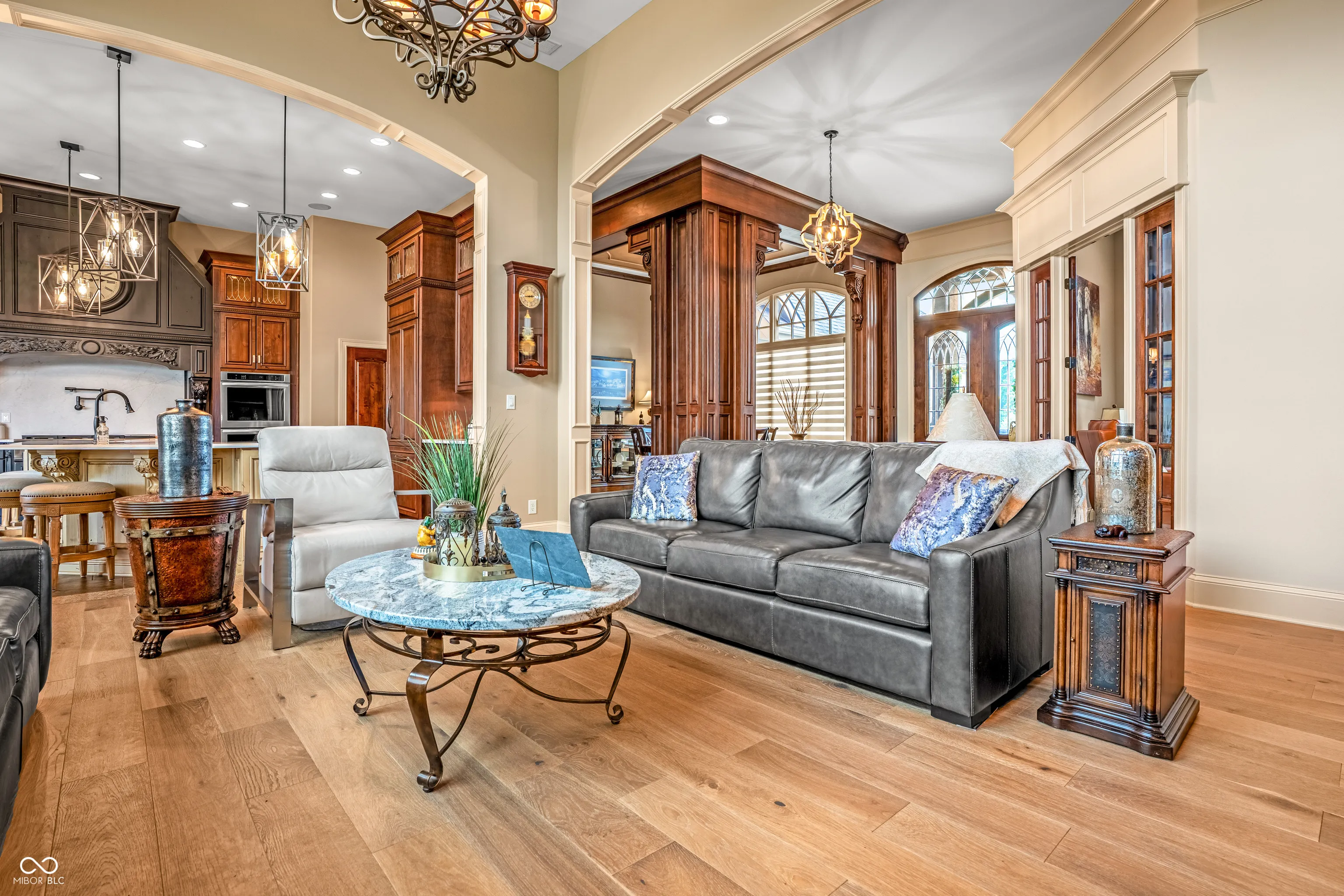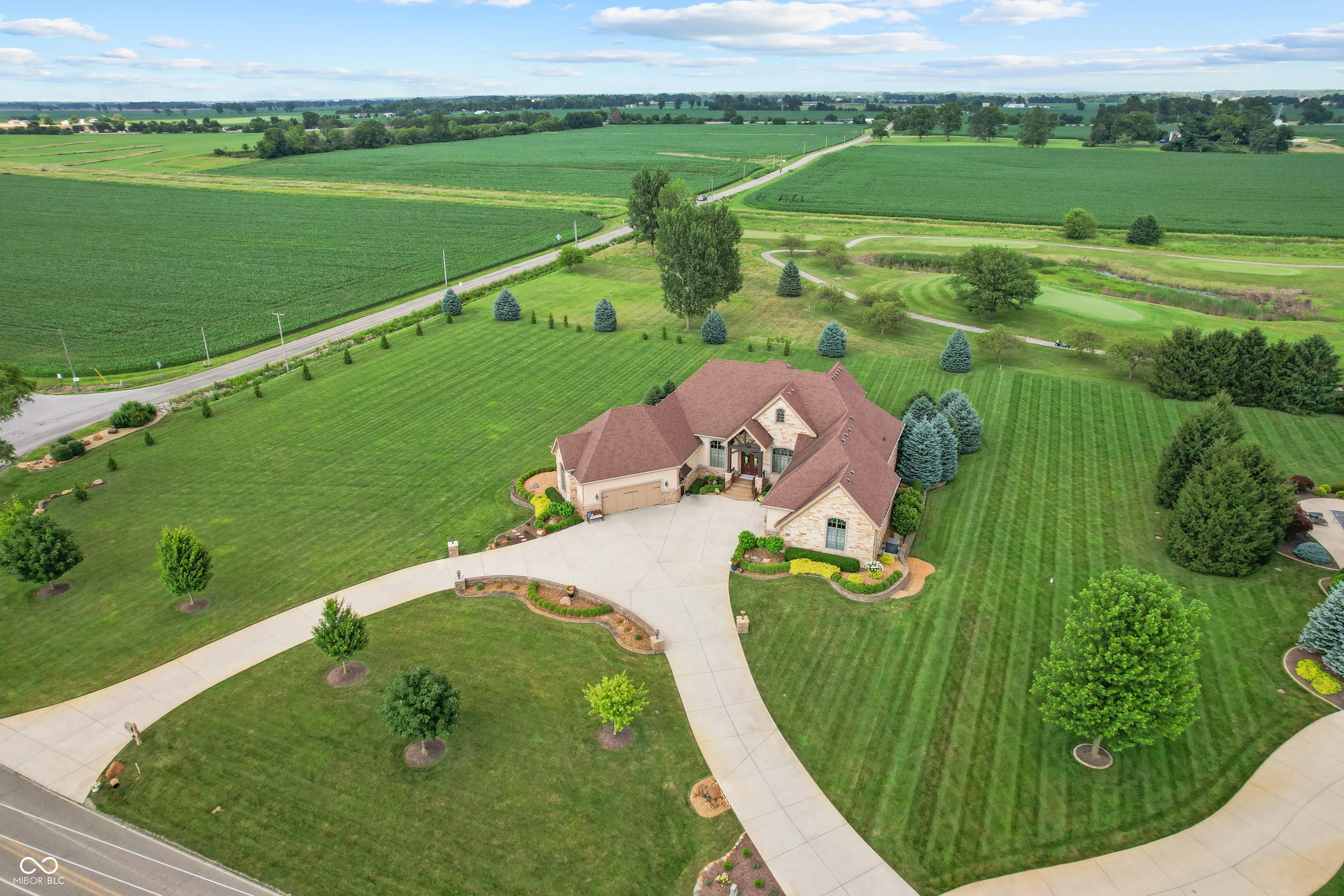 Welcome to refined living at The Legends Golf Club in Franklin, Indiana. This custom home sits on 2.8 beautifully landscaped acres with peaceful golf course views and an ideal blend of luxury, comfort, and craftsmanship. Inside, the entire house has been freshly painted and features new engineered hardwood flooring that pairs perfectly with the home’s rich woodwork and detailed trim. The kitchen is a true standout with a large island, quartz countertops, double ovens, wine fridge, ice maker, and stunning custom Amish-built cabinetry. The built-in fridge and pot filler add convenience, while the open layout flows into a spacious living area with built-ins and coffered ceilings, creating a warm and elegant gathering space. The main-floor primary suite offers a quiet retreat with a walk-in tile shower, double vanities, and a custom walk-in closet with built-in cabinetry and center island. Just off the entry, you’ll find a private office with natural light and easy access for guests or clients. Outdoor living is just as impressive. Relax in the newly updated three-seasons room, take in the view from the composite deck, or enjoy the covered patio below. The walk-out basement adds even more space with a full bar and second kitchen, theatre room, game area, guest bedroom with full bath, and generous storage. There are two separate two-car garages for a total of four bays, offering plenty of room for vehicles, hobbies, or a workshop. From the timeless finishes to the incredible setting, this home offers a rare combination of elegance, space, and location.