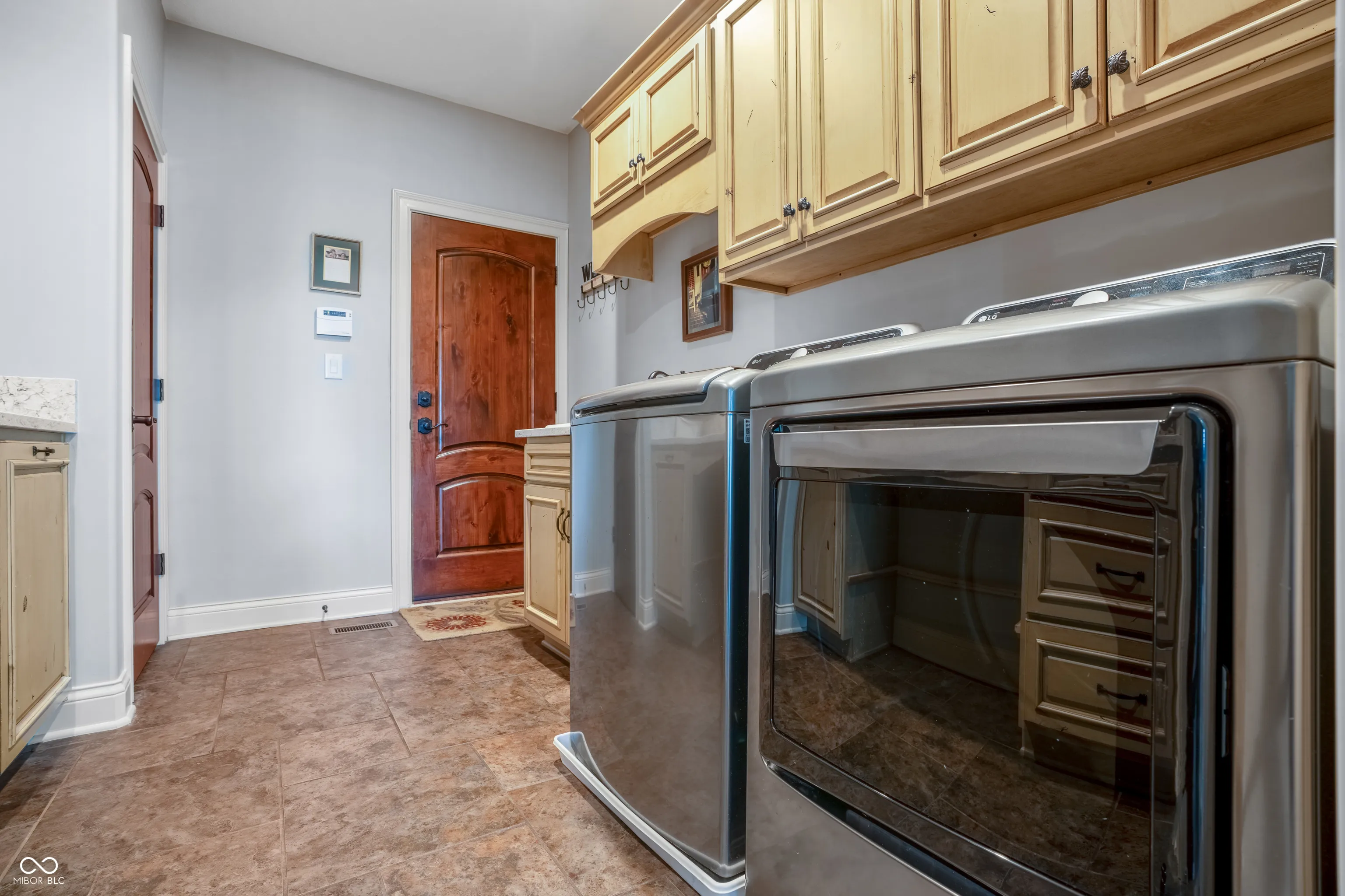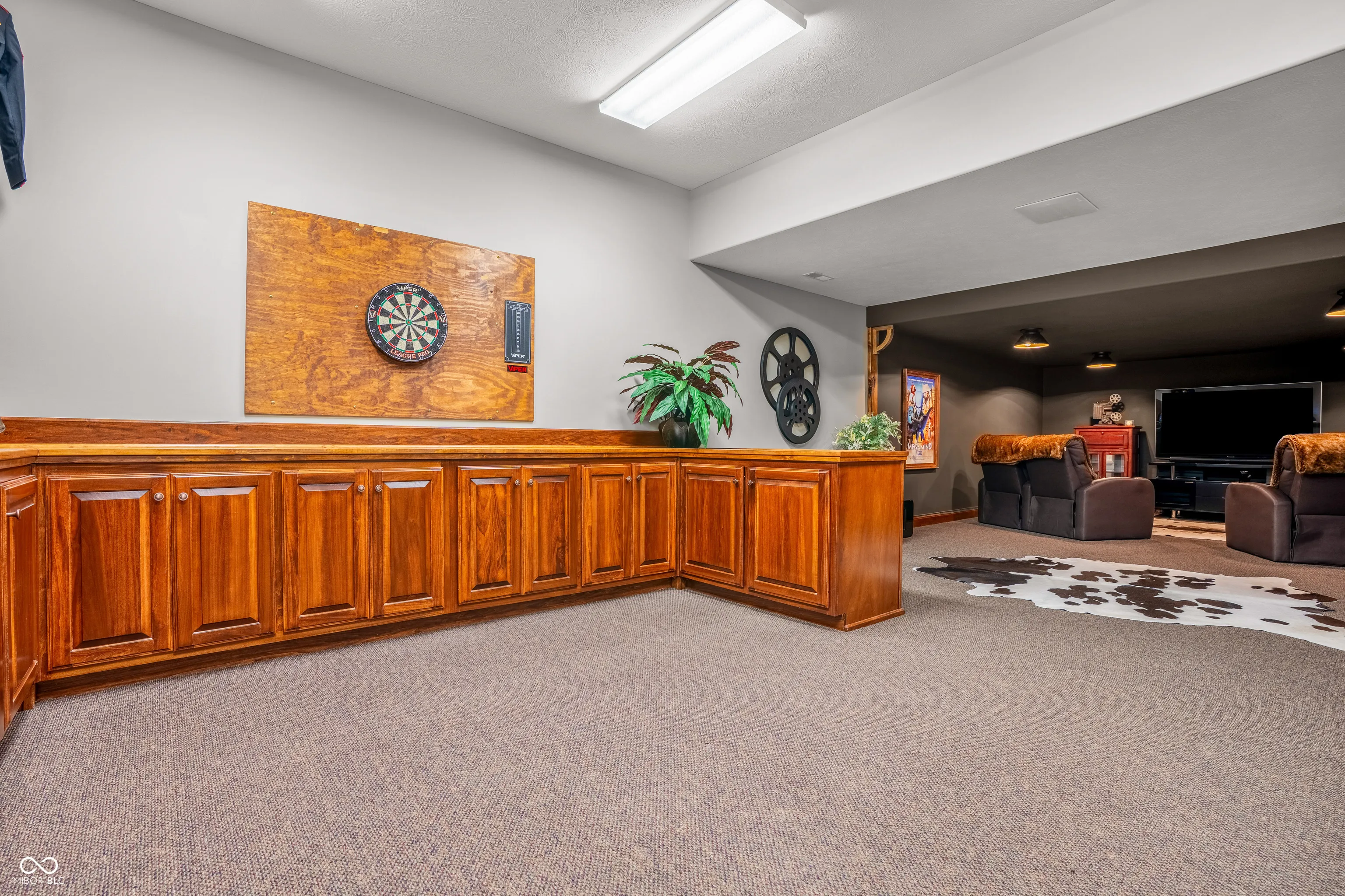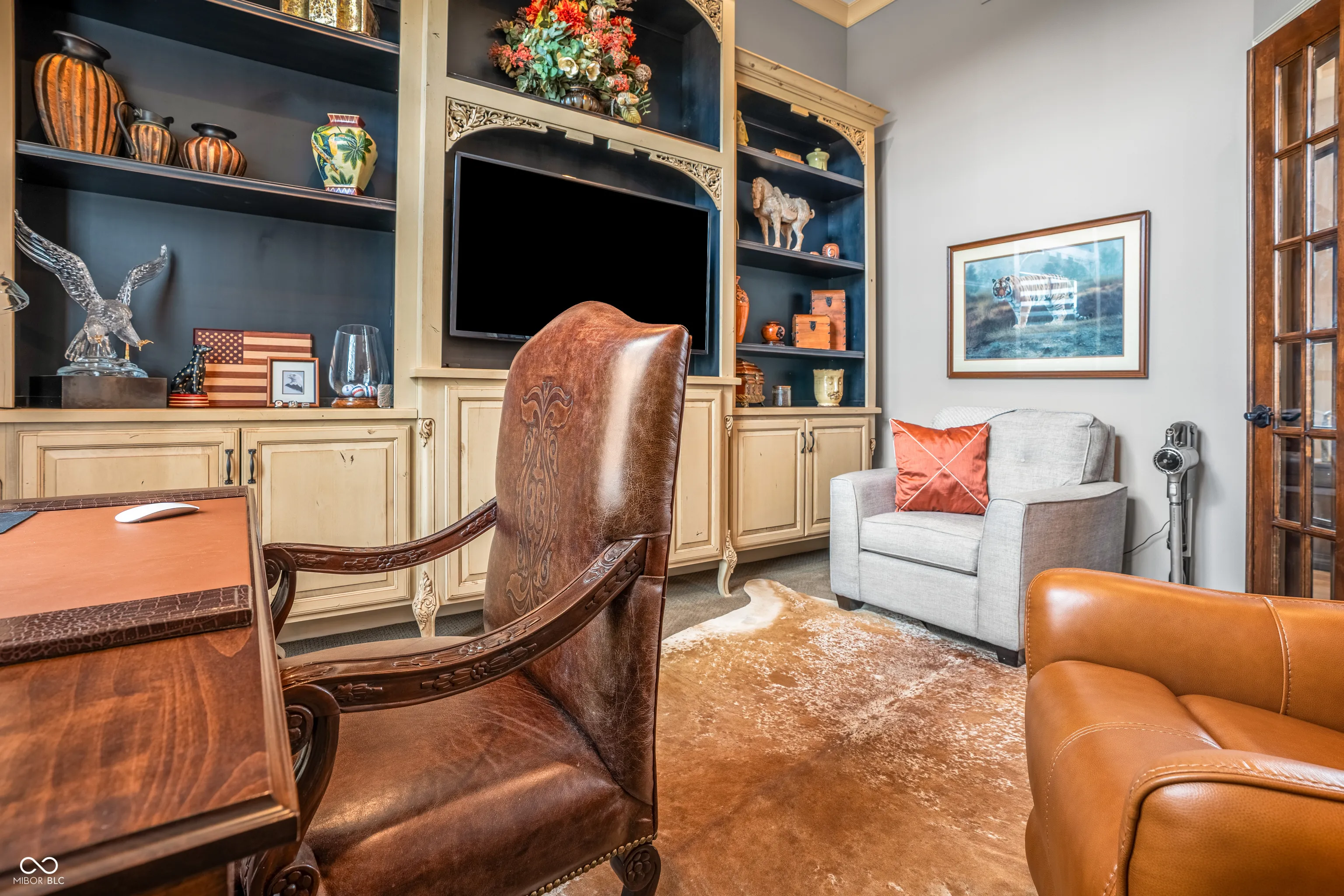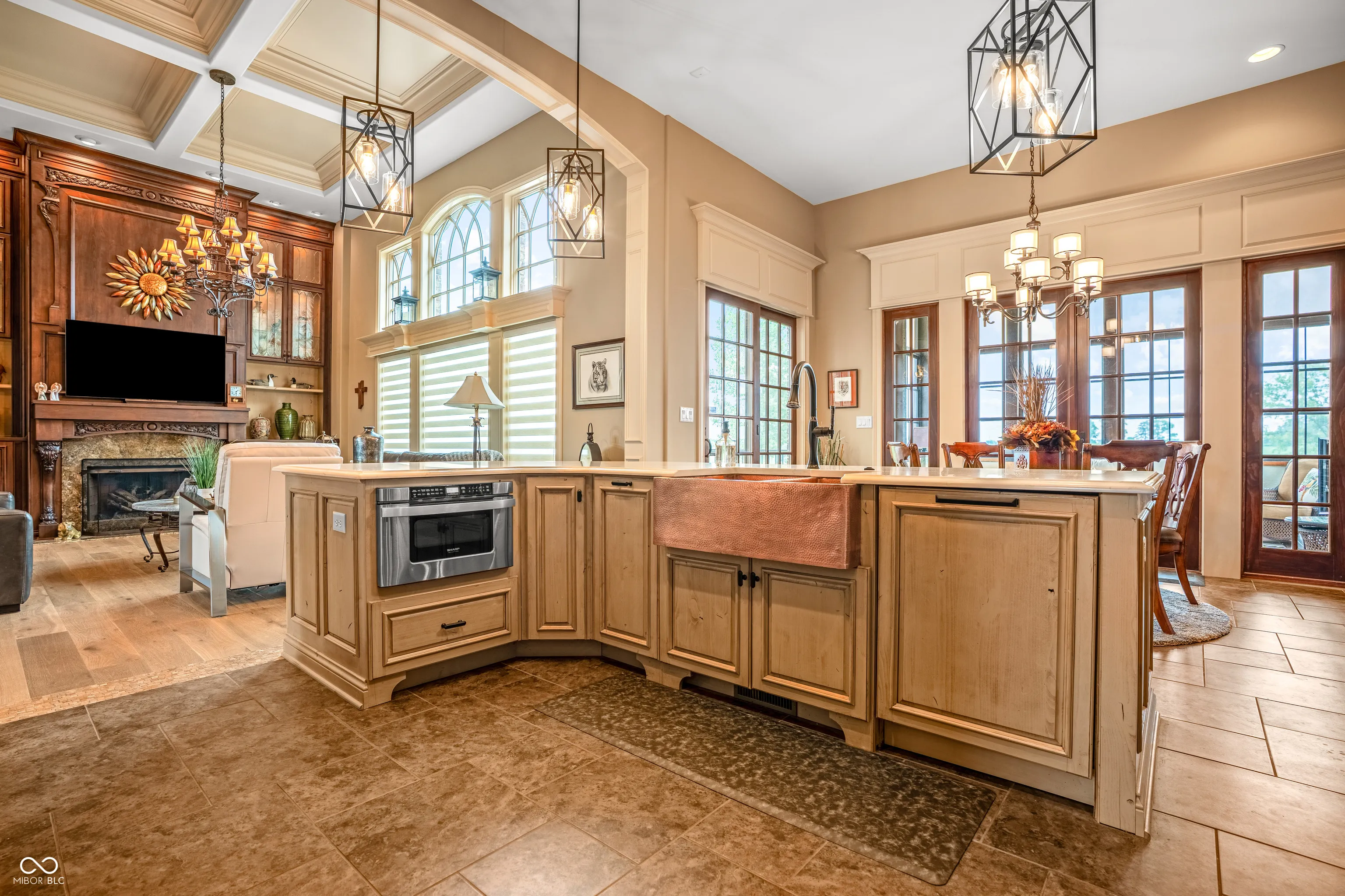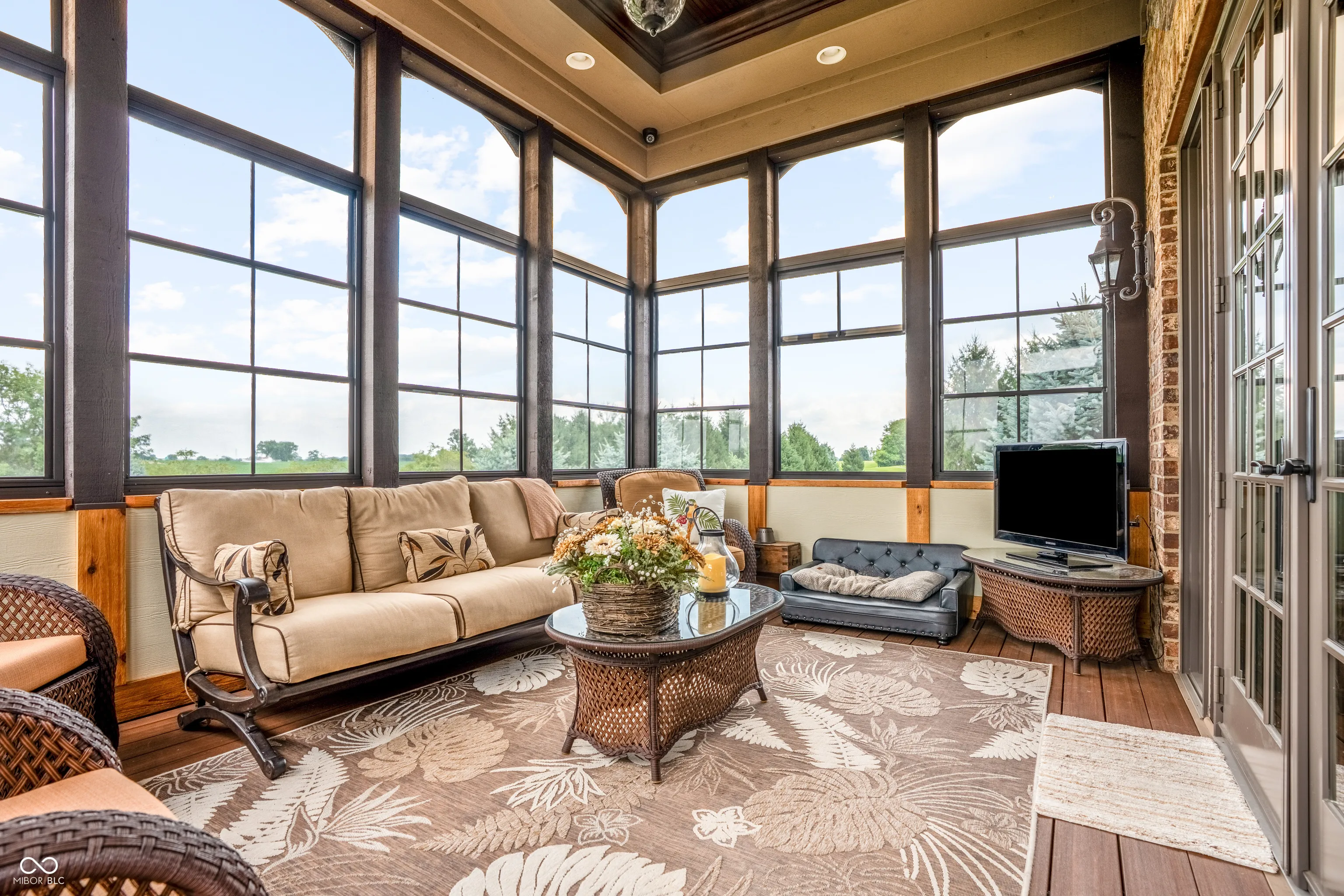 Welcome to refined living at The Legends Golf Club in Franklin, Indiana. This custom home sits on 2.8 beautifully landscaped acres with peaceful golf course views and an ideal blend of luxury, comfort, and craftsmanship. Inside, the entire house has been freshly painted and features new engineered hardwood flooring that pairs perfectly with the home’s rich woodwork and detailed trim. The kitchen is a true standout with a large island, quartz countertops, double ovens, wine fridge, ice maker, and stunning custom Amish-built cabinetry. The built-in fridge and pot filler add convenience, while the open layout flows into a spacious living area with built-ins and coffered ceilings, creating a warm and elegant gathering space. The main-floor primary suite offers a quiet retreat with a walk-in tile shower, double vanities, and a custom walk-in closet with built-in cabinetry and center island. Just off the entry, you’ll find a private office with natural light and easy access for guests or clients. Outdoor living is just as impressive. Relax in the newly updated three-seasons room, take in the view from the composite deck, or enjoy the covered patio below. The walk-out basement adds even more space with a full bar and second kitchen, theatre room, game area, guest bedroom with full bath, and generous storage. There are two separate two-car garages for a total of four bays, offering plenty of room for vehicles, hobbies, or a workshop. From the timeless finishes to the incredible setting, this home offers a rare combination of elegance, space, and location.