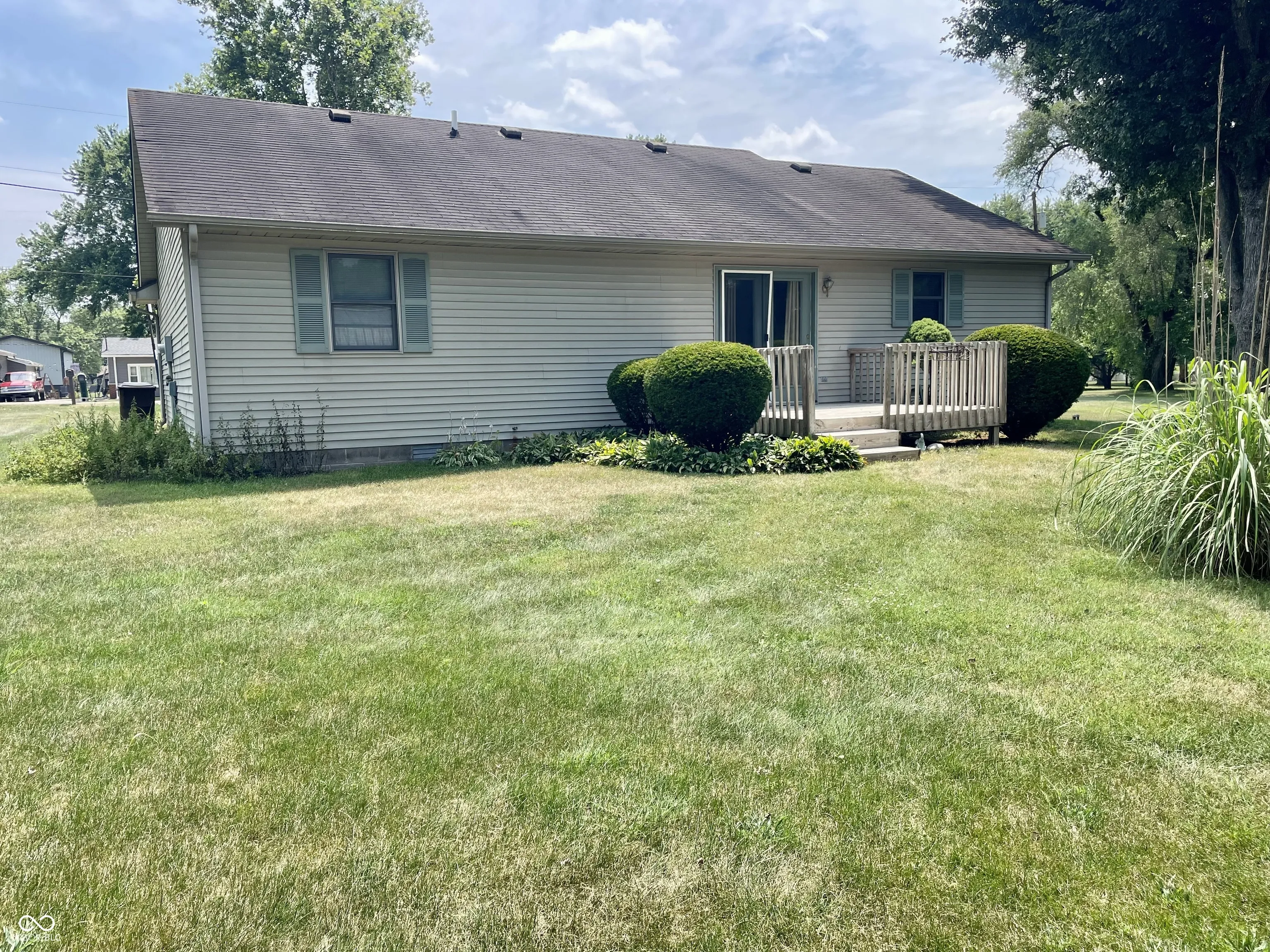This single-family residence located in a great neighborhood in North Terre Haute school district just hit the market. Imagine cozy evenings spent in your living room, the vaulted and high ceiling amplifying the crackling warmth of the fireplace. Beautiful acacia hardwood floors throughout. The space feels grand, yet intimately comforting, a perfect spot to unwind after a long day. The kitchen is a culinary dream come true, with beautiful countertops providing ample space for meal preparation. A backsplash adds a touch of elegance, while the dining area creates a close eatin space with back deck access. Open concept Kitchen, dining room living room combo. Split floor plan with bedrooms and two full baths on opposite ends of the home, plus the convenience of a laundry room, this home offers a delightful blend of comfort and practicality. The lot spans a considerable size on both sides of the home offering endless possibilities for outdoor enjoyment. Enjoying the peace and quiet of your surroundings. You’ll find a nice storage barn perfect for storing all your gardening tools, lawn mower and other outdoor gear. Concrete driveway. Nice curb appeal has back privacy fence. This beautiful home is easy to show.