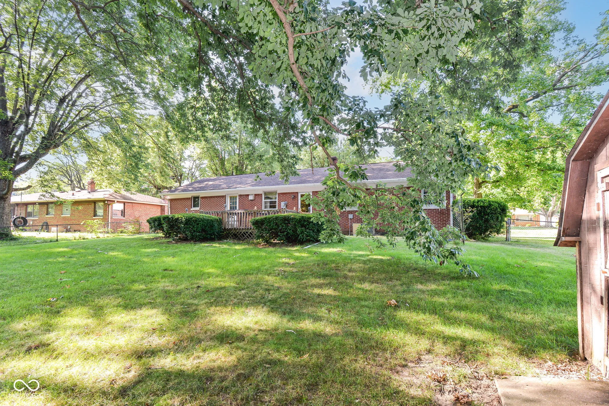 This solid all-brick ranch offers timeless appeal and exceptional potential! All new HVAC & water heater is being installed 7-28-25 Nestled on a spacious lot with mature trees, nice deck & the large backyard is perfect for outdoor living/entertaining. Inside, you’ll find a functional layout with built-ins in the bedrooms-adding both charm and extra storage. The full basement includes a finished bathroom with great potential for additional living space, for a recreation room, guest suite, or home office. Conveniently located close to shopping, restaurants, and just minutes from I-65 and I-465, this home combines comfort, space, and accessibility in one great package. Original pristine hardwood flooring under current flooring.
