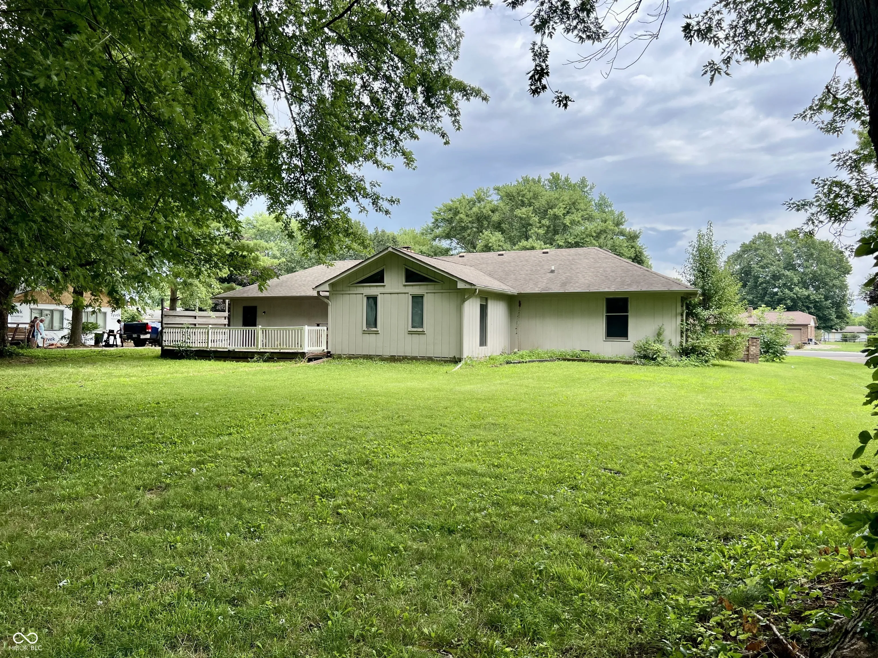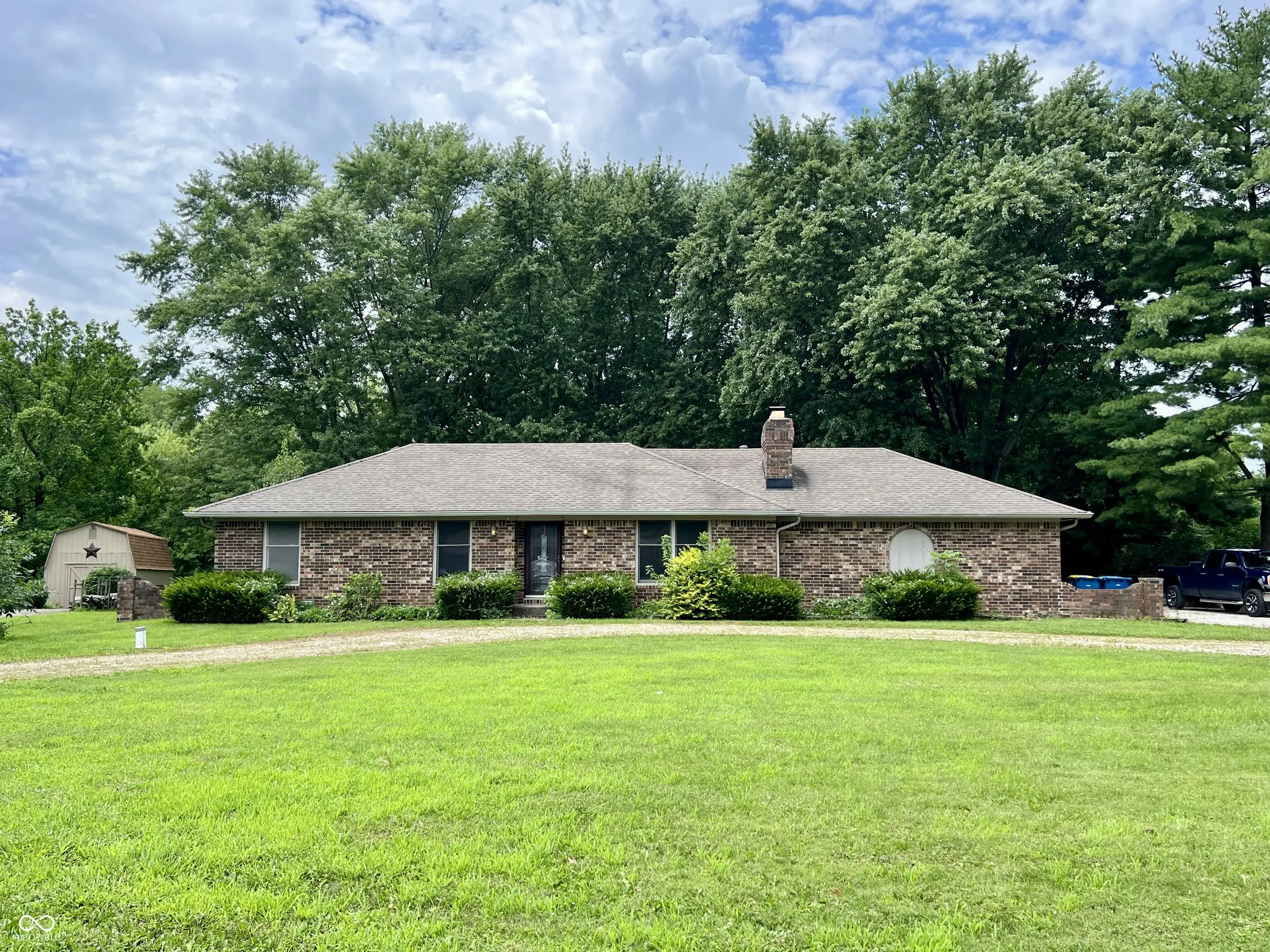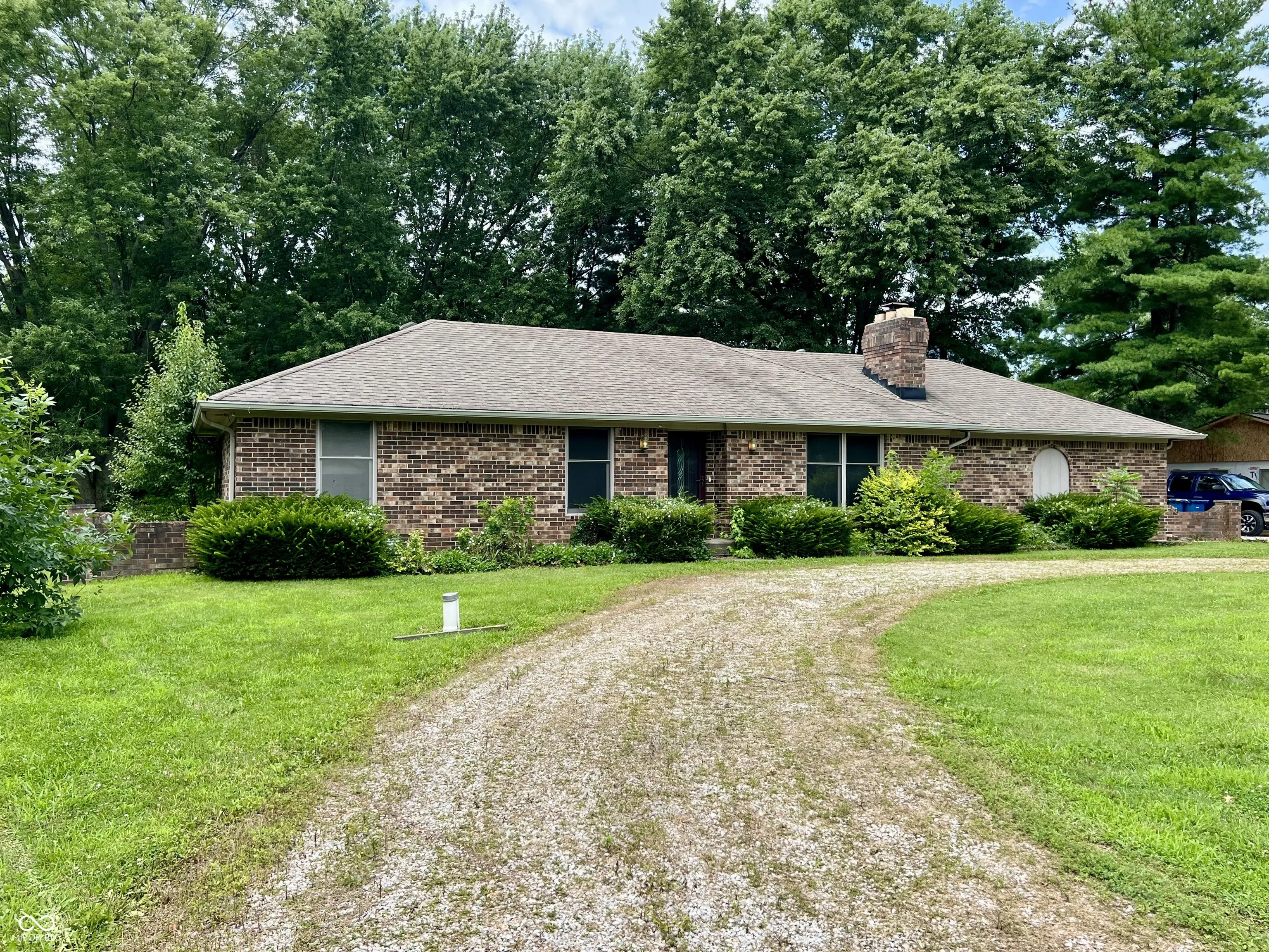 Welcome home to your little piece of country in vibrant Brownsburg!!! This stunning brick ranch sits on over 1/2 an acre of land & is located in a cul-de-sac in Sunny Acres! The home has been freshly painted and new carpet has been installed throughout. Enjoy cozy evenings by the fireplace in the living room, or spend lively activity in the family room with hardwood floors, a cathedral ceiling and lovely accented wood beams. The 3 bedrooms are spacious. The primary bedroom faces the back of the home for privacy and has a brand new expanded bathroom with double sinks and gorgeous tiled shower! The kitchen needs some updates, but the breakfast bar provides ample space for eating – or an actual dining table can be placed in the large family room. There are also laundry connections in the hall closet inside the house, and also in the garage. Outside is a deck that overlooks pure serenity. No neighbors behind you, and it also has a chicken coop and storage shed. The circular driveway and driveway to the side entry attached garage could be paved (currently gravel). The options for more upgrades to this home at this price are endless! Being sold in As-Is condition.