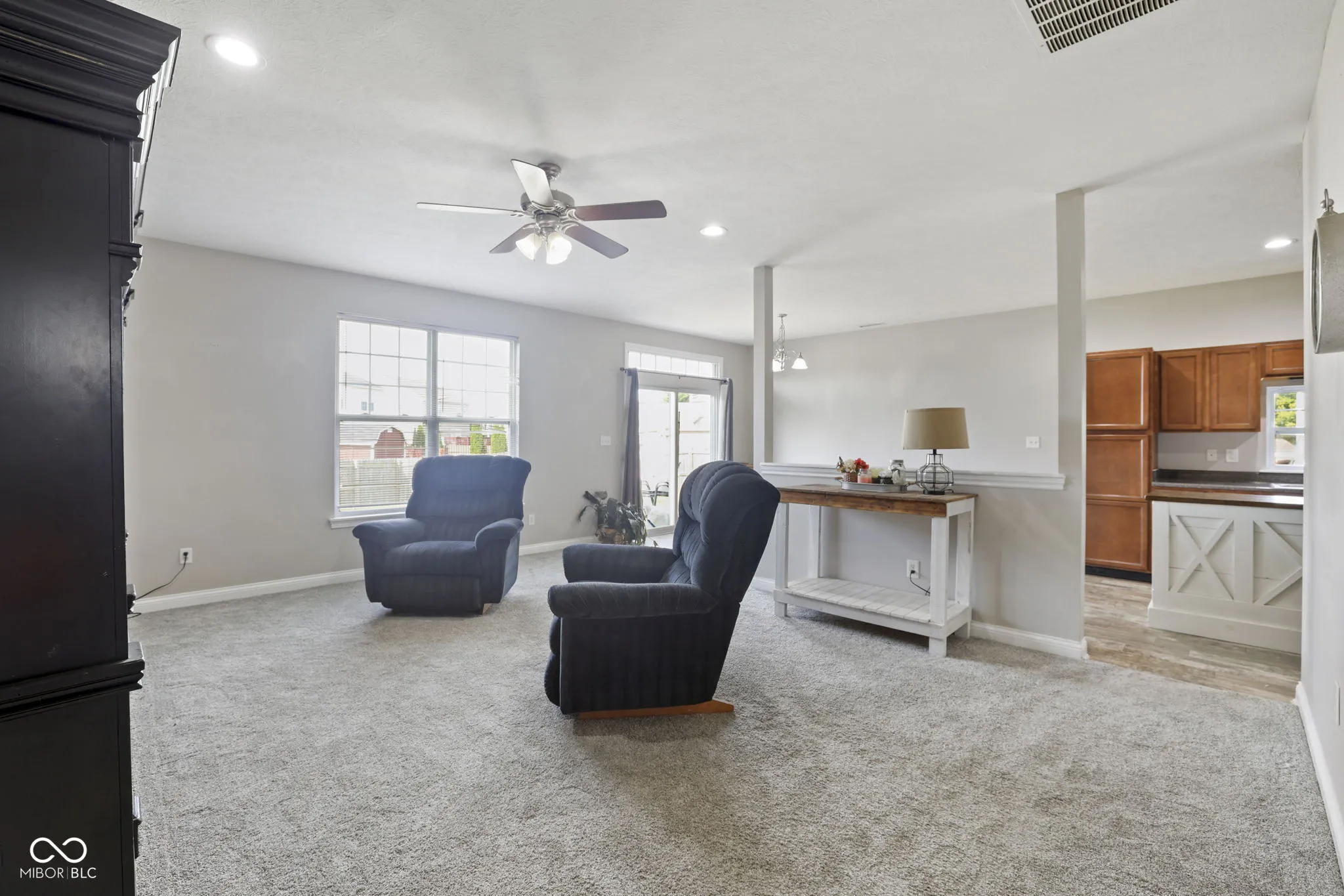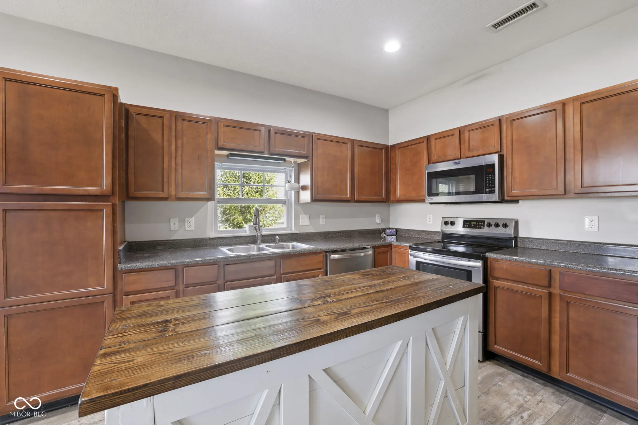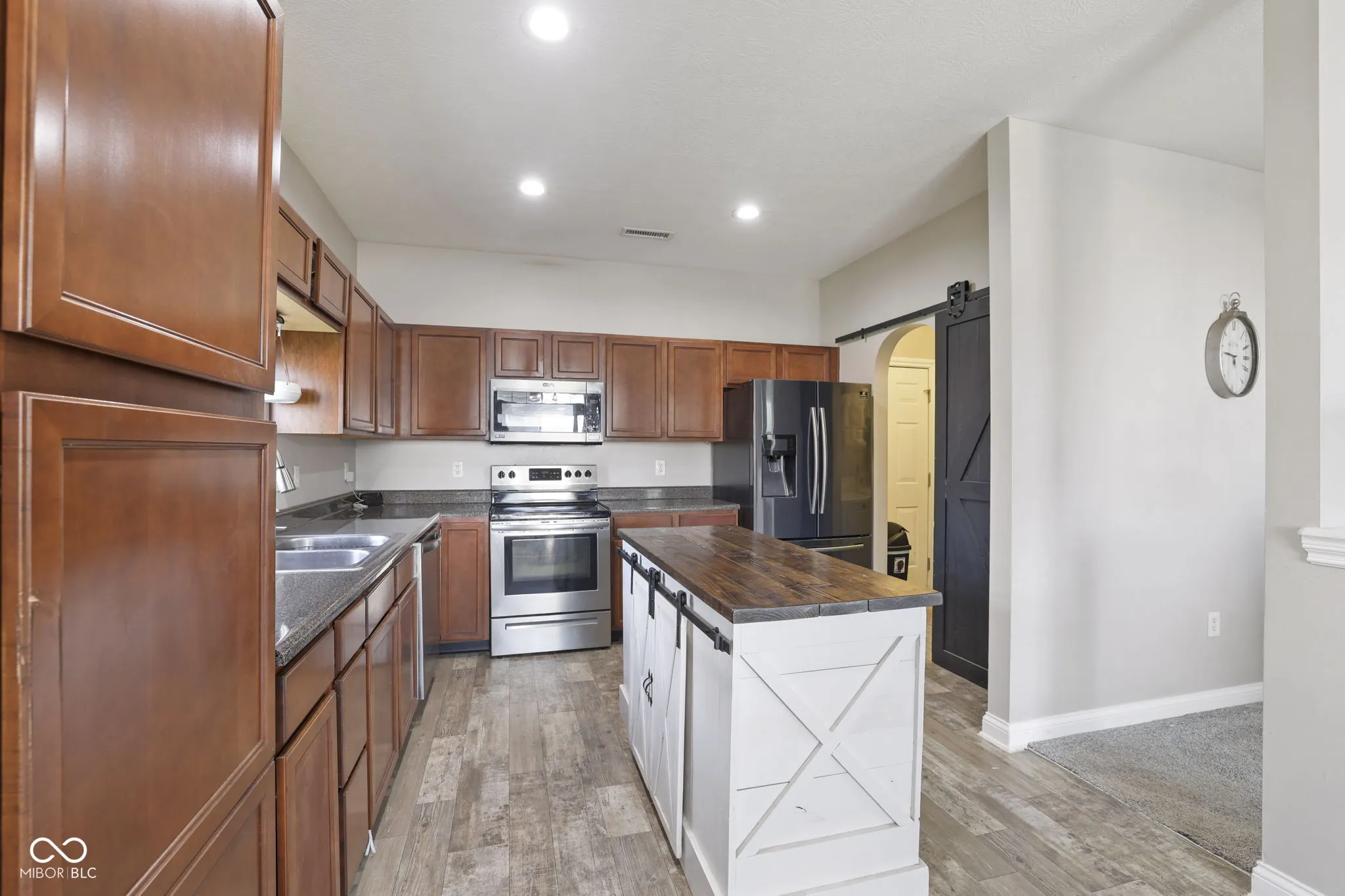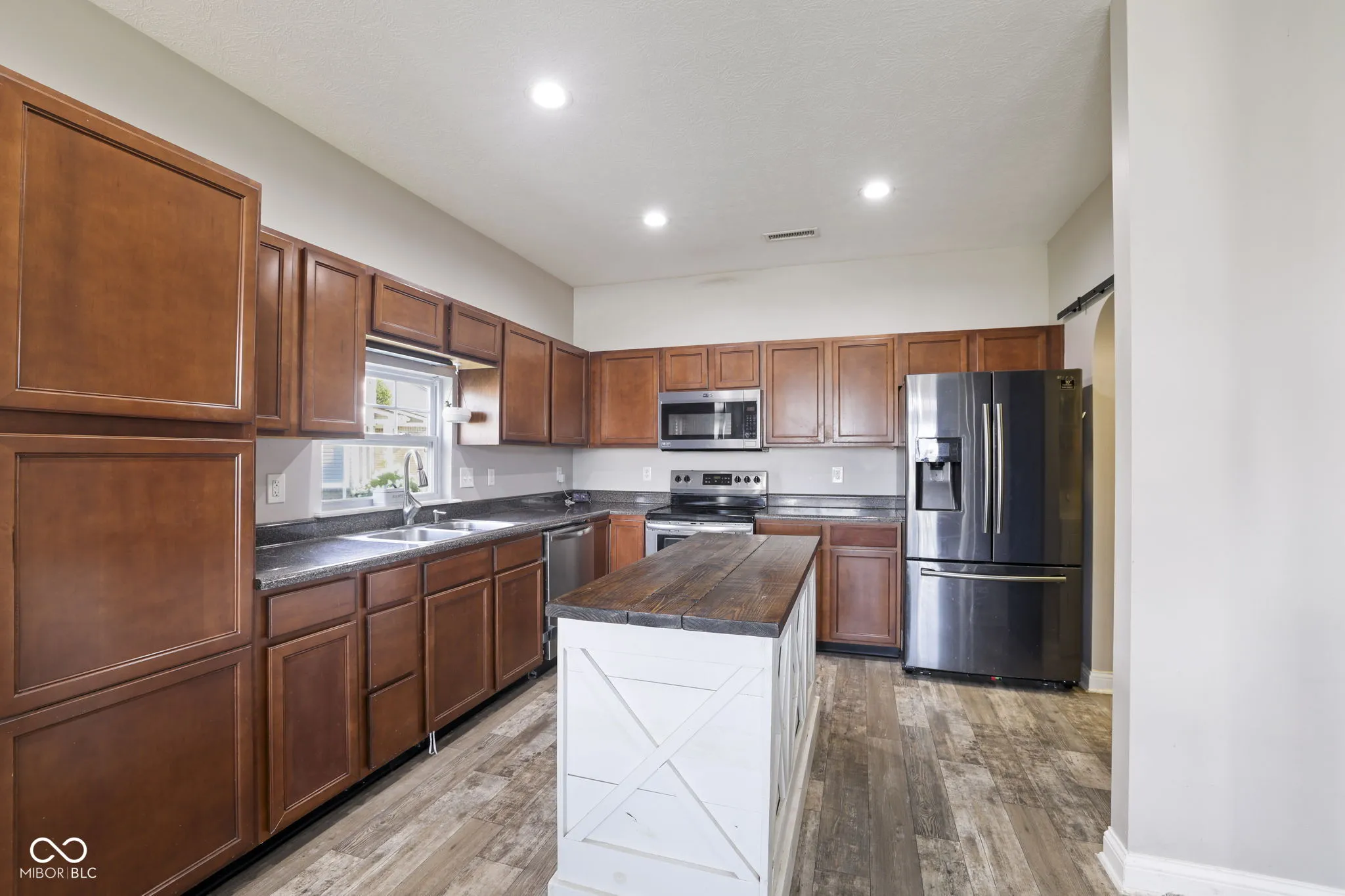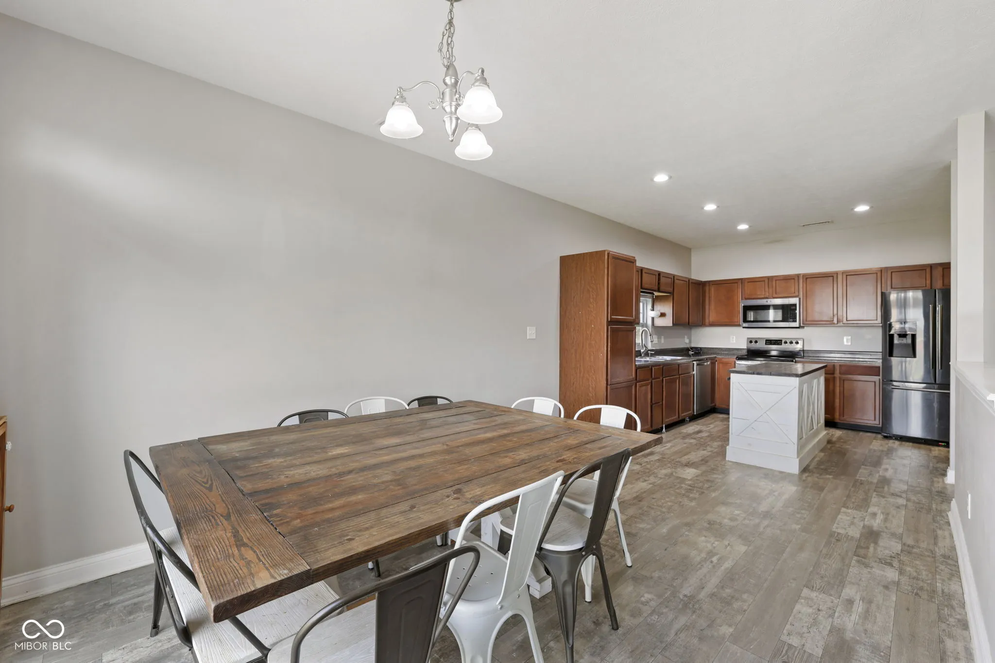 This move-in ready 3-bed, 2-bath ranch sits in a quiet, walkable neighborhood with fast access to I-74. Inside, the open floorplan features a spacious kitchen with warm cabinetry, stainless steel appliances, and a standout farmhouse-style island. Natural light pours through the kitchen window and highlights the durable wood-look flooring throughout. The dining space fits a full table and flows easily into the living area, making it great for hosting or everyday living. The primary suite includes a walk-in closet and private bath, while two additional bedrooms offer space for guests or a home office. The barn-style pantry door and fresh lighting add a stylish touch. Outside, enjoy a fenced backyard and peaceful community setting. Located in the sought-after Jefferson Park neighborhood within North West Hendricks schools, this home delivers both comfort and convenience.