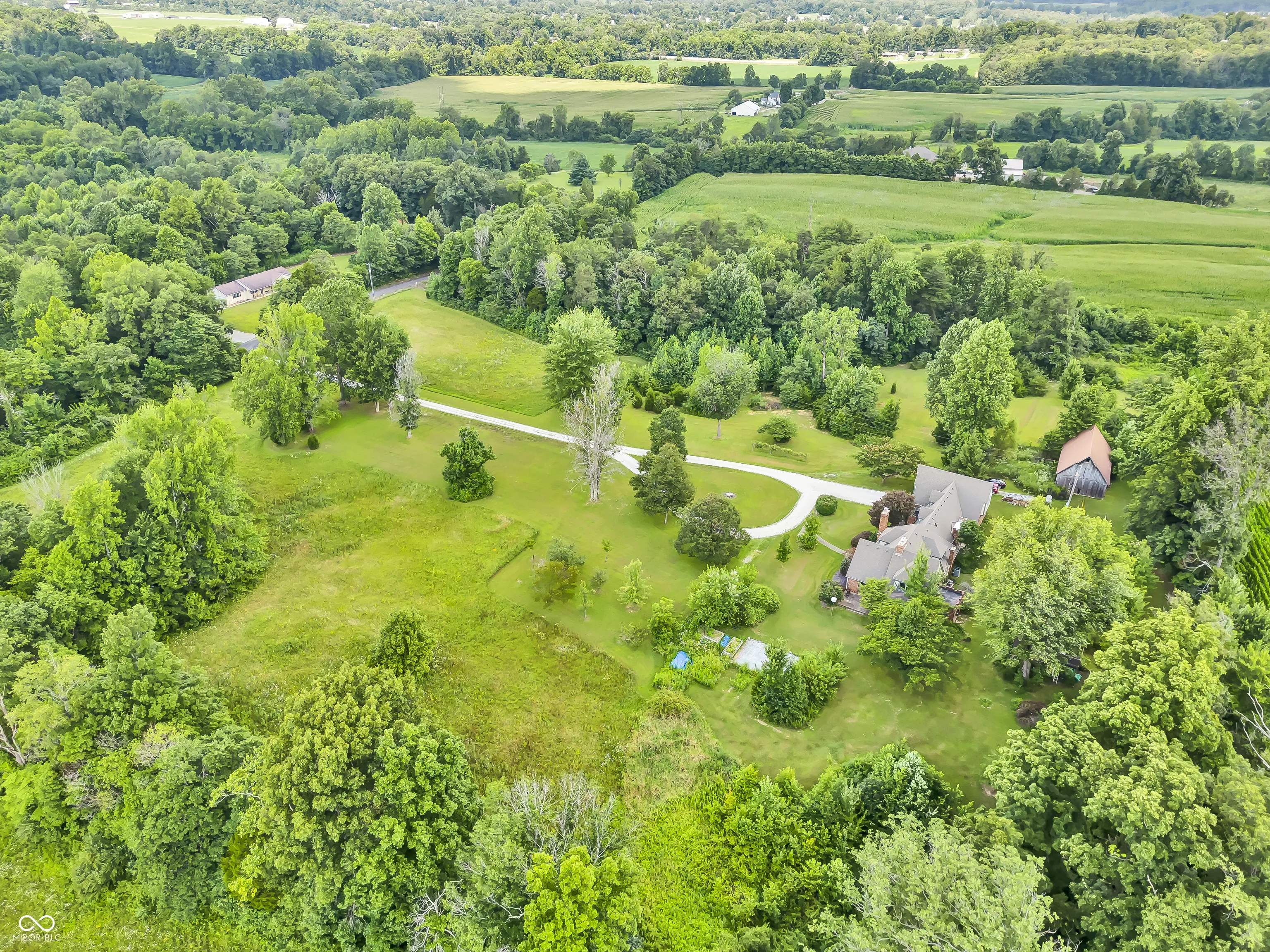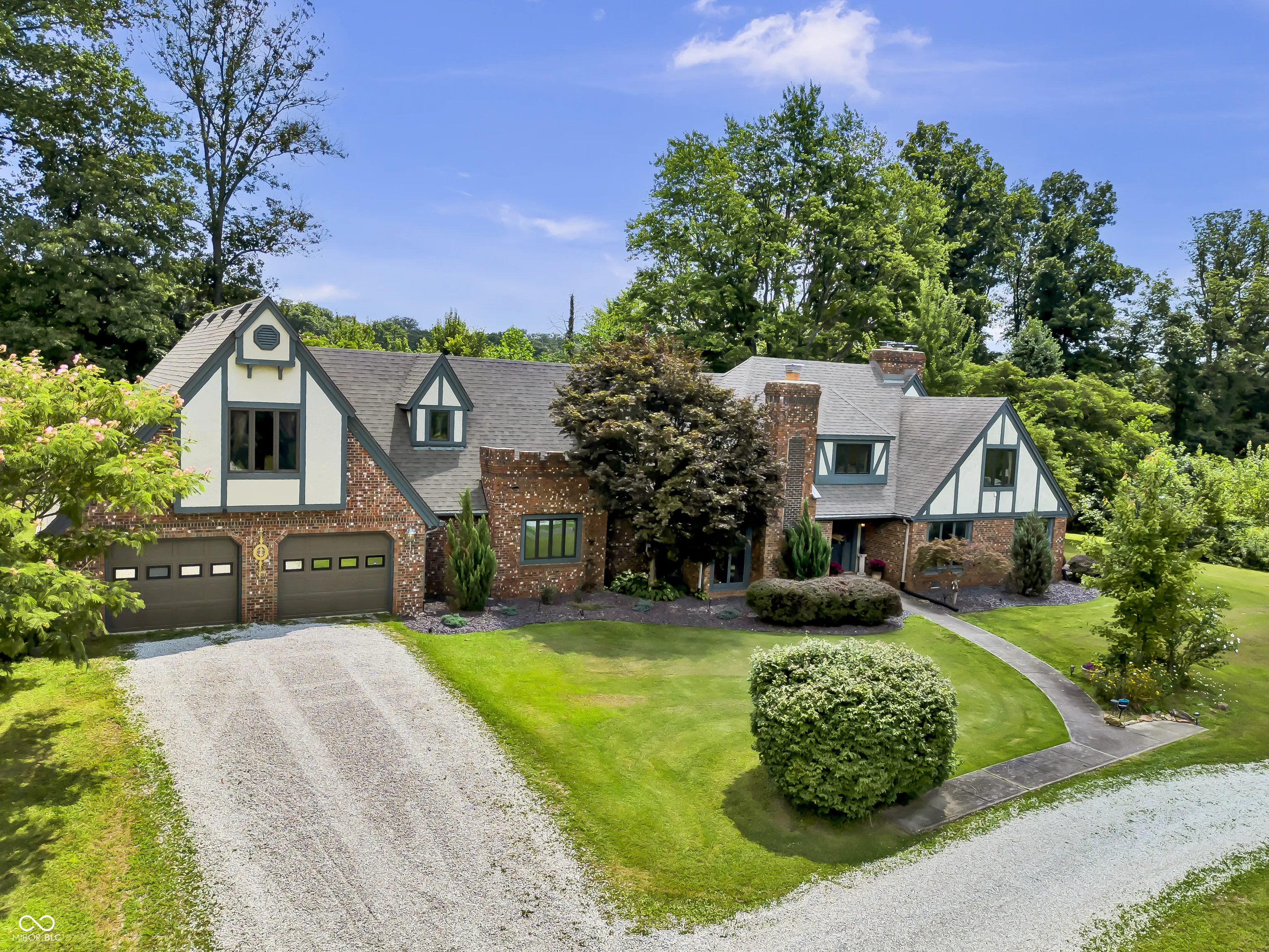 Discover the charm and grandeur of this stunning English Tudor Revival estate inspired by 16th century architecture, perfectly situated on 8 peaceful acres of gently rolling landscape. With 4,286 square feet of beautifully crafted living space, this one-of-a-kind home offers the perfect blend of historic character and modern comfort. The exterior showcases classic Tudor architecture – steep gables, decorative half-timbering, and rich brickwork – set against a backdrop of mature trees, fruit-bearing peach, plum, persimmon, apple, and pear trees, plus lush blackberry bushes. Inside, the home features four spacious bedrooms, two full bathrooms, five fireplaces, a wood-burning stove, and elegant architectural details throughout, including a beautiful wood staircase and tall ceilings that make each room feel grand and inviting. Enjoy a spa-like bathroom with a jacuzzi tub and gas fireplace for ambiance. The large kitchen boasts a center island, stainless steel appliances, and opens to a covered back patio, while the primary suite includes a private rooftop patio. A spacious parlor with fireplace and built-in bar is perfect for entertaining, and the main level large laundry room adds convenience. The oversized two-car attached garage includes a large loft space that could easily be finished for additional living area. A barn and outbuilding add to the property’s versatility, and the circular gravel drive enhances the estate feel. Whether you’re hosting gatherings or enjoying peaceful country living, this architectural gem offers unmatched space, style, and serenity.