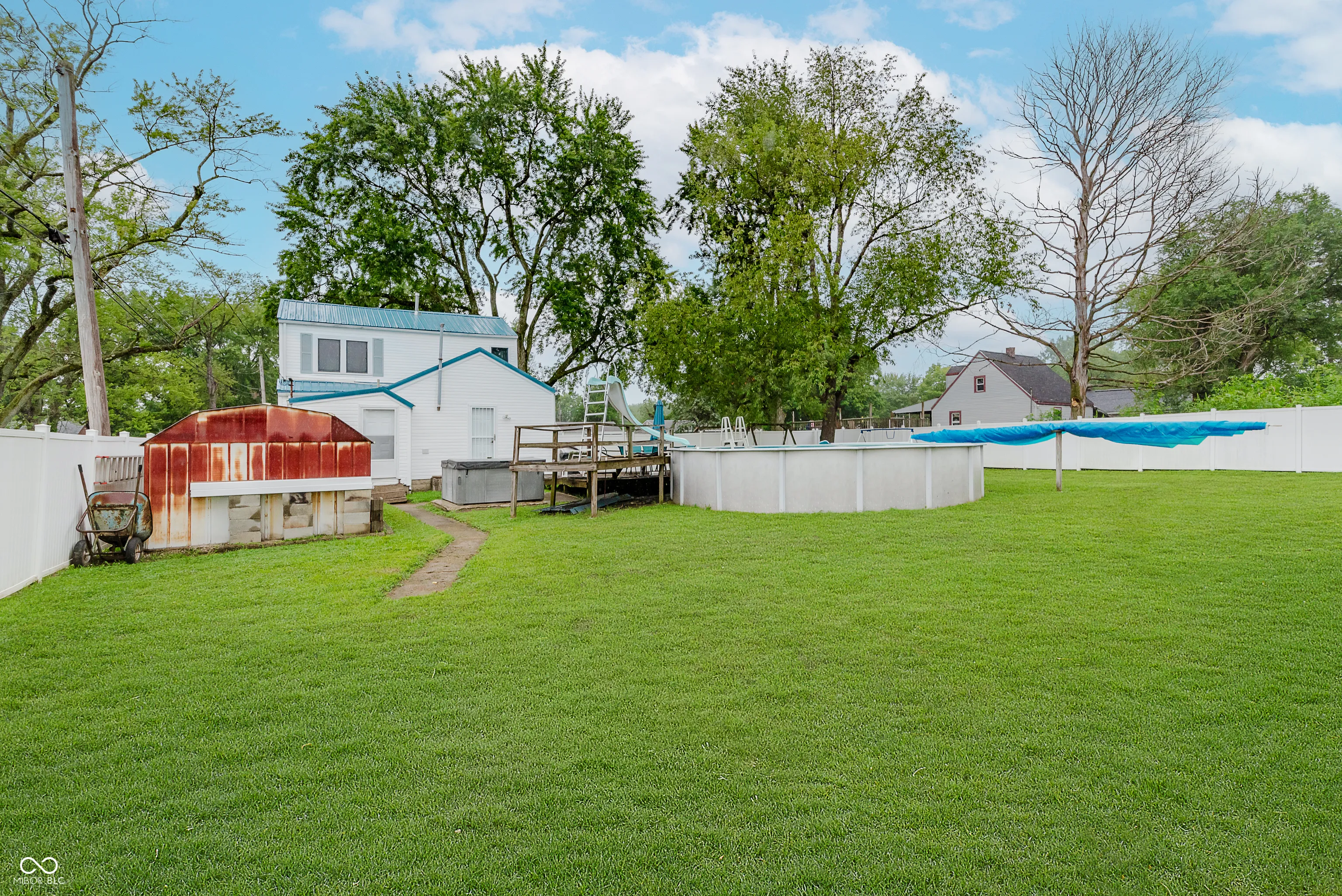 2 Story Home with a main level bedroom and 2 bedrooms upstairs. on 2 tax parcels totaling over .28 acres of land. This home has a large living area and a Dining room. The kitchen has lots of cabinets and the appliances stay, even a separate freezer. UPDATES INCLUDE : Main Sewer line to outside replaced 2025. Gas Heat Furnace 2020 and Central Air 2021. Water Heater 2022. Metal Roof 2018. Curtains and Blinds stay. Enjoy the amazing fully privacy fenced in back yard with an above ground pool, deck and hot tub. There is also a shed. City utilities, no HOA. parking in front.