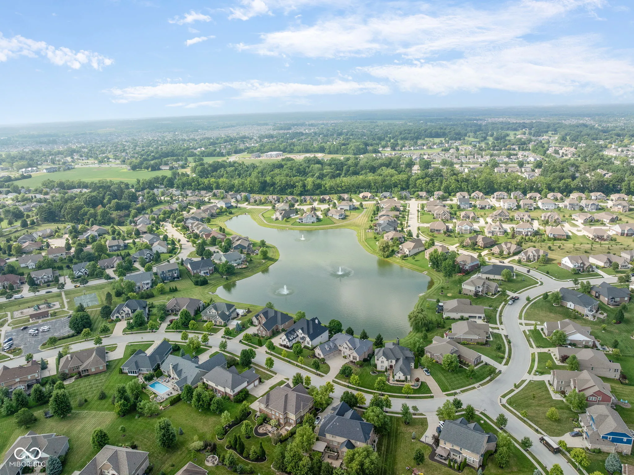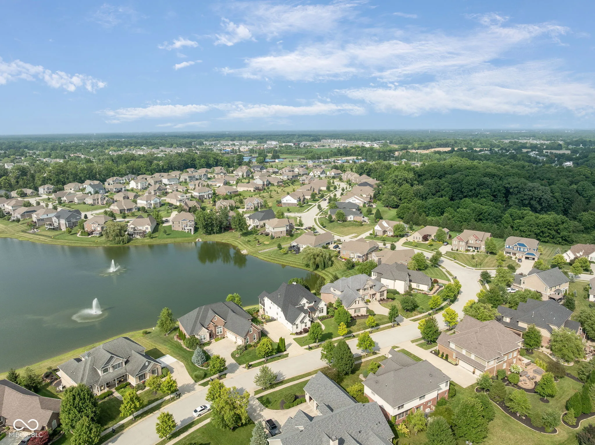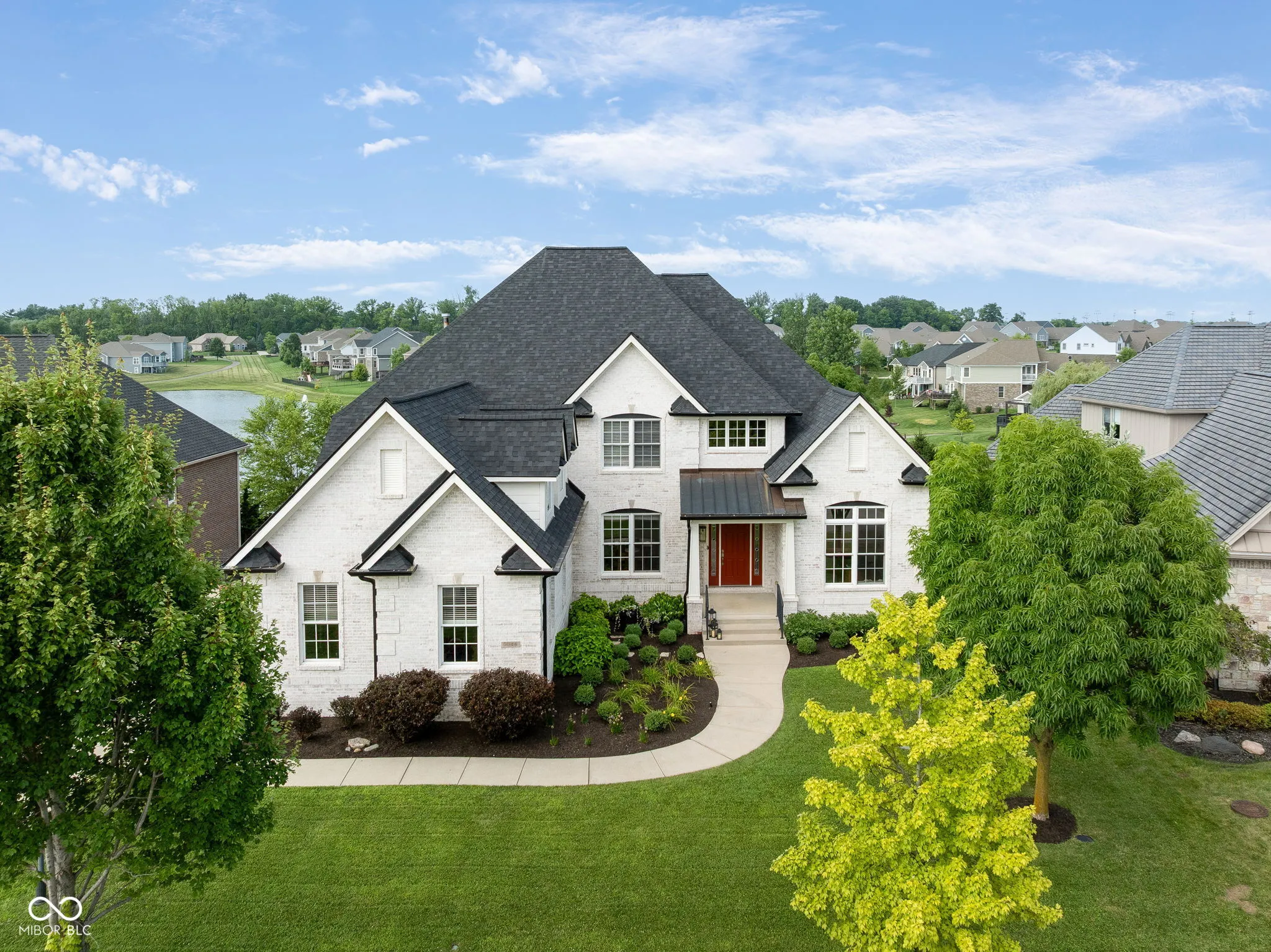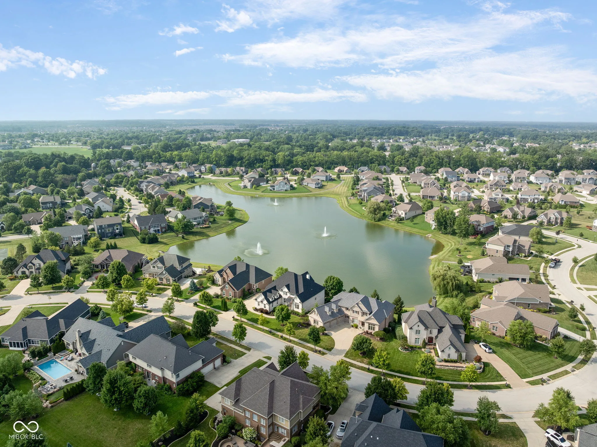 Welcome to an exceptional residence that redefines luxury living, offering 5 bedrooms, 5.5 bathrooms, and over 5,500 square feet of finished living space, thoughtfully designed for elevated comfort and entertaining. Perfectly situated at the center of an oversized pond with three lighted fountains, this home boasts the most expansive water views in the neighborhood. The living room is drenched in natural light from the panoramic windows and open to kitchen. The main-level primary suite provides a peaceful retreat with serene pond views, a spa-like bath, and a generous walk-in closet. Each additional bedroom features its own en suite bathroom and large walk-in closet, offering privacy and luxury throughout. In addition, a large screened-in porch with Trex decking provides a private and tranquil space to relax while overlooking the pond. The oversized three-car garage features epoxy floors and an electric vehicle charging outlet, combining style with functionality. A whole-home clean water filtration system adds another layer of thoughtful living. The finished walk-out basement is an entertainer’s dream with soaring 10-foot ceilings, a full bar equipped with a dishwasher and oven, a spacious gaming area, and a dedicated theatre room with built-in surround sound. Step outside to the stamped concrete patio where a fully equipped outdoor kitchen, fire pit, and beautifully landscaped surroundings set the stage for unforgettable gatherings, all framed by picturesque water views. Located just steps from the Midland Trace Trail-which connects directly to the Monon Trail-this home offers unmatched access to recreation and nature. Set in a highly sought-after neighborhood where homes rarely become available, this is a rare opportunity to enjoy refined living, privacy, and natural beauty in one extraordinary home.