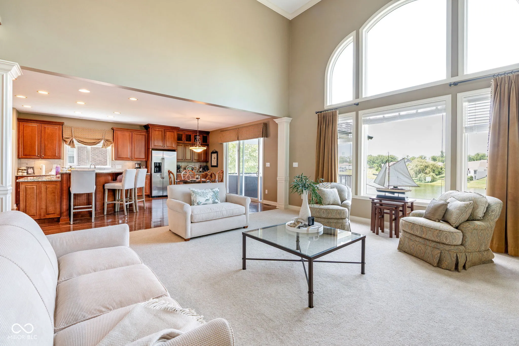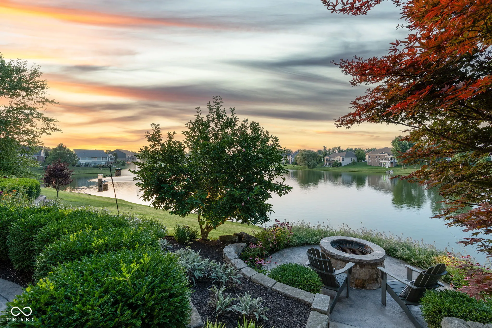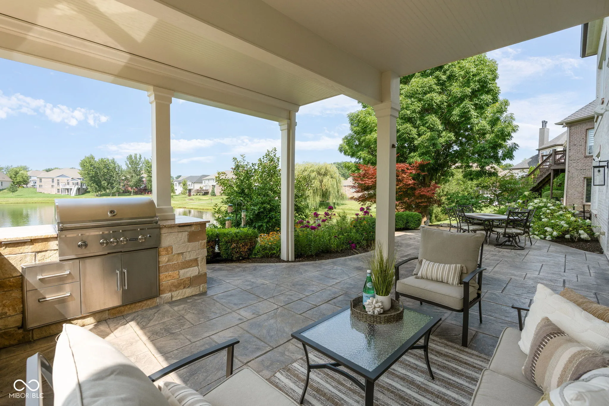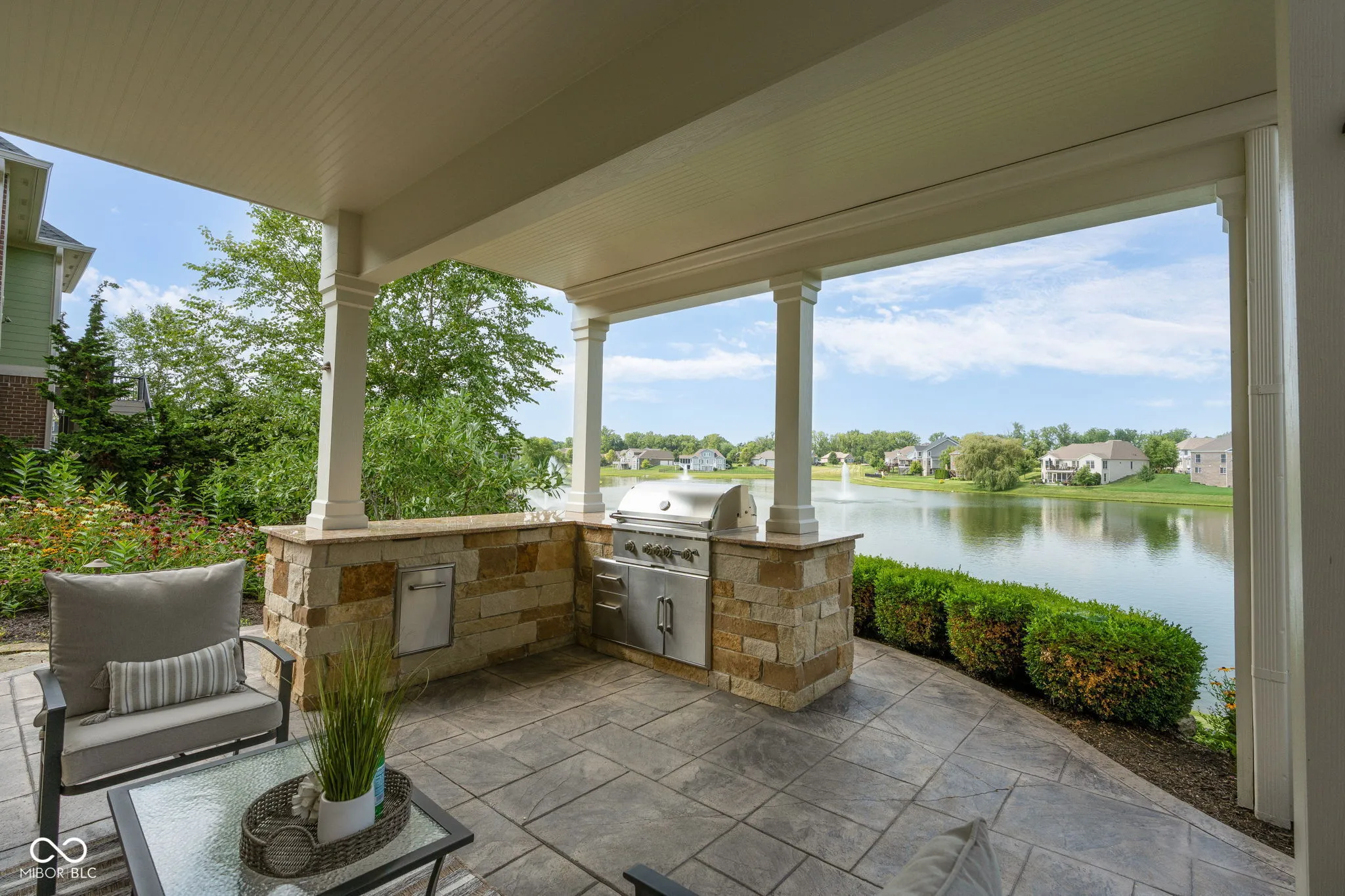 Welcome to an exceptional residence that redefines luxury living, offering 5 bedrooms, 5.5 bathrooms, and over 5,500 square feet of finished living space, thoughtfully designed for elevated comfort and entertaining. Perfectly situated at the center of an oversized pond with three lighted fountains, this home boasts the most expansive water views in the neighborhood. The living room is drenched in natural light from the panoramic windows and open to kitchen. The main-level primary suite provides a peaceful retreat with serene pond views, a spa-like bath, and a generous walk-in closet. Each additional bedroom features its own en suite bathroom and large walk-in closet, offering privacy and luxury throughout. In addition, a large screened-in porch with Trex decking provides a private and tranquil space to relax while overlooking the pond. The oversized three-car garage features epoxy floors and an electric vehicle charging outlet, combining style with functionality. A whole-home clean water filtration system adds another layer of thoughtful living. The finished walk-out basement is an entertainer’s dream with soaring 10-foot ceilings, a full bar equipped with a dishwasher and oven, a spacious gaming area, and a dedicated theatre room with built-in surround sound. Step outside to the stamped concrete patio where a fully equipped outdoor kitchen, fire pit, and beautifully landscaped surroundings set the stage for unforgettable gatherings, all framed by picturesque water views. Located just steps from the Midland Trace Trail-which connects directly to the Monon Trail-this home offers unmatched access to recreation and nature. Set in a highly sought-after neighborhood where homes rarely become available, this is a rare opportunity to enjoy refined living, privacy, and natural beauty in one extraordinary home.
