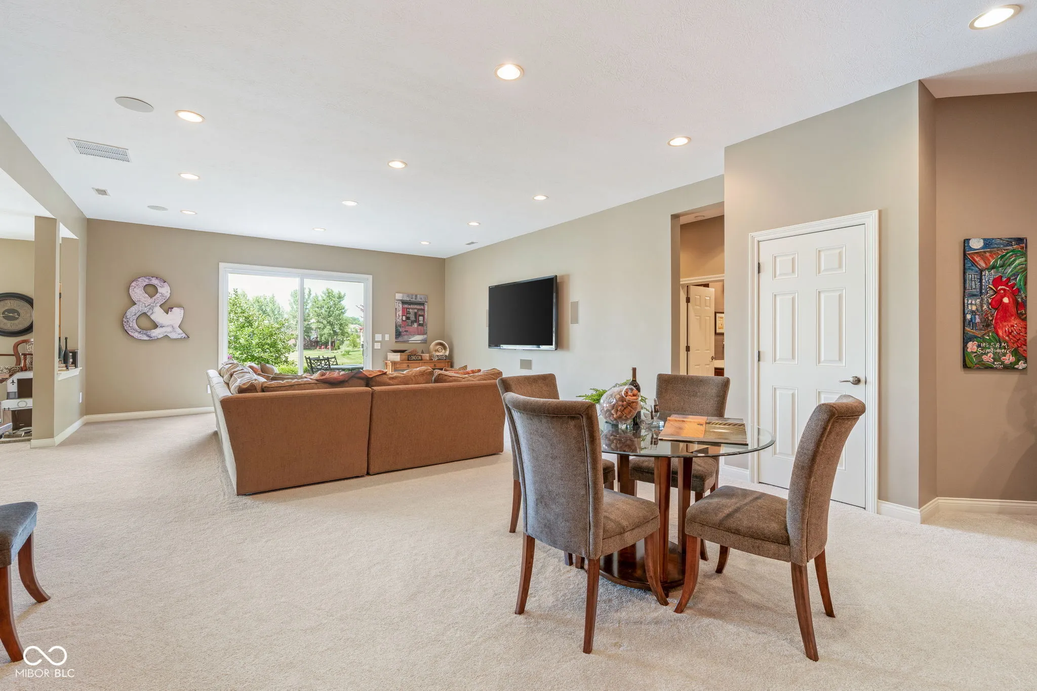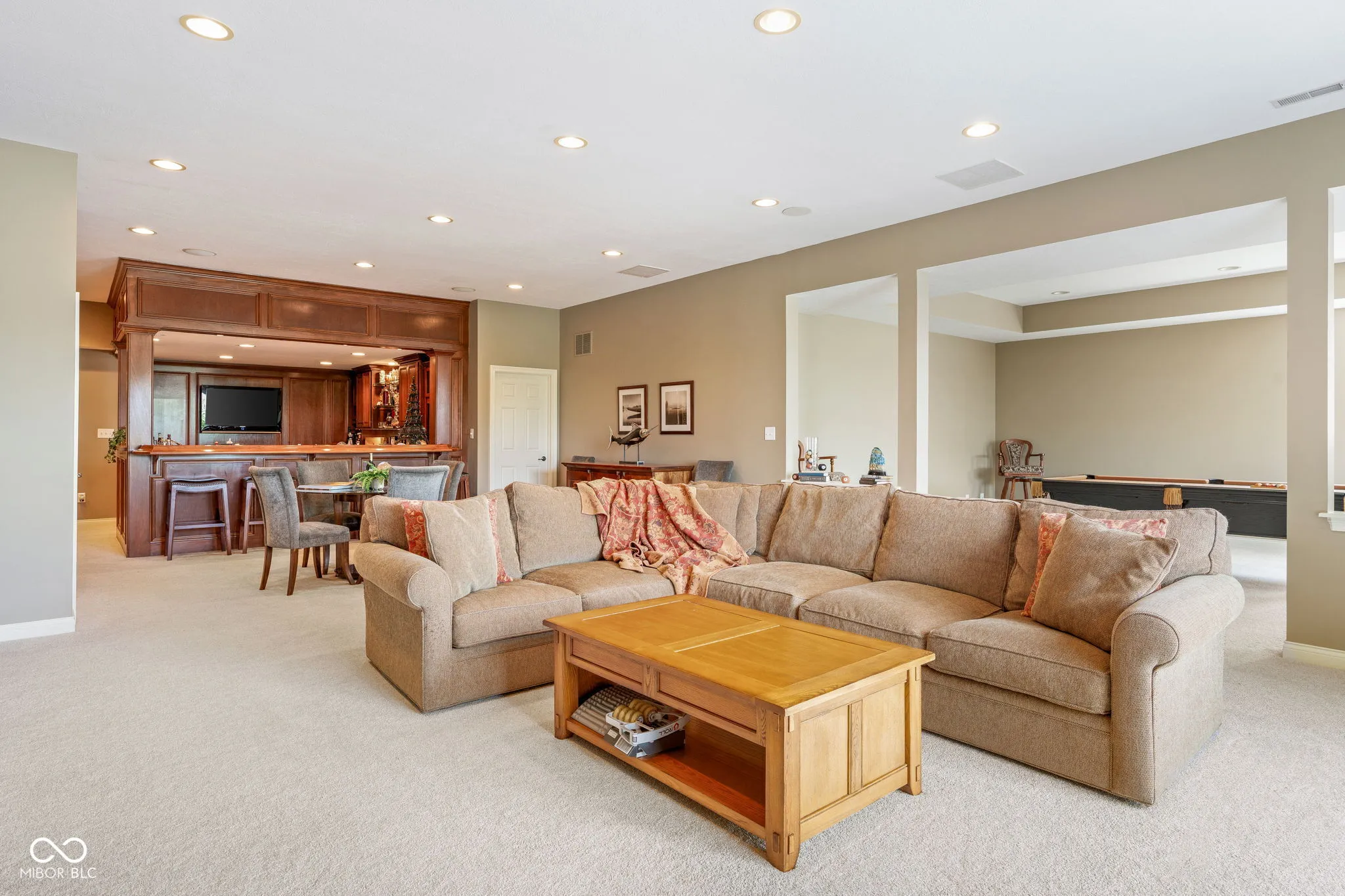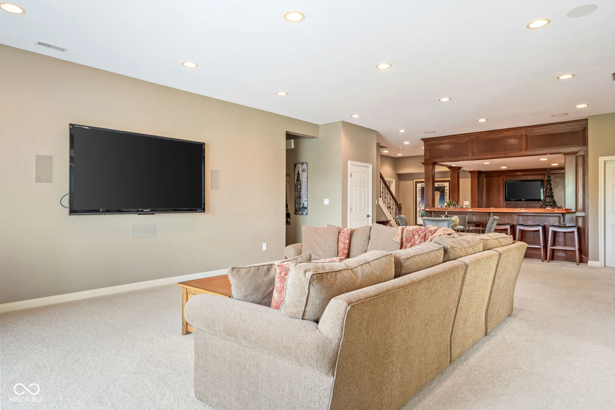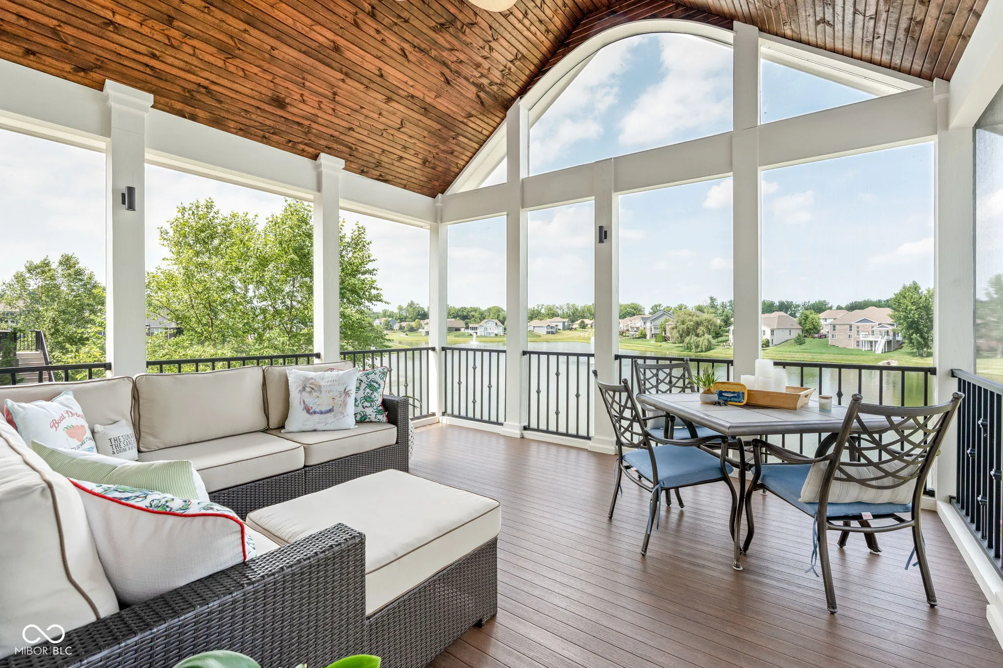 Welcome to an exceptional residence that redefines luxury living, offering 5 bedrooms, 5.5 bathrooms, and over 5,500 square feet of finished living space, thoughtfully designed for elevated comfort and entertaining. Perfectly situated at the center of an oversized pond with three lighted fountains, this home boasts the most expansive water views in the neighborhood. The living room is drenched in natural light from the panoramic windows and open to kitchen. The main-level primary suite provides a peaceful retreat with serene pond views, a spa-like bath, and a generous walk-in closet. Each additional bedroom features its own en suite bathroom and large walk-in closet, offering privacy and luxury throughout. In addition, a large screened-in porch with Trex decking provides a private and tranquil space to relax while overlooking the pond. The oversized three-car garage features epoxy floors and an electric vehicle charging outlet, combining style with functionality. A whole-home clean water filtration system adds another layer of thoughtful living. The finished walk-out basement is an entertainer’s dream with soaring 10-foot ceilings, a full bar equipped with a dishwasher and oven, a spacious gaming area, and a dedicated theatre room with built-in surround sound. Step outside to the stamped concrete patio where a fully equipped outdoor kitchen, fire pit, and beautifully landscaped surroundings set the stage for unforgettable gatherings, all framed by picturesque water views. Located just steps from the Midland Trace Trail-which connects directly to the Monon Trail-this home offers unmatched access to recreation and nature. Set in a highly sought-after neighborhood where homes rarely become available, this is a rare opportunity to enjoy refined living, privacy, and natural beauty in one extraordinary home.
