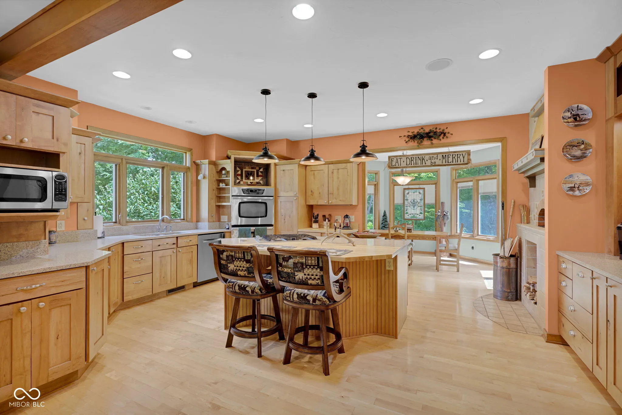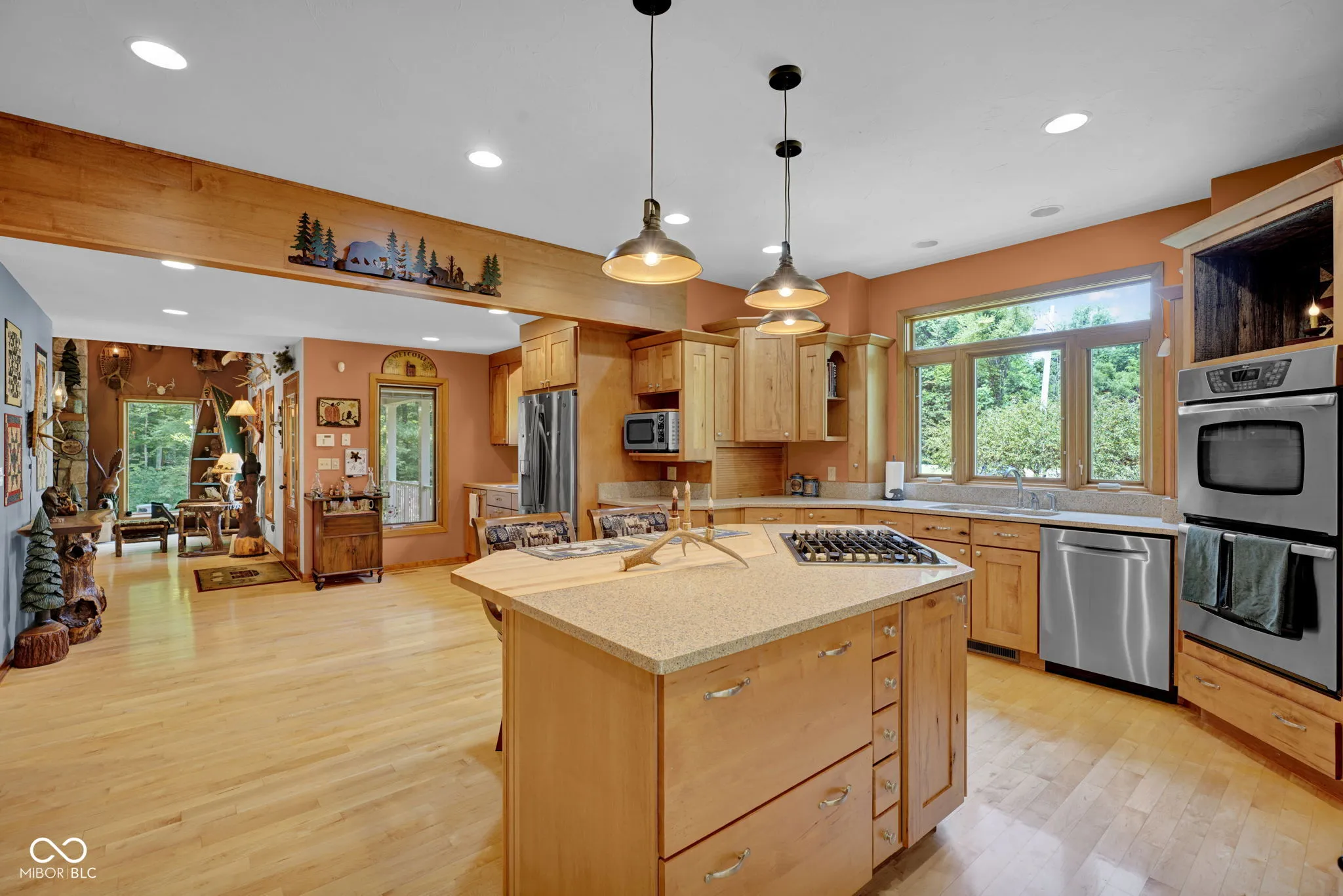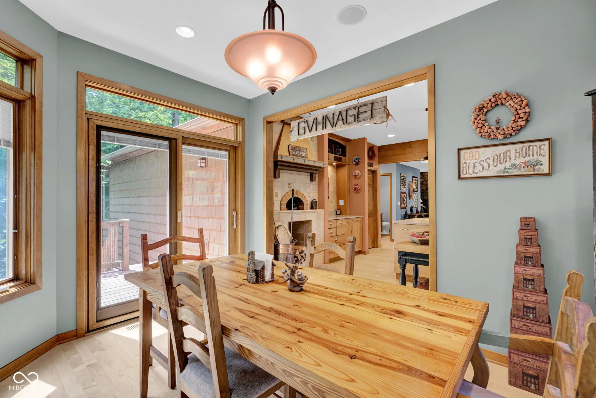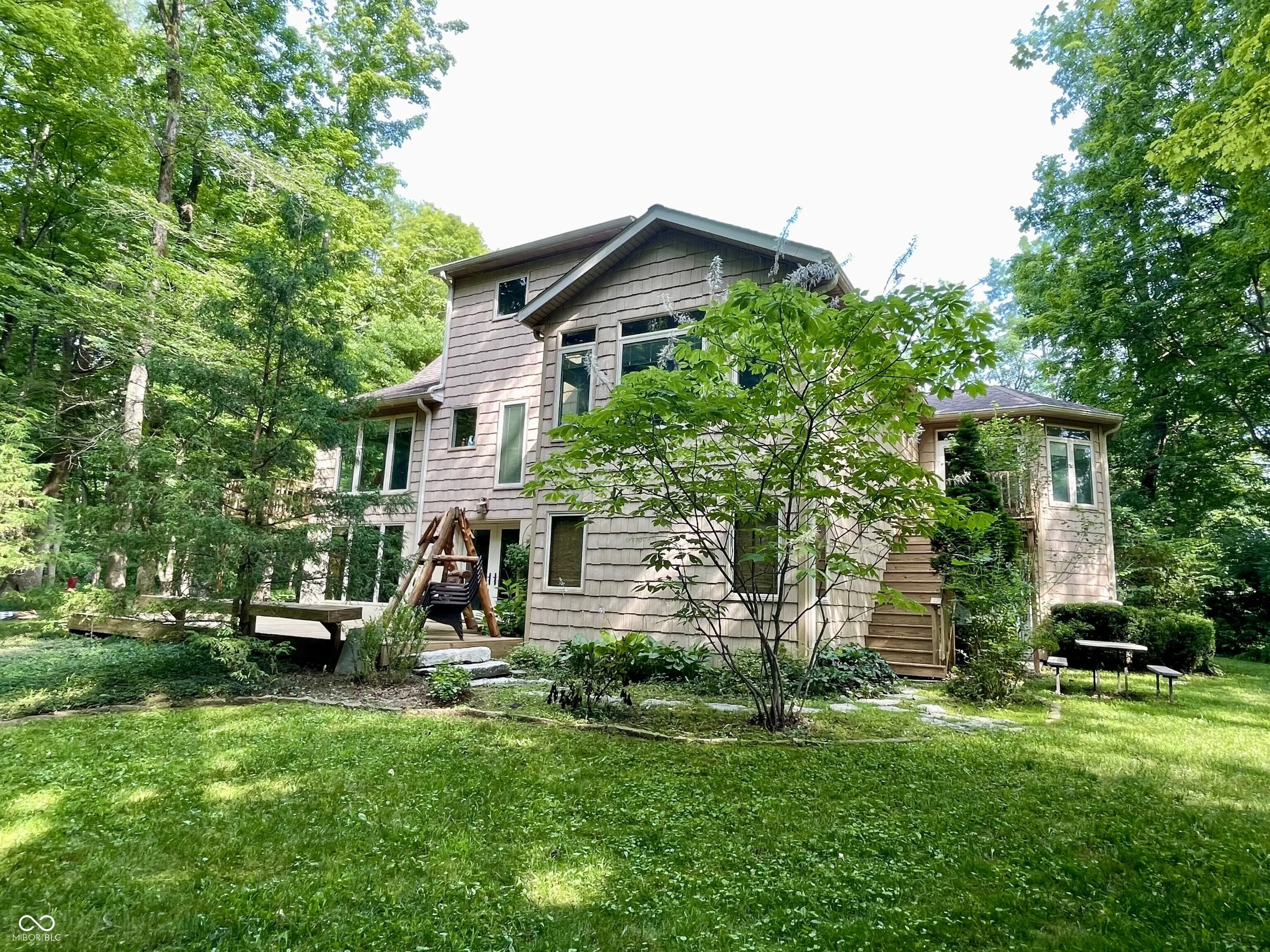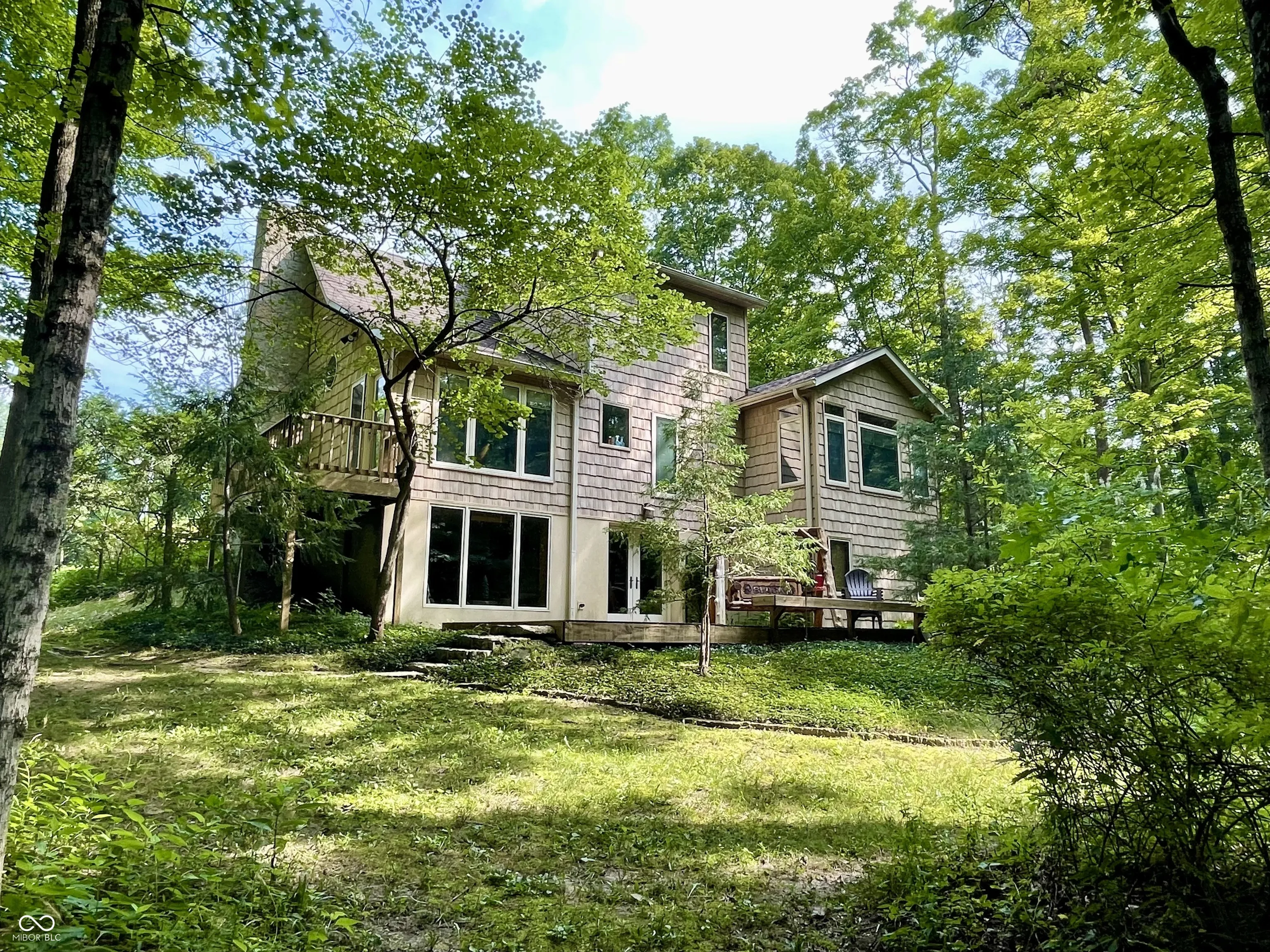 Escape to nature! Over 5 acres of heavily wooded wonderland where wildlife & waterfowl gather at the pond. 3800sqft of living space in this captivating custom home with a versatile finished walkout basement and windows everywhere! Step in the front door and enter the great room with a striking two-story stone fireplace. The sprawling eat-in kitchen includes ample counter space and cabinetry, as well as a large center island with stove top, storage and seating space. Besides a double oven, there is a fun wood-fired pizza oven, and even a wet bar. Formally dine in the enchanting turret and enjoy the views in 5 directions, or step out to the deck to absorb nature. Just try to get any work done from the fabulous office with a built-in desk, shelves, and cabinets, while gazing out the window wall or from the adjoining balcony. Whether this is your primary home, a country retreat, or a blended household, there is something for everyone! Primary suite on main level with a huge WIC; guest suite as the entire upper level; and a third bedroom, full bathroom, PLUS a second kitchen in the finished walk-out basement. Also found in the basement is a living room, family room, second wet bar, and huge storage room. One of your favorite spots will be gazing at the birds, hawks, deer, and ducks on the pond from the huge basement picture window. Or saunter out on the spacious lower deck for even closer immersion in nature, perhaps stroll down the trail in the woods around the pond and pause to watch the great blue heron, fish, and frogs… relax… and just… breathe.