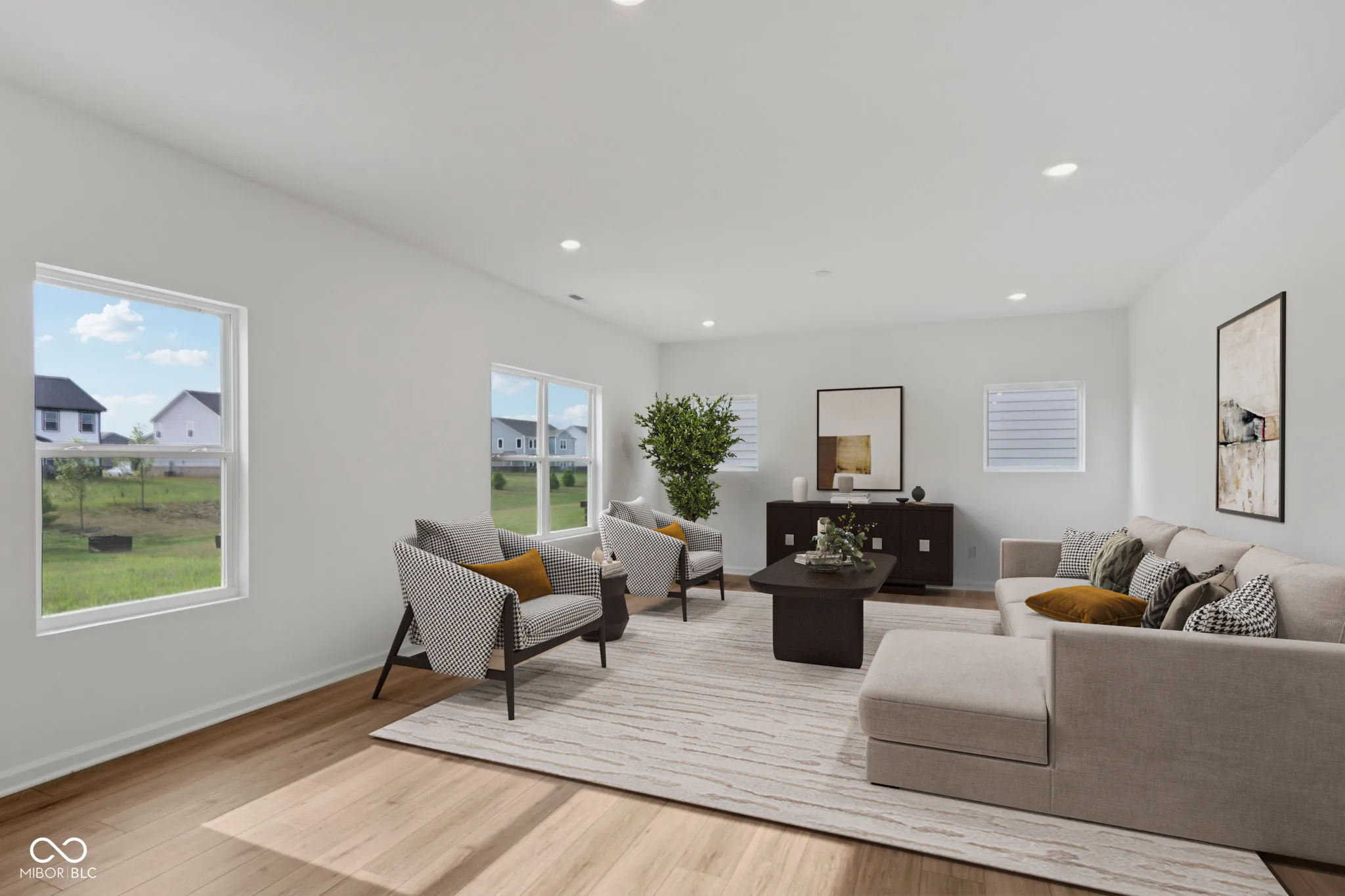 Welcome to your new home in Greenwood, IN! This 5-bedroom, 3-full bathroom residence features all of the aspects of comfort and style that you have been hoping for. With elevation A and brick option B featuring charming brick wainscott on the sides and rear, this home is a true gem. Step inside to discover the thoughtful features that make this home stand out. A unique addition to the first floor includes an extra bedroom with full bathroom and mudroom, providing both convenience and functionality. The den flex room layout is bright and fresh with 10-lite glass double doors, offering a versatile space to suit your lifestyle. Enjoy the durability and beauty of luxury vinyl plank flooring throughout the hard first floor areas and cozy carpeting in the main floor bedroom and great room. Imagine having your morning coffee in the natural light of the sunroom or hosting get togethers on the 12×10 rear concrete patio. Needing extra storage space? This home offers an extended closet under the stairs for storage and a 2-car front loading garage comes with a 2′ front extension, providing ample space for your vehicles and storage needs. The kitchen is a blend of storage and functionality, featuring 42″ straight across upper cabinetry in a crisp white, complemented by a kitchen island and sparkling white quartz countertops. The stainless-steel gas range, microwave, and dishwasher in the kitchen complete the modern and functional design of this home. With a primary suite that boasts a separate garden tub and shower with a double bowl vanity, this home exudes luxury and comfort. Quartz countertops grace all the bathrooms, adding a sophisticated finish to these spaces. The hall bathroom also includes a double bowl vanity for added convenience.