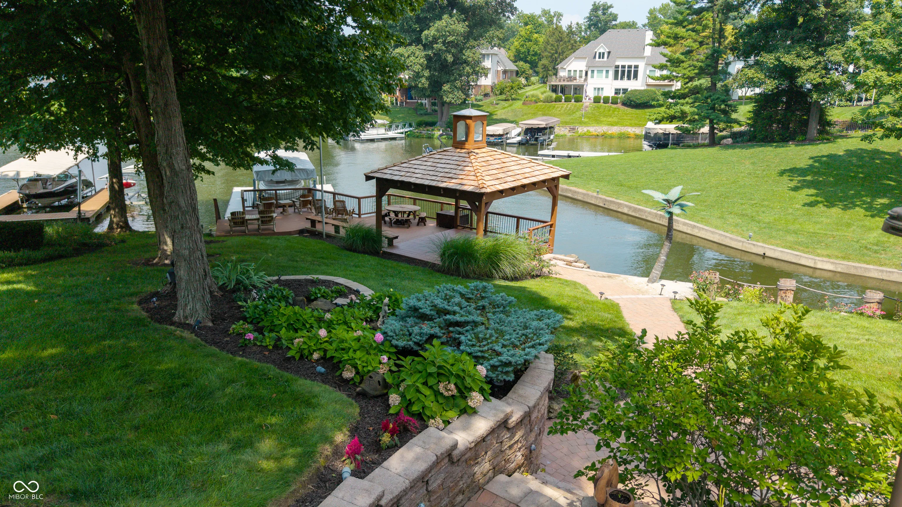 Sellers are downsizing and offering this home as is – ready for you to make it your own dream retreat! This property is designed for entertaining, inside and out. The terraced backyard features stunning stone retaining walls, lush flower beds, a serene freshwater pond with a waterfall, and brick paver steps that lead to the showstopper: a beautifully outfitted outdoor living space. Enjoy life to the fullest on the expansive rear deck complete with an automatic awning, a covered patio accessible from the walkout basement, a sunken hot tub, and a charming gazebo with brand-new shake shingles and a gas firepit. A newly stained and power-washed deck connects the gazebo to a 24′ Shore Station dock with vinyl cover & direct drive power lift and jet ski dock-everything ready for lakeside living. Even better, all outdoor furniture is included! Inside the lower-level walkout basement, relaxation and entertainment continue. Watch your favorite movies on the large-screen TV with a full media center, play a round at the pool table (accessories included), or gather around the pub and poker tables. You can even challenge your friends to a game of darts. And the fun doesn’t stop there-step into your very own English-style pub bar made from solid cherry wood. It includes glassware racks, a dry sink, mini fridge, countertop microwave, brass foot rail, and overhead canopy. Nearby, a lit freshwater aquarium tops a custom cabinet with a bar sink and designer tile backsplash. The custom interior features cherry stained woodwork and cherry hardwood floors. The kitchen has been updated with tile floor, Jennaire SS appliances, tile backsplash, granite countertops and single SS sink. See special feature sheet in supplements. There is a $1500/yr voluntary fee to the Geist Conservation for upkeep of water along the shorelines in the coves.