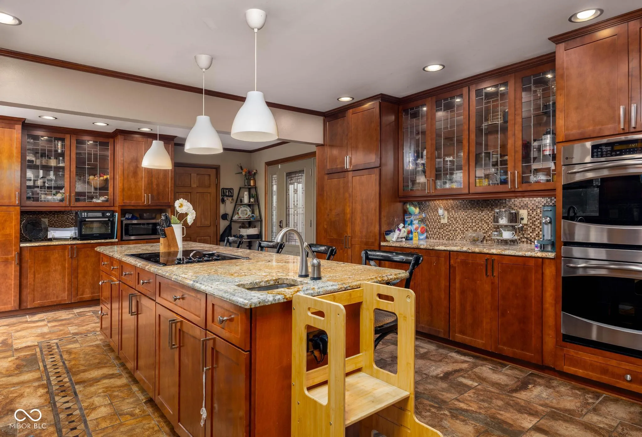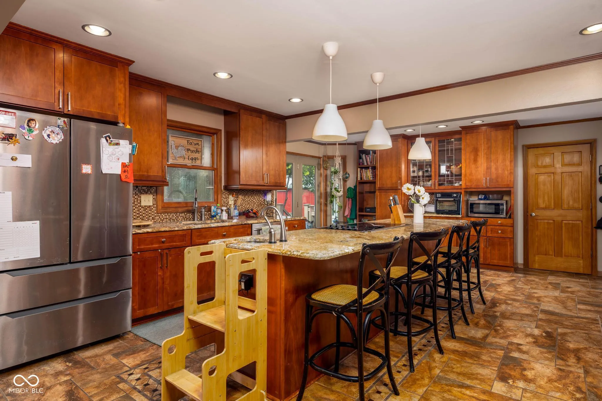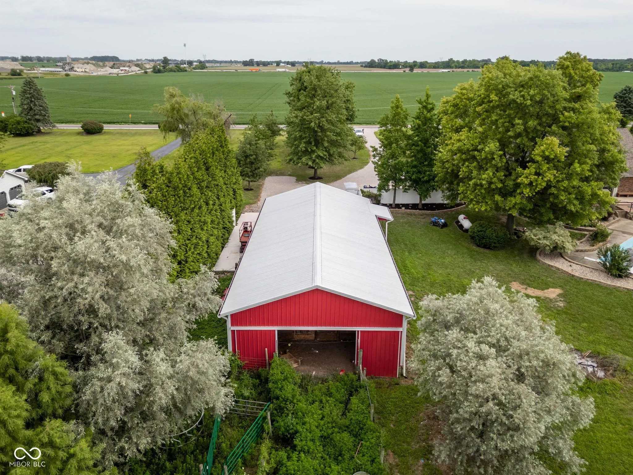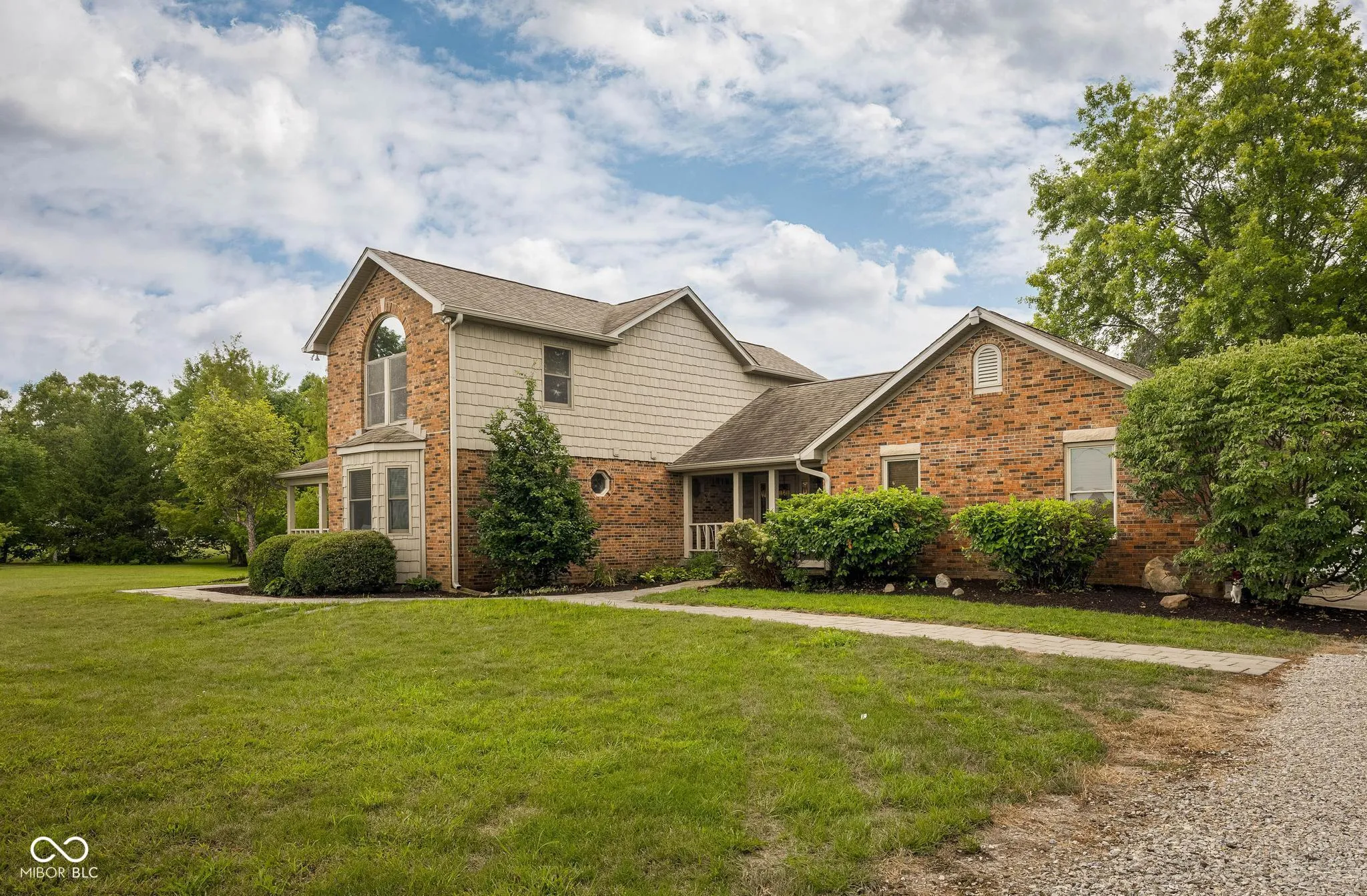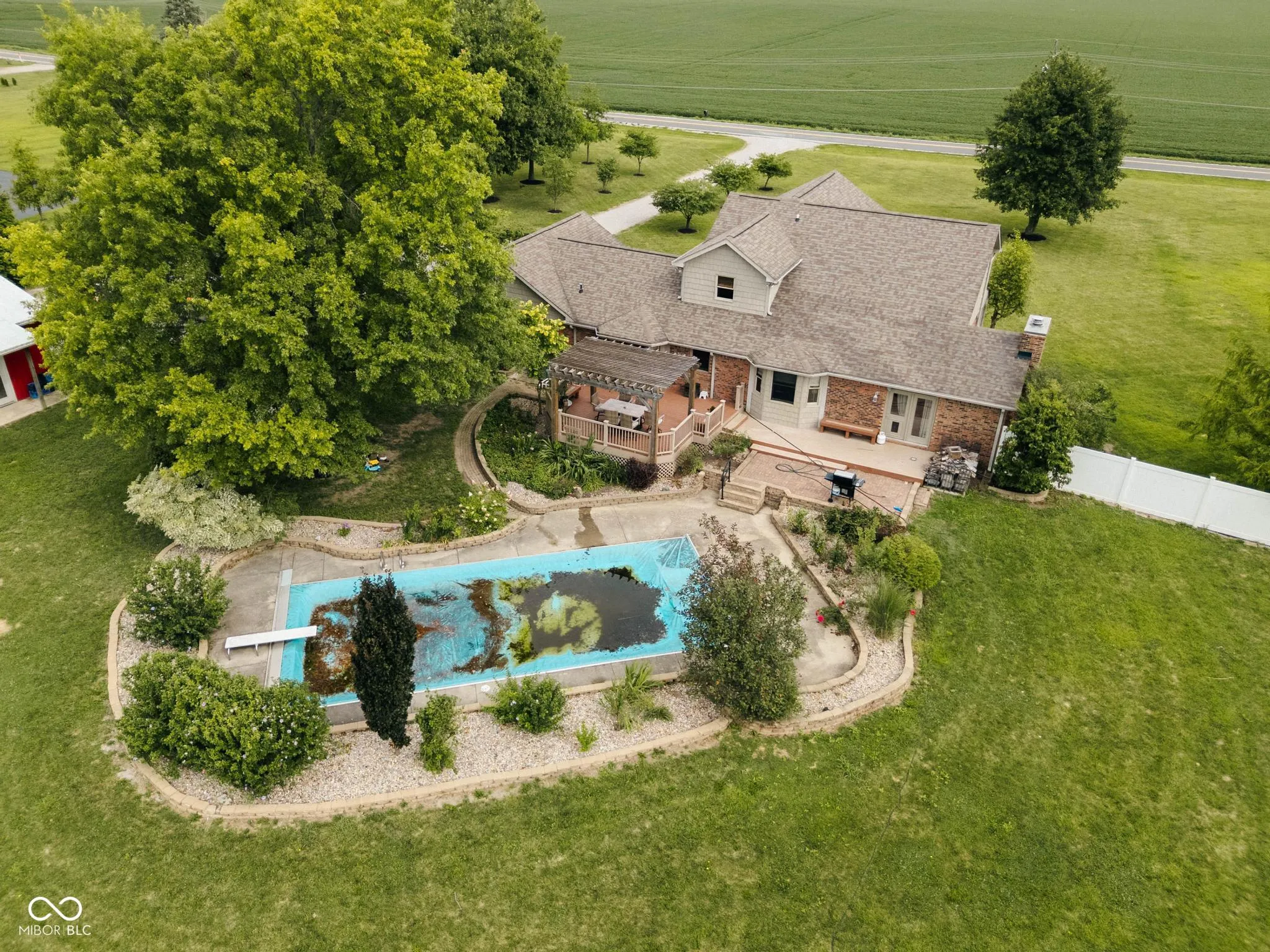 Nestled at 1841 W 200 N, GREENFIELD, IN, in the heart of Hancock County, this single-family residence presents an attractive property in great condition. The kitchen is truly a culinary dream, featuring shaker cabinets adorned with crown molding, stone countertops complemented by a beautiful backsplash, and a large kitchen island perfect for gathering. The double oven stands ready to bake delicious treats, while the stovetop promises the creation of memorable meals, all easily served from the kitchen bar. The living room offers a sanctuary of comfort and style, with a fireplace that will create a cozy atmosphere, while the vaulted ceiling and high ceiling add a sense of grandeur, enhanced by elegant crown molding. The bathroom is designed as a private retreat, featuring a double vanity for convenience, a tiled walk in shower for a refreshing start to the day, and a tile tub for soothing relaxation. The bedroom is finished with crown molding. This property boasts a wealth of outdoor living spaces including a porch, deck, patio, and pergola, along with a private pool for refreshing swims, perfect for enjoying the rural area surrounding the home, including an outdoor dining area. With 2830 square feet of living space on a generous 5 acre lot, this two-story residence, built in 1986, has four bedrooms, two full bathrooms, and one half bathroom. Seize the opportunity to experience a lifestyle of comfort and relaxation in this Greenfield gem.