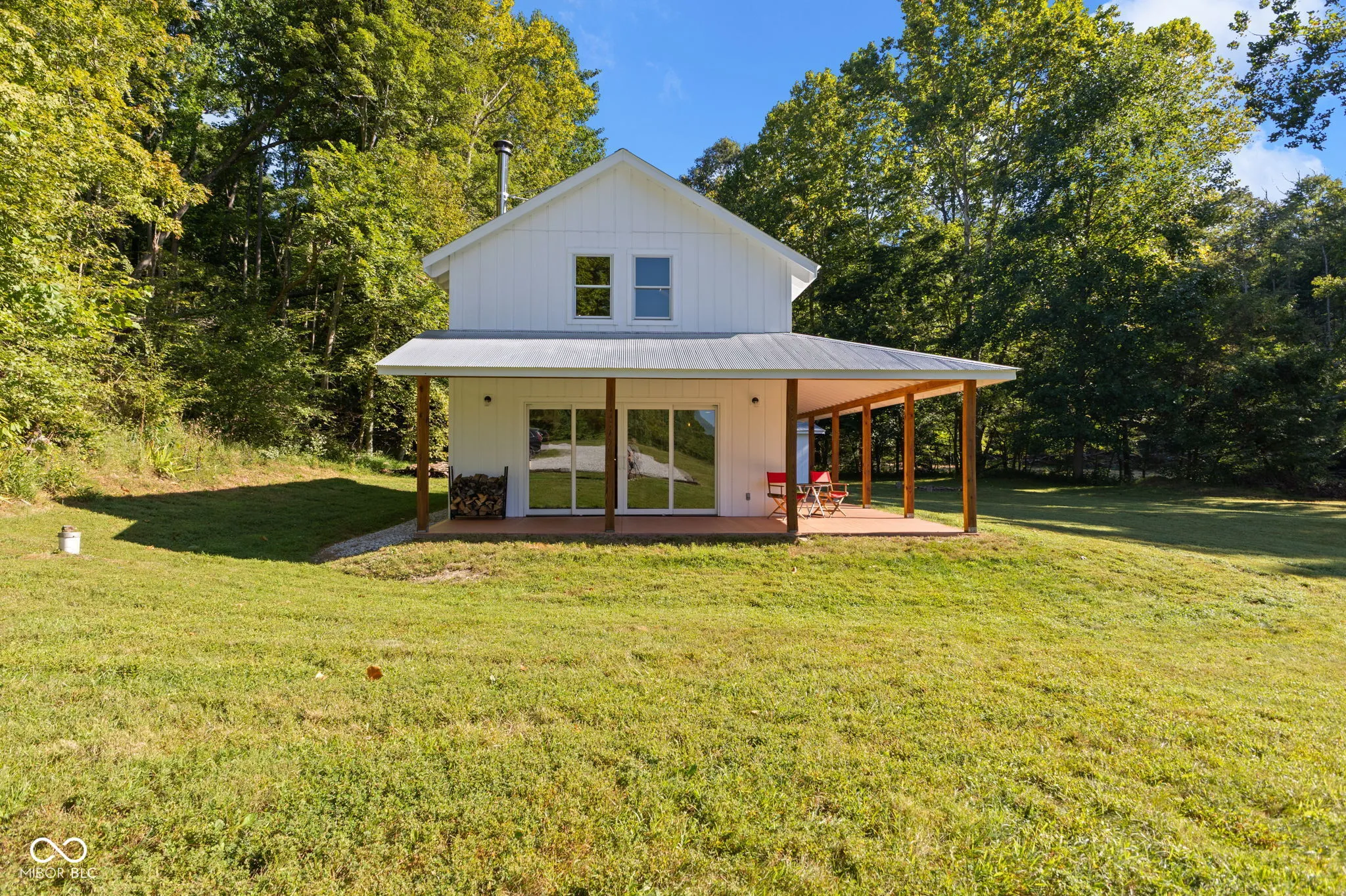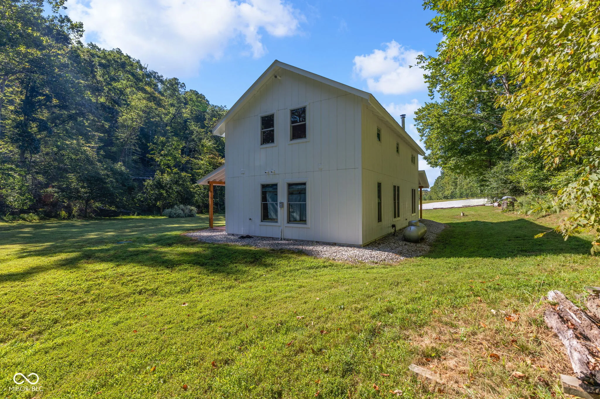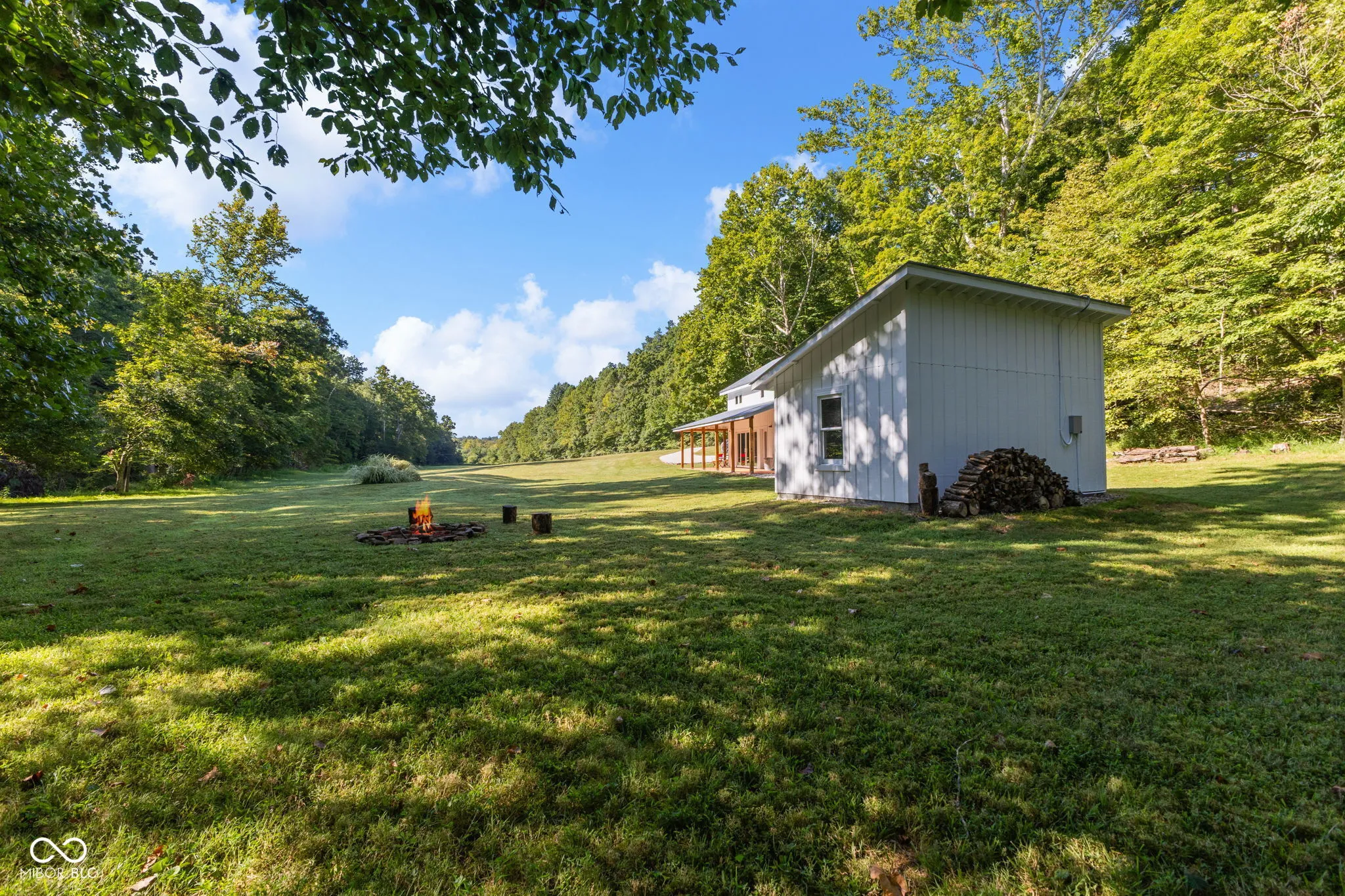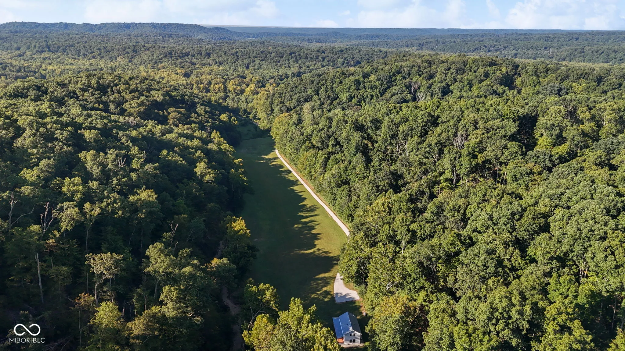 Truly One-of-a-Kind Brown County oasis. This 44 acre property, bordered on all sides by protected public forestland, features a custom-designed off-grid cabin set in a beautifully manicured valley surrounded by wooded hills. Located in the heart of Indiana’s largest contiguous hardwood forest and far from neighbors, this serene property includes 37 acres of tax-saving classified hardwood forest and 7 acres of field and meadow. It borders Brown County State Park on the east and north, Hoosier National Forest on the west, and the Army Corps of Engineers (Lake Monroe Fee Line) on the south. A seasonal creek runs the length of the property. The property offers abundant wildlife, and the area offers endless recreational opportunities for naturalists, adventurers, and sportsmen. Trails for horseback riding, hiking, and mountain biking are in close proximity as is Salt Creek for fishing, kayaking, or navigating to Lake Monroe. Access is via a .3 mi drive (formally an unmaintained county road) across the Army Corps land. If desired, electric/fiber internet from Jackson Co REMC is available at the edge of Blue Creek Road. The roughly 1000 sq.ft. cabin was architect-designed and custom-built in 2019, and is as sweet and immaculate as it is private. It is modern yet warm, energy efficient, off-grid, solar-powered, and low-maintenance. It has a 240 sq.ft. storage shed, a deep-well, a septic system, and a wrap-around porch with breath-taking views down the valley. The views are just as nice from inside the open living room/dining area looking out the two sets of Pella 4-panel sliding patio doors. The room’s woodstove and high pine-paneled cathedral ceiling provide a dramatic yet comfy contrast. With one bedroom, a roomy loft/studio, small kitchen with island, and a full bath, this cabin makes for a perfect family wilderness retreat.