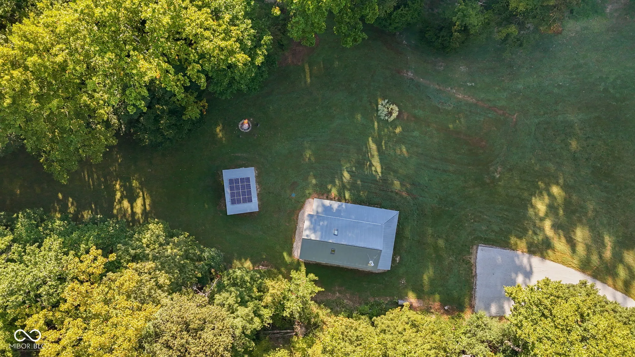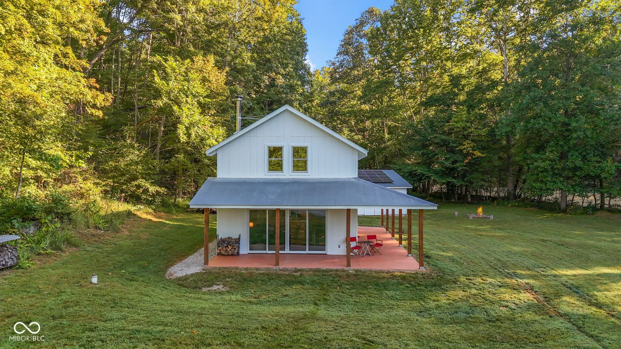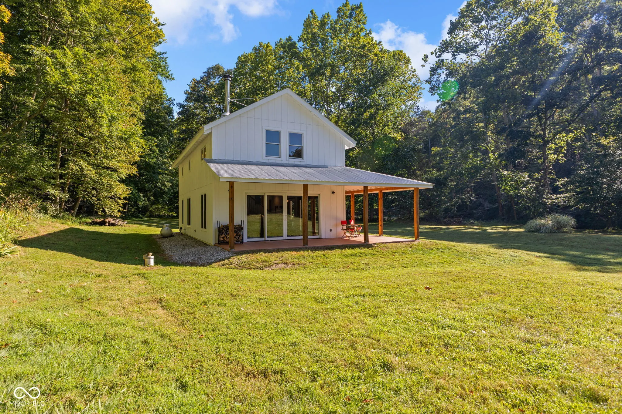 Truly One-of-a-Kind Brown County oasis. This 44 acre property, bordered on all sides by protected public forestland, features a custom-designed off-grid cabin set in a beautifully manicured valley surrounded by wooded hills. Located in the heart of Indiana’s largest contiguous hardwood forest and far from neighbors, this serene property includes 37 acres of tax-saving classified hardwood forest and 7 acres of field and meadow. It borders Brown County State Park on the east and north, Hoosier National Forest on the west, and the Army Corps of Engineers (Lake Monroe Fee Line) on the south. A seasonal creek runs the length of the property. The property offers abundant wildlife, and the area offers endless recreational opportunities for naturalists, adventurers, and sportsmen. Trails for horseback riding, hiking, and mountain biking are in close proximity as is Salt Creek for fishing, kayaking, or navigating to Lake Monroe. Access is via a .3 mi drive (formally an unmaintained county road) across the Army Corps land. If desired, electric/fiber internet from Jackson Co REMC is available at the edge of Blue Creek Road. The roughly 1000 sq.ft. cabin was architect-designed and custom-built in 2019, and is as sweet and immaculate as it is private. It is modern yet warm, energy efficient, off-grid, solar-powered, and low-maintenance. It has a 240 sq.ft. storage shed, a deep-well, a septic system, and a wrap-around porch with breath-taking views down the valley. The views are just as nice from inside the open living room/dining area looking out the two sets of Pella 4-panel sliding patio doors. The room’s woodstove and high pine-paneled cathedral ceiling provide a dramatic yet comfy contrast. With one bedroom, a roomy loft/studio, small kitchen with island, and a full bath, this cabin makes for a perfect family wilderness retreat.