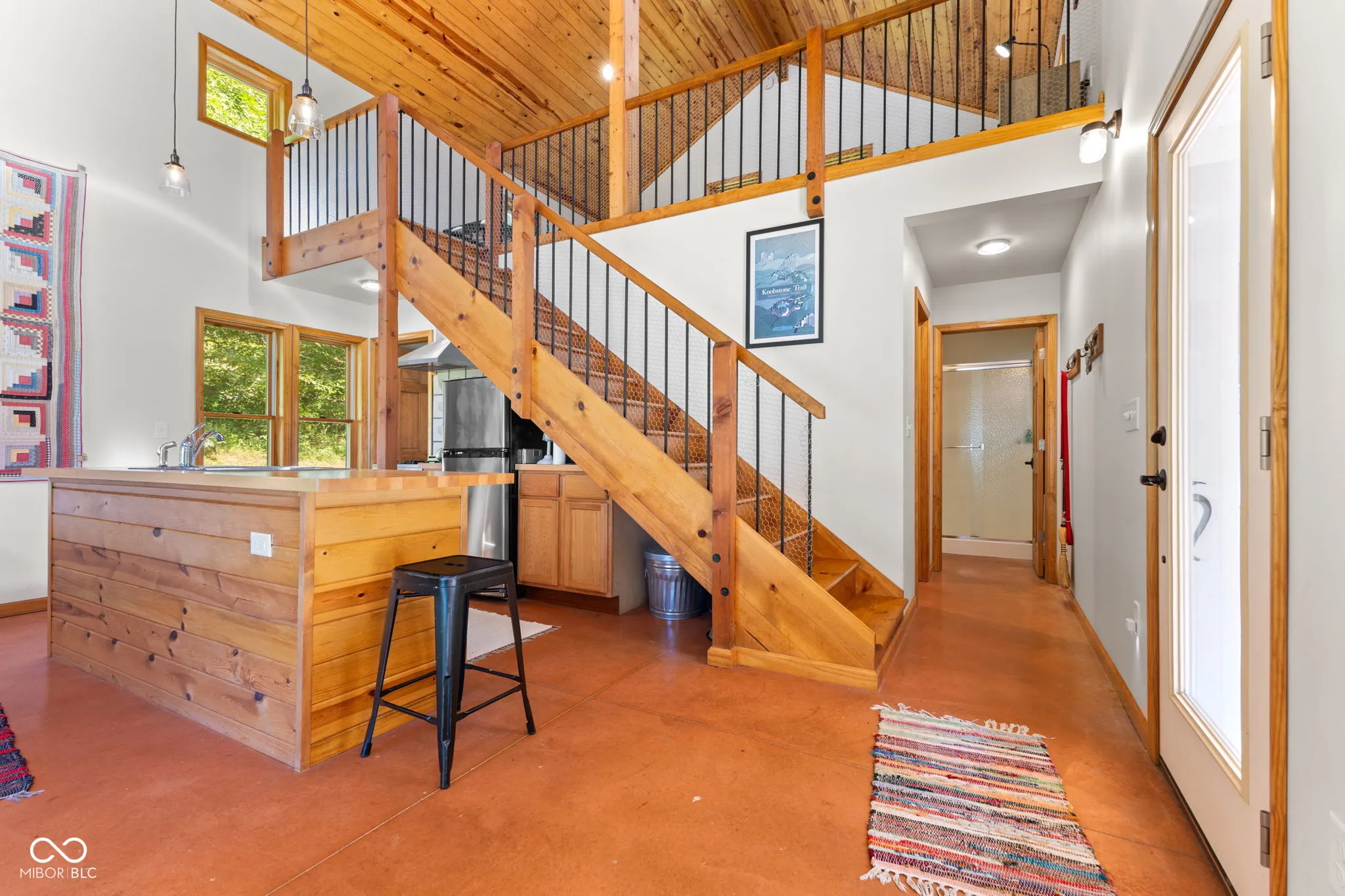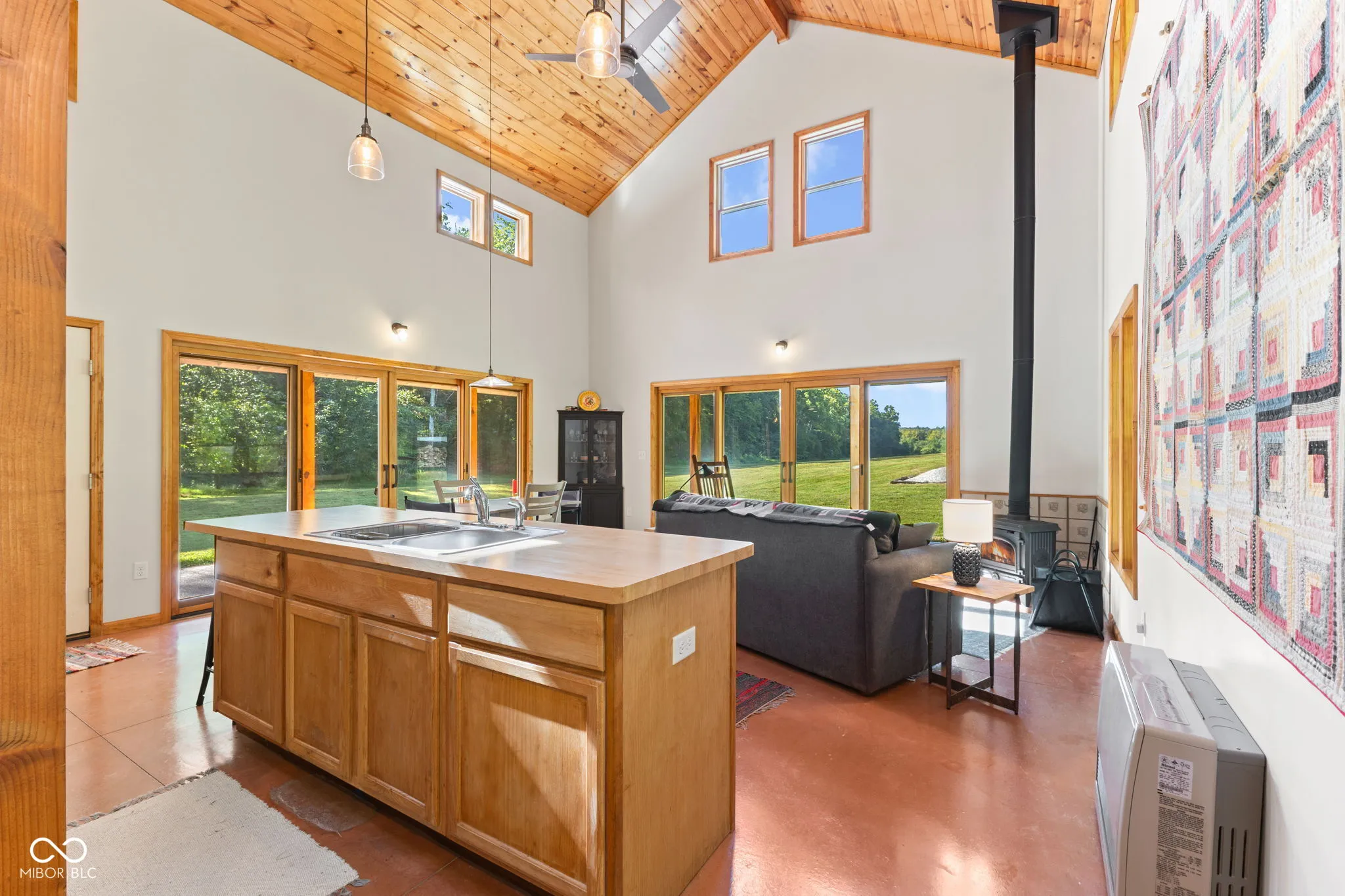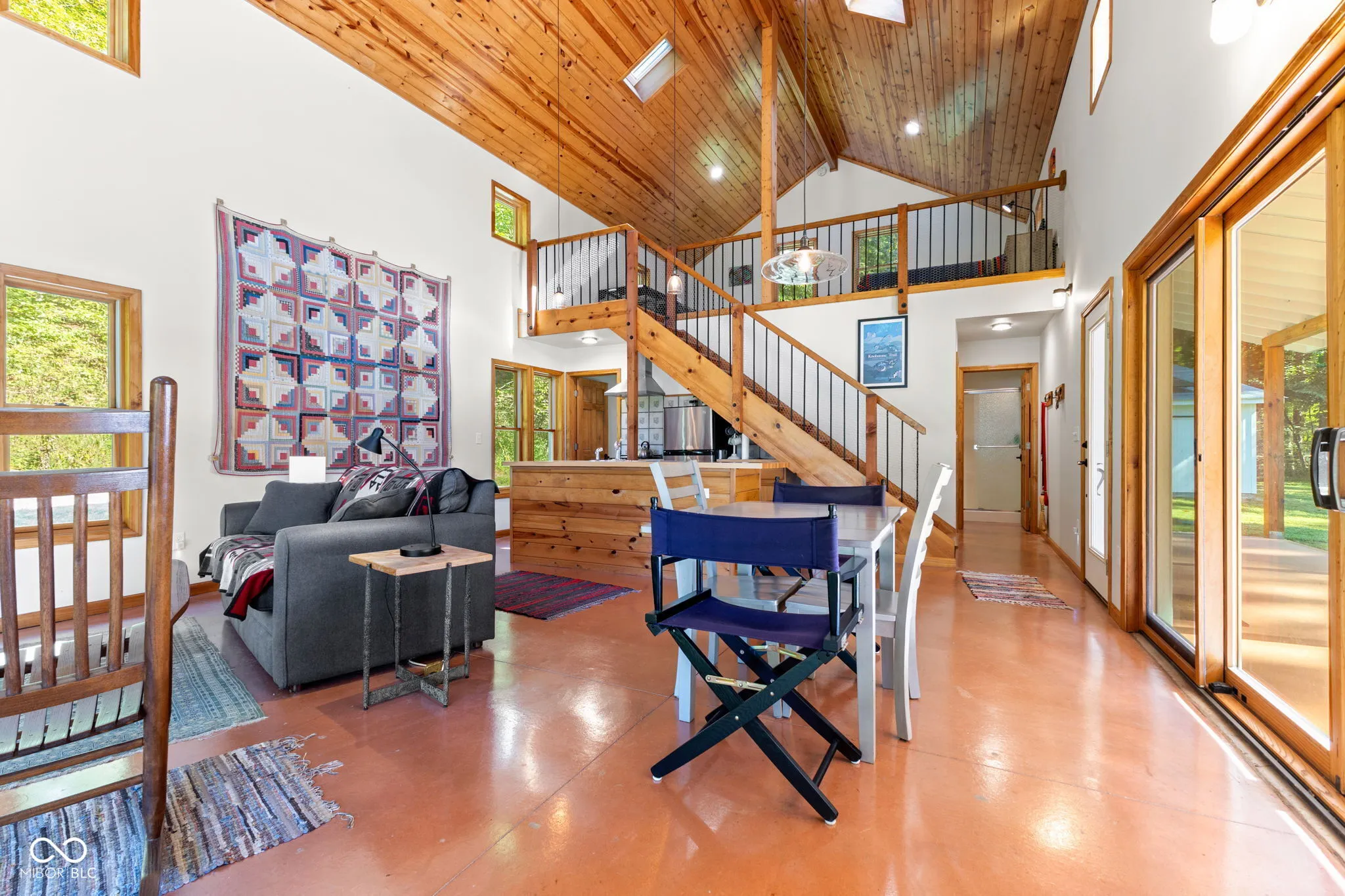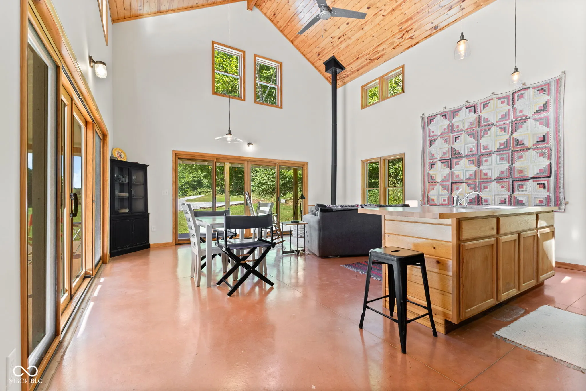 Truly One-of-a-Kind Brown County oasis. This 44 acre property, bordered on all sides by protected public forestland, features a custom-designed off-grid cabin set in a beautifully manicured valley surrounded by wooded hills. Located in the heart of Indiana’s largest contiguous hardwood forest and far from neighbors, this serene property includes 37 acres of tax-saving classified hardwood forest and 7 acres of field and meadow. It borders Brown County State Park on the east and north, Hoosier National Forest on the west, and the Army Corps of Engineers (Lake Monroe Fee Line) on the south. A seasonal creek runs the length of the property. The property offers abundant wildlife, and the area offers endless recreational opportunities for naturalists, adventurers, and sportsmen. Trails for horseback riding, hiking, and mountain biking are in close proximity as is Salt Creek for fishing, kayaking, or navigating to Lake Monroe. Access is via a .3 mi drive (formally an unmaintained county road) across the Army Corps land. If desired, electric/fiber internet from Jackson Co REMC is available at the edge of Blue Creek Road. The roughly 1000 sq.ft. cabin was architect-designed and custom-built in 2019, and is as sweet and immaculate as it is private. It is modern yet warm, energy efficient, off-grid, solar-powered, and low-maintenance. It has a 240 sq.ft. storage shed, a deep-well, a septic system, and a wrap-around porch with breath-taking views down the valley. The views are just as nice from inside the open living room/dining area looking out the two sets of Pella 4-panel sliding patio doors. The room’s woodstove and high pine-paneled cathedral ceiling provide a dramatic yet comfy contrast. With one bedroom, a roomy loft/studio, small kitchen with island, and a full bath, this cabin makes for a perfect family wilderness retreat.