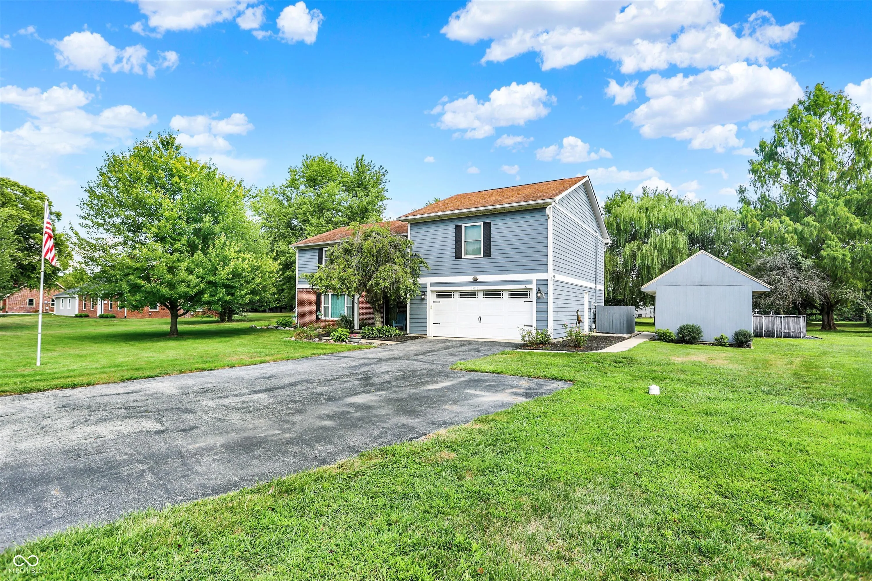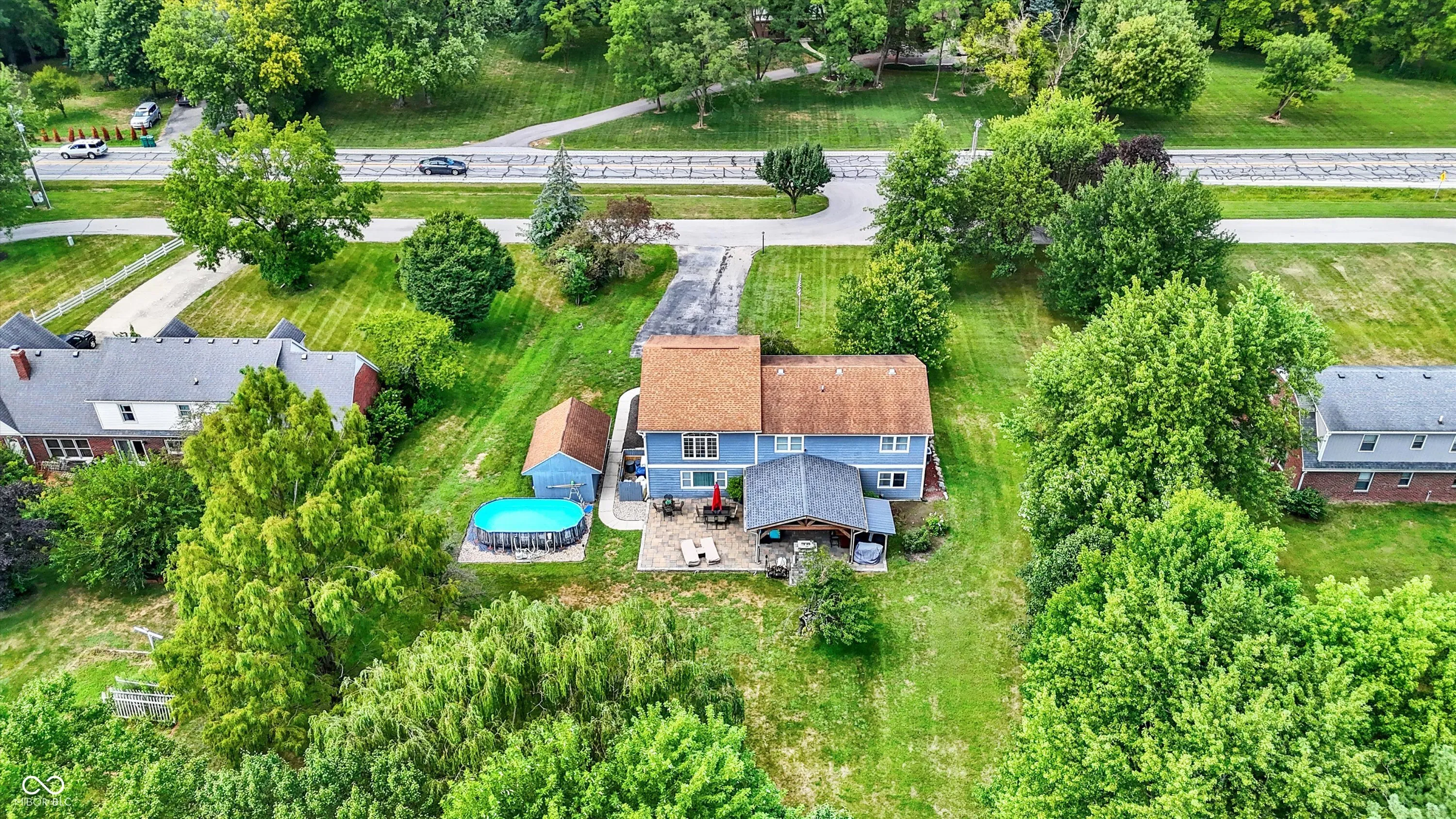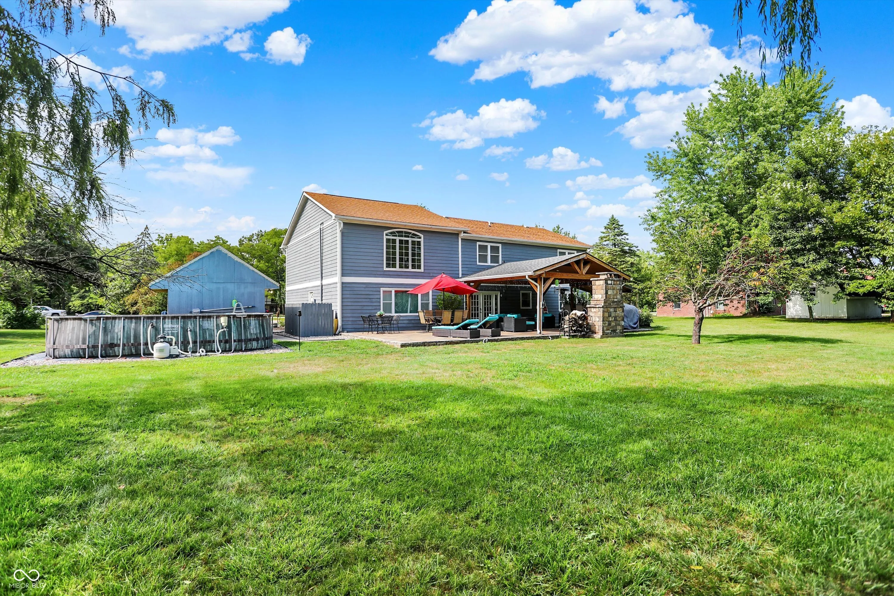 One-of-a-kind property offering privacy and scenery yet convenient to SR 37 / 32 Corridor on almost an acre lot! You’ll love the backyard oasis with cathedral ceiling covered paver patio featuring free-standing wood burning fireplace, built-in tv, bar and multiple seating areas creating a welcoming outdoor living space. Bright and open kitchen features white cabinets, stainless steel appliances, Carrera marble backsplash, separate coffee bar, solid surface countertops and peninsula island. Main floor offers two gathering spaces – great for when friends and family gather. Upstairs you’ll find expansive primary suite with sitting area, walk-in closet and bath with glass door walk-in shower and dual vanities. Three additional spacious bedrooms (one en suite) and full hall bath complete the upstairs. Other amenities include above ground pool, great for late summer/fall cooldown, and storage shed with 100 amp sub panel perfect for a workshop. Refrigerator, washer and dryer included.