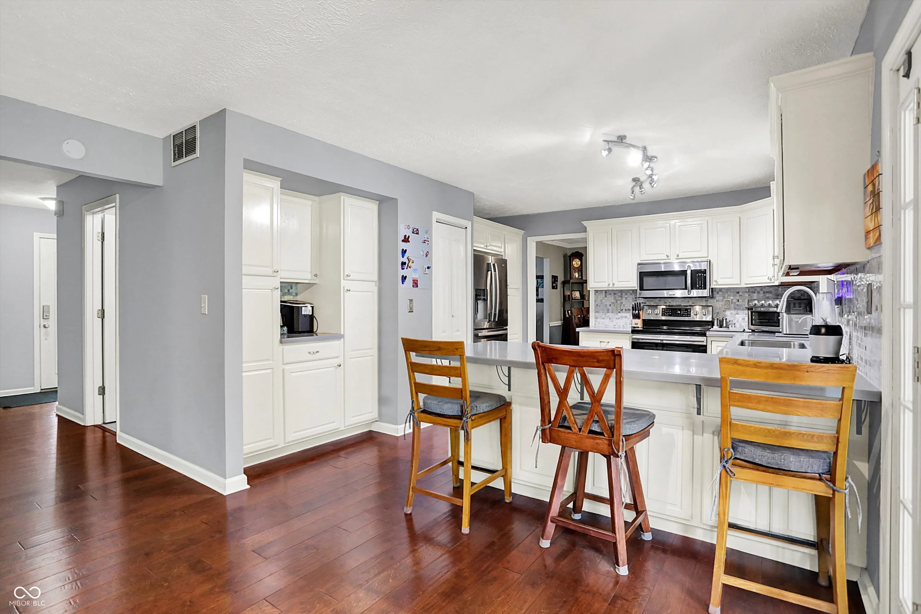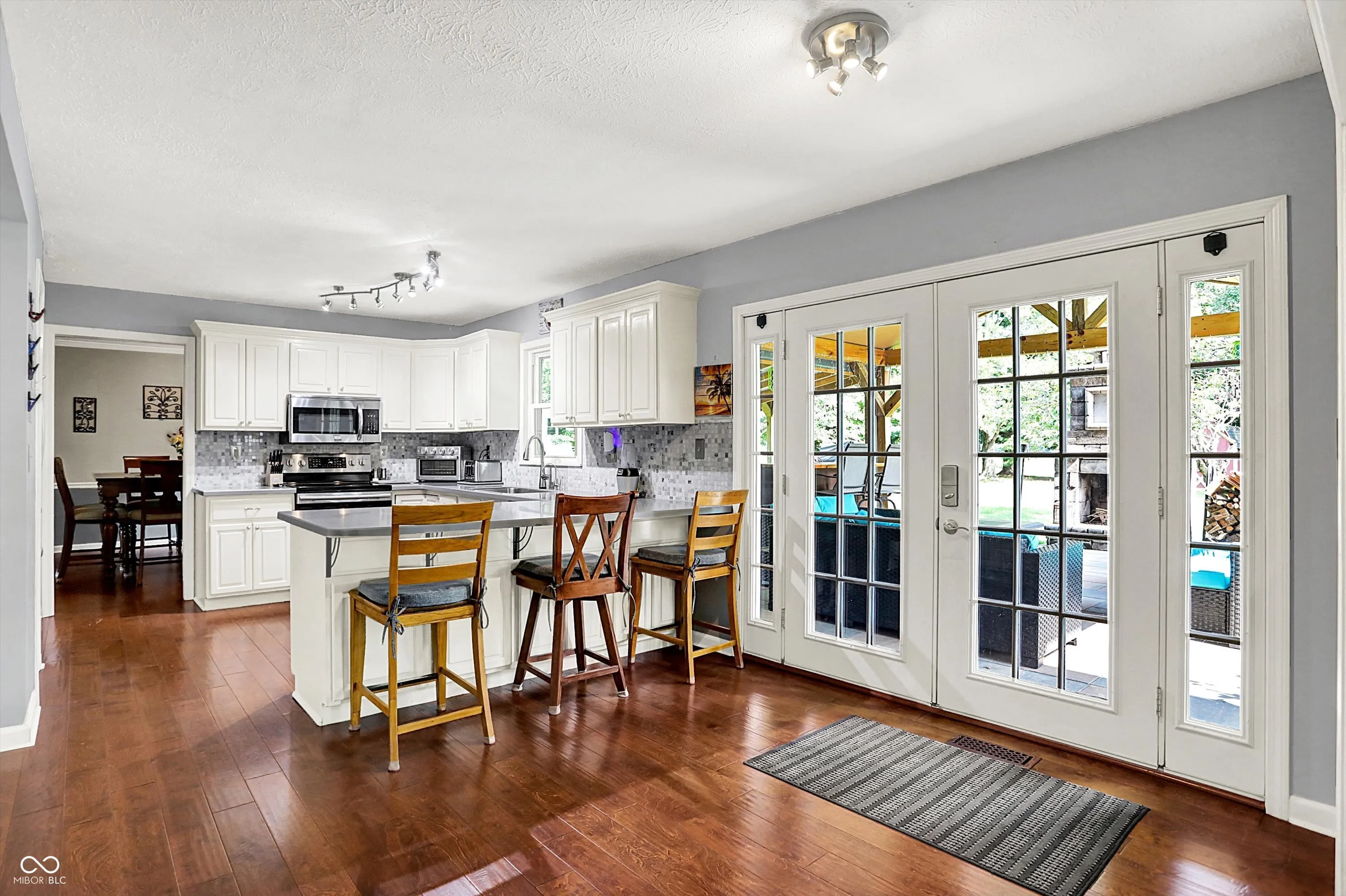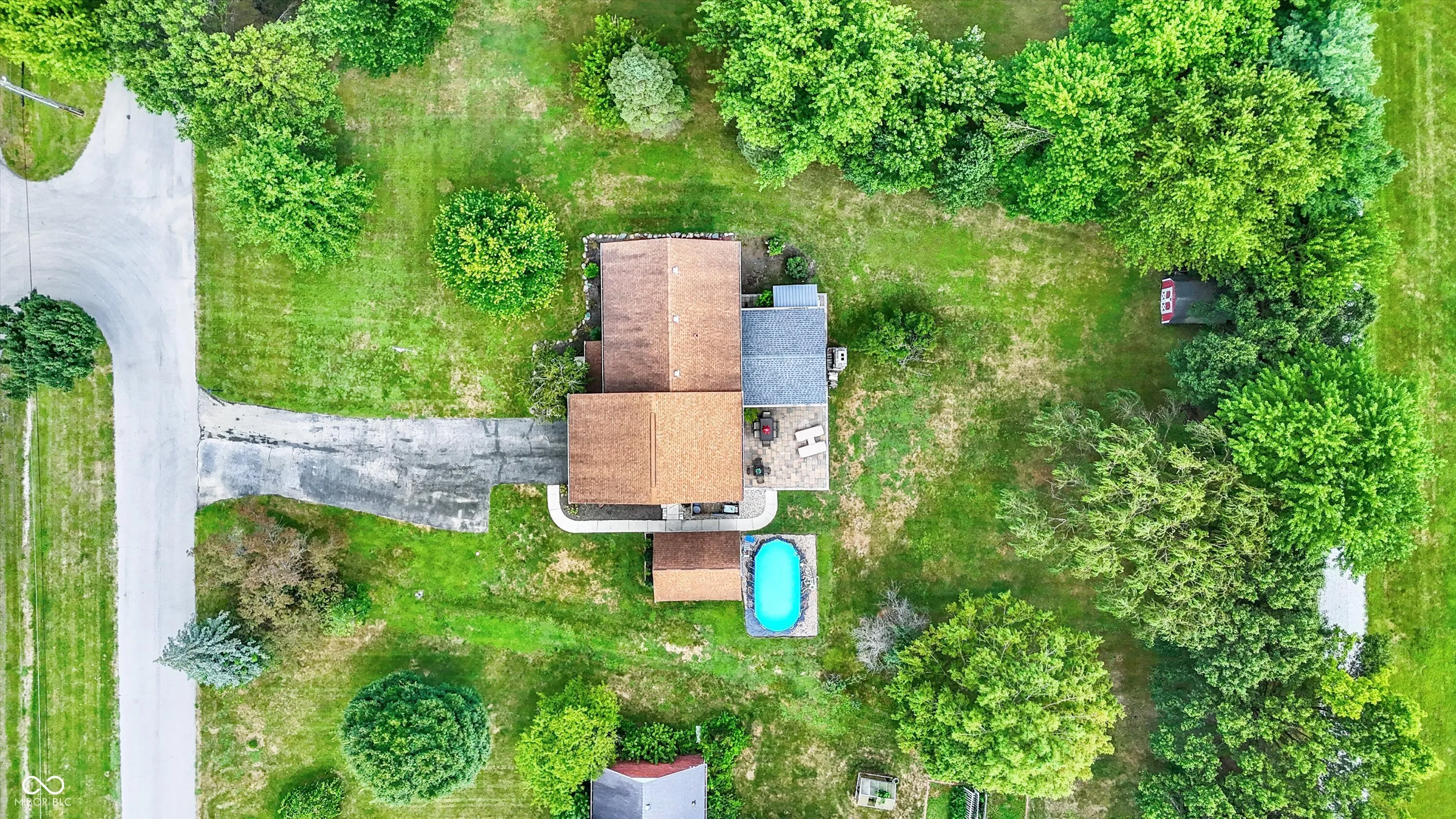 One-of-a-kind property offering privacy and scenery yet convenient to SR 37 / 32 Corridor on almost an acre lot! You’ll love the backyard oasis with cathedral ceiling covered paver patio featuring free-standing wood burning fireplace, built-in tv, bar and multiple seating areas creating a welcoming outdoor living space. Bright and open kitchen features white cabinets, stainless steel appliances, Carrera marble backsplash, separate coffee bar, solid surface countertops and peninsula island. Main floor offers two gathering spaces – great for when friends and family gather. Upstairs you’ll find expansive primary suite with sitting area, walk-in closet and bath with glass door walk-in shower and dual vanities. Three additional spacious bedrooms (one en suite) and full hall bath complete the upstairs. Other amenities include above ground pool, great for late summer/fall cooldown, and storage shed with 100 amp sub panel perfect for a workshop. Refrigerator, washer and dryer included.