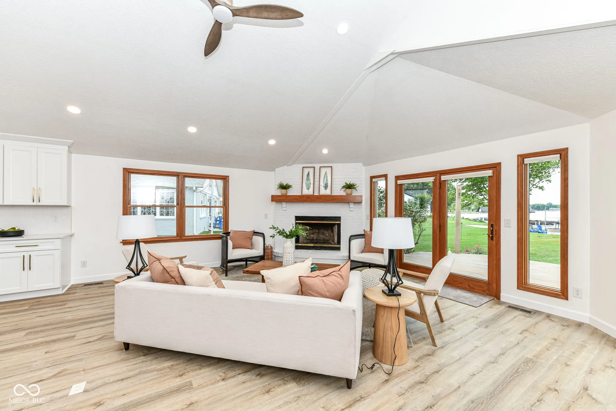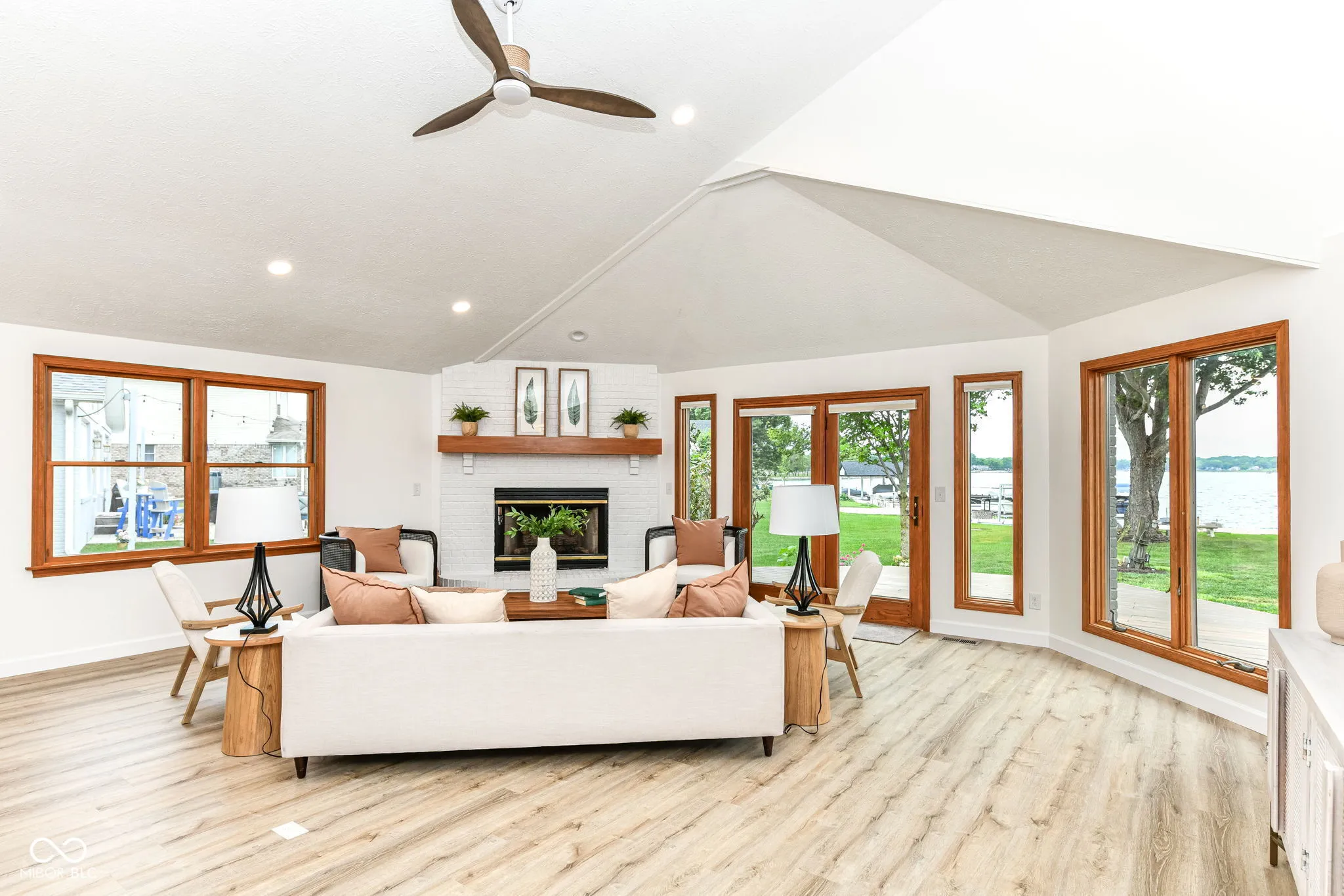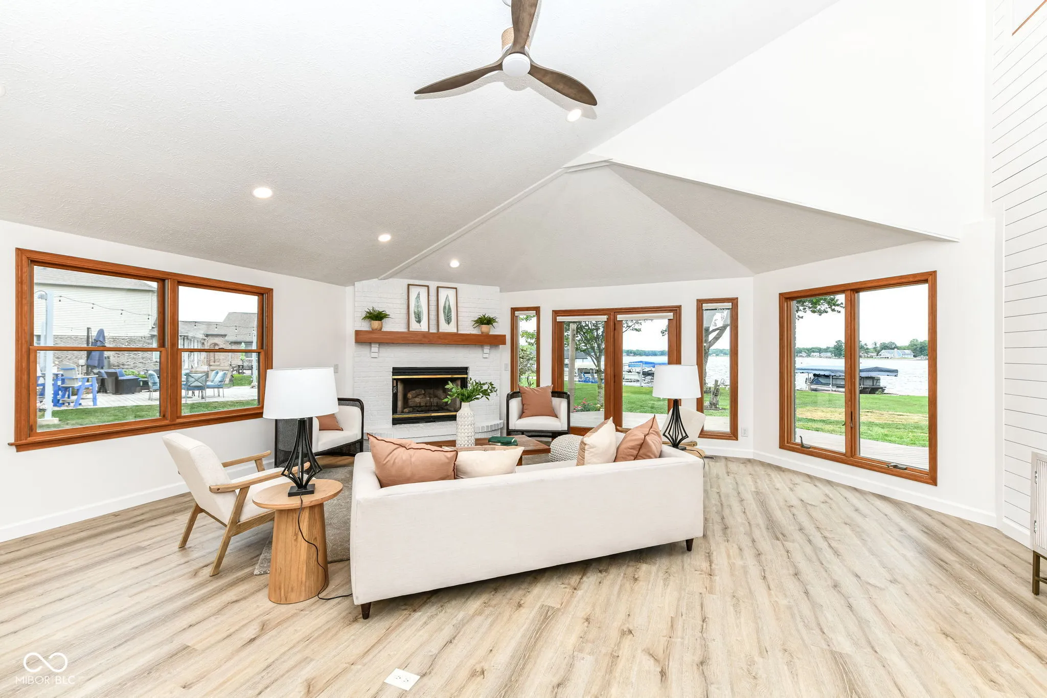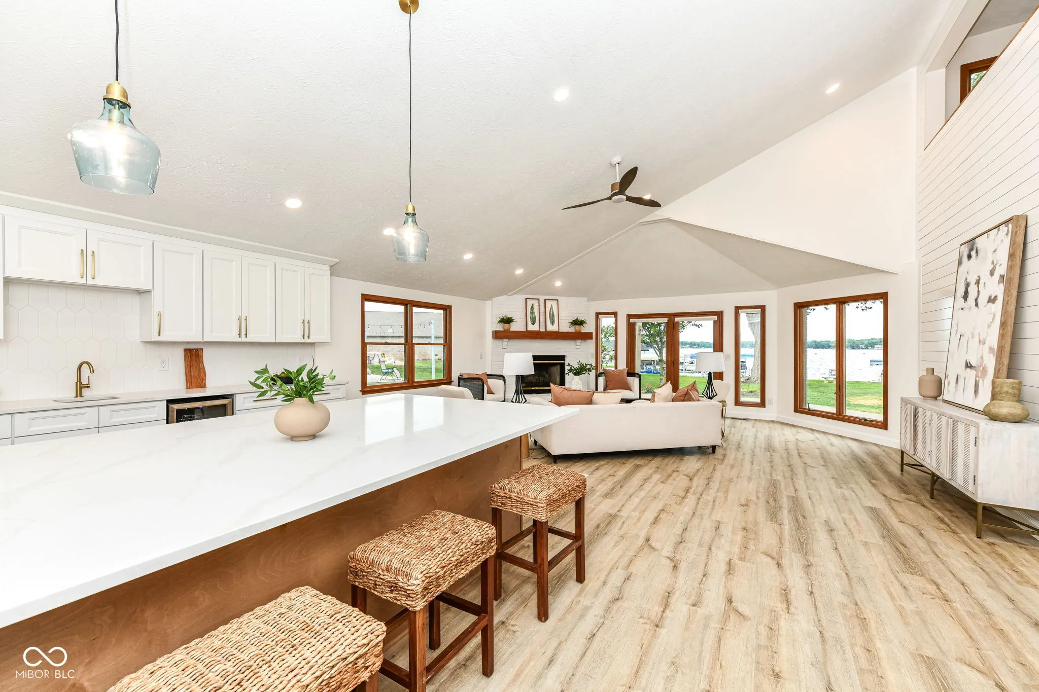 This spectacular Heritage Lake home offers some of the best views on the water and has been completely transformed into a modern luxury retreat – every inch of this property has been thoughtfully reimagined and upgraded. Outside, new cement board siding, fresh exterior paint, and striking new double front doors that invite natural light into the home. Step inside, and the grand entryway welcomes you with a custom built-in storage bench perfectly blending beauty and function.Prepare to be awed as you enter the open-concept great room and kitchen. The kitchen is a true showpiece-featuring brand-new cabinetry, quartz countertops, luxury Cafe appliances, a stunning backsplash, and a custom 9-foot island that seats up to eight, eliminating the need for a formal dining table. Additional cabinetry extends into the dining area, offering a wet bar with wine cooler and abundant storage. A dramatic two-story shiplap accent wall brings in that signature lakehome charm. The floor plan is as functional as it is beautiful, with two bedrooms on the main level and two additional bedrooms plus a spacious loft upstairs. The primary suite offers private deck access, allowing you to walk straight to your boat dock. Its en suite bath has been fully reimagined with a custom tiled walk-in shower featuring a transom window for natural light, dual vanities strategically placed for maximum space, and a generous walk-in closet. A newly added full guest bath on the main level is convenient for both the 2nd bedroom and lake visitors-complete with a clever design that allows guests to enter from the laundry area, keeping lake traffic out of the main living space. Upstairs, 2 large bdrms, a full bath, and a loft provide the perfect retreat for guests, a second TV area/recreational space. One of the home’s rarest and most coveted features is its flat, walk-out yard to the water-no stairs between the house and the dock. This property perfectly blends luxury, comfort, and effortless lake living.