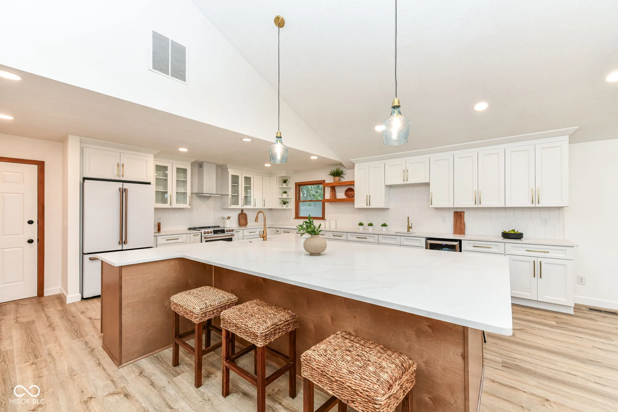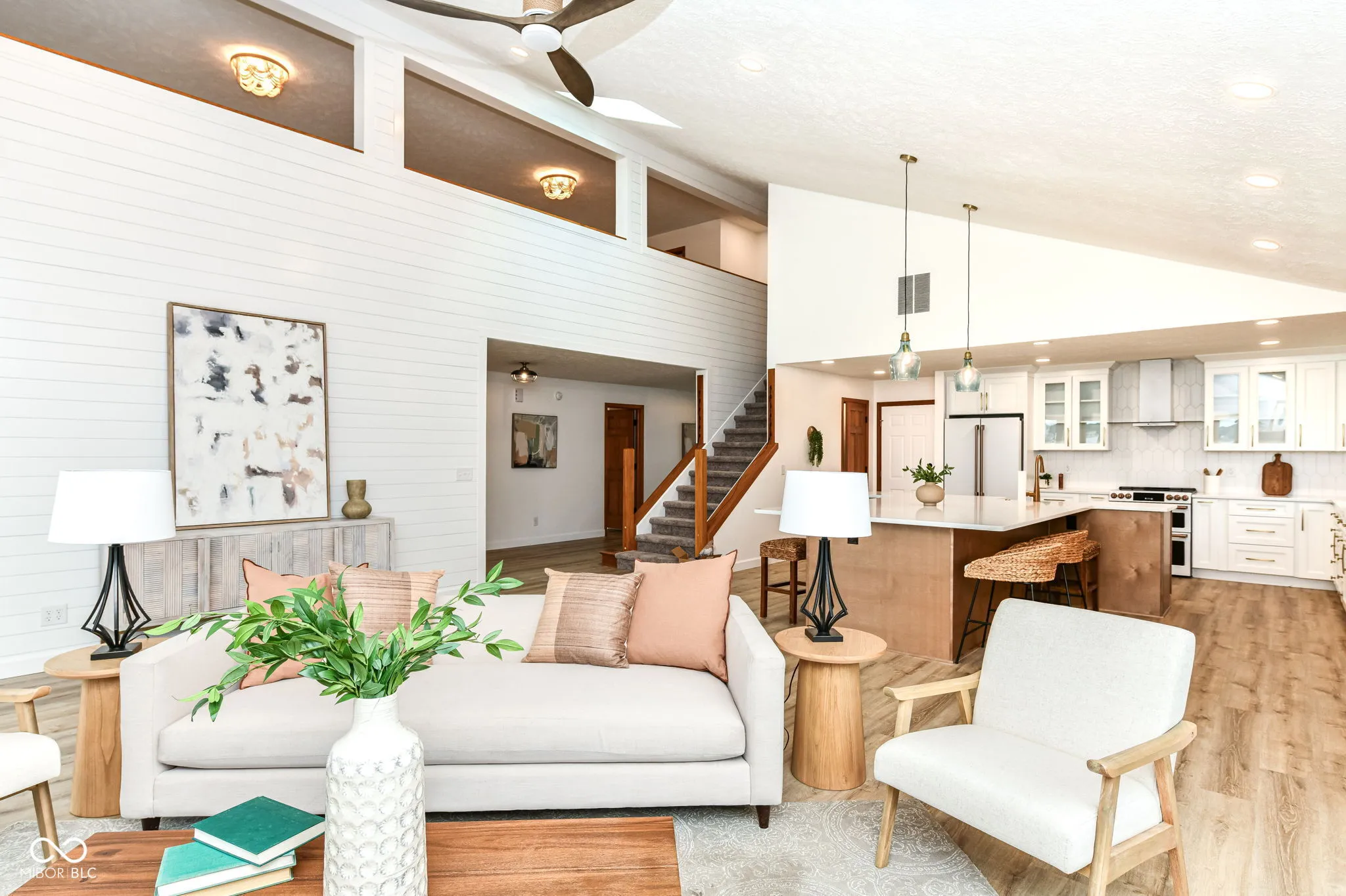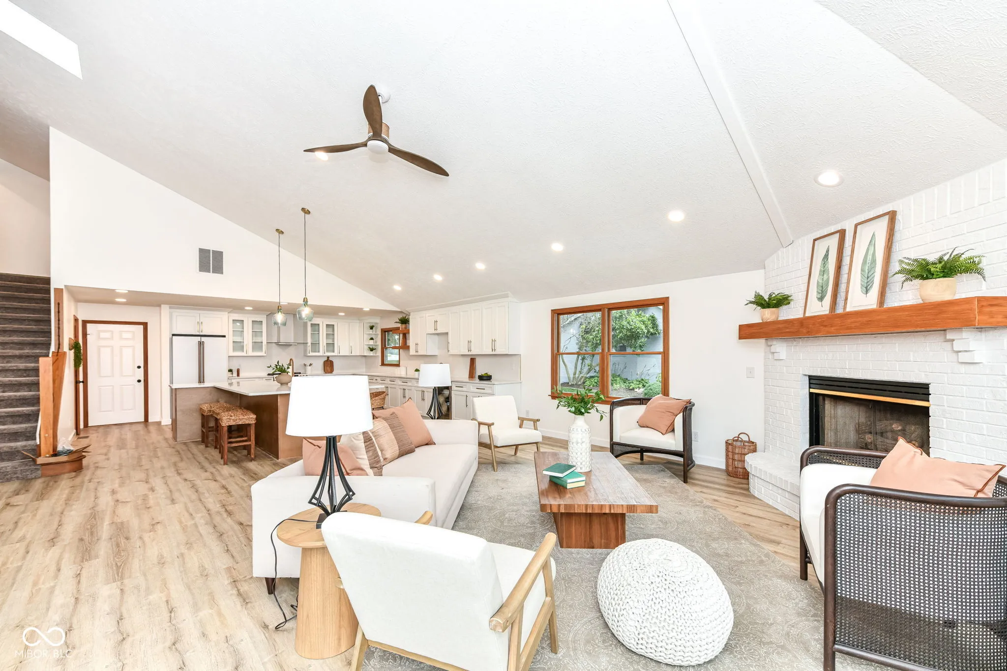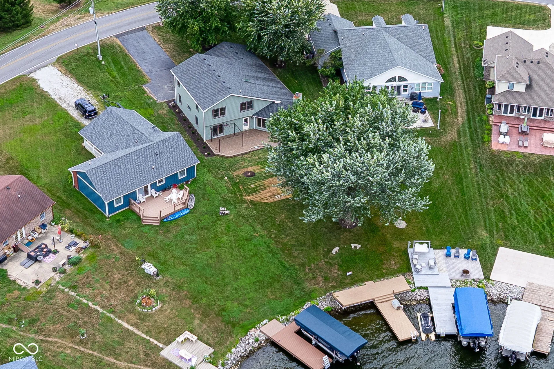 This spectacular Heritage Lake home offers some of the best views on the water and has been completely transformed into a modern luxury retreat – every inch of this property has been thoughtfully reimagined and upgraded. Outside, new cement board siding, fresh exterior paint, and striking new double front doors that invite natural light into the home. Step inside, and the grand entryway welcomes you with a custom built-in storage bench perfectly blending beauty and function.Prepare to be awed as you enter the open-concept great room and kitchen. The kitchen is a true showpiece-featuring brand-new cabinetry, quartz countertops, luxury Cafe appliances, a stunning backsplash, and a custom 9-foot island that seats up to eight, eliminating the need for a formal dining table. Additional cabinetry extends into the dining area, offering a wet bar with wine cooler and abundant storage. A dramatic two-story shiplap accent wall brings in that signature lakehome charm. The floor plan is as functional as it is beautiful, with two bedrooms on the main level and two additional bedrooms plus a spacious loft upstairs. The primary suite offers private deck access, allowing you to walk straight to your boat dock. Its en suite bath has been fully reimagined with a custom tiled walk-in shower featuring a transom window for natural light, dual vanities strategically placed for maximum space, and a generous walk-in closet. A newly added full guest bath on the main level is convenient for both the 2nd bedroom and lake visitors-complete with a clever design that allows guests to enter from the laundry area, keeping lake traffic out of the main living space. Upstairs, 2 large bdrms, a full bath, and a loft provide the perfect retreat for guests, a second TV area/recreational space. One of the home’s rarest and most coveted features is its flat, walk-out yard to the water-no stairs between the house and the dock. This property perfectly blends luxury, comfort, and effortless lake living.