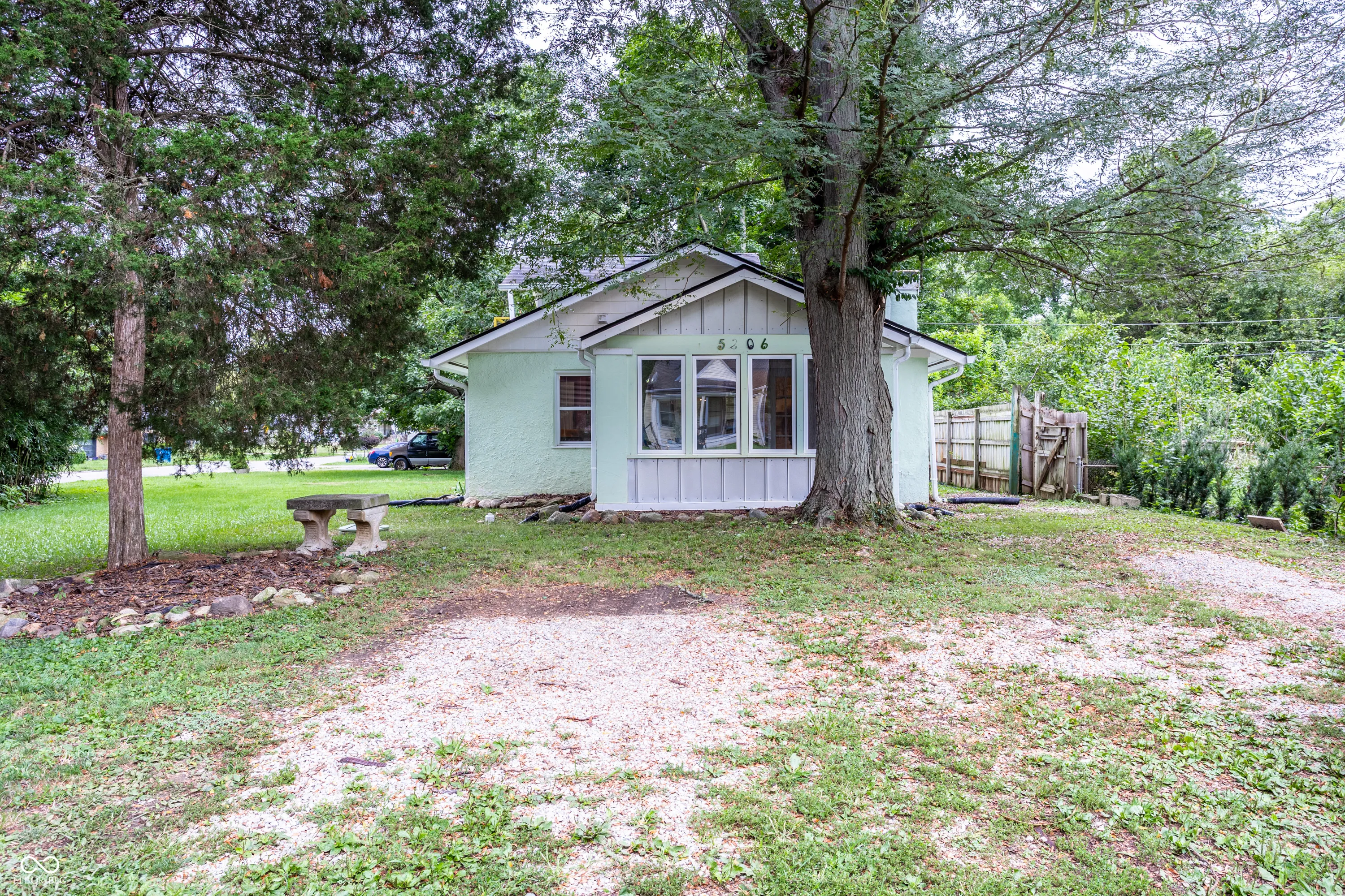 Welcome to your ultimate Rocky Ripple retreat, where bohemian chic meets urban oasis. This charming 2-bedroom, 2-bath bungalow is situated on a double lot and offers an inviting open-concept floor plan with soaring vaulted ceilings that fill the home with light and character. The upper-level artist studio/loft is a true highlight-complete with its own private balcony, perfect for inspiration or relaxation. Outside, enjoy the serenity of a double lot with a large yard, plus an oversized screened-in porch that seamlessly blends indoor and outdoor living. Tucked away in the vibrant Rocky Ripple neighborhood, this one-of-a-kind bungalow captures the essence of creative living while keeping you close to the city’s best amenities. A rare find for those who crave style, space, and soul.