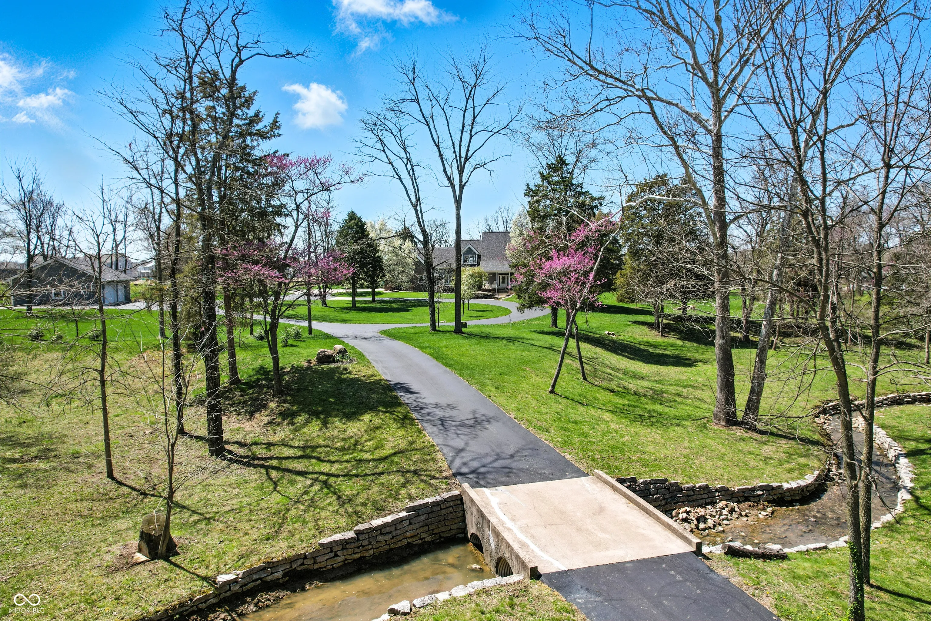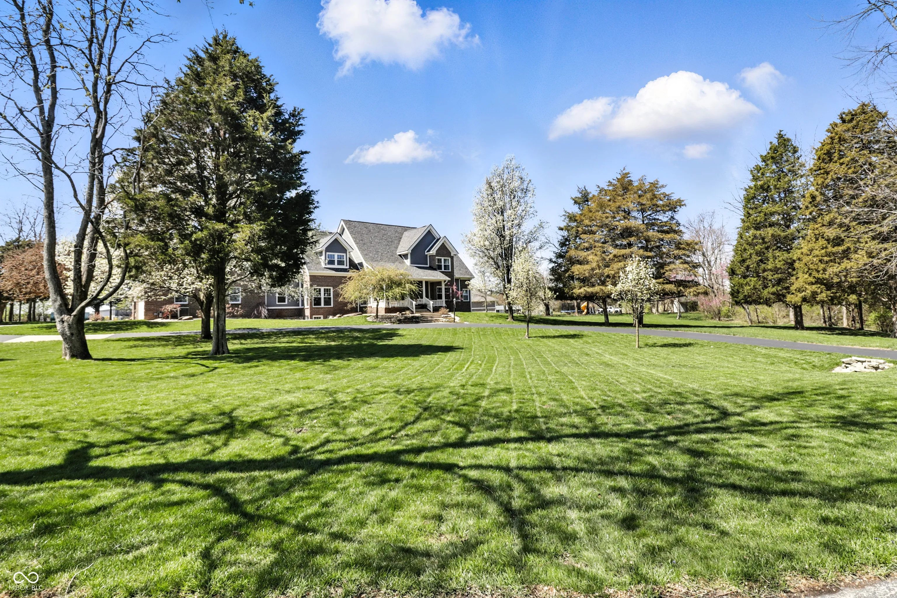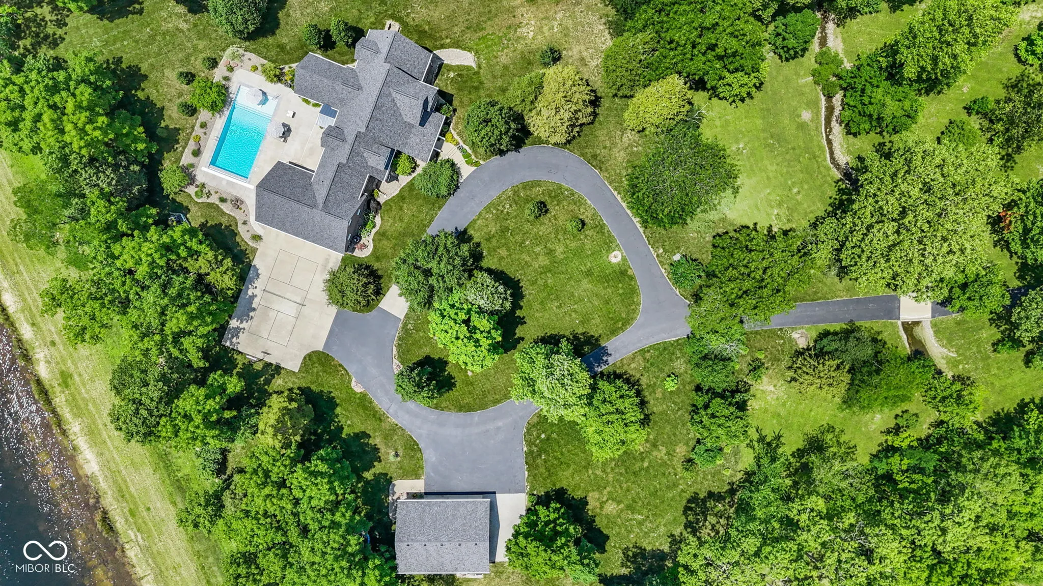 Breathtaking beauty meets luxury. Set on over 5 serene acres, this 6 bed/4 full bath home with walkout basement boasts over 7,000 square feet. Outdoor amenities include a newly re-finished 18×38 heated inground pool with electric cover, large screened-in porch with outdoor tv, pickleball/basketball court, 30×40 outbuilding with 3 garage bays, and a paved driveway leading over the peaceful stream to the beautiful estate. Main level features master bedroom, laundry room/pantry, 2 full bathrooms, home office, and two gas fireplaces. Upper level features 3 bedrooms, a full bathroom, and a large bonus room. Walkout basement features 2 bedrooms, a full bathroom, full kitchen, and large living space, all of which can easily serve as an in-law quarters. New in 2024: roof and double oven. New in 2023: pool and pool deck renovation, 2 furnaces, and A/C units. New in 2022: engineered hardwood flooring, epoxy garage flooring, pantry/laundry room, pool heater, upper level shower, both dishwashers.
