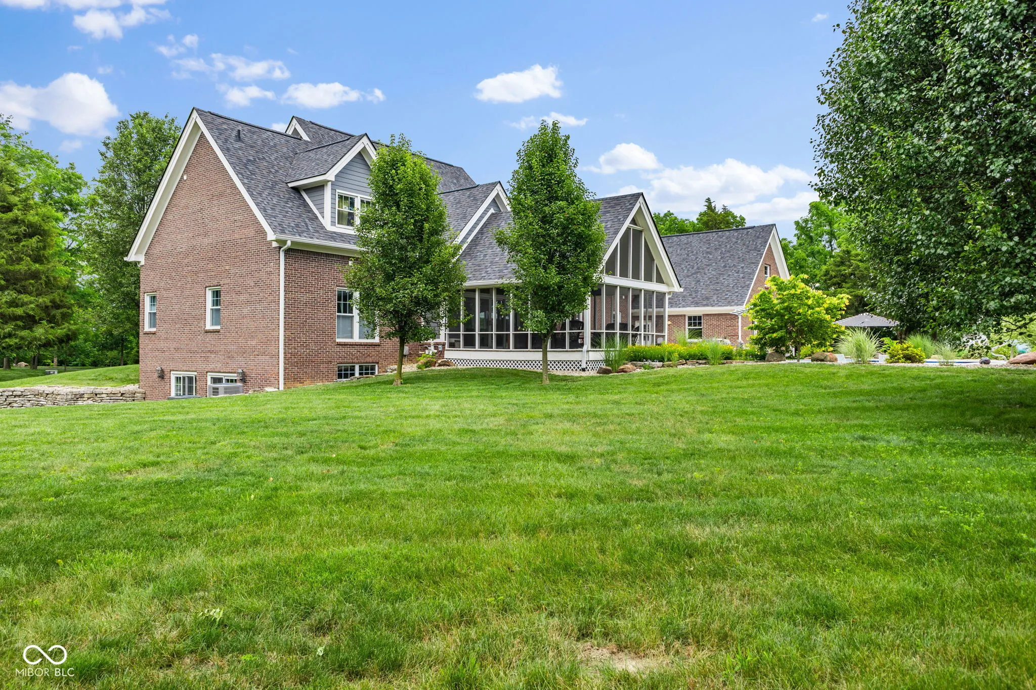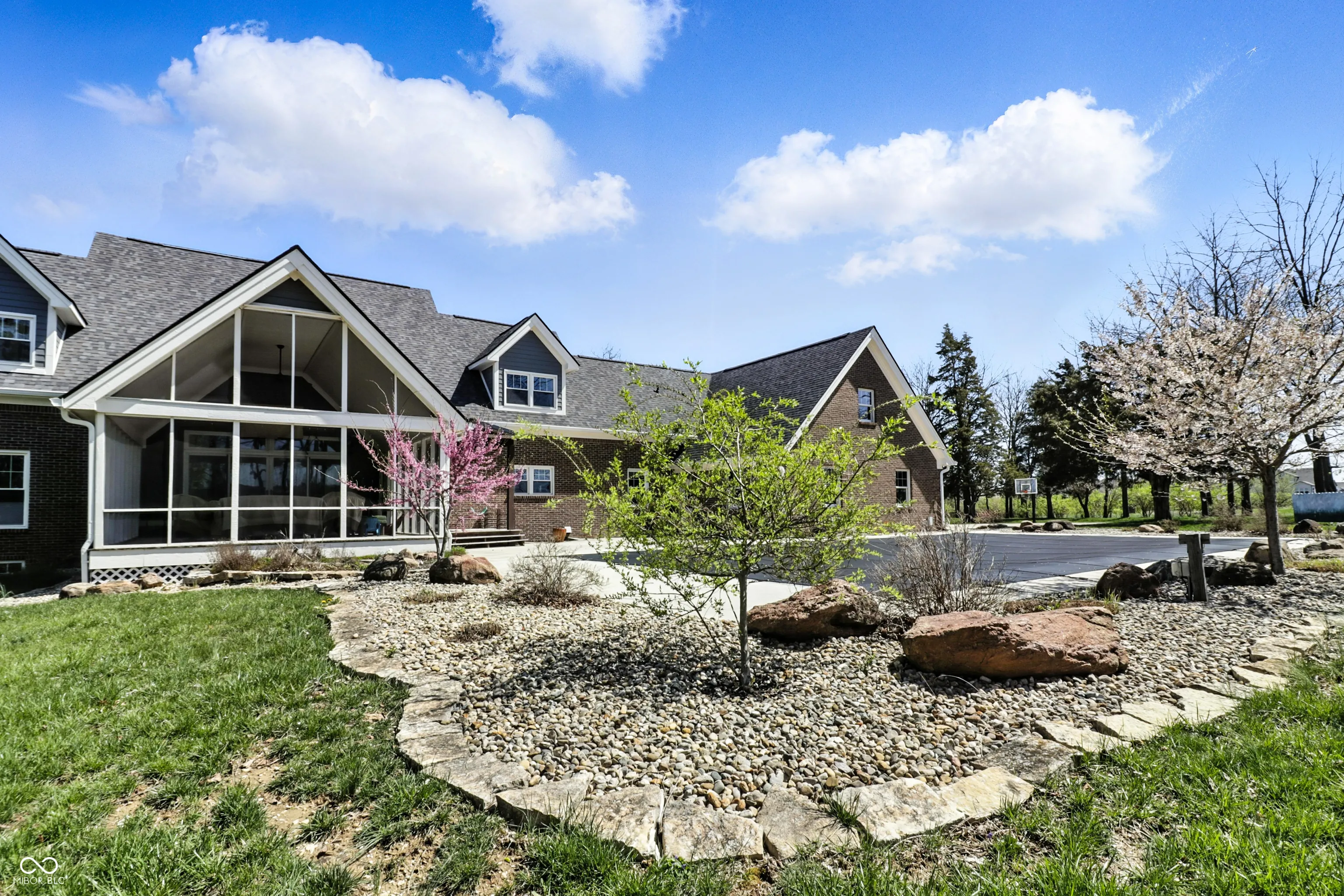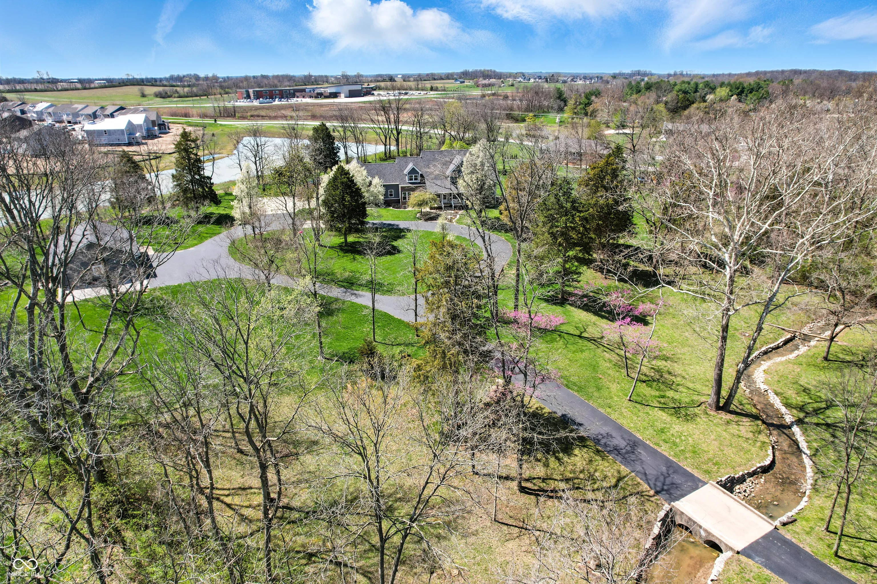 Breathtaking beauty meets luxury. Set on over 5 serene acres, this 6 bed/4 full bath home with walkout basement boasts over 7,000 square feet. Outdoor amenities include a newly re-finished 18×38 heated inground pool with electric cover, large screened-in porch with outdoor tv, pickleball/basketball court, 30×40 outbuilding with 3 garage bays, and a paved driveway leading over the peaceful stream to the beautiful estate. Main level features master bedroom, laundry room/pantry, 2 full bathrooms, home office, and two gas fireplaces. Upper level features 3 bedrooms, a full bathroom, and a large bonus room. Walkout basement features 2 bedrooms, a full bathroom, full kitchen, and large living space, all of which can easily serve as an in-law quarters. New in 2024: roof and double oven. New in 2023: pool and pool deck renovation, 2 furnaces, and A/C units. New in 2022: engineered hardwood flooring, epoxy garage flooring, pantry/laundry room, pool heater, upper level shower, both dishwashers.
