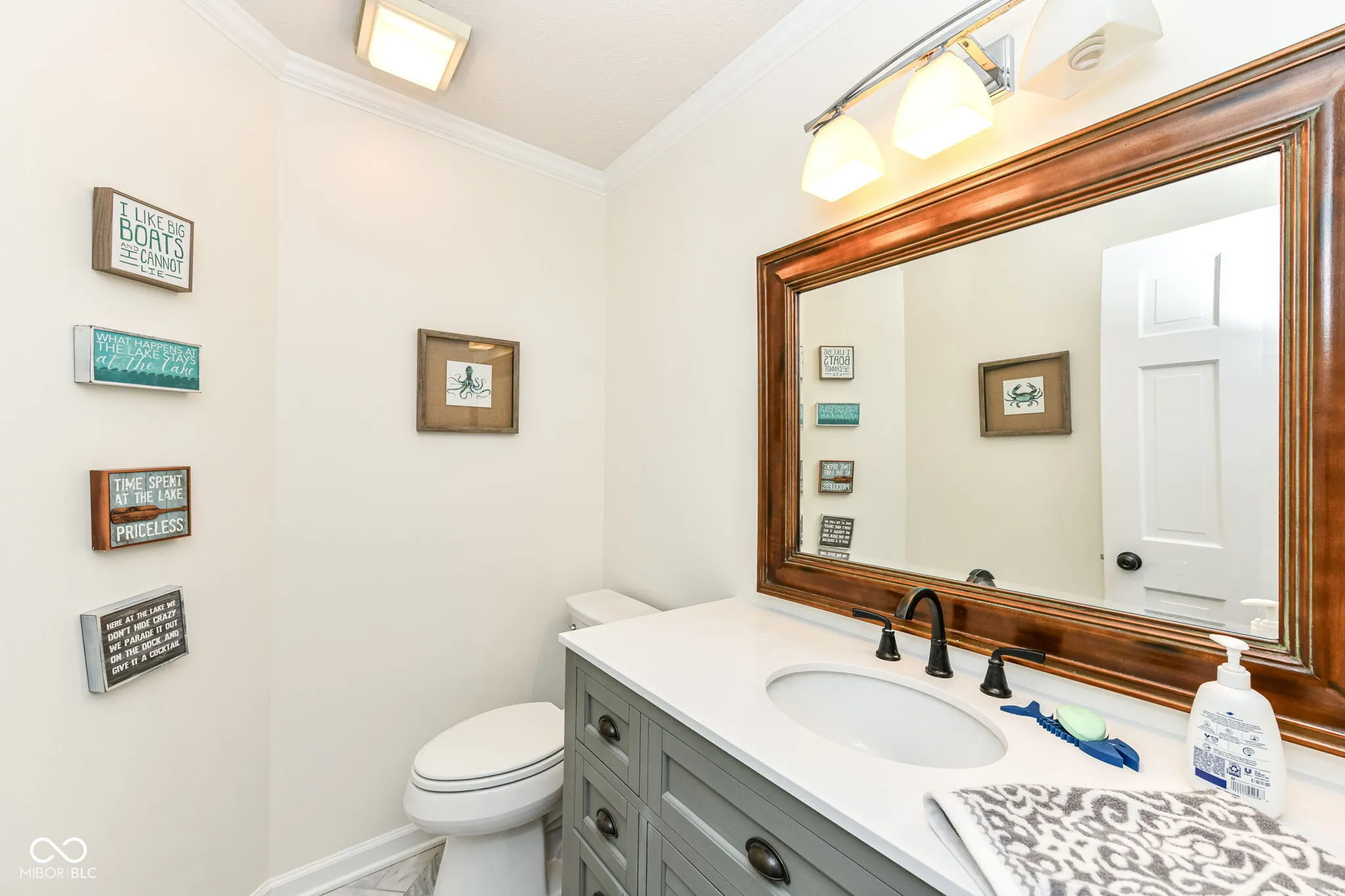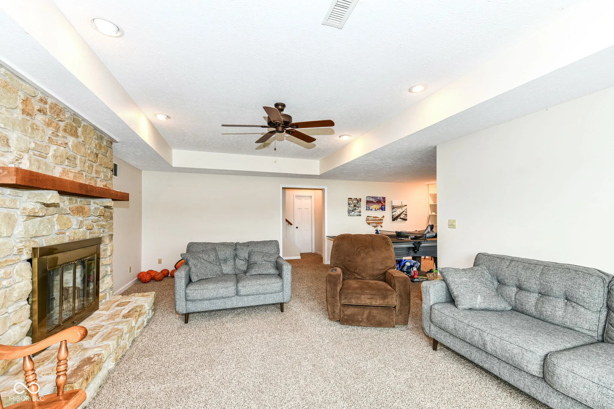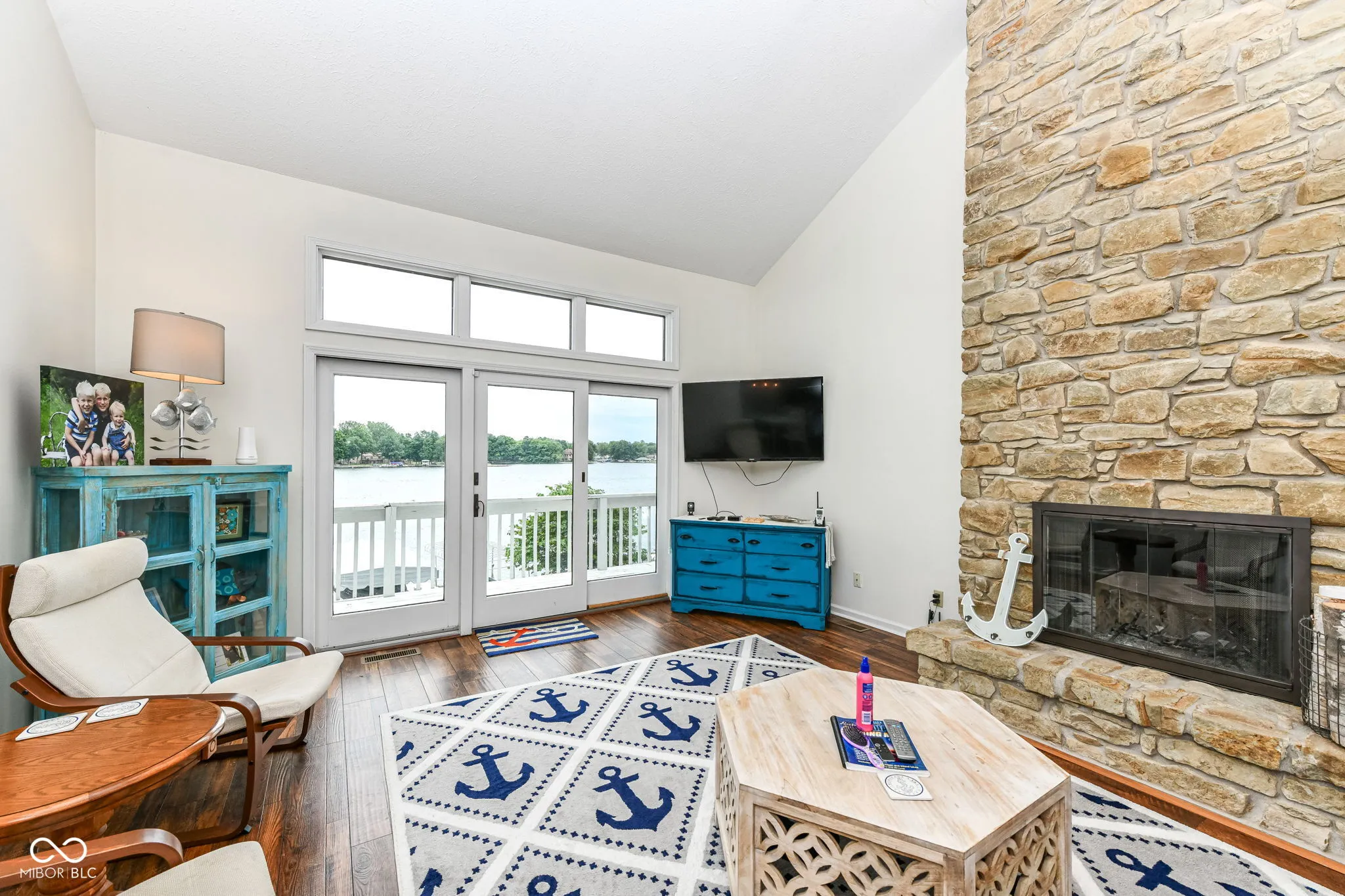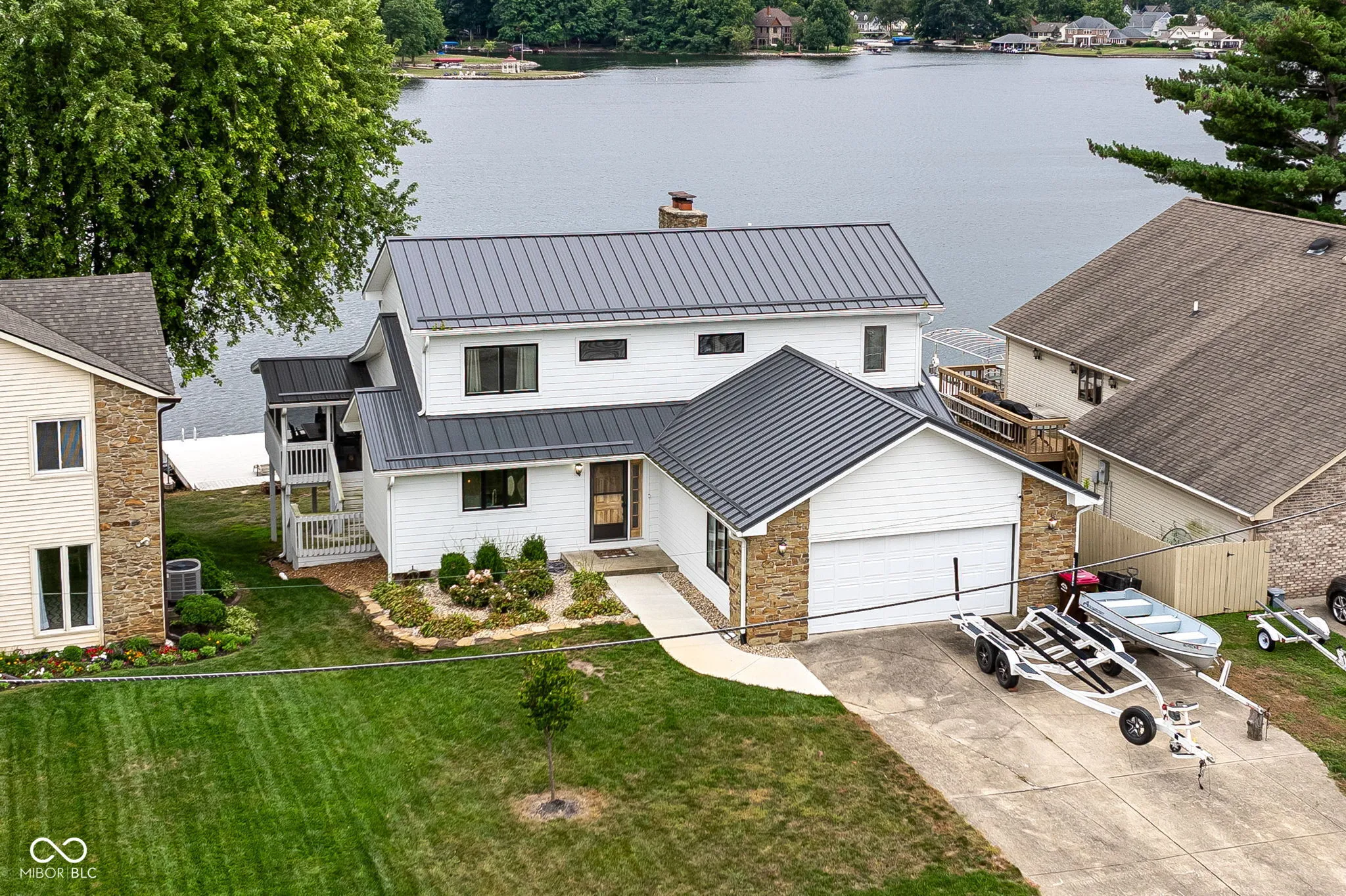 This stunning 5-bedroom, 4.5 bath home offers incredible views of Heritage Lake and an abundance of space for family and friends. The updated kitchen is truly the heart of the home-completely open to the dining room and great room-featuring an oversized island for meal prep and seating, plus ample cabinetry for storage. From the dining area, step out to the large screened-in porch, where you can enjoy lake activity and al fresco dining without the bother of bugs. The great room boasts vaulted ceilings and a dramatic floor-to-ceiling stone fireplace, creating a warm and inviting space with a touch of grandeur. The main-level primary suite is a private retreat with serene lakefront views and direct deck access-perfect for sipping your morning coffee while soaking in the calm waters. Upstairs, you’ll find two generously sized bunkrooms, each with their own full bathrooms-ideal for hosting large gatherings, where kids or guests can enjoy their own private spaces. The walkout basement expands your living and entertaining options with a second fireplace, a spacious recreation room perfect for a pool table or ping pong, built-in shelving, and a second screened porch overlooking the water. This level also includes two additional bedrooms, a full bathroom, and a laundry room. Outside, the gentle slope to the shoreline makes access easy and enjoyable. The expansive dock area includes two boat slips and plenty of space to relax by the water, fish, or launch into lake fun. This home has everything you need to enjoy lake life to the fullest-plenty of bedrooms, thoughtful gathering spaces, and some of the best views Heritage Lake has to offer.
