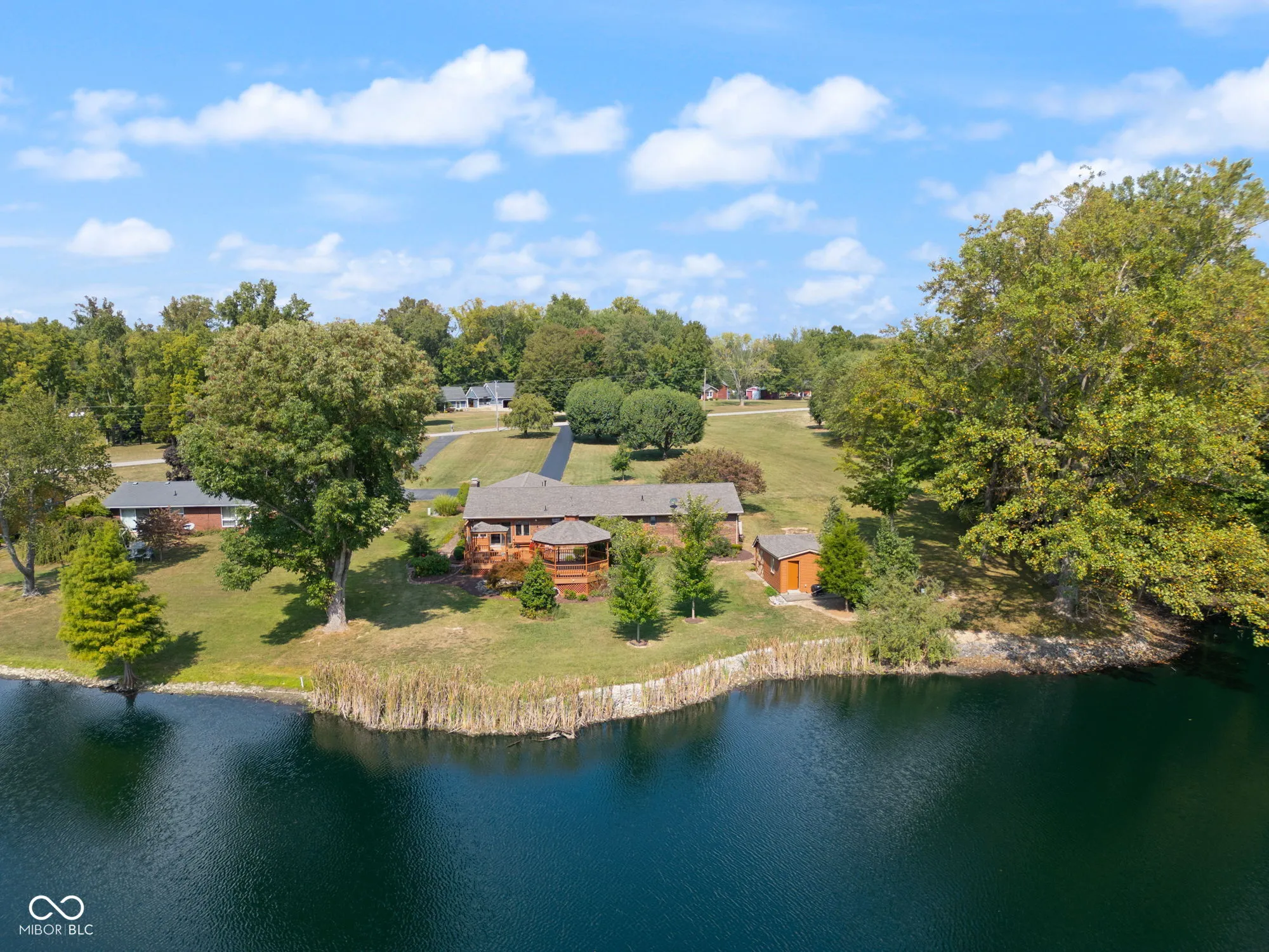 Reduced! Welcome to 2207 W Robin Road, Scottsburg! This beautiful home is located on a 6 ACRE LAKE w/GREAT fishing! BRAND NEW ROOF 9/8/25! The oversized 2-Car Attached Garage is a 25×25 and offers BRAND NEW ICON Concrete Coating (Also has ICON Concrete Coating on the front sidewalk). This single-family residence has been very well-maintained! It’s a ONE owner home offering mature trees and lots of landscaping and flowers! This home features two full bathrooms and three bedrooms to comfortably accommodate a variety of living arrangements, a large living room and a large family room with a natural gas fireplace! It offers a total of 1,985 square feet (including the sunroom). The sunroom area offers beautiful tile and wood ceilings and extends outdoors to a wonderful well-maintained deck and outdoor dining area, ideal for savoring the waterfront property’s water view. Imagine peaceful mornings and peaceful evenings enjoying this water view! Additional features include a convenient large shed to provide practical storage space on this expansive lot that offers almost 1 Acre (0.94+/- Acre lot). ALL appliances stay including the washer & dryer and it offers a large shed for all of your outdoor storage needs! This home offers a long, paved driveway for plenty of parking! This residence offers a unique opportunity to embrace a serene lifestyle! It’s a must see! Get it before it is gone! Security system is onsite. Note: This home does offer a drain system around the foundation so it stays dry under the house. The Gazebo has a block foundation in the center so a hot tub can be installed on it!