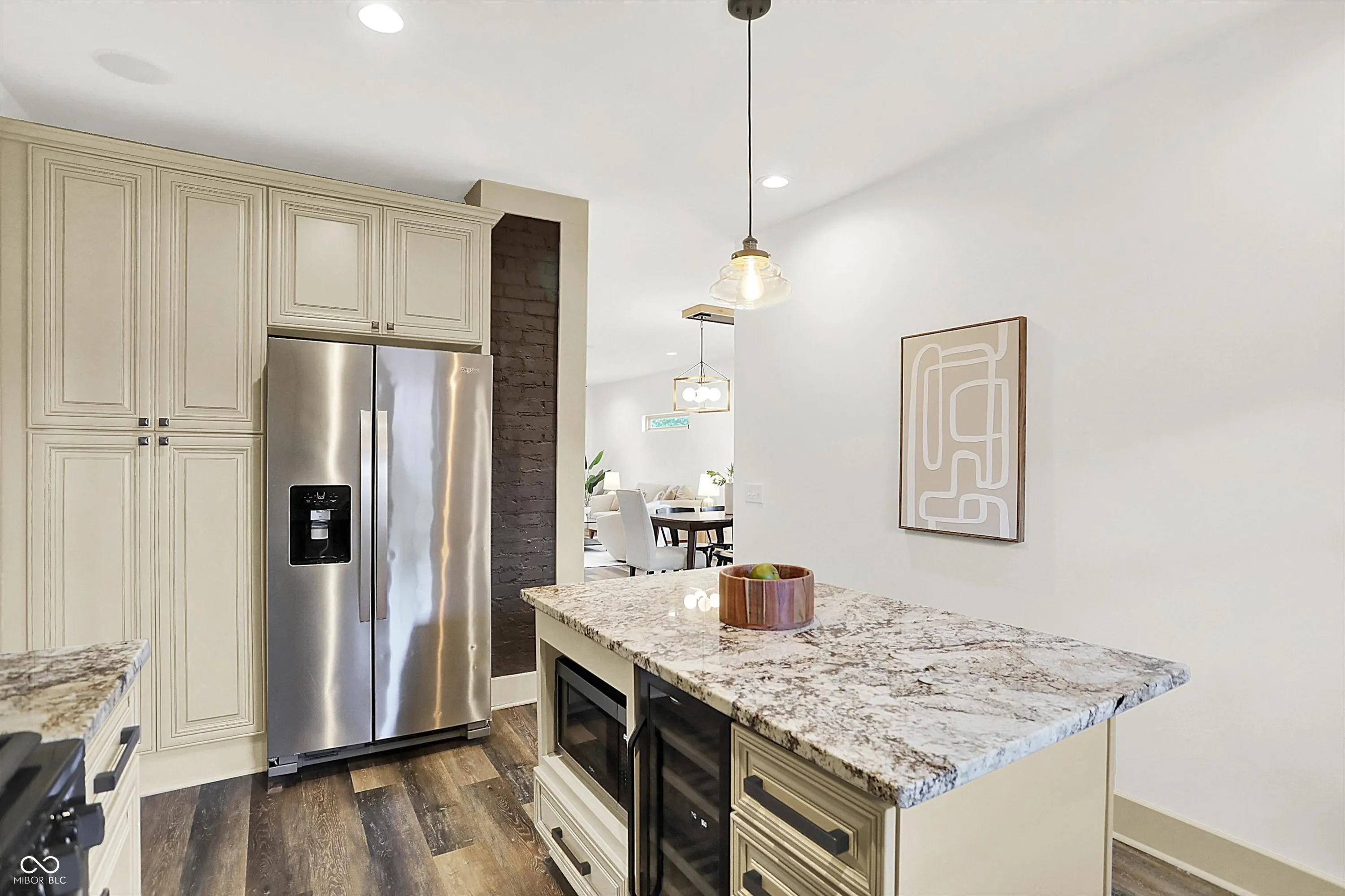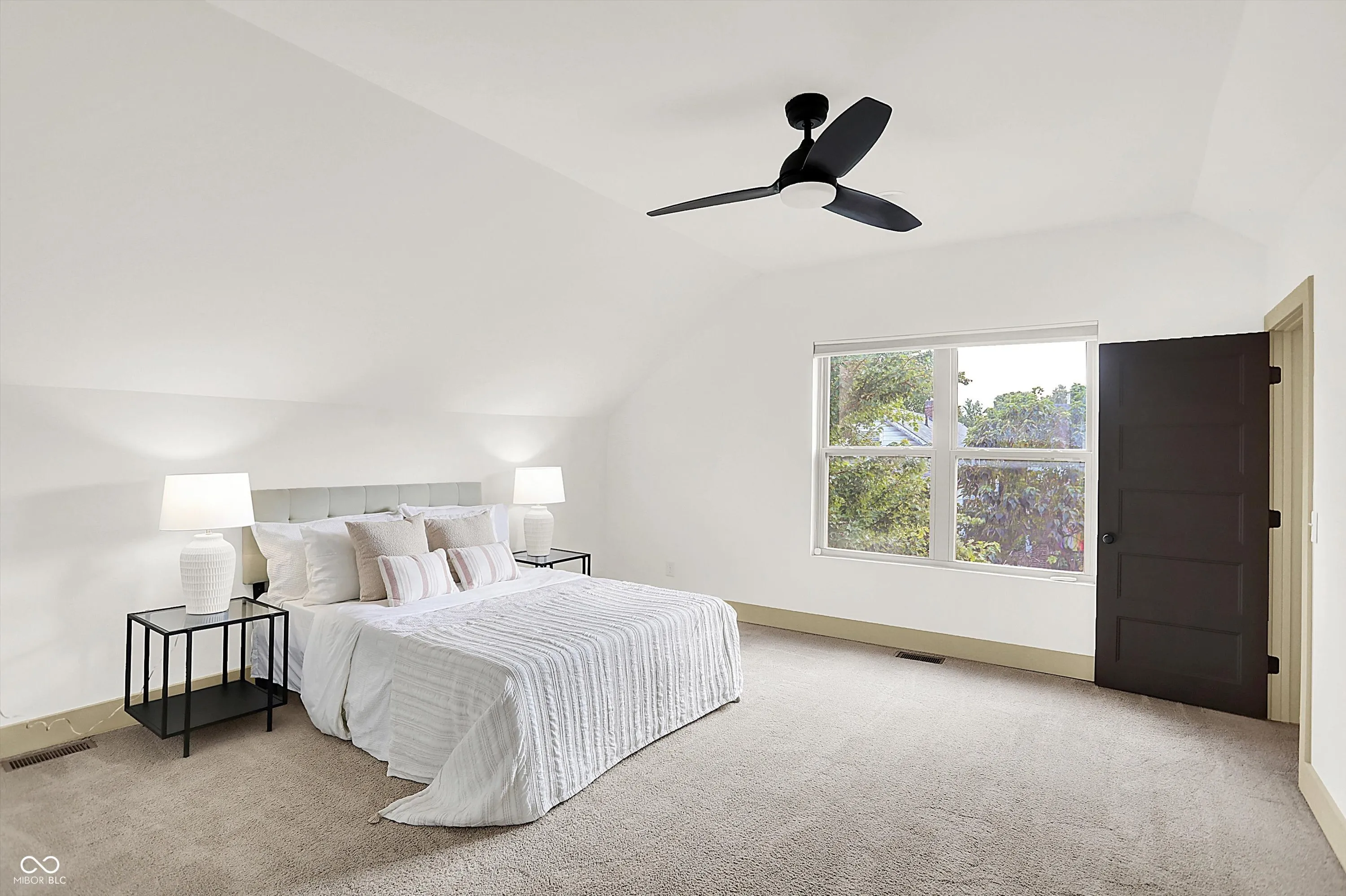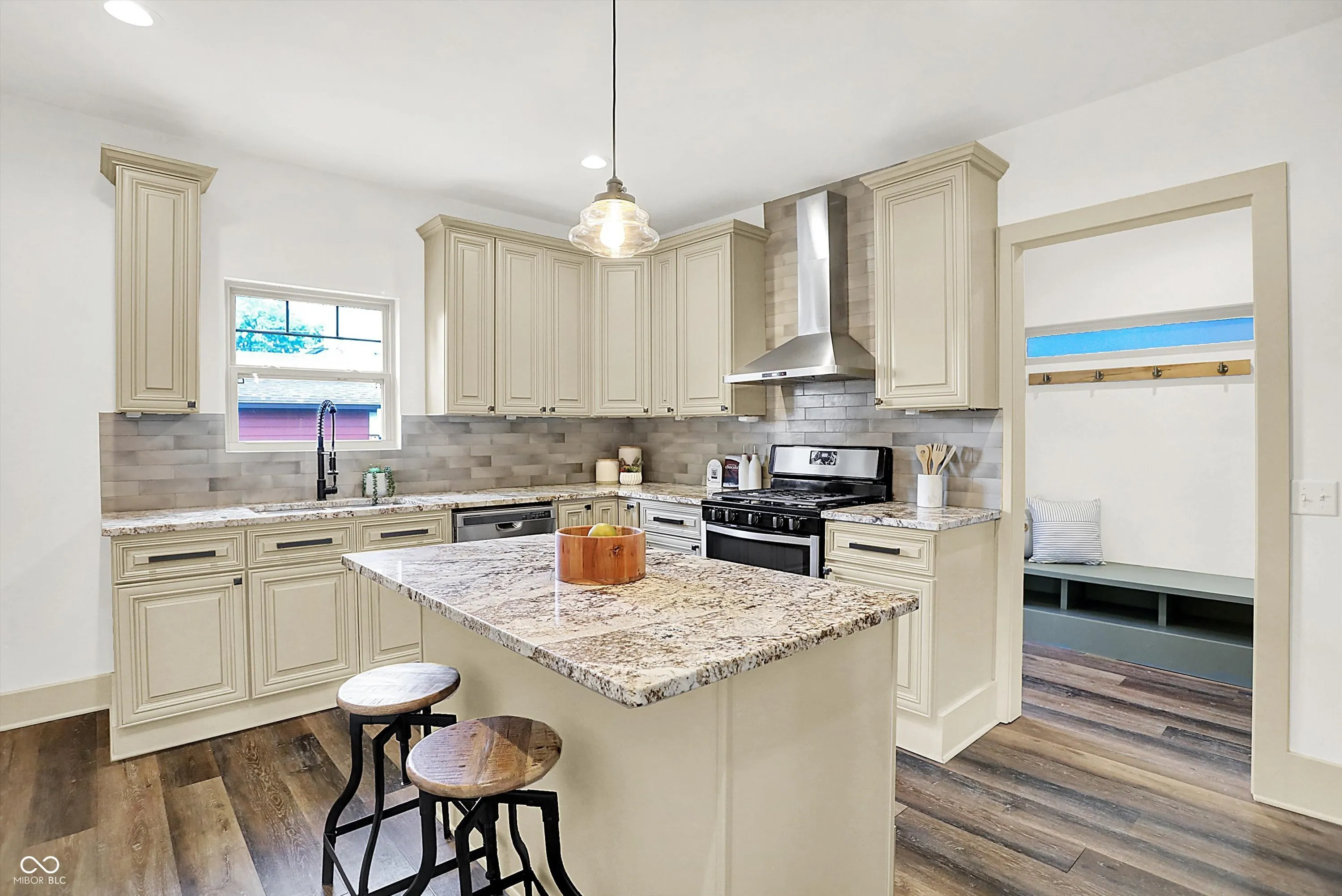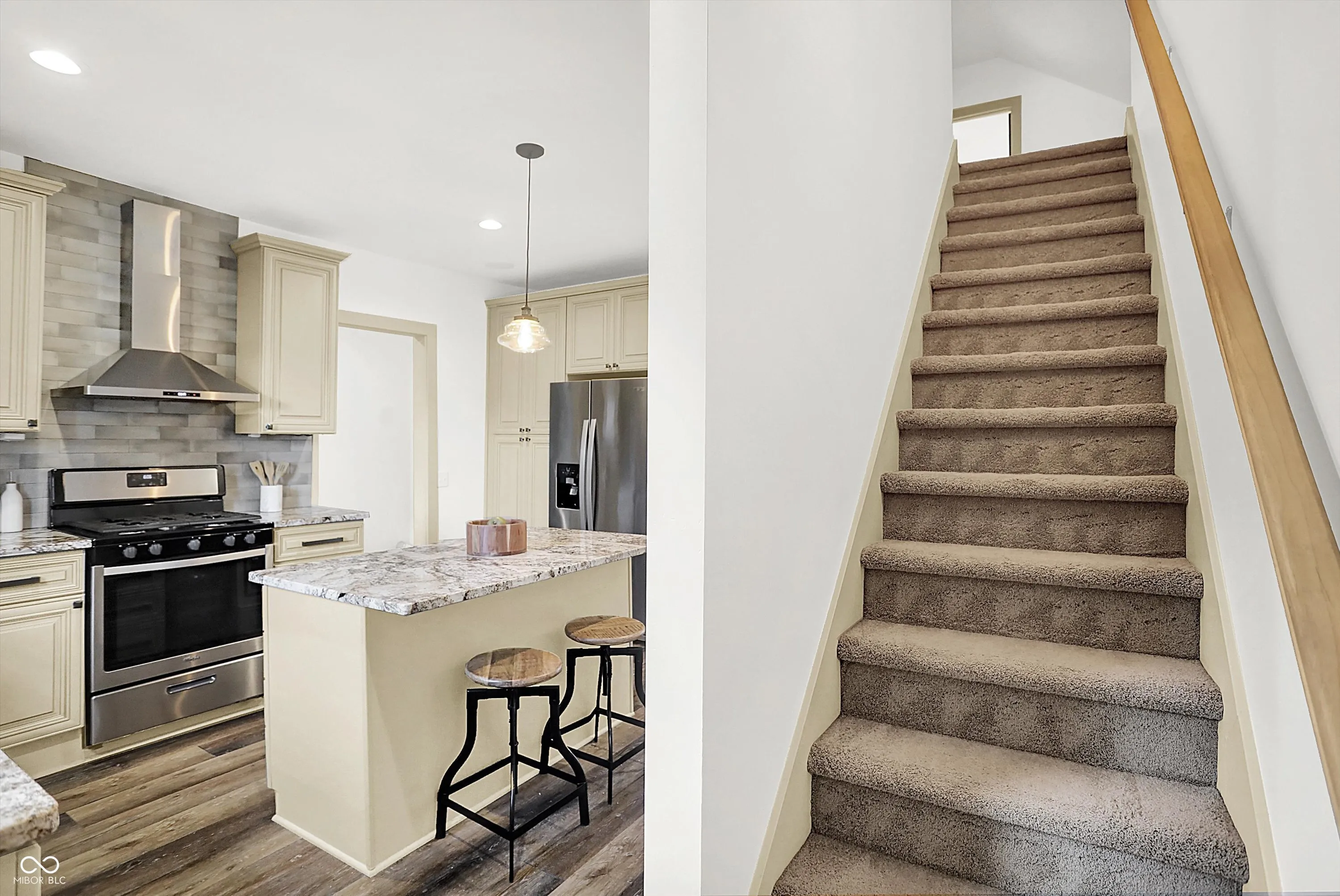 This home screams modern charm! Welcome to this updated 4 bedroom, 2 bath home in Bates-Hendricks. Inside, you’ll find an open and inviting layout with two bedrooms and a full bath on the main level plus two more bedrooms, second full bath, and a loft upstairs. You’ll love the spacious primary bedroom! The updated, large full bath upstairs features a double-sink vanity, garden tub, and tiled shower for a true retreat. The updated kitchen (2018) blends style and function with beige cabinets, granite countertops, a center island, stainless steel appliances, and a wine/bar refrigerator. Vinyl hardwood flooring runs throughout the living, dining, kitchen, and mudroom areas, while the main-floor bedrooms feature brand new carpet (2025). The mudroom/laundry combo is complete with custom built-in shelving for added storage. Enjoy the outdoors with a large covered front porch and a spacious back deck with a built-in grill, surrounded by custom fencing for privacy. An oversized one-car garage with bump-out adds even more versatility. Additional updates include a new roof, furnace, A/C, water heater, and appliances (all 2018), composite siding, built-in surround sound system, and modern finishes throughout. Located in Bates-Hendricks, this home is minutes from Fountain Square, Garfield Park, Lucas Oil, Gainbridge, and all that downtown Indy has to offer. Perfect for those who want both convenience and character in their next home.