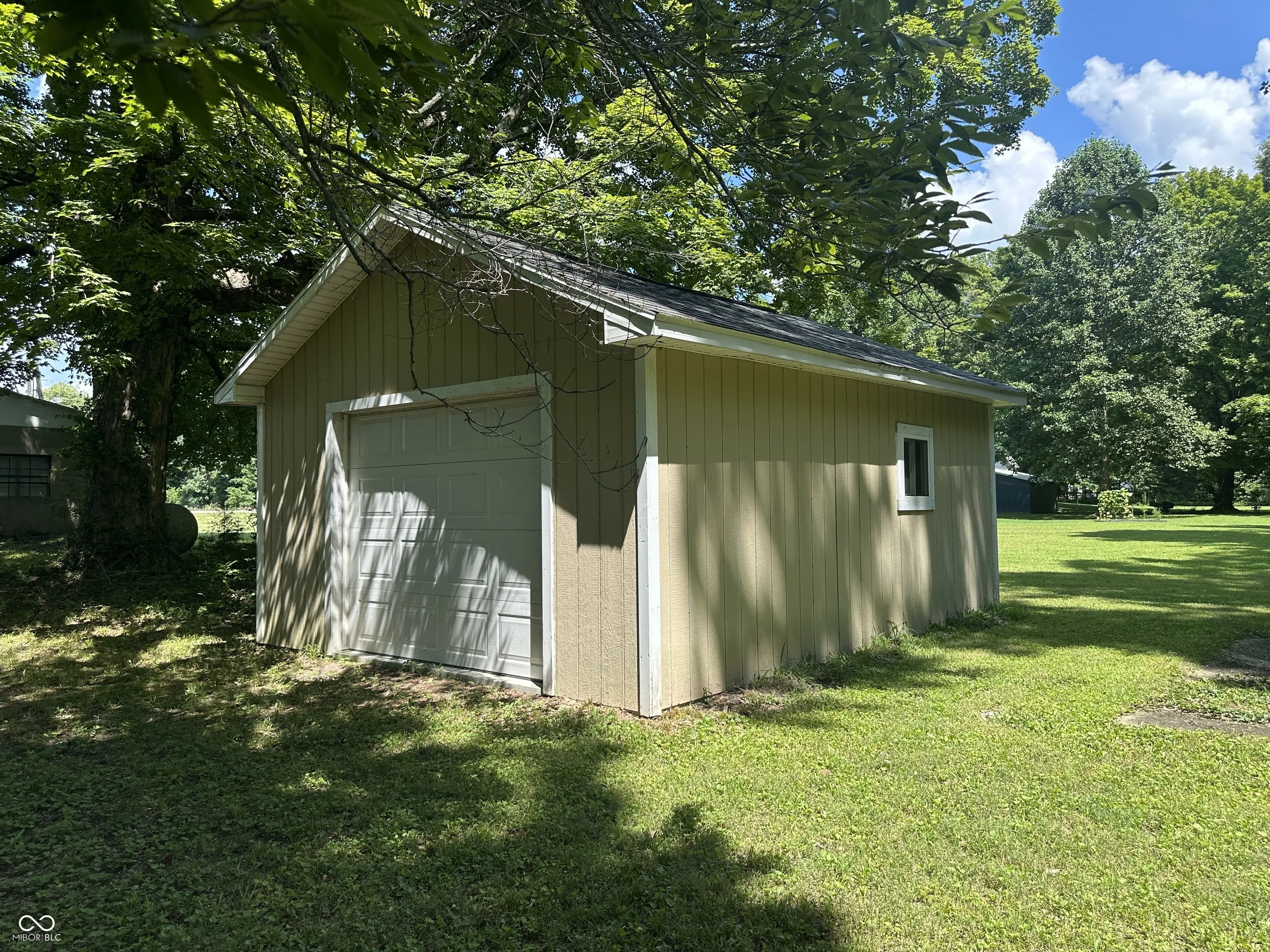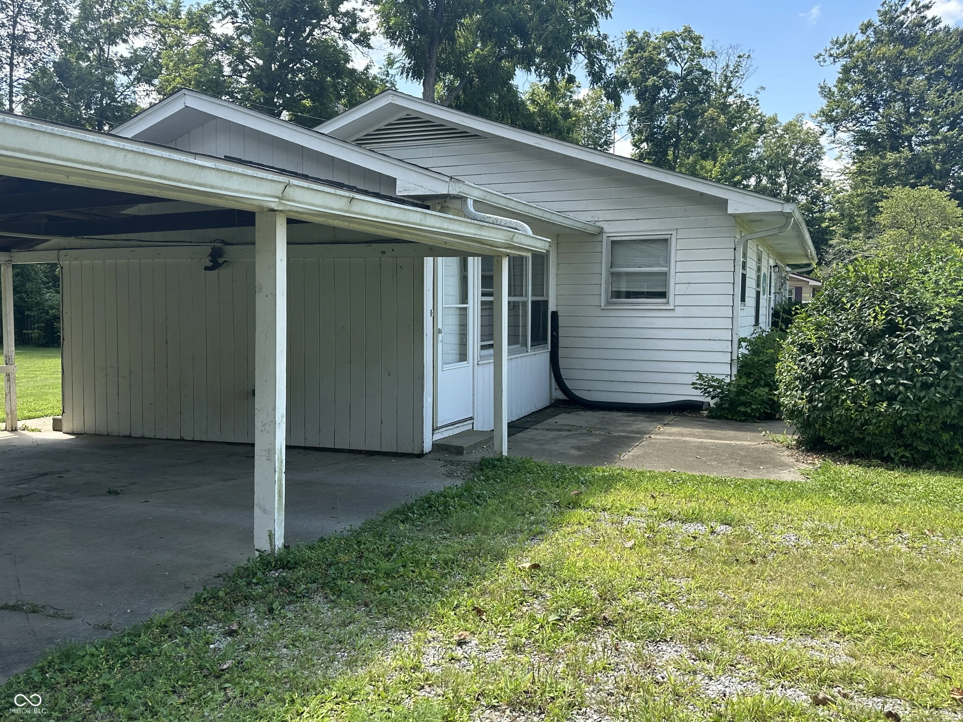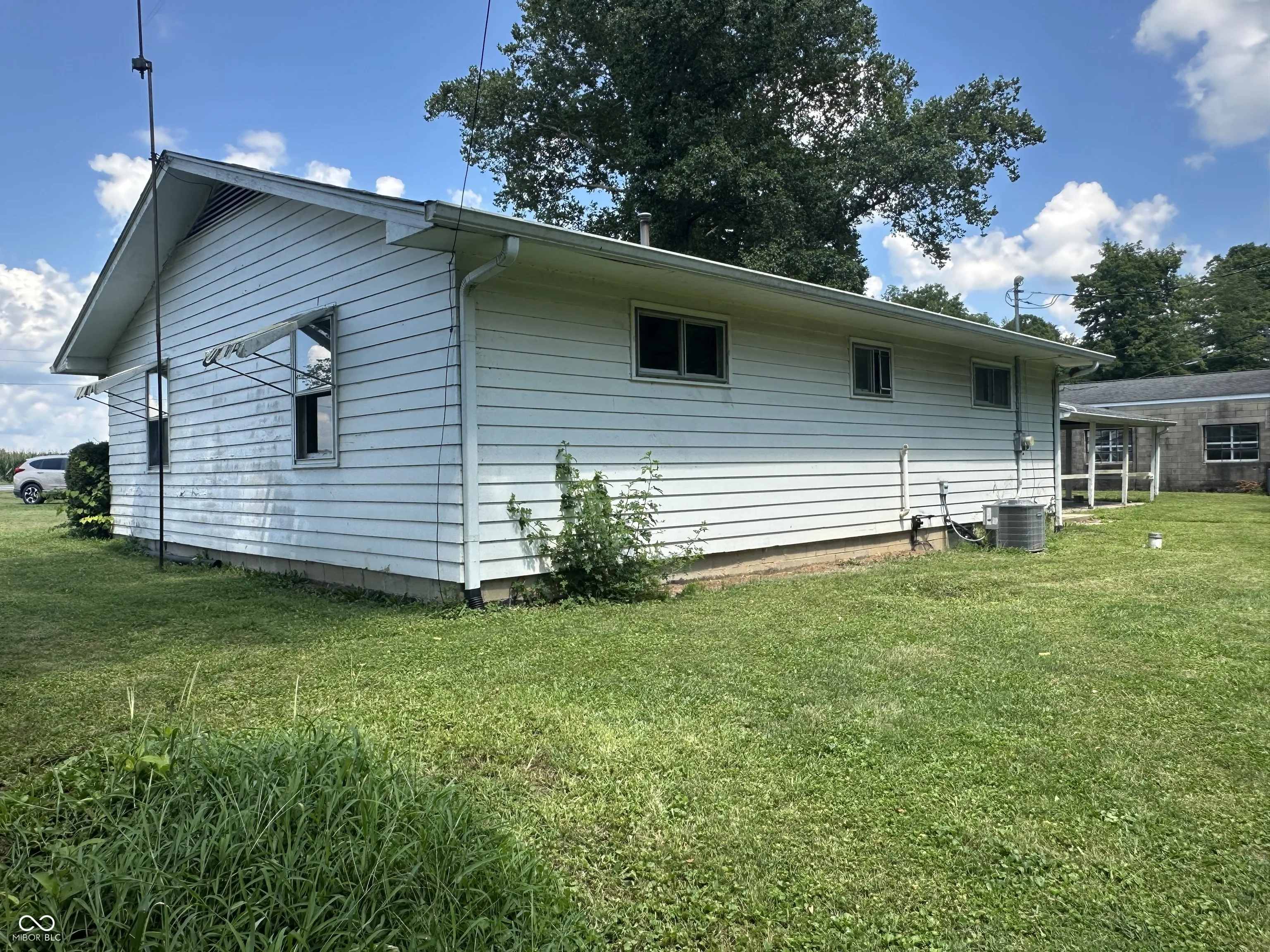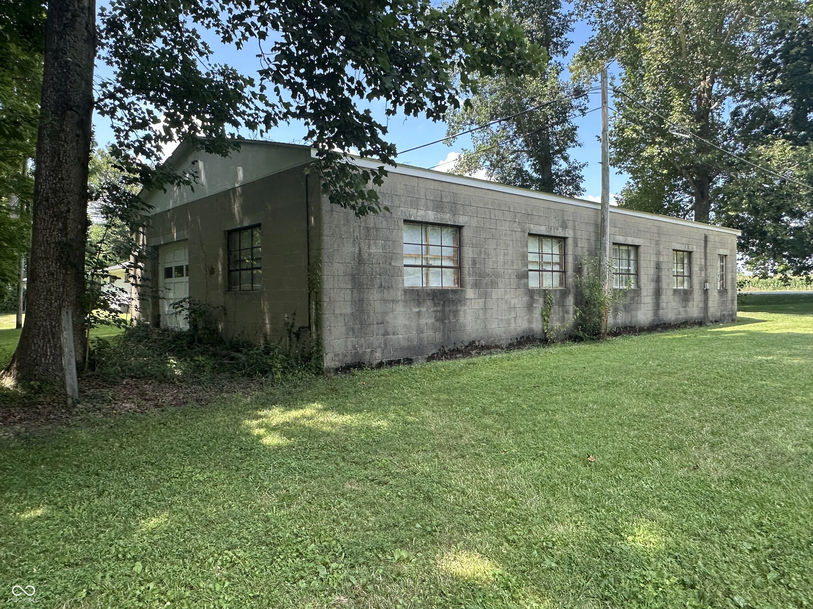 The Real Estate is a 1,280 square foot home with 2 bedrooms with hardwood floors, 1 bath, a kitchen, a living room, a large eat-in kitchen, a utility room in the enclosed side porch, a full block basement, central air, an LP gas furnace, and a carport. There are 3 outbuildings on the property. The large concrete block building is 32′ x 60′ with an 8′ x 30′ entry room (with storage above the ceiling), and 4 rooms within the building. It has 9’8″ finished ceilings, one room has an 8′ x 7′ garage door, and a half bath. The building also has central air and an LP gas furnace. On one side of the building is a very large side yard that comes with the property. There is an 8′ x 12′ garden shed. ***LAWNMOWER NOT INCLUDED*** There is a one car garage/storage building that is 16′ x 20′ with garage doors at each end.