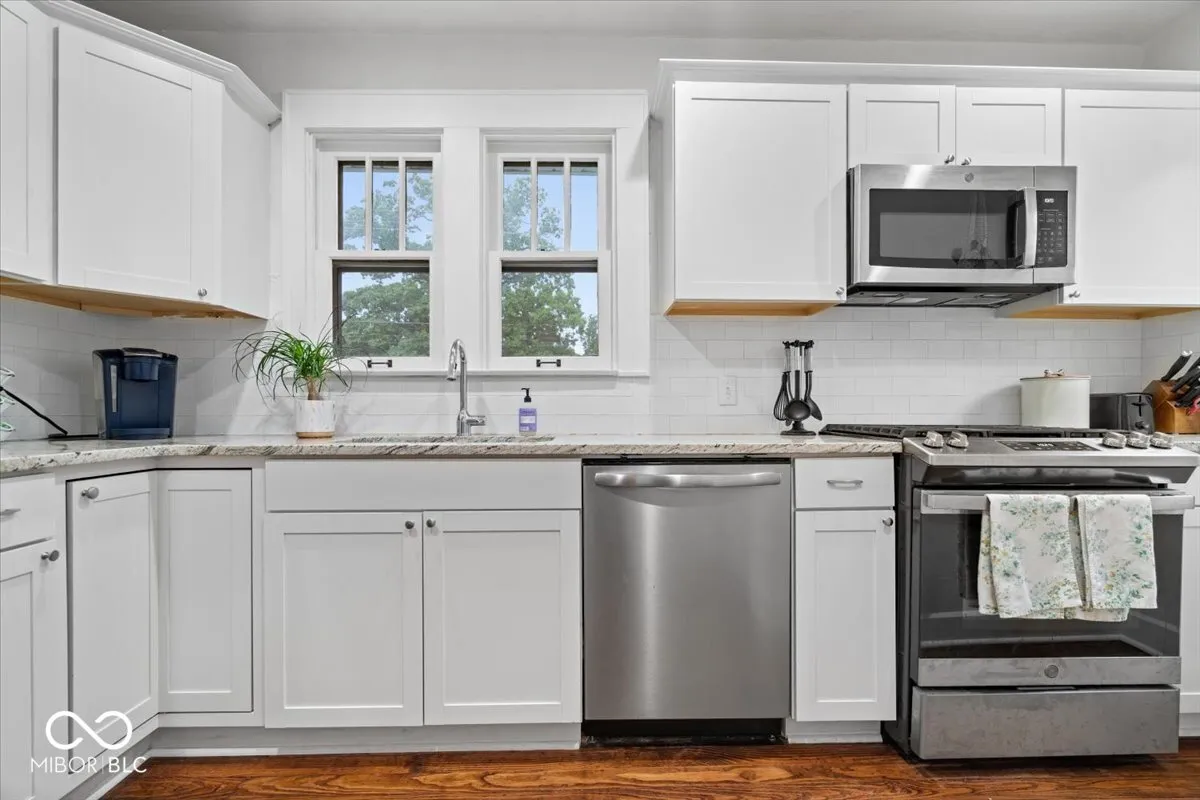 Welcome Home!!! This BEAUTIFUL 2 bedroom, 1 luxurious bath home with basement and 2-car detached garage sits in an unbeatable location just south of Butler University’s campus and within walking or riding distance to Broad Ripple, the College Avenue Corridor, Downtown Indianapolis, and beloved local spots like Tarkington Park. Whether you’re looking for award-winning dining, boutique shopping, vibrant nightlife, or endless entertainment, you’ll find it all right at your fingertips! Step inside to find a gorgeously updated home that still embraces its original character and charm. Gleaming hardwood floors, detailed moldings, decorative hinges, arched entryways, and warm woodwork create an inviting, timeless feel throughout. The two generously sized bedrooms share a spa-like bath with modern finishes, offering both comfort and style. The kitchen is a true standout; completely updated with granite countertops, stainless steel appliances, and crisp cabinetry; perfect for the home chef or for entertaining. A cozy dining area flows seamlessly into the living spaces through an arched entryway, making the home feel open yet intimate. Outside, enjoy a HUGE yard with a fully privacy-fenced rear, ideal for summer evenings with friends and family. Relax on the open patio, gather around the fire pit, and follow the charming walkway to your oversized 2-car detached garage with alley access. Recent updates, including a newer roof, durable cement board siding, HVAC and water heater provide peace of mind for years to come. This home truly has it all; historic charm, modern updates, and a central location that places you in the heart of all Indianapolis has to offer. Don’t wait on this one; it’s the perfect combination of style, convenience, and function. Schedule your showing today before it’s gone!