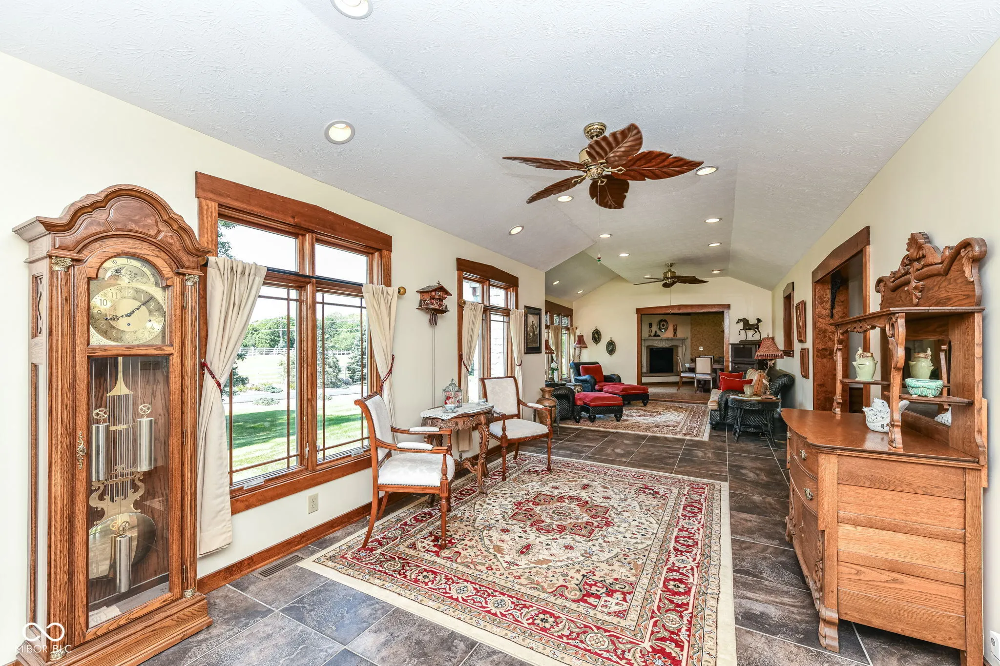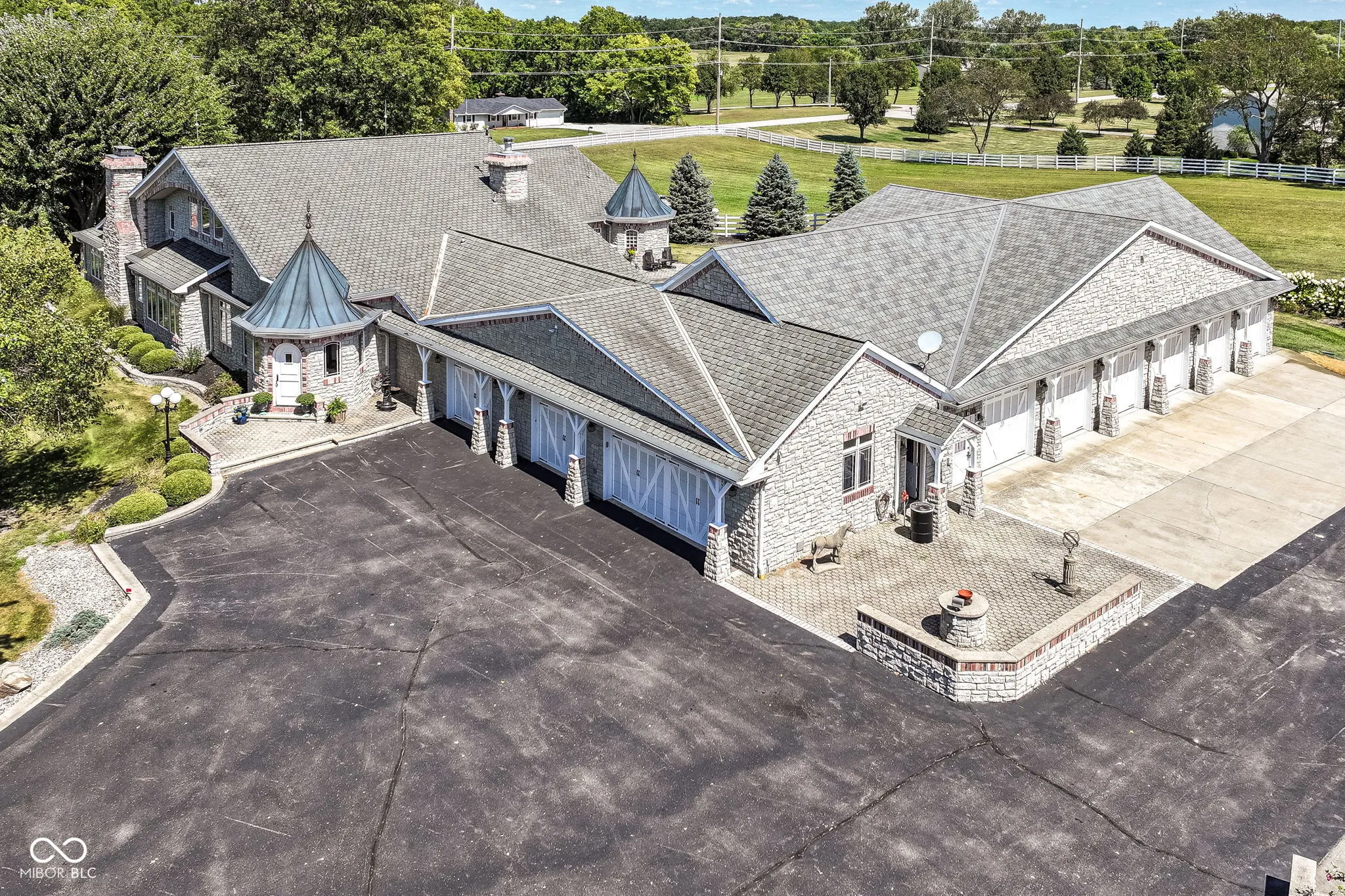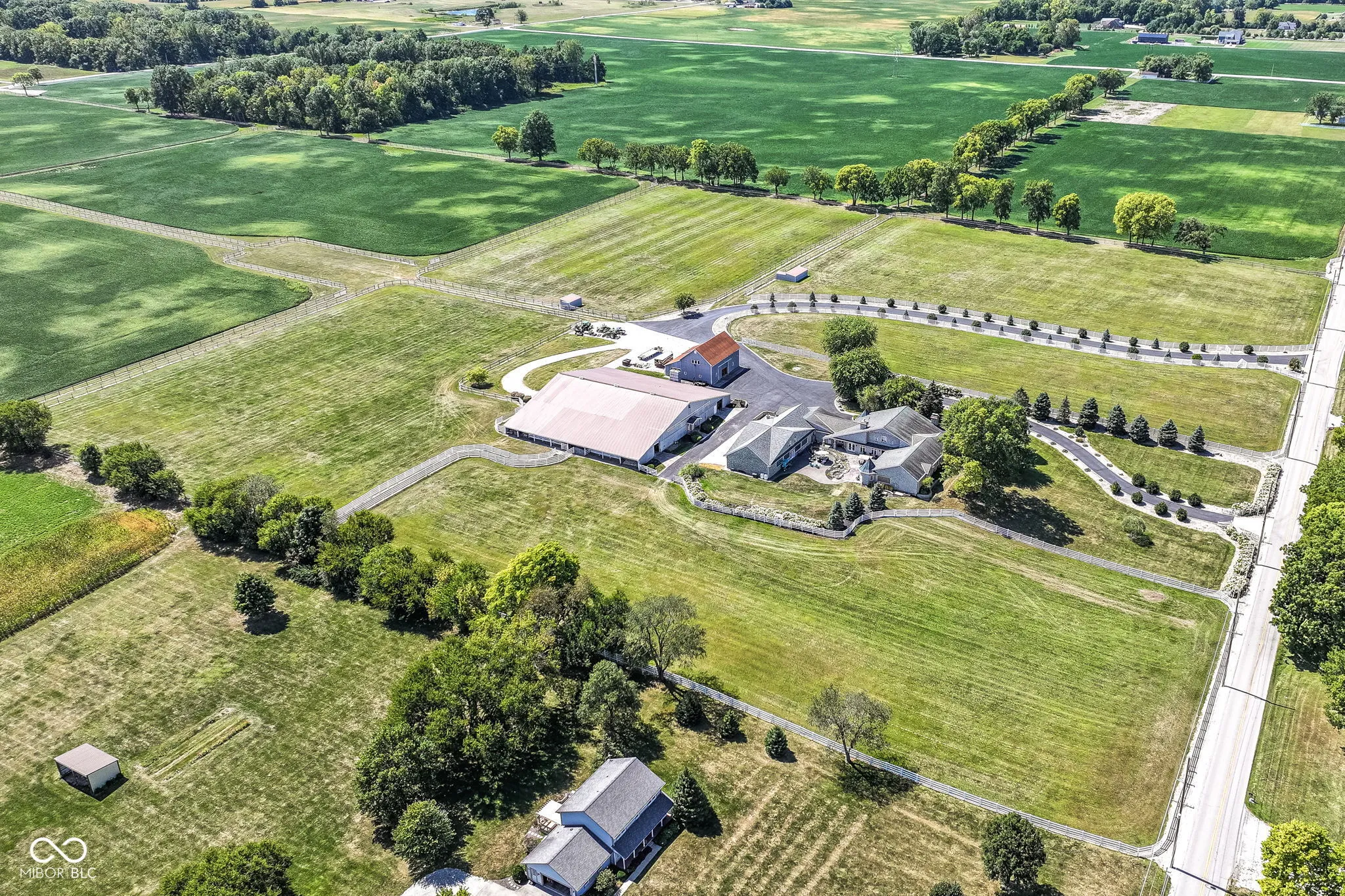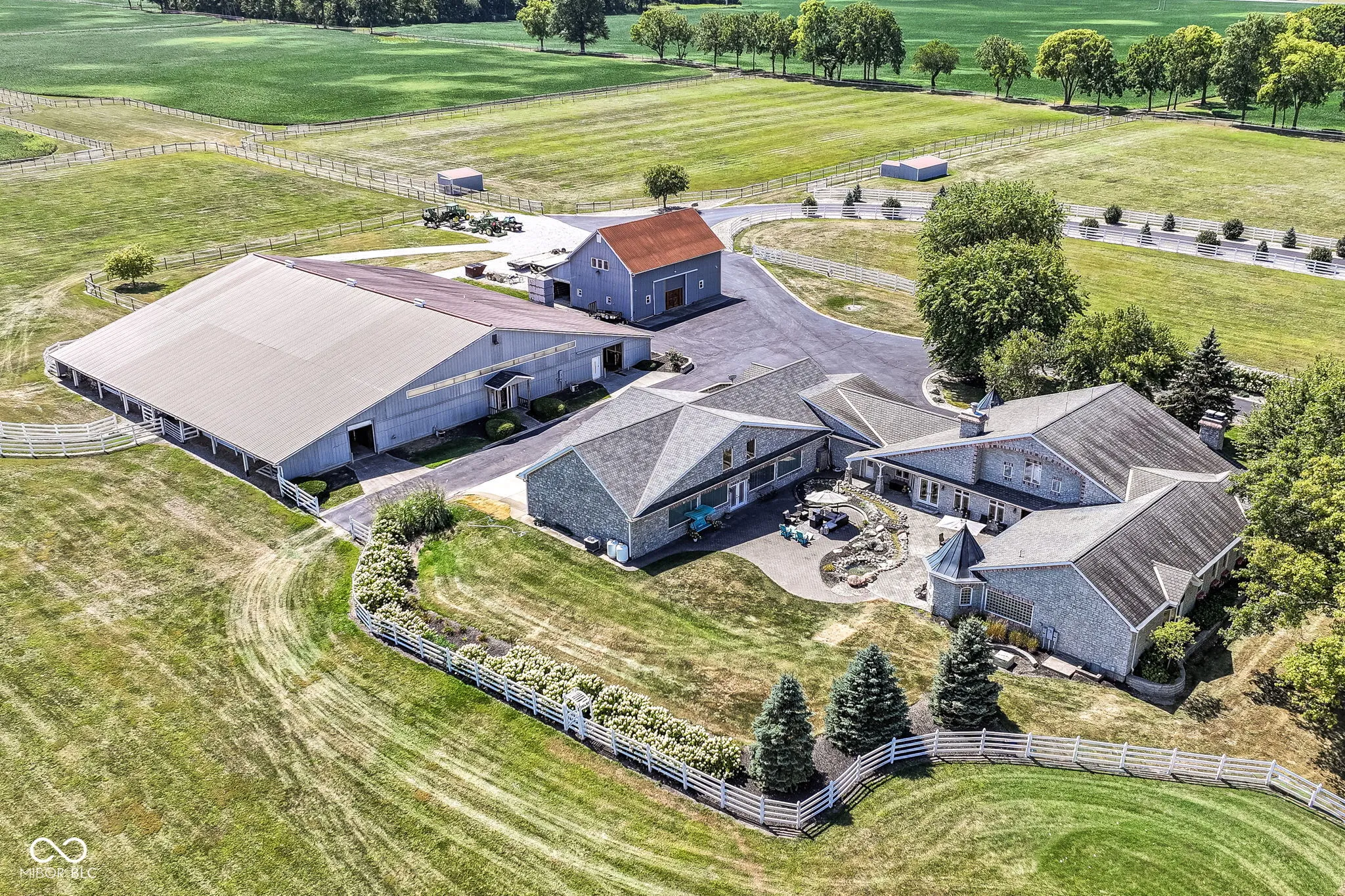 Your opportunity to own one of the most beautiful properties in Hamilton County is right here! Your new home welcomes you into a warm and inviting space that allows views of the grounds from every room. You can just feel the love as you enjoy coffee in the morning, in the cozy sitting room off the main entrance. Enjoy family and friends gathering in the large family room and serve delicious dinners in the grand dining room. Your kitchen features custom modern appliances designed with a touch of nostalgia! Wonderful custom and luxurious touches in the bedrooms like fireplaces and leaded glass windows. Your primary retreat features a spa like ensuite and amazing walk in closets. The primary suite is adjacent to a wonderful open room that could be used as a rec room or workout room-use your imagination-it is complete with a full bathroom. The upper level features a home theater, game room, small kitchenette, and a powder room! Step outside to your courtyard with a water feature; it has so much space! Perfect for relaxing or enjoying a fun outdoor party! Your home is perfect for your car collection: finished, 6 bays (1 bay is a car wash bay), epoxy finished floors, and loads of windows! Attached to the house are four more garage bays! This property also features an exterior barn complete with heated workshops and added storage! Bring your horses! This property features an indoor 60’x100′ riding arena, 33 horse stalls, 2 wash stalls, a grain room, two haylofts, two upper level viewing rooms, a bathroom, and 5 horse pastures. Welcome Home!